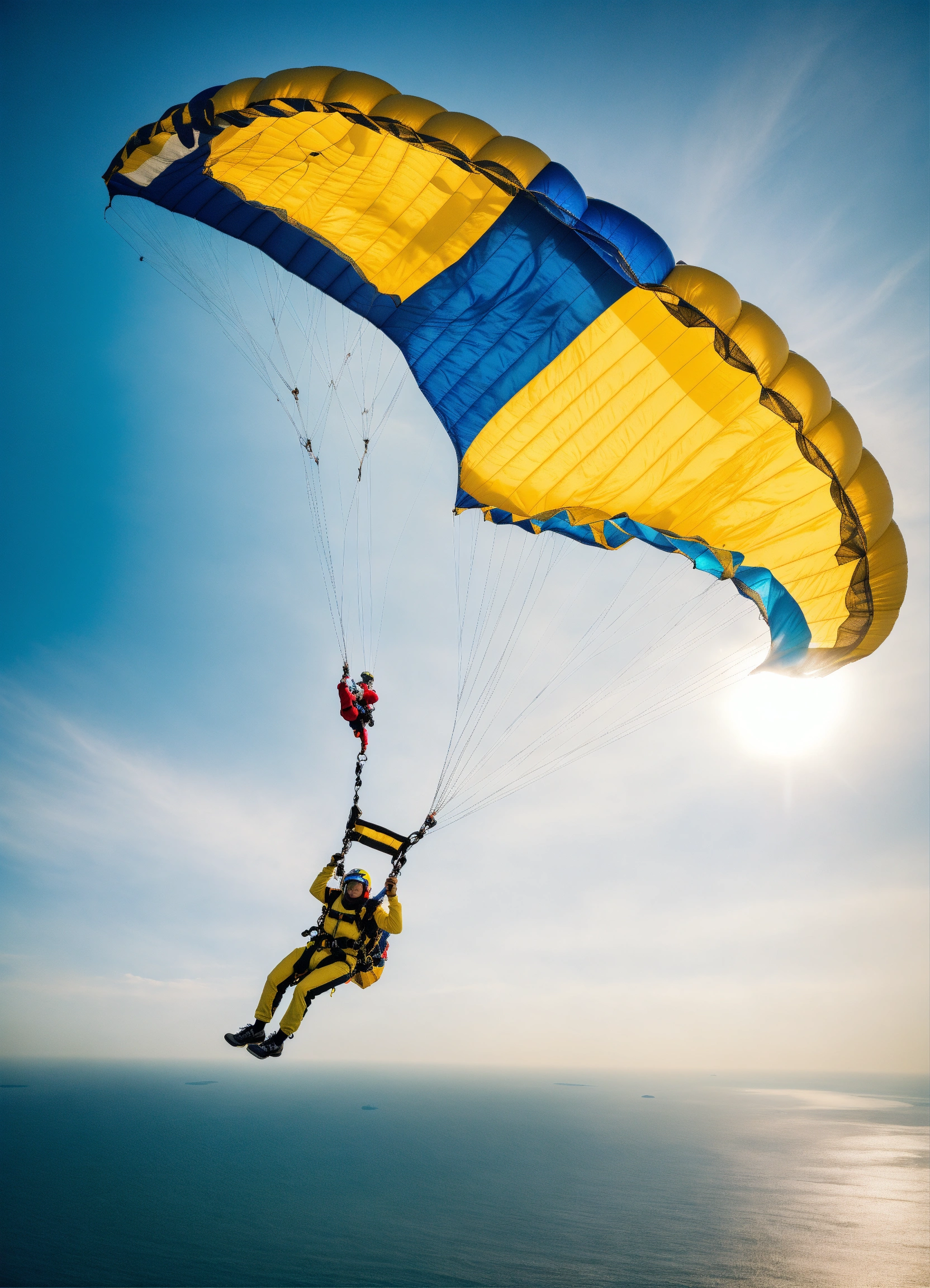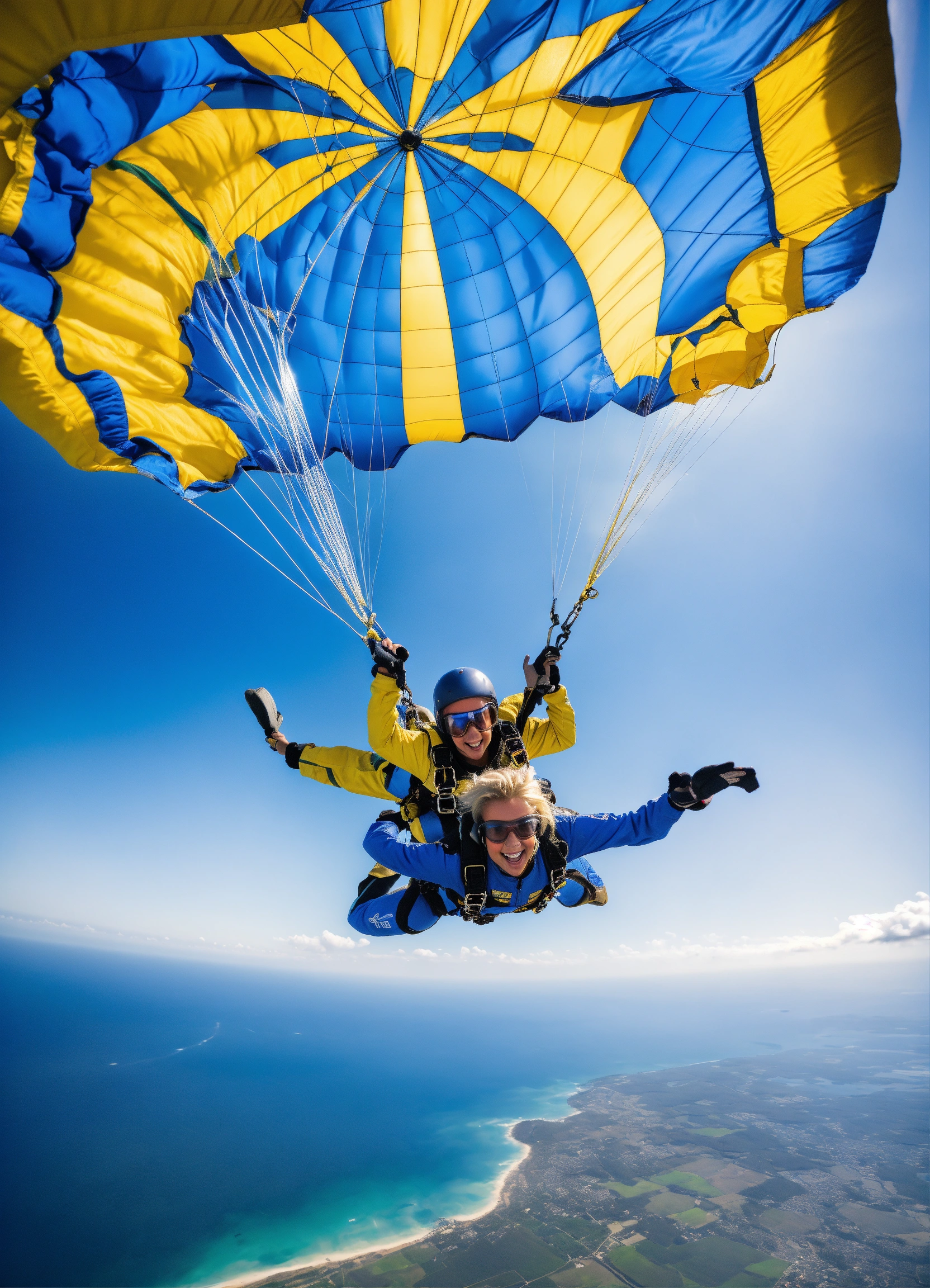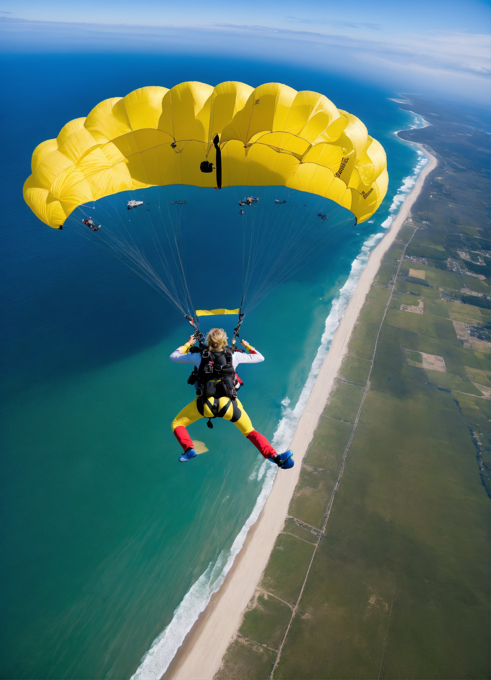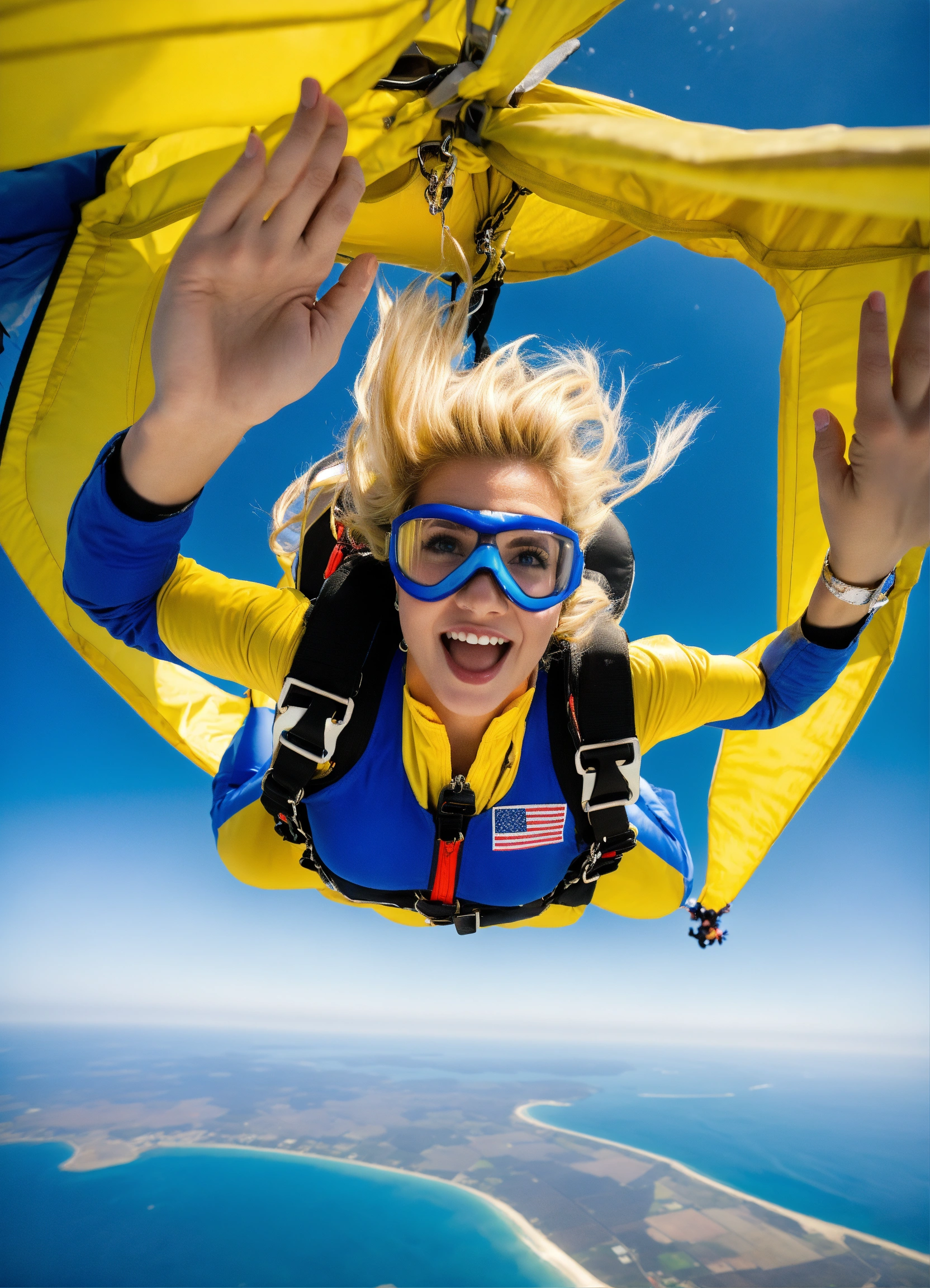 A blonde woman skydiving jumping out of a plane with a yellow and blue parachute looking over the ocean