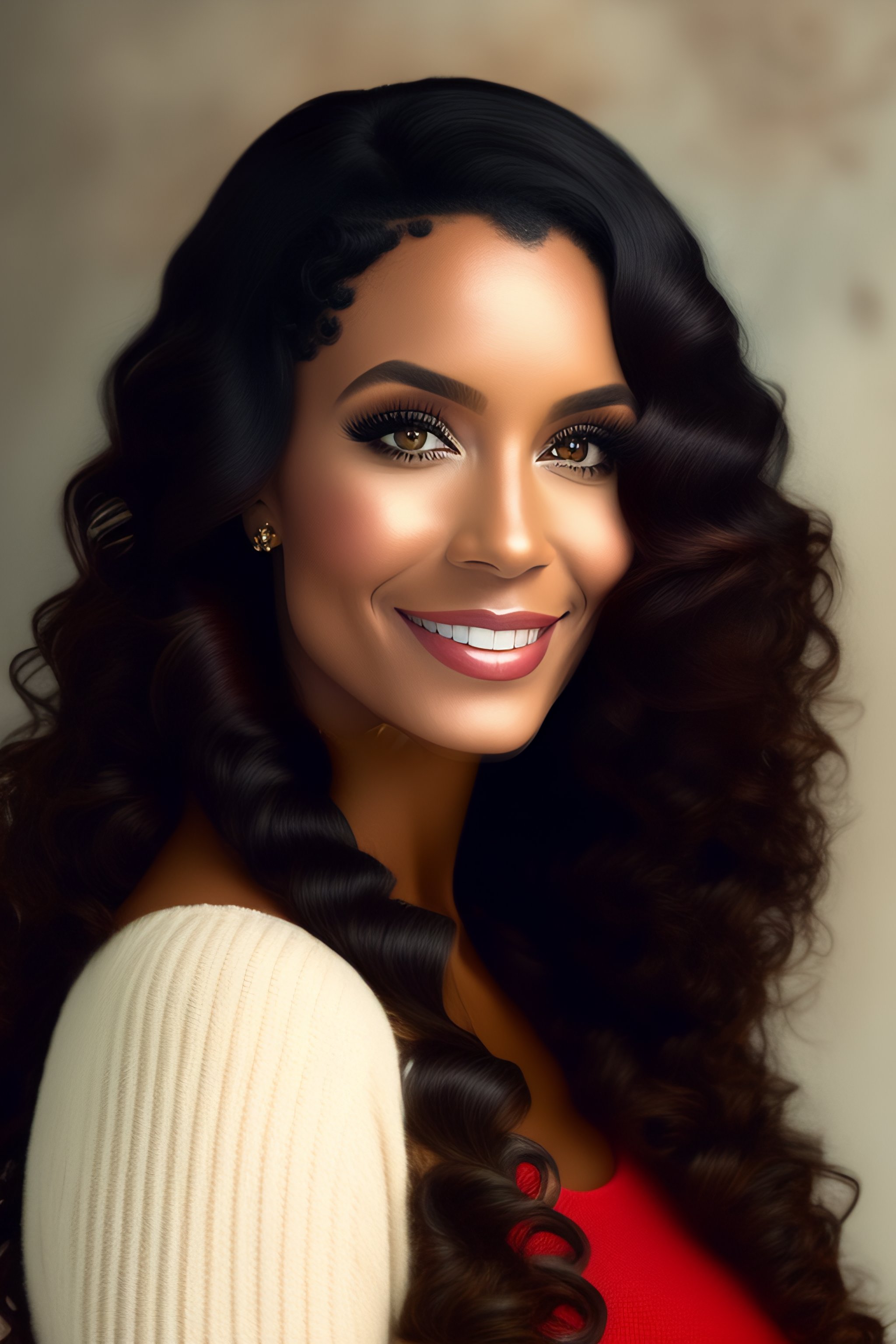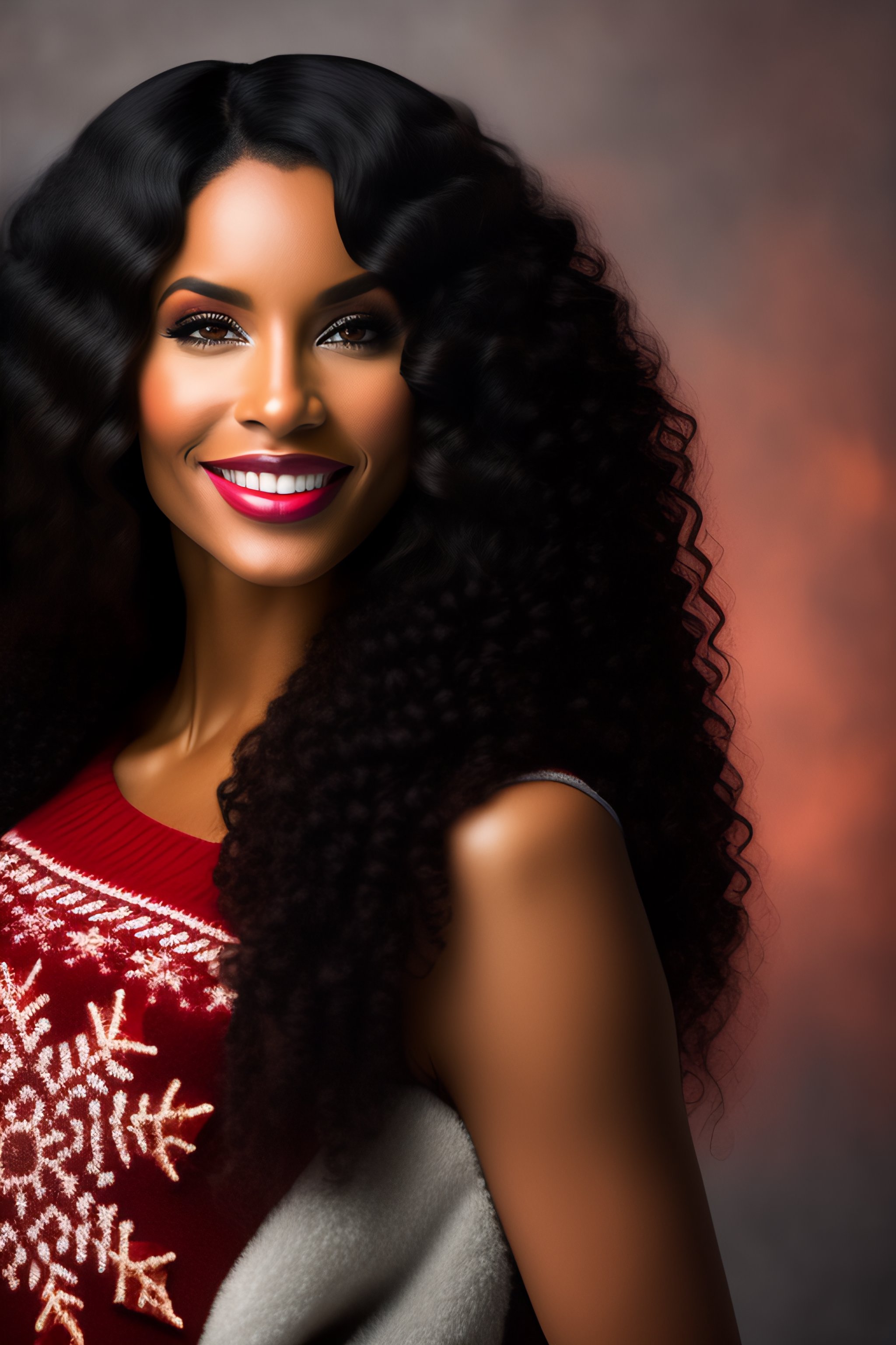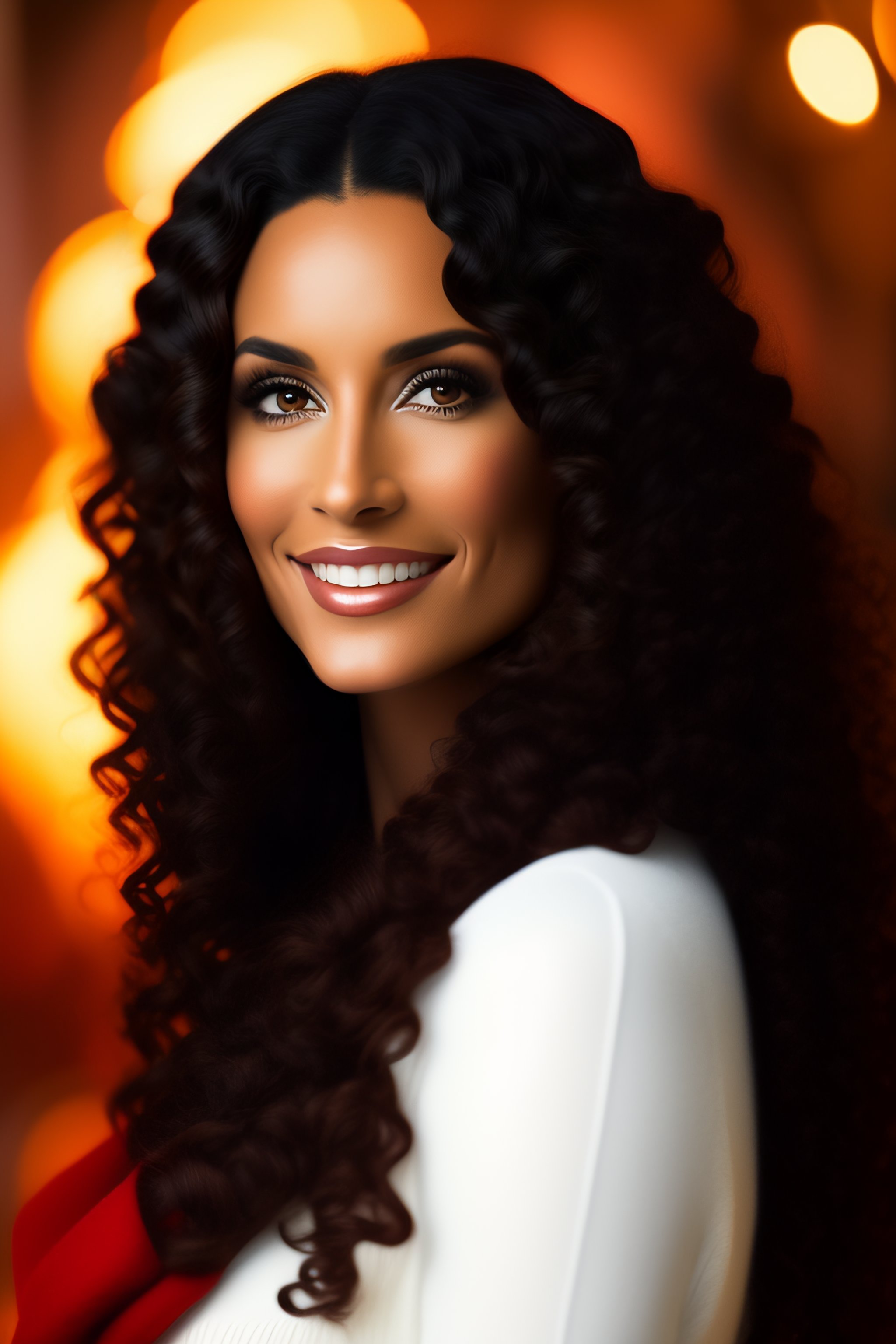32-year-old girl, long, curly, black hair. spanish and latino ethnicity, dark eyes, dressed in jeans and christmas jumper.
