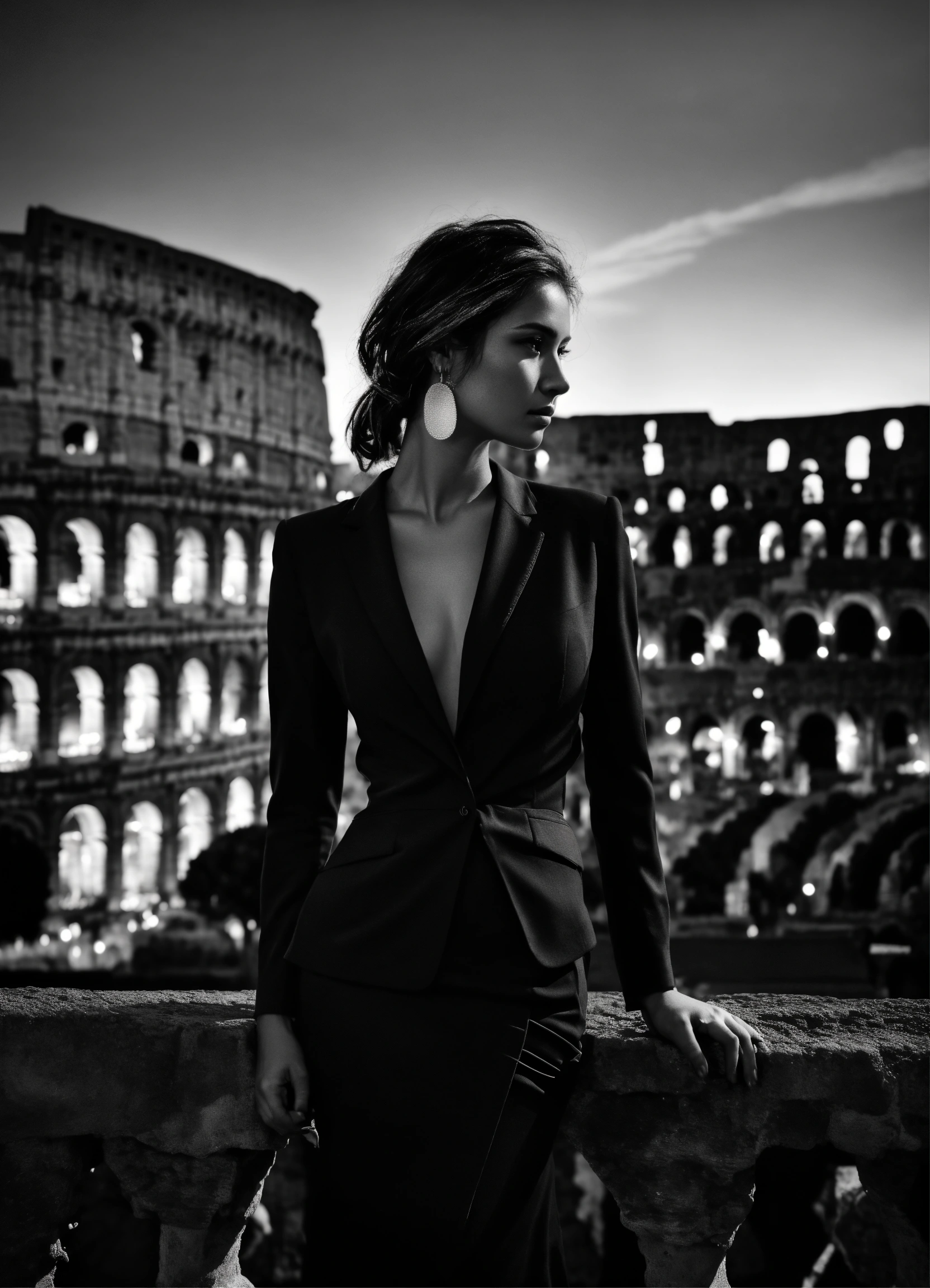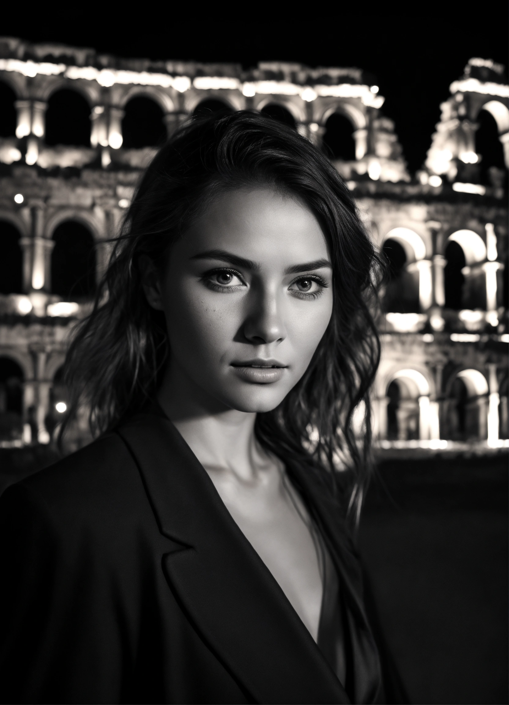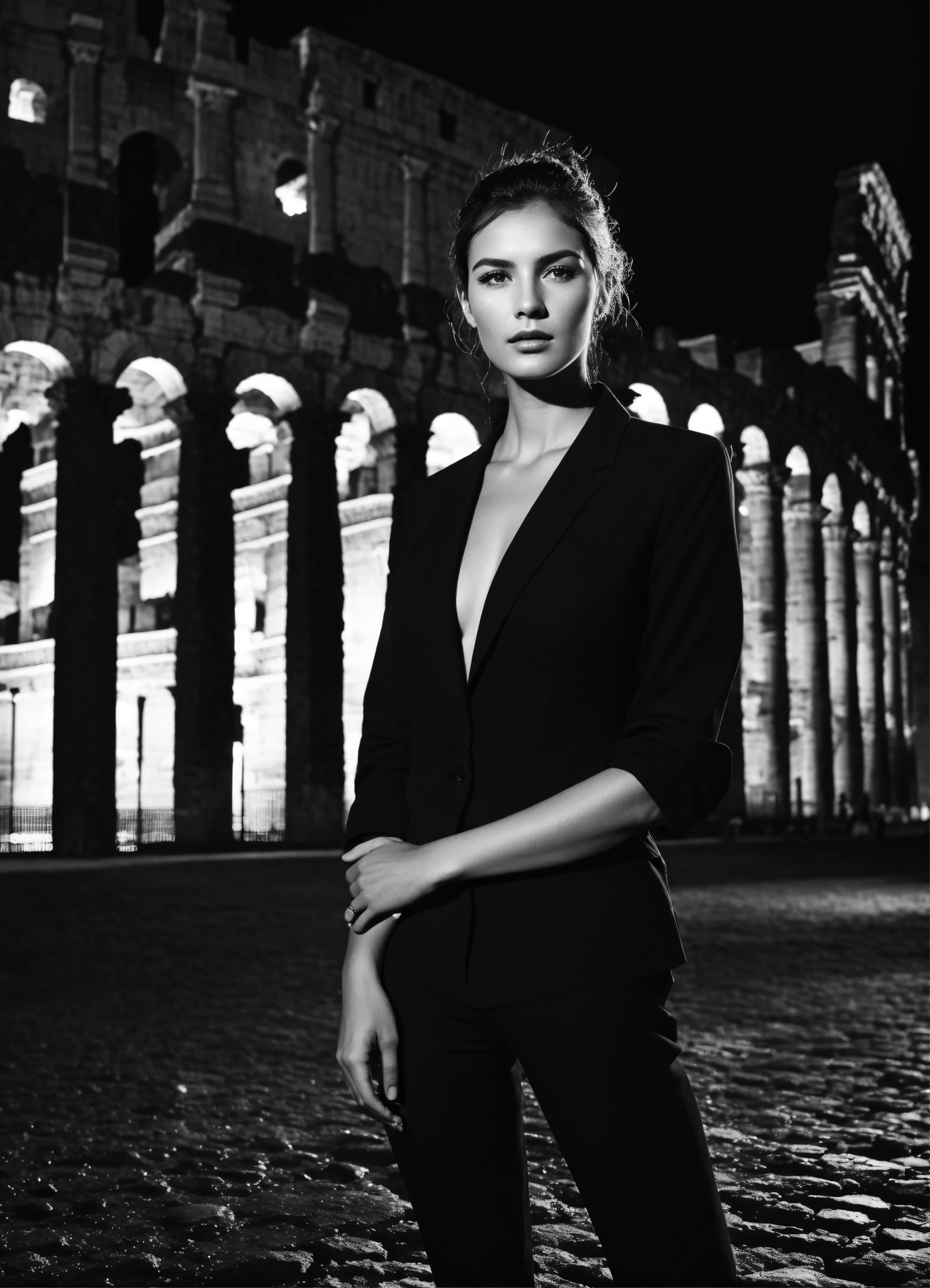 Photo of model women, black and white, realistic, portrait, not painted, very detailed faces, skin with pores, 4k, dark suit, skin not smoothed, looking into the camera, dark shirt. colosseum in rome in full view at night as background