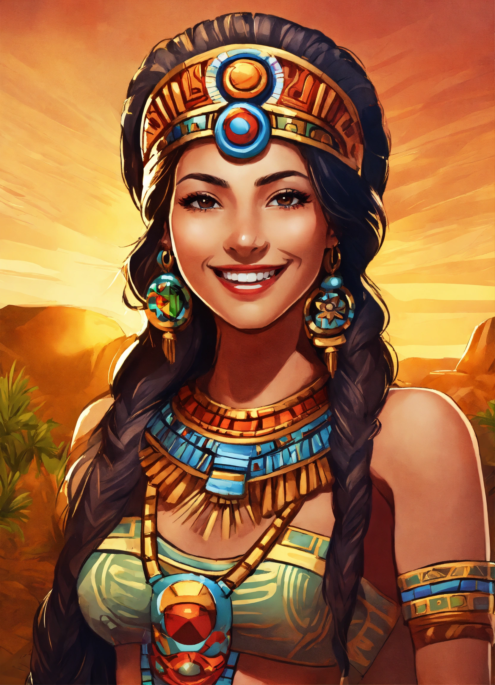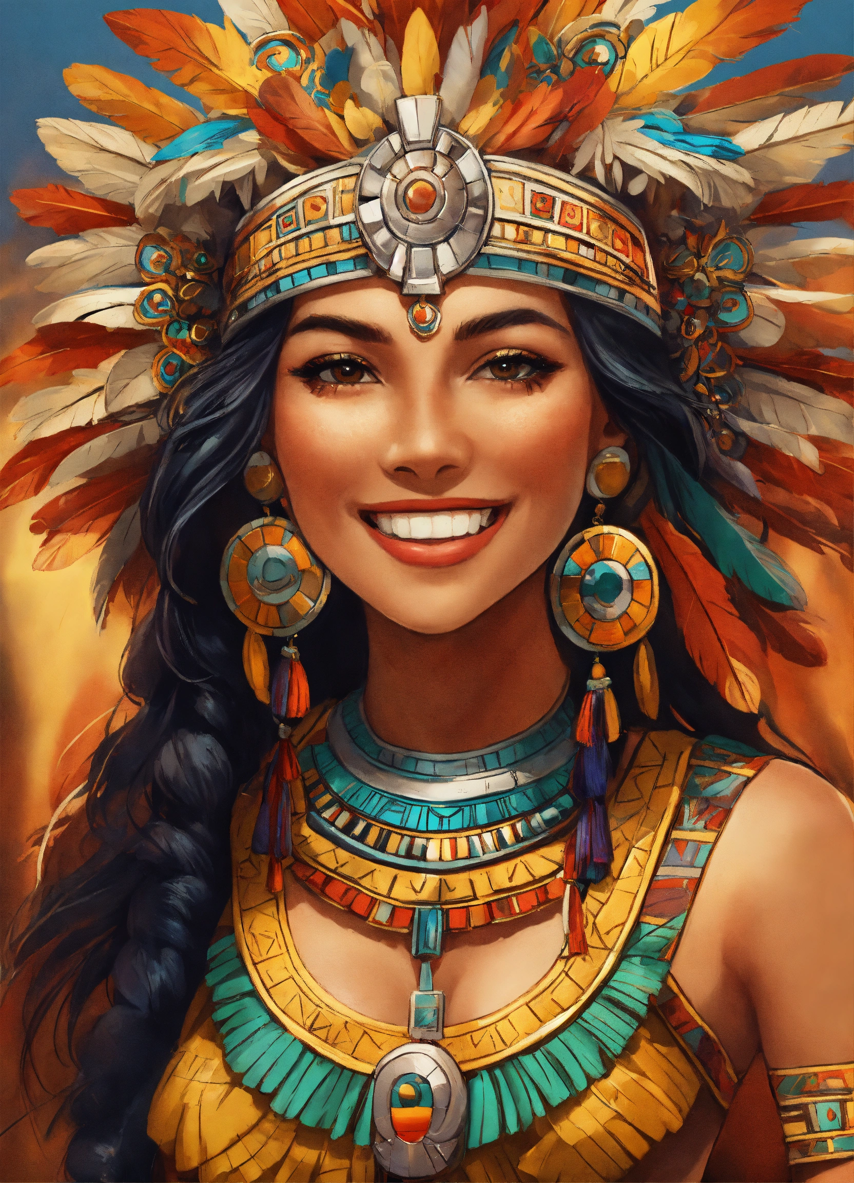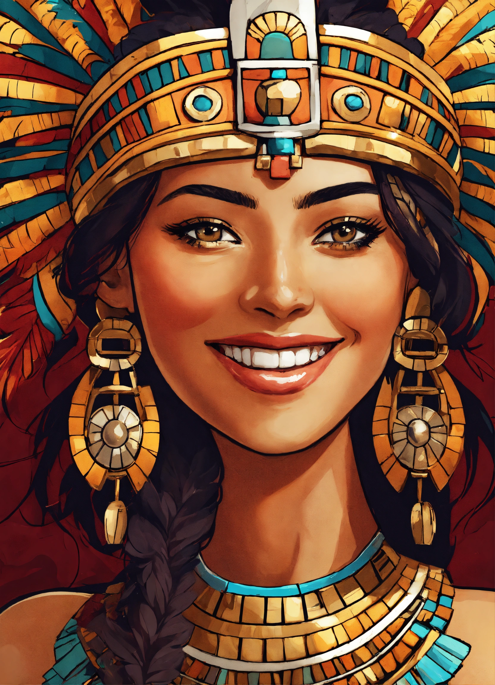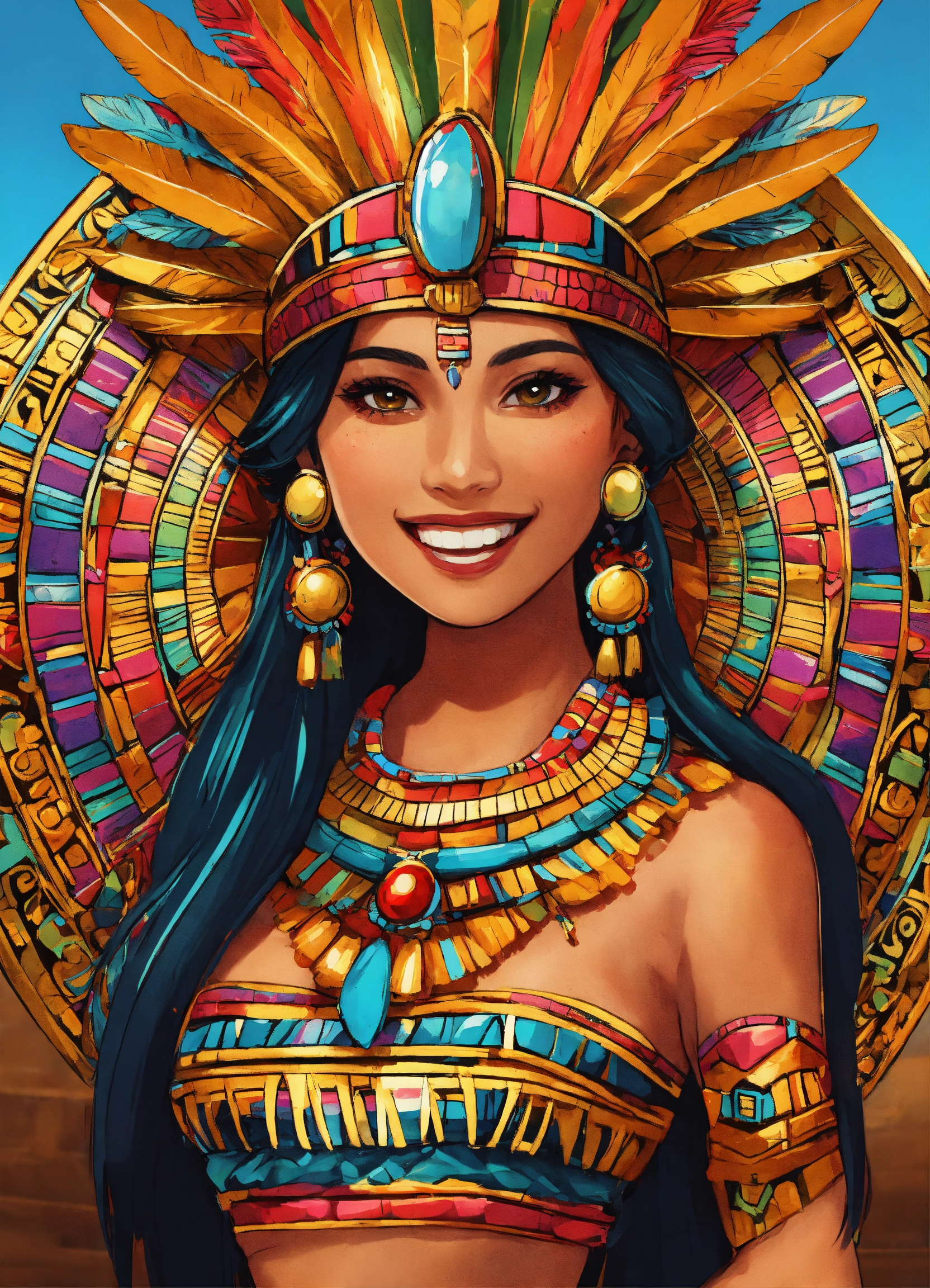 Aztec princess, portrait, high detail, ultra-high resolution, beautiful, latina, joyful smile, cartoonish, mayan.chrome shiney style