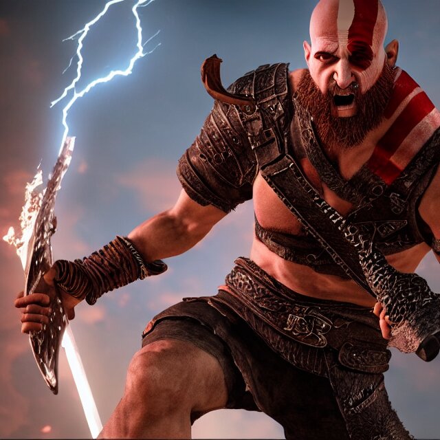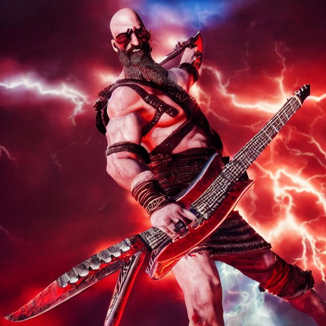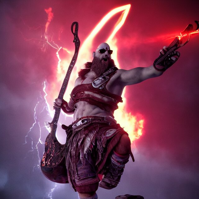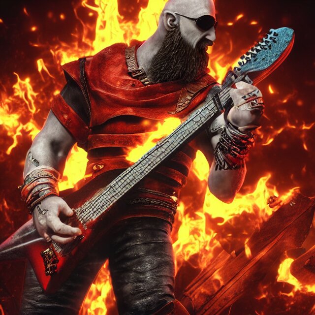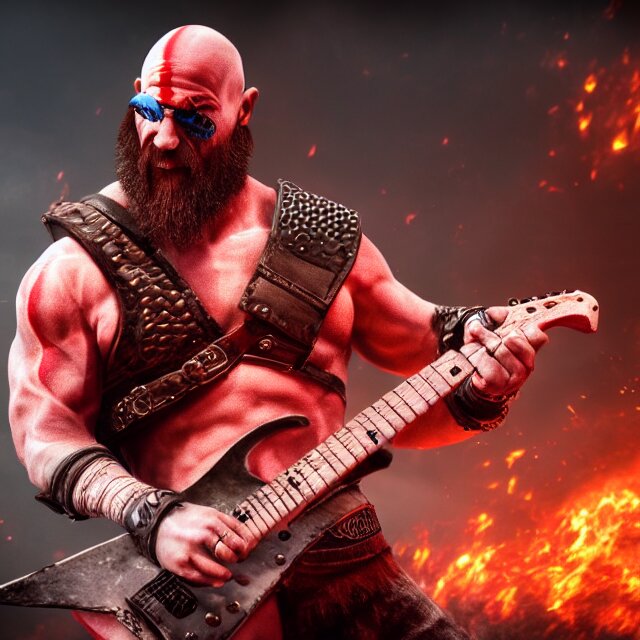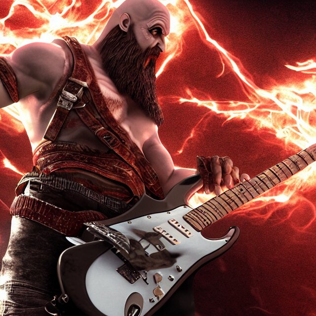 Sunglasses wearing kratos rocking out on a stratocaster axe. cinematic render, god of war 2 0 1 8, playstation studios official media, sunglasses, lightning, flames, red stripe tattoo