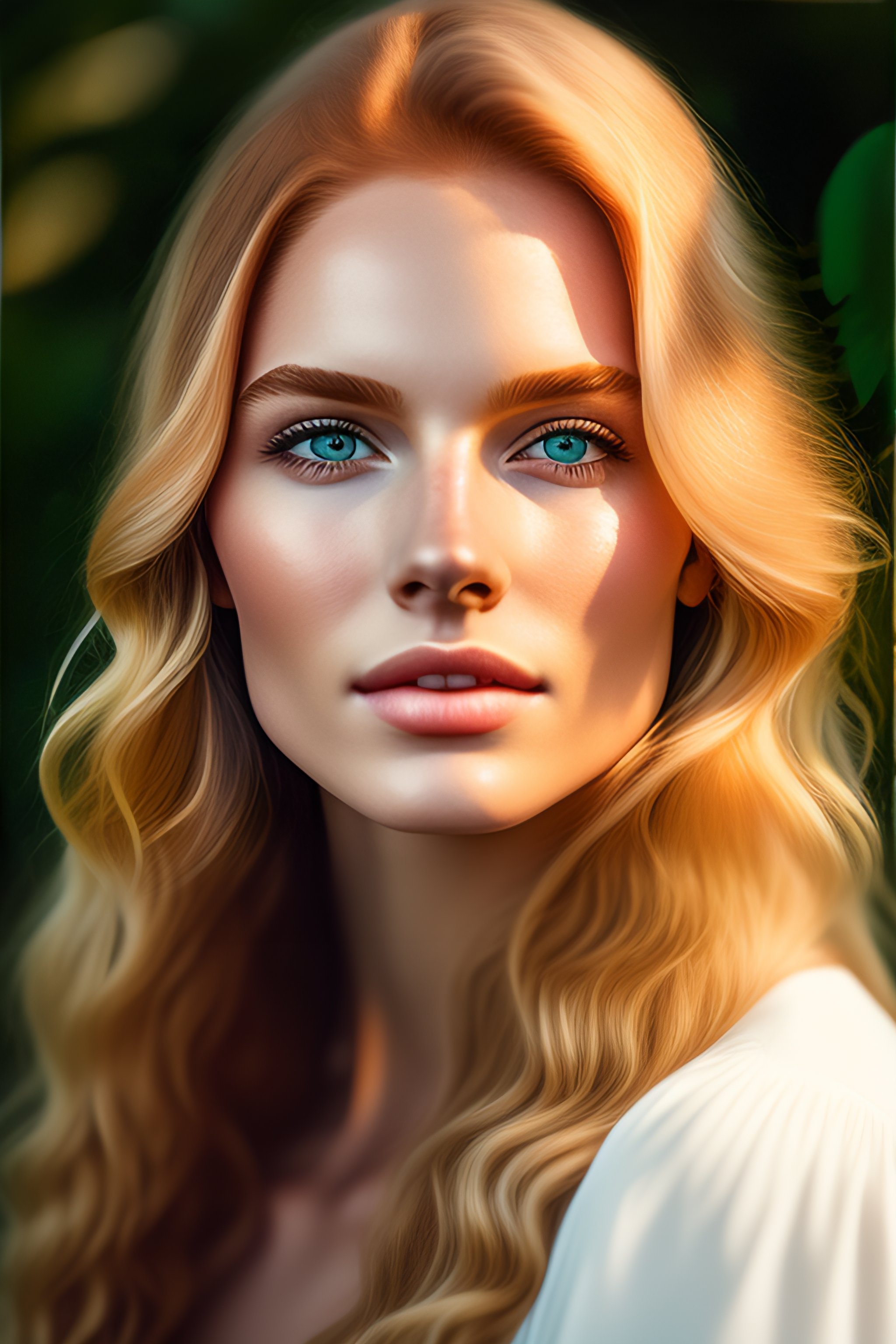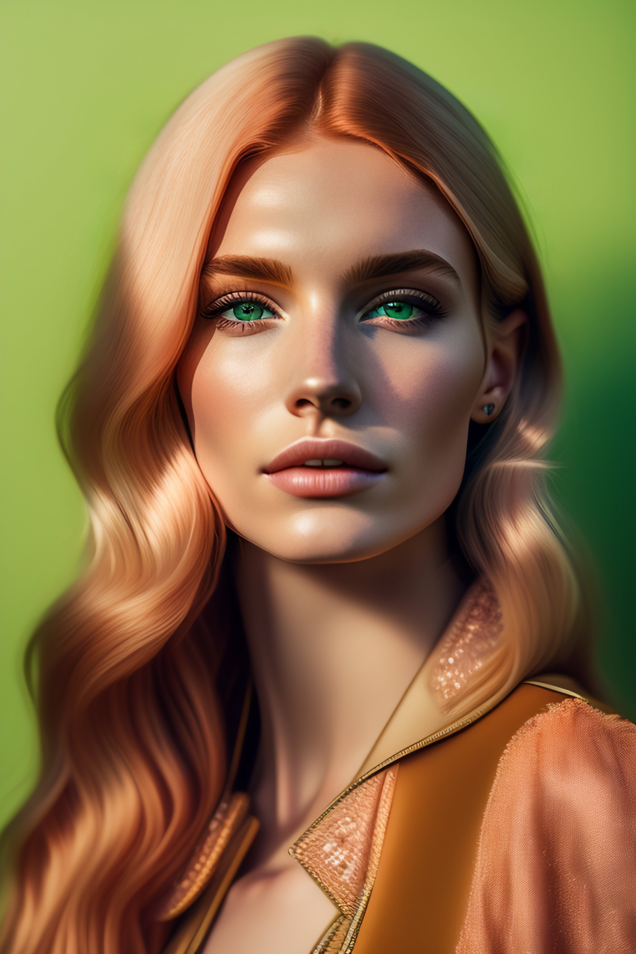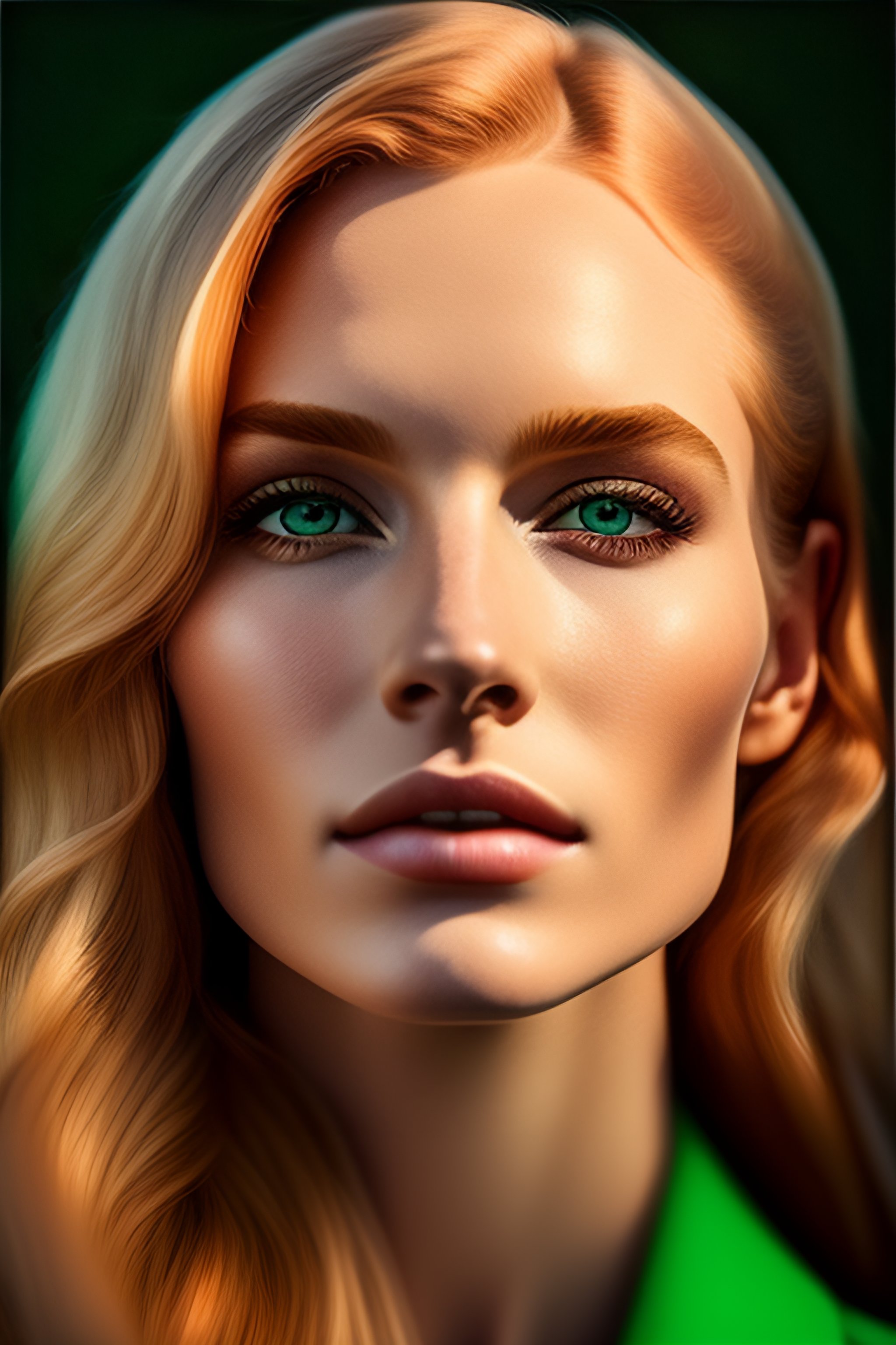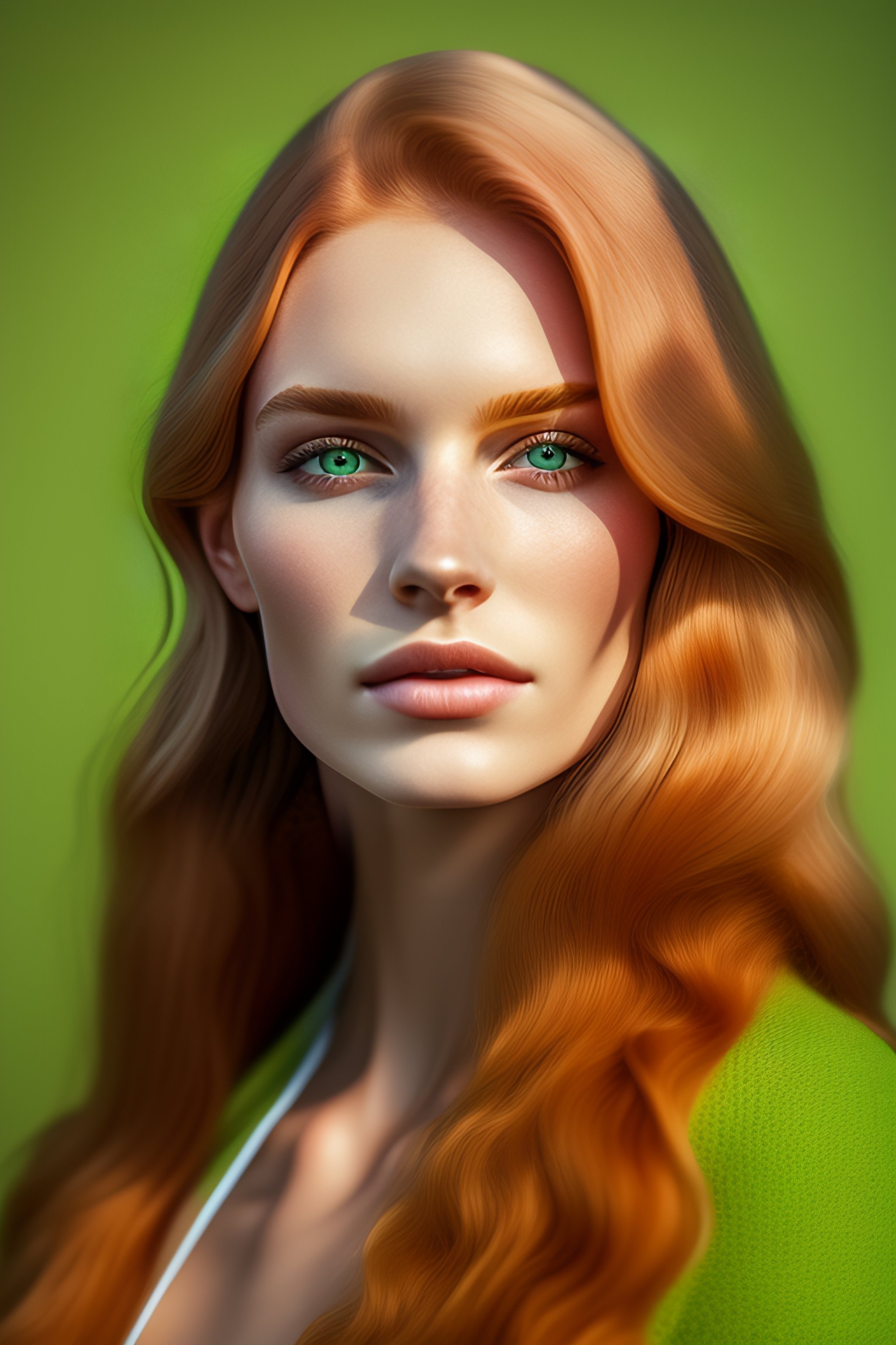 Color portrait of (strawberry blond green eye young woman), clear pale unblemished skin, fine - art photography, soft portrait shot 8 k, mid length, ultrarealistic uhd faces, unsplash, casual pose, centered symmetrical composition, sharp, centered composition