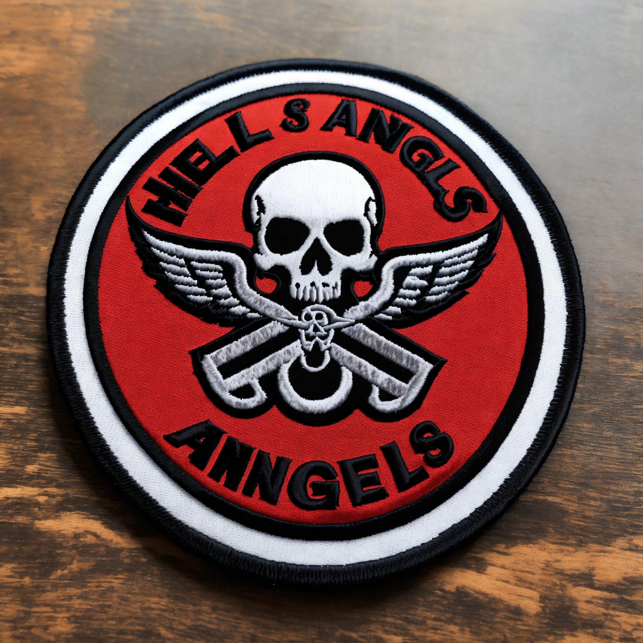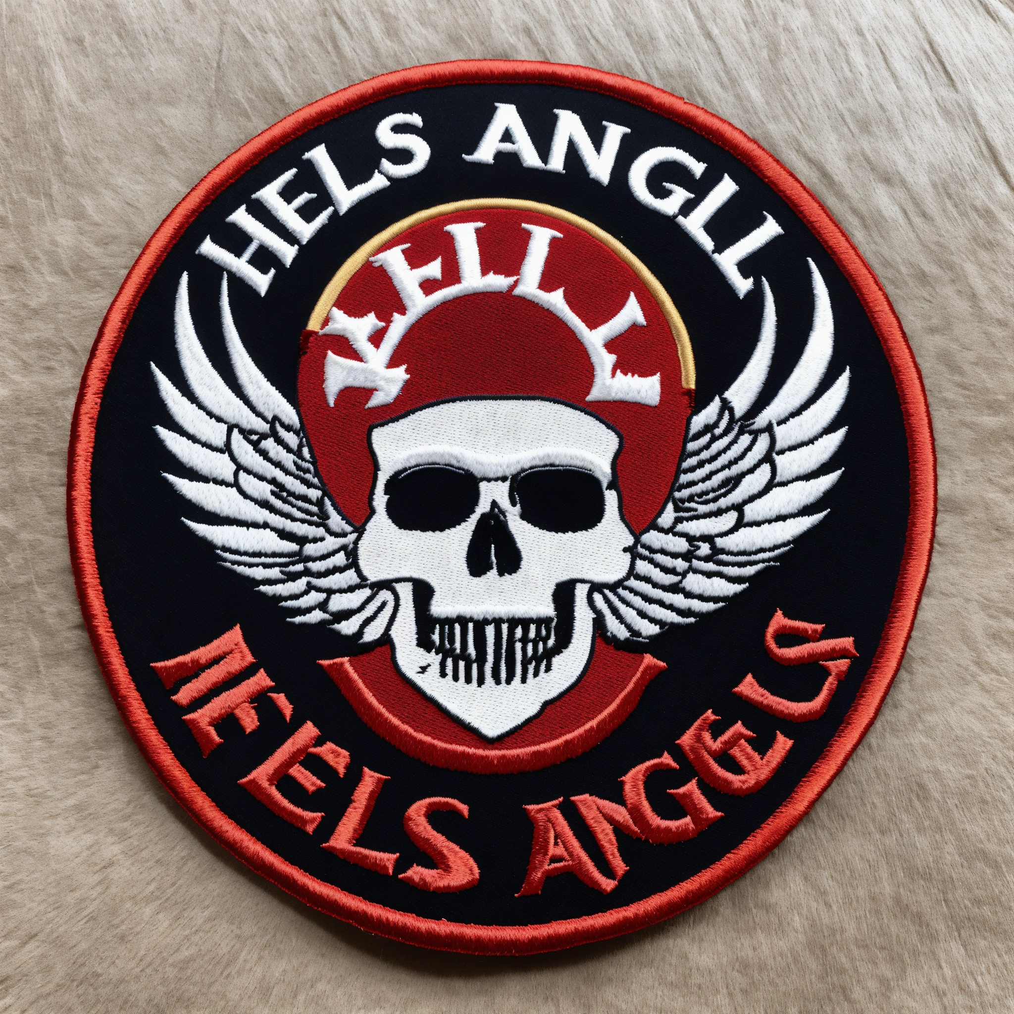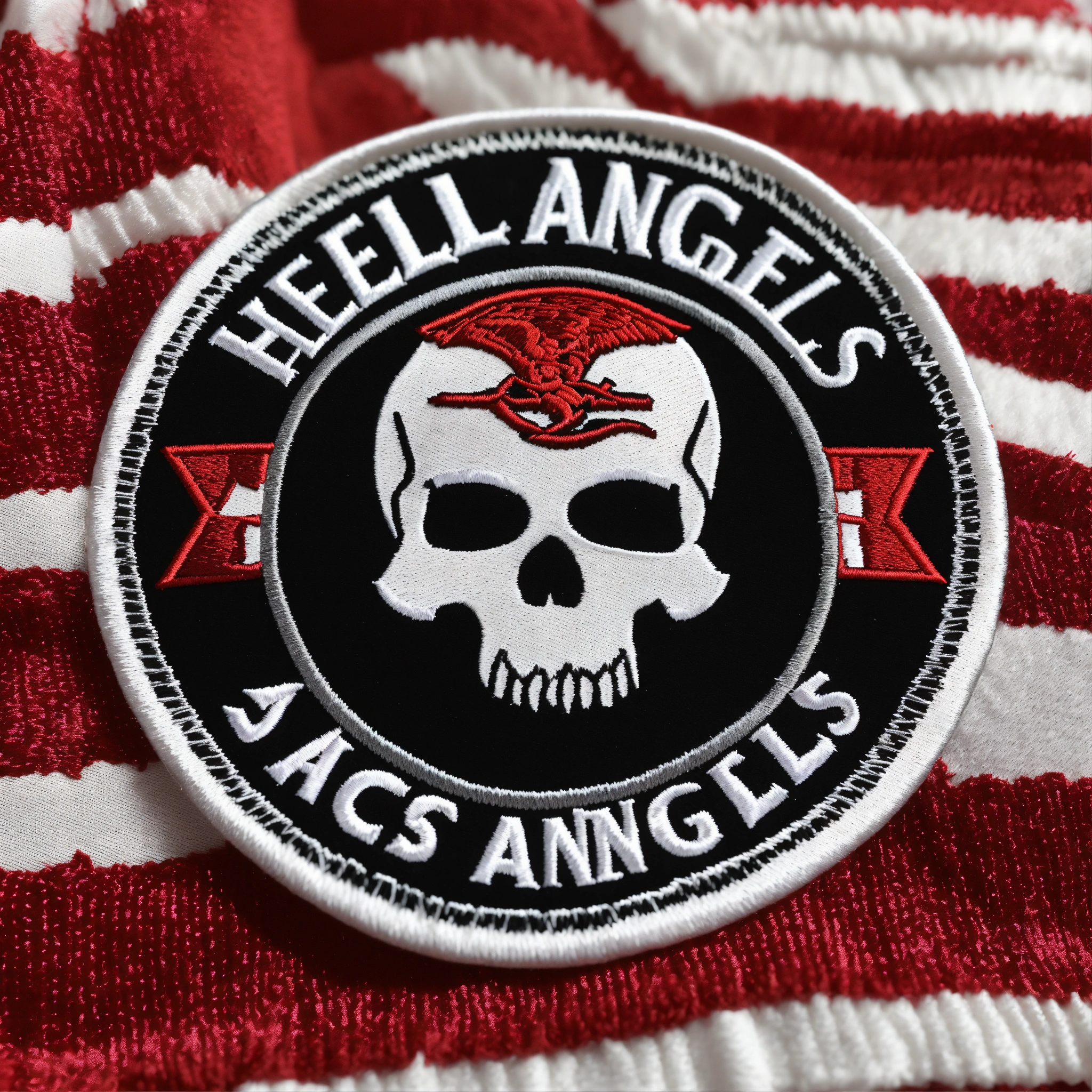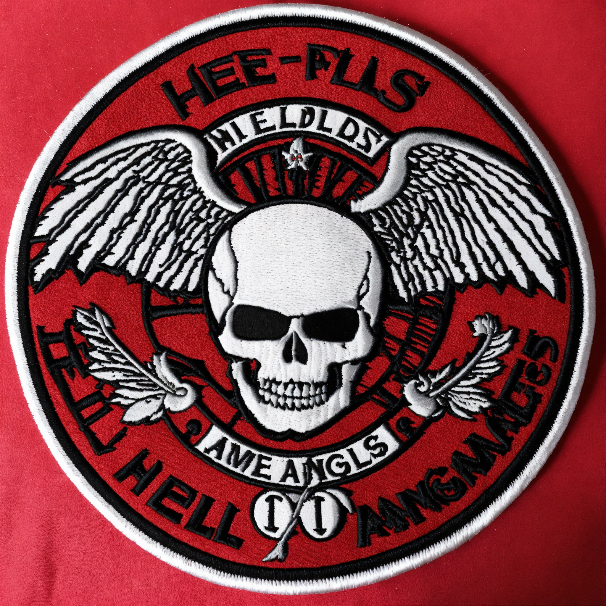 A round embroidered patch hells angels logo, no face skull, with skull profile with white wings in the center of a textured white fabric. inspired by the 1980s, incorporating the hells angels logo, embroider the text “hells angels” in red on a white background. maintain a striking balance of red and white colors for a vibrant design.