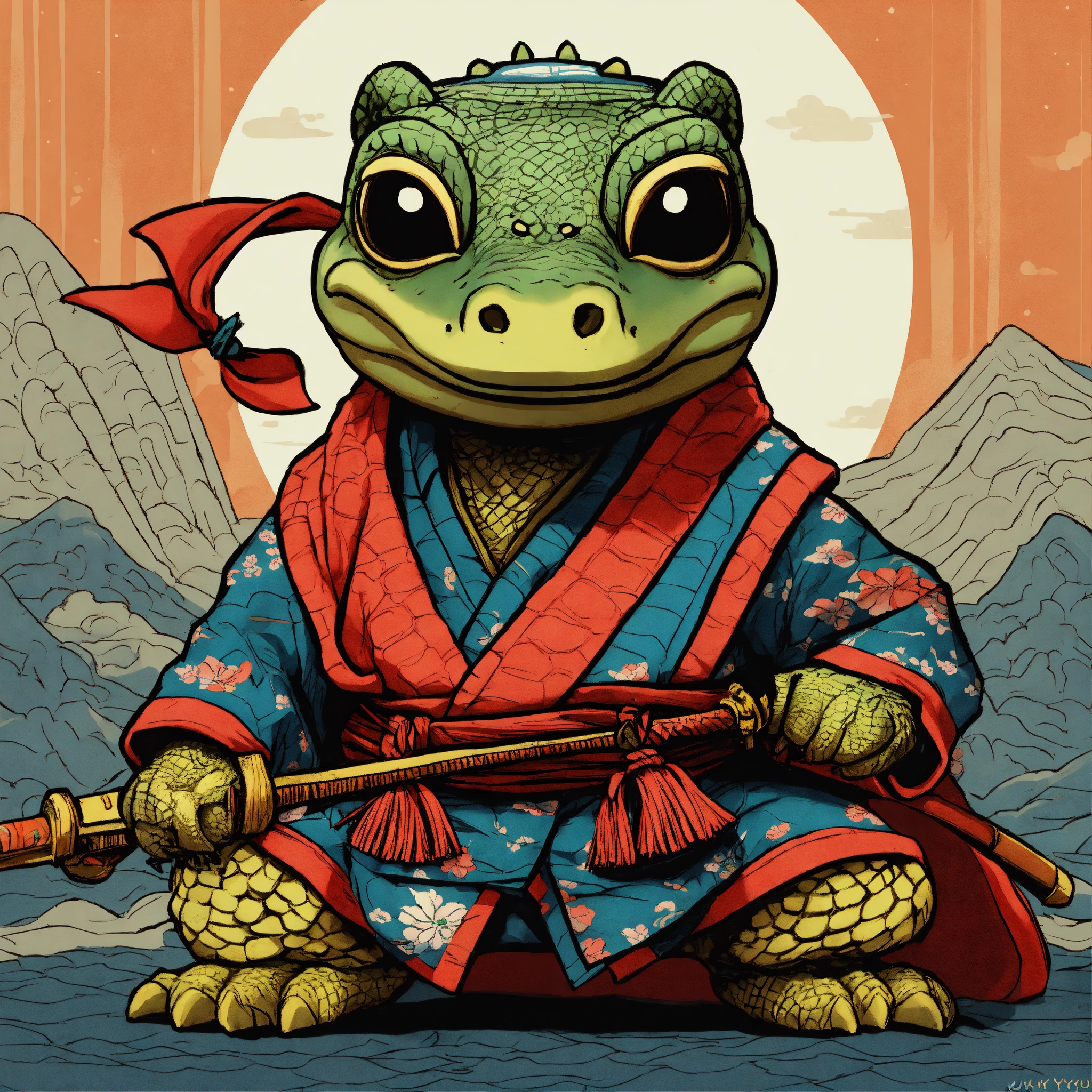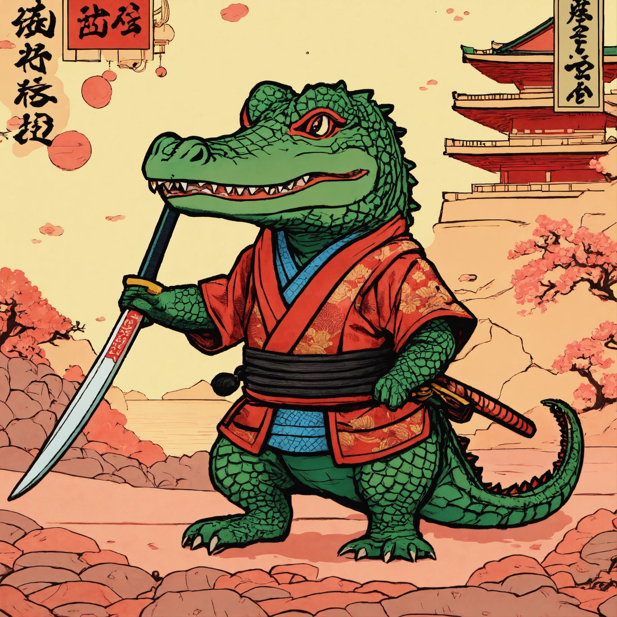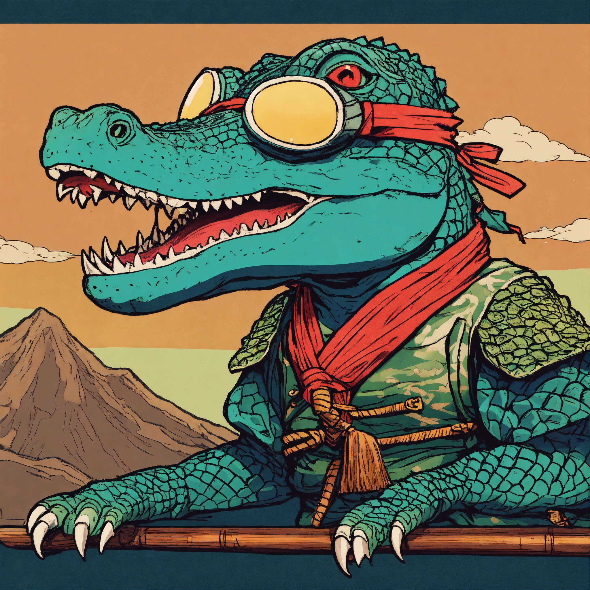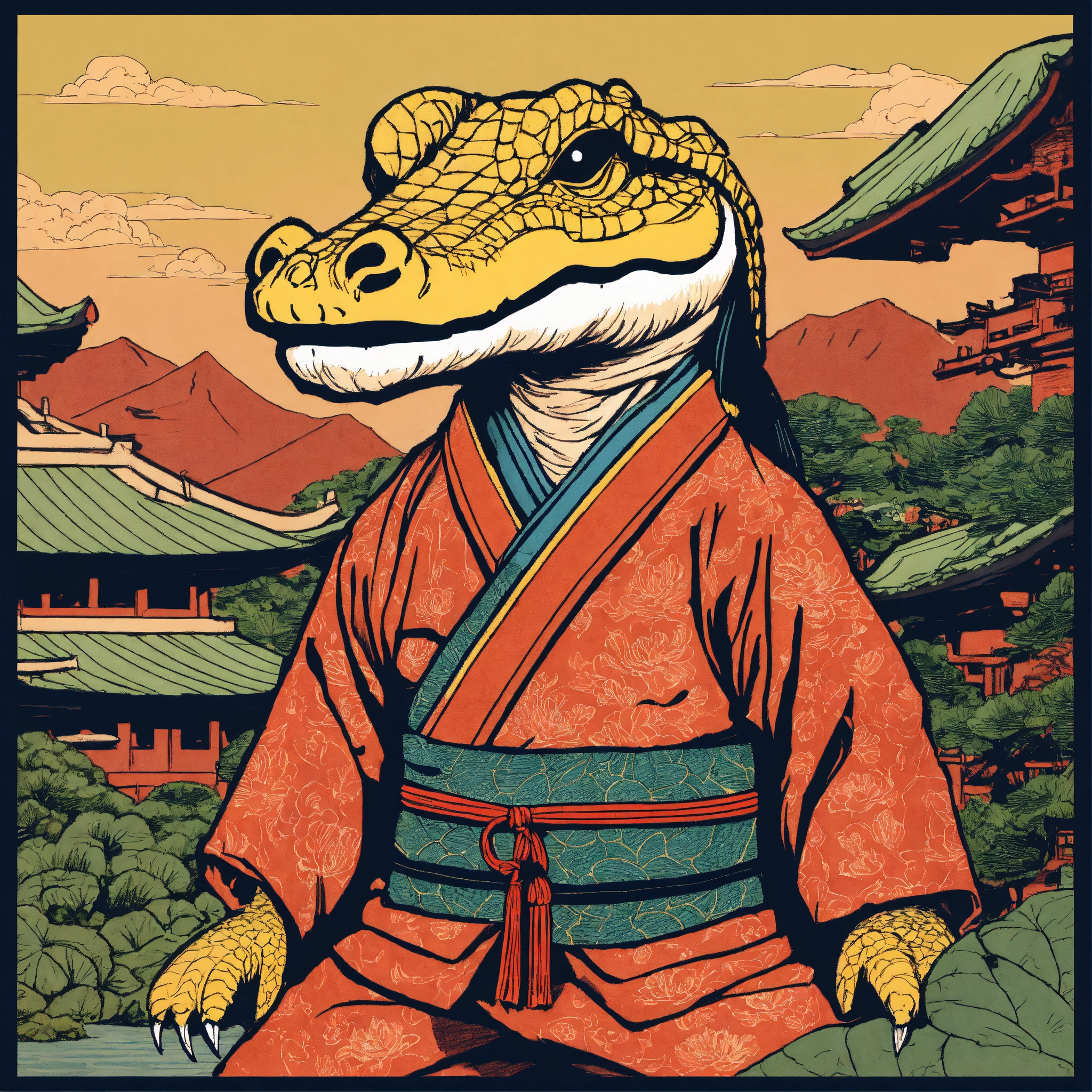 Wes anderson style crocodile ninja, super cute, by kanō tan'yū, highly detailed and colored, in the art style of ukiyo - e, inspired by utagawa kuniyoshi