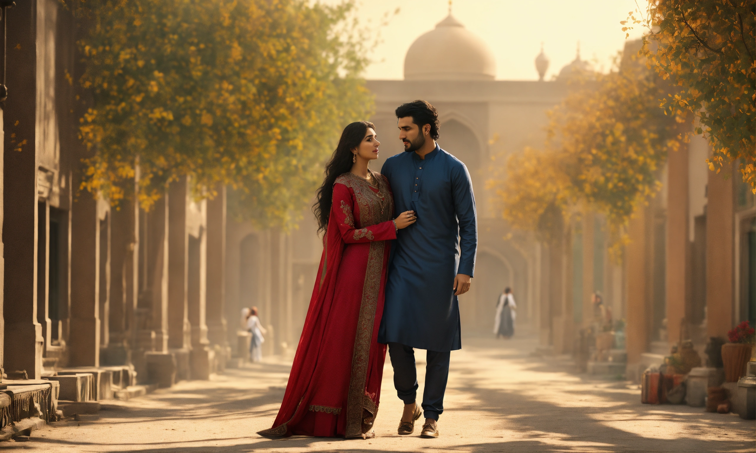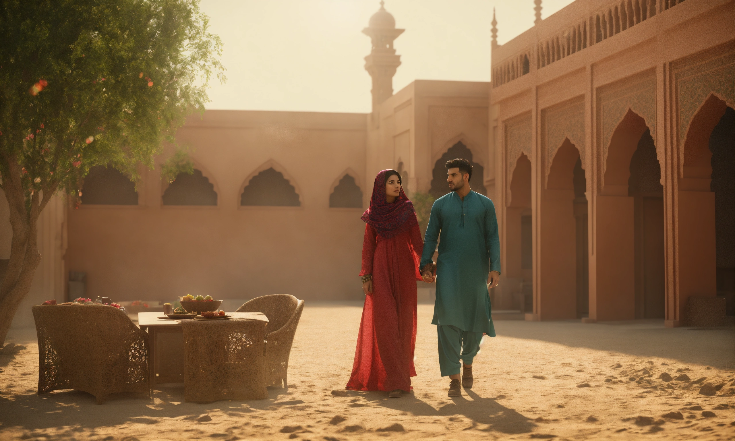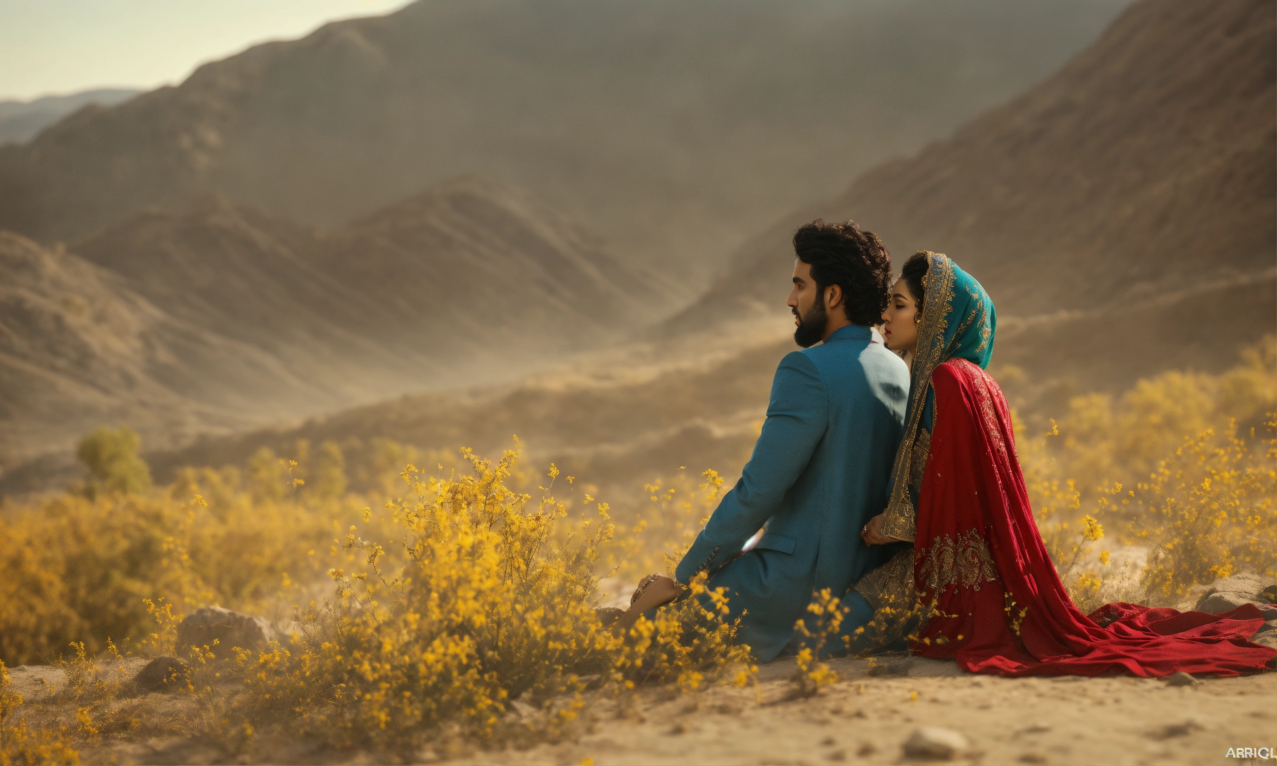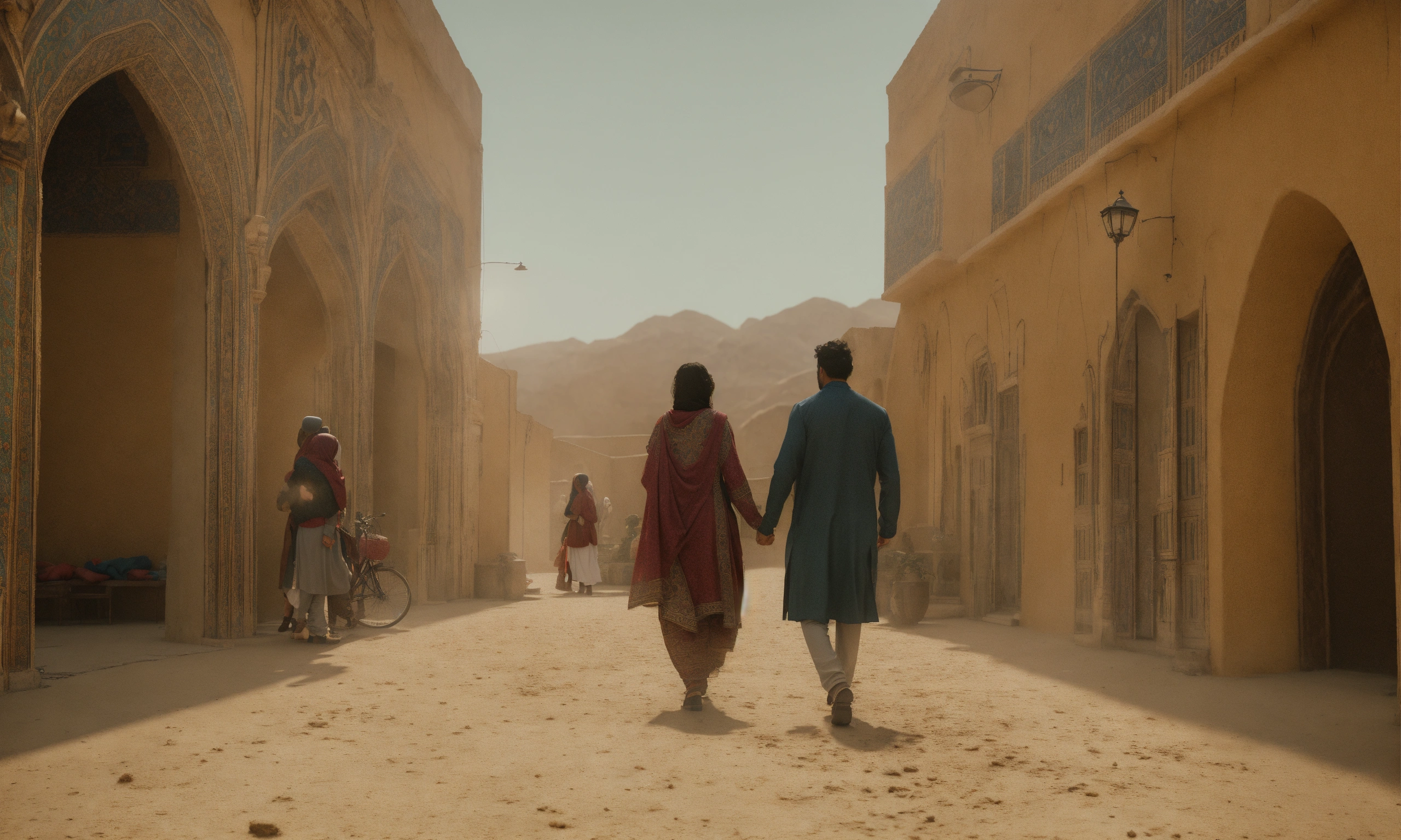 1 afghani couple romantic, wide front shot, exterior day time, 8k, luxcorerender, earthly colour, cinematic photography, real humans, real images, matte finish, shot on arri anamorphic, extreme wide shot, smooth, sharp focus, ornate, highly dynamic, particulate, hyperreal, wide shot.