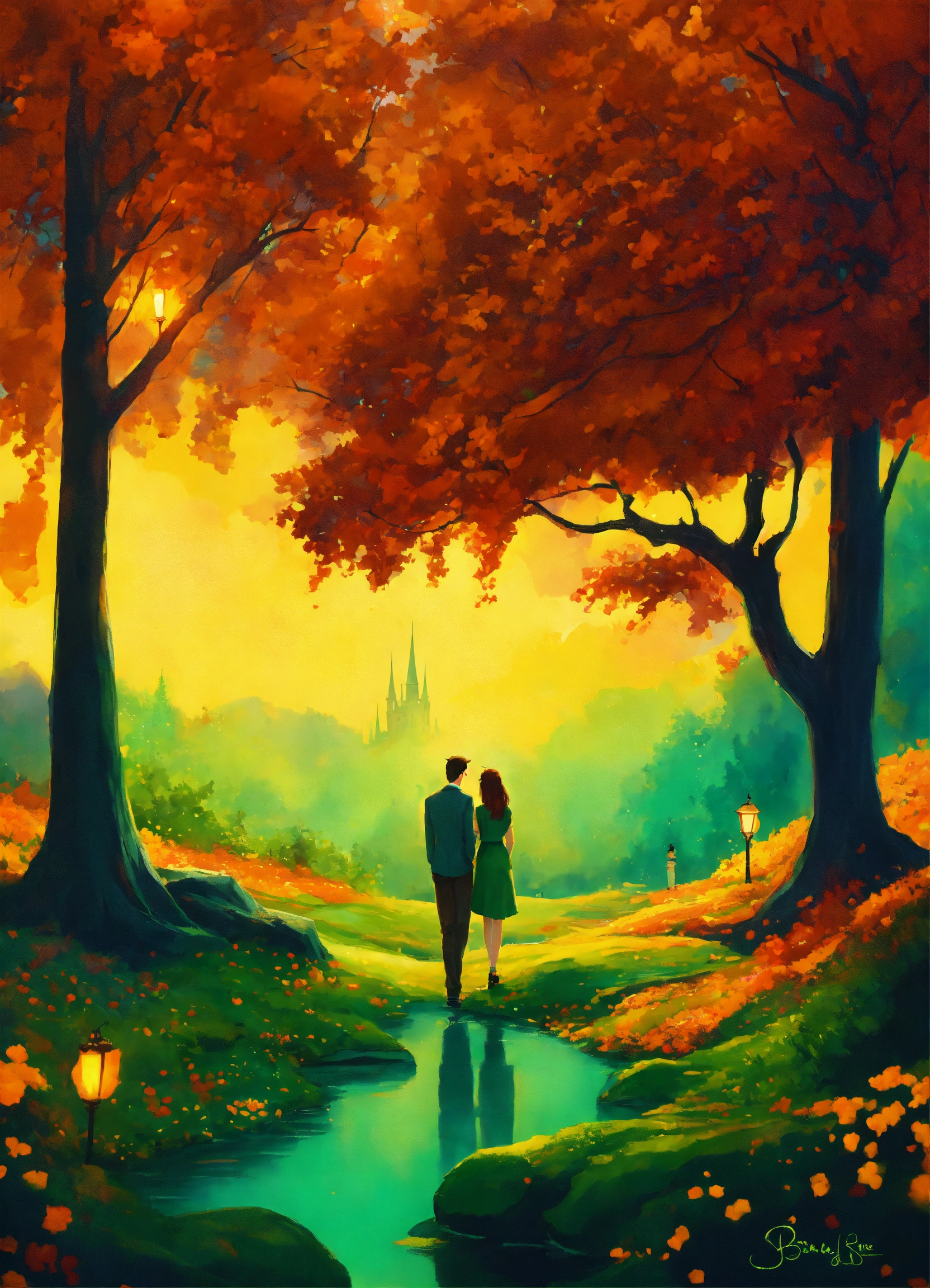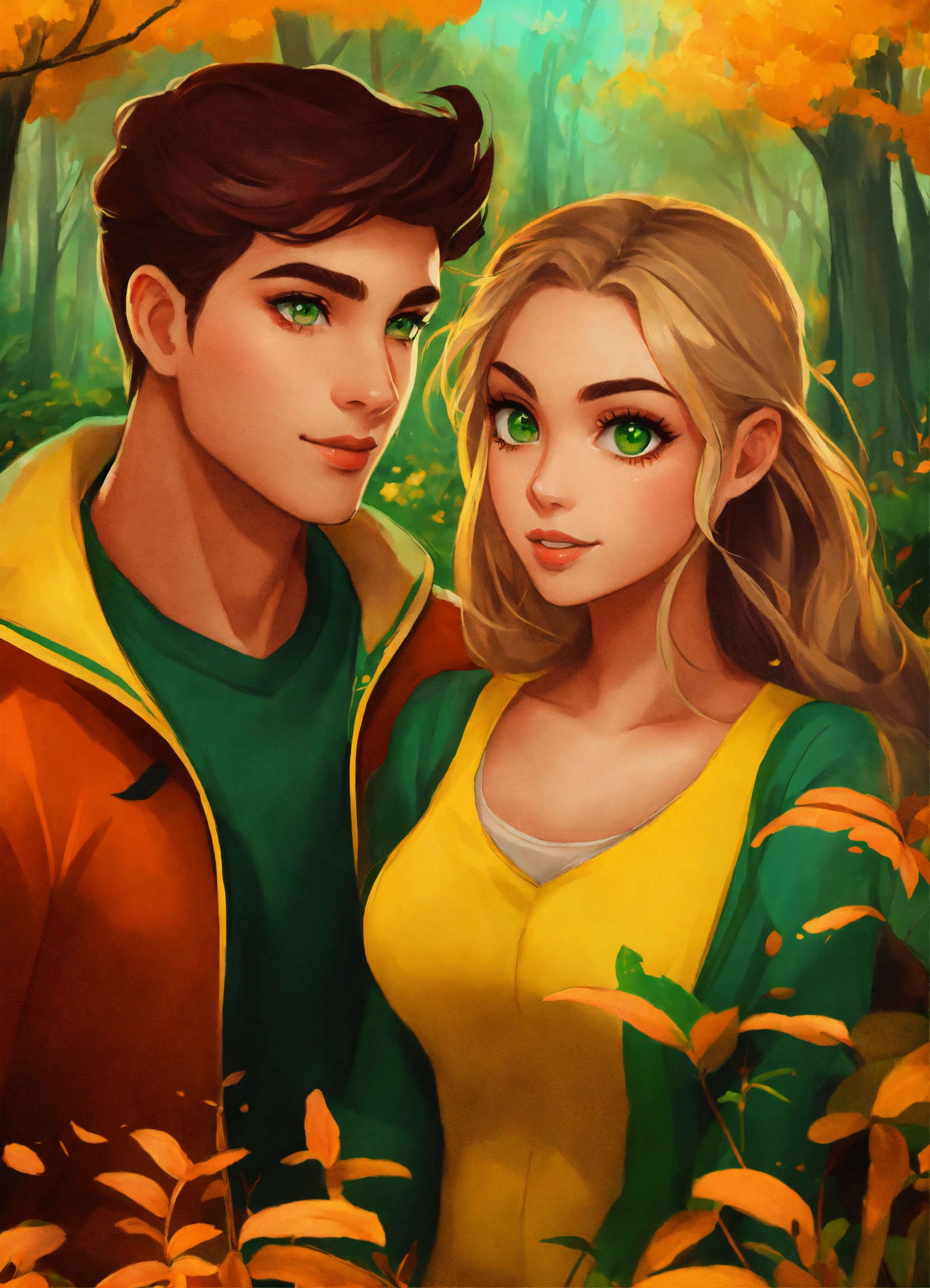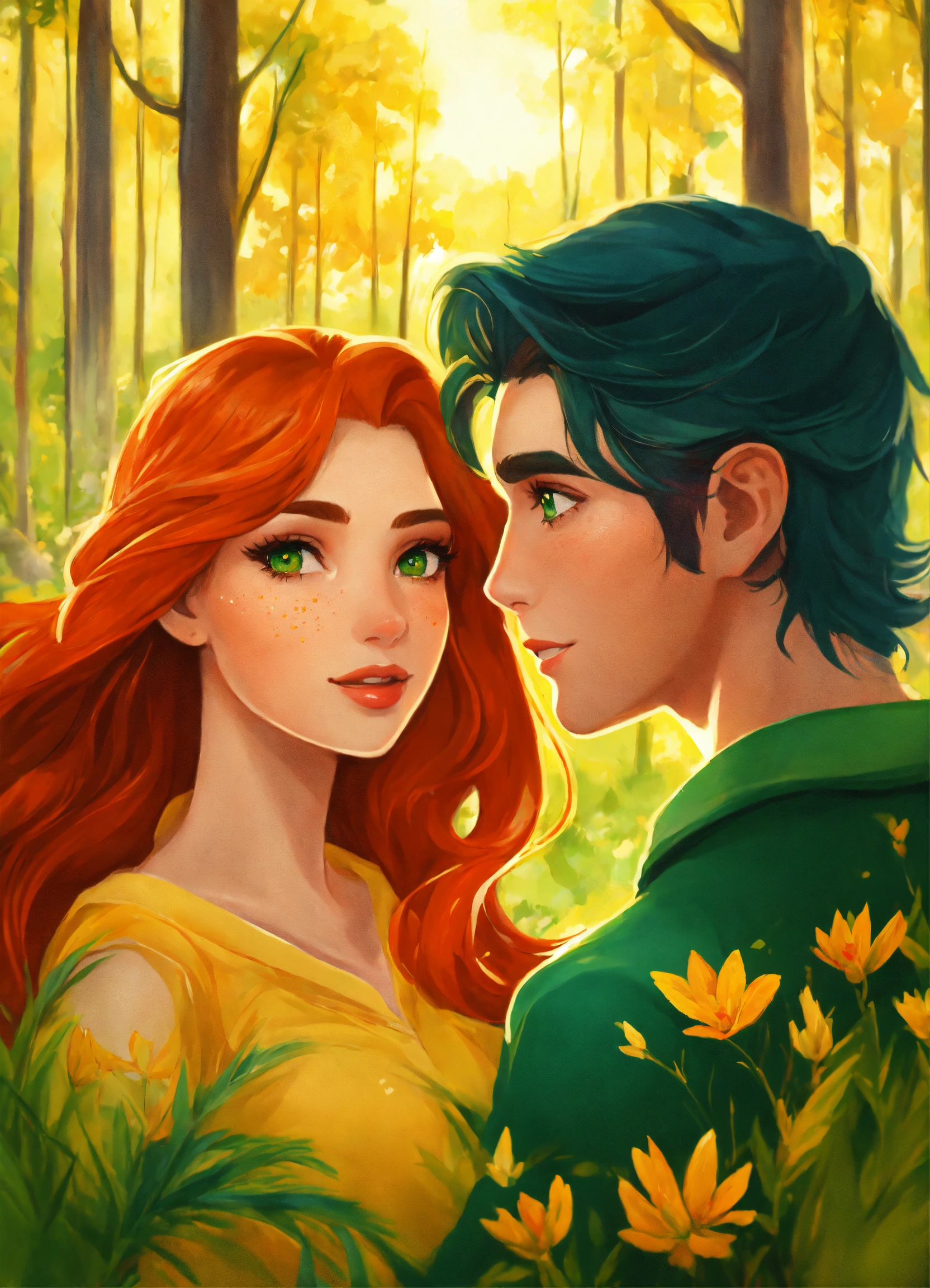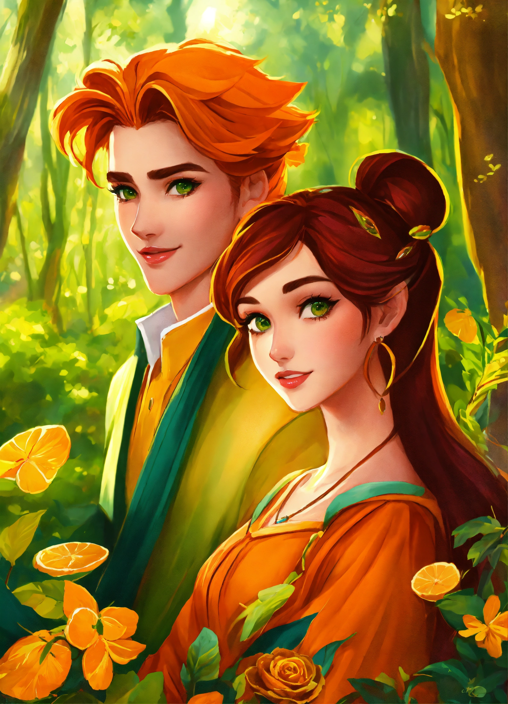 Arte estilo disney, pareja, mujer cabello naranja ojos cafes, hombre cabello amarillo ojos verdes, paisaje bosque rojo