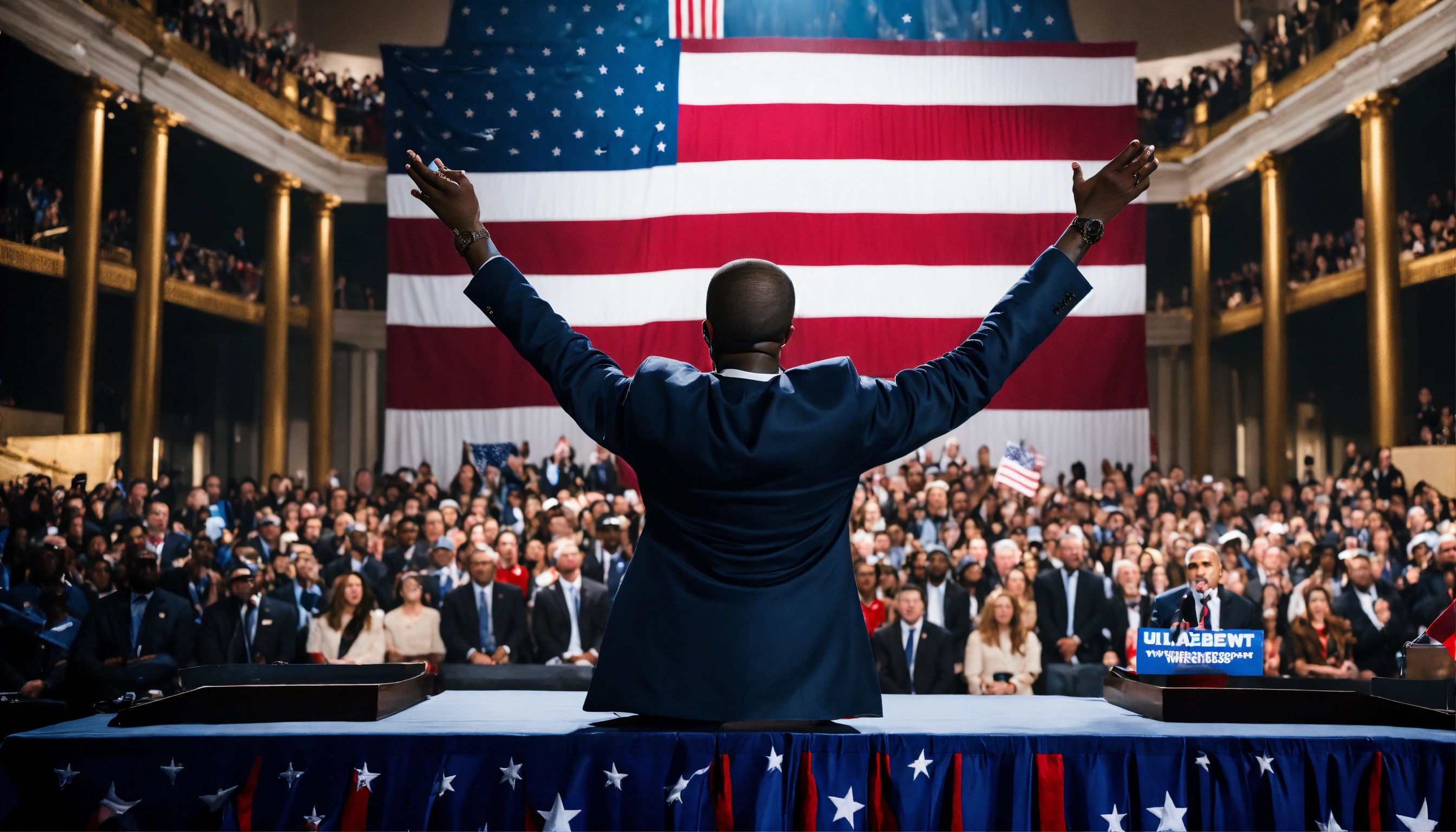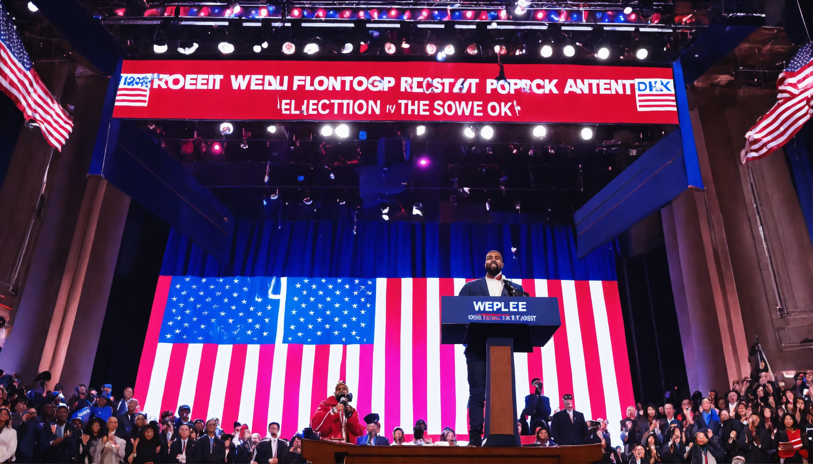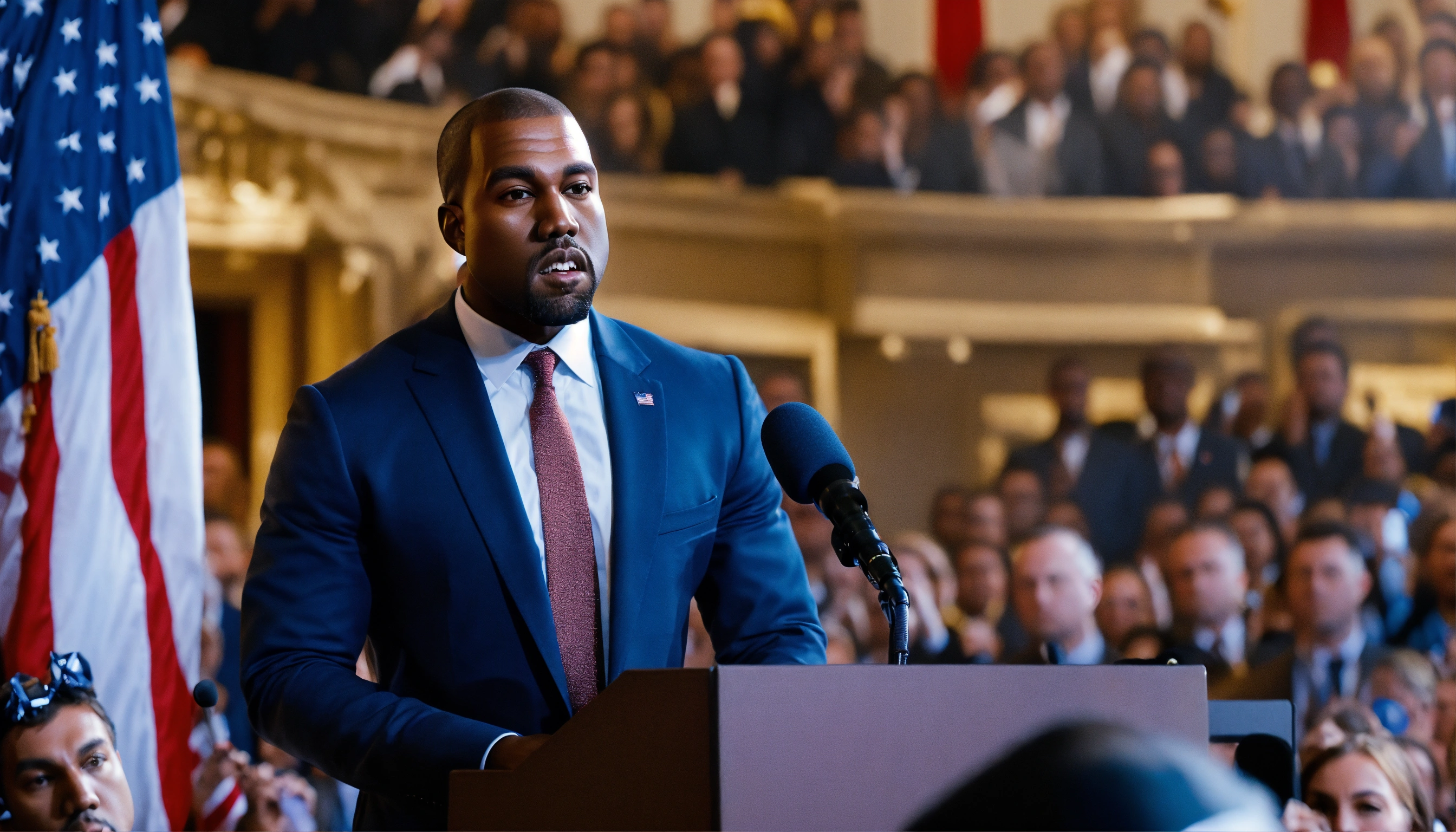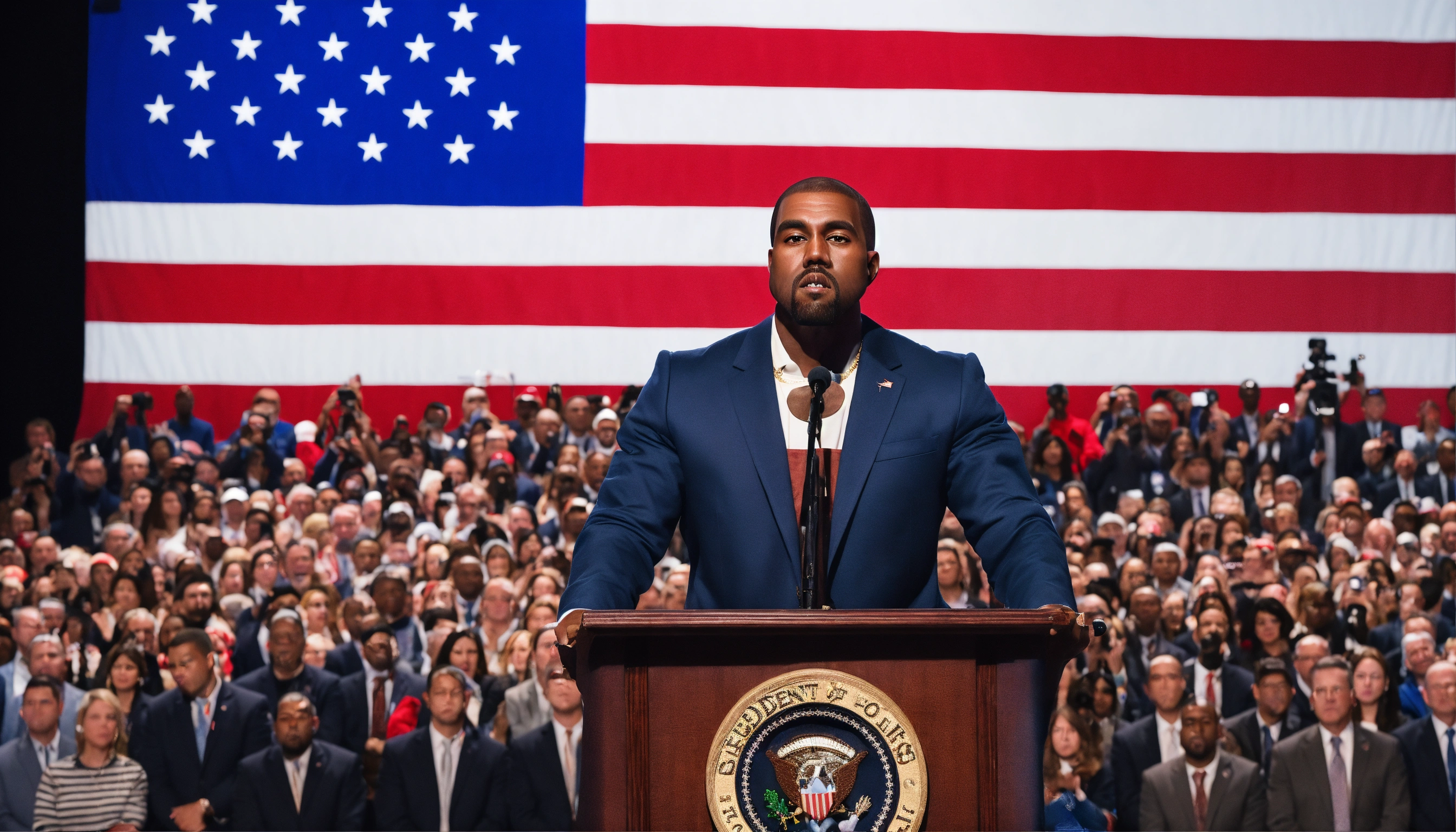 An ultrarealistic photograph of kanye west, president, in suit, in front of crowd, giving election speech, american flag 8k.