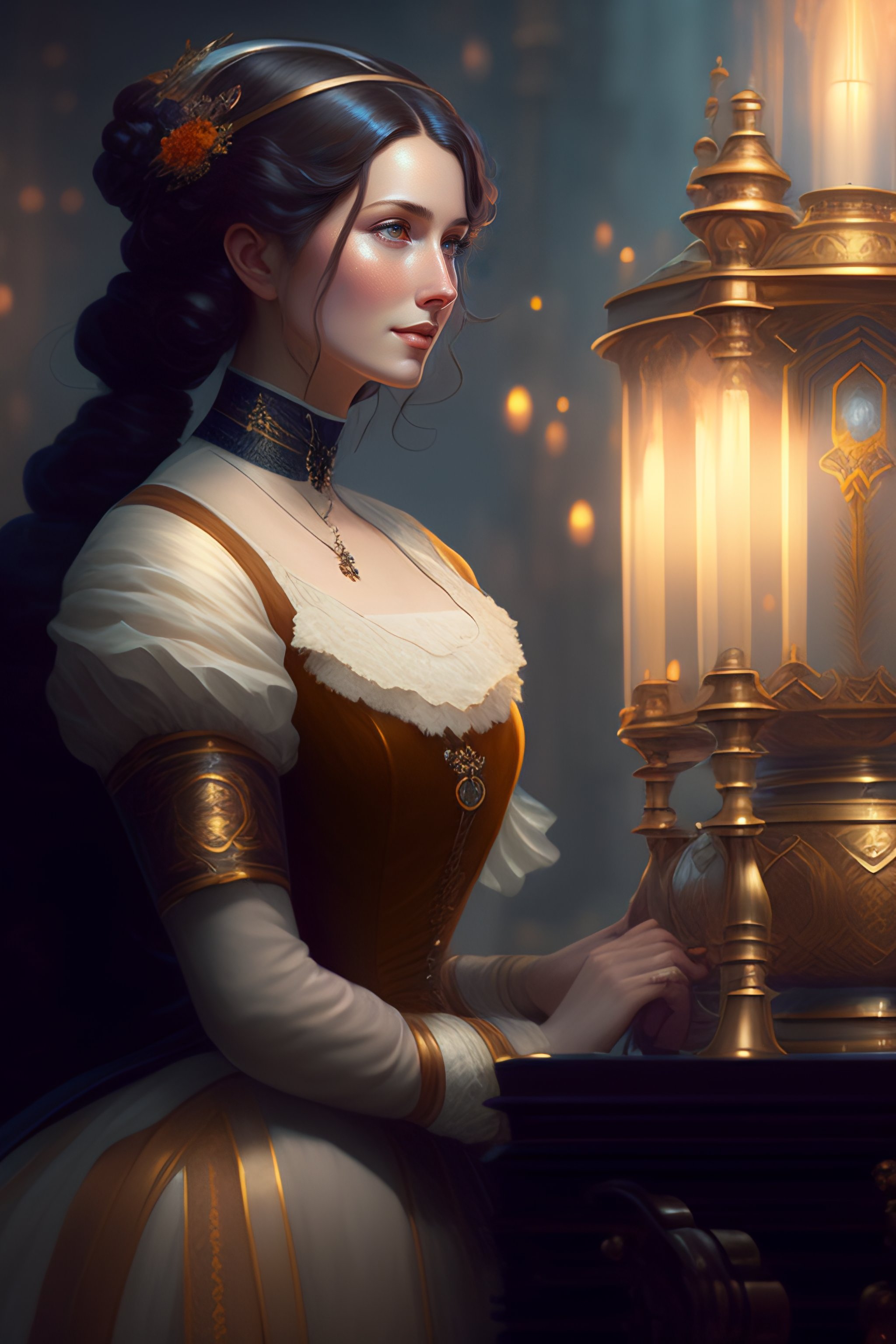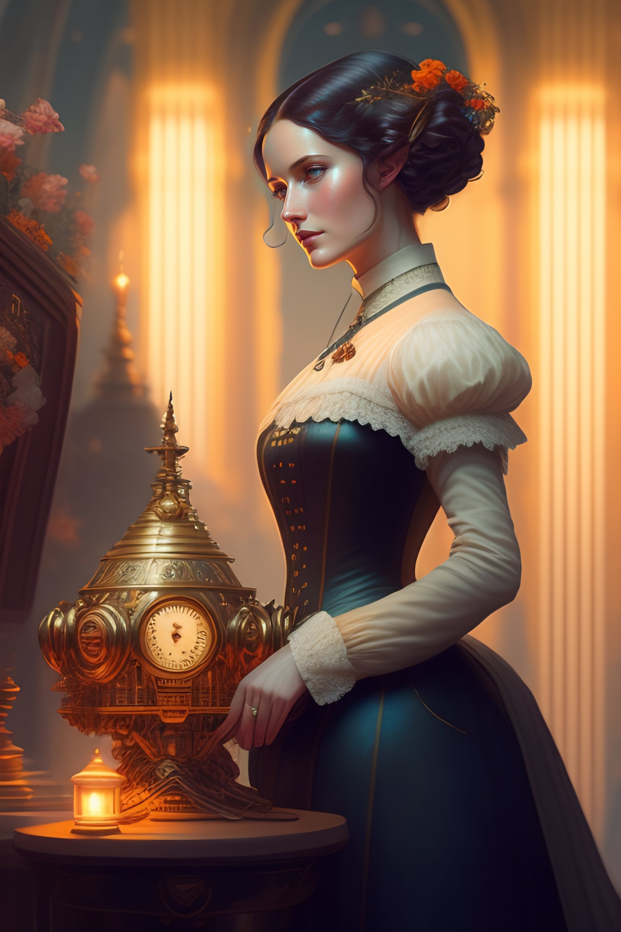 A photo of ada lovelace working with the analytical engine, stephen bliss, unreal engine, fantasy art by greg rutkowski, loish, rhads, ferdinand knab, makoto shinkai and lois van baarle, ilya kuvshinov, rossdraws, tom bagshaw, alphonse mucha, global illumination, radiant light, detailed and intricate environment, gradient as background color, warm colors