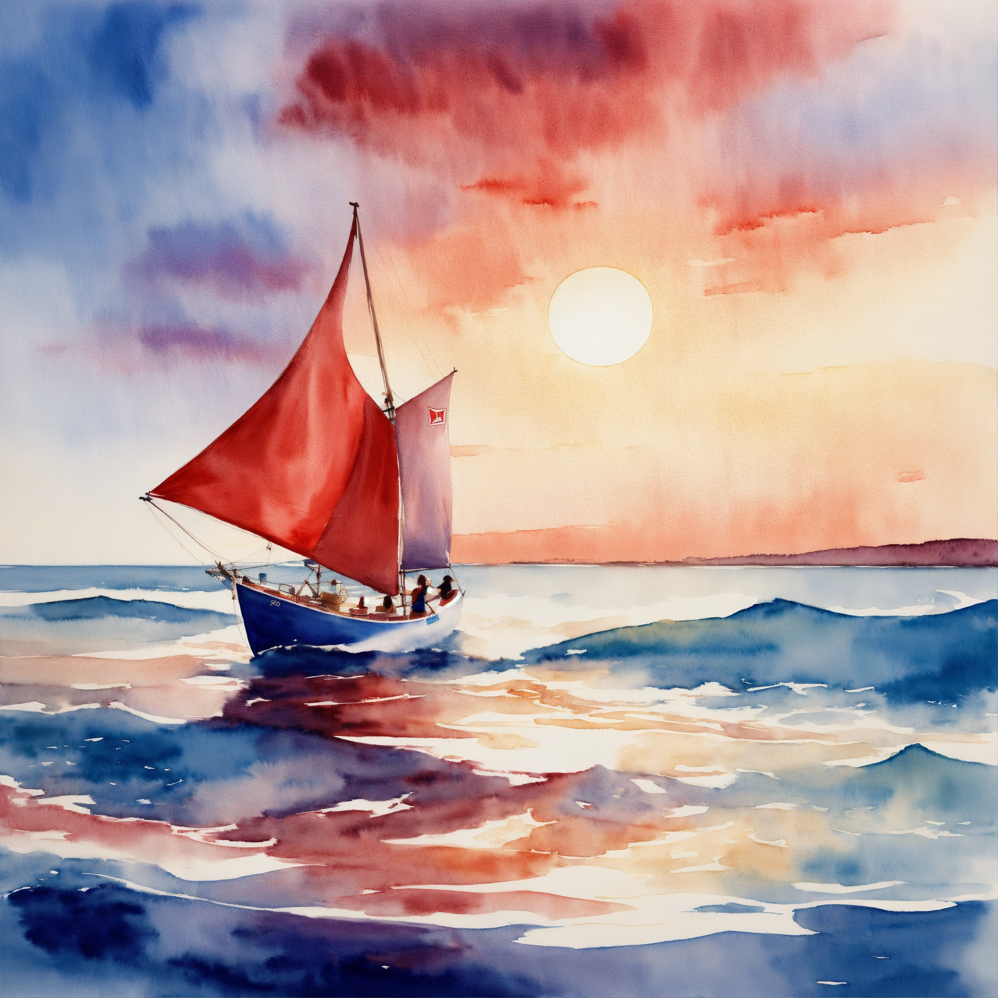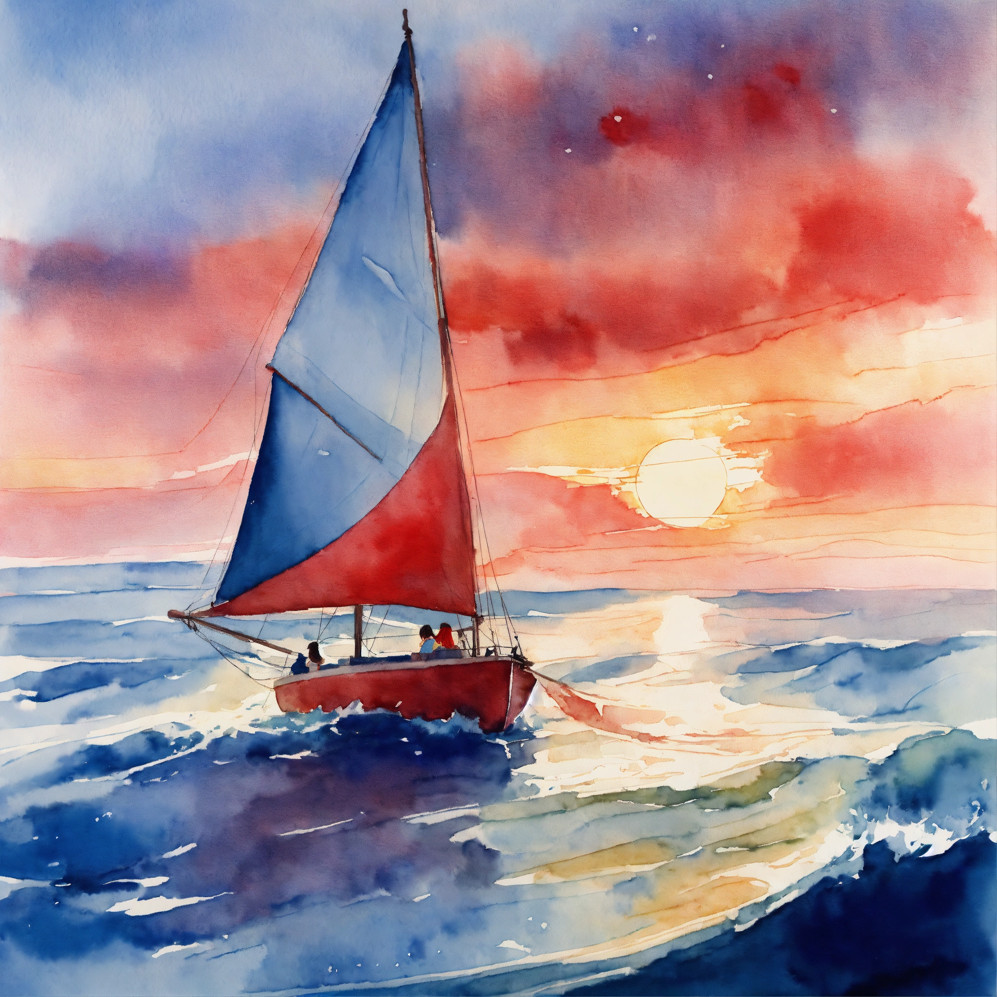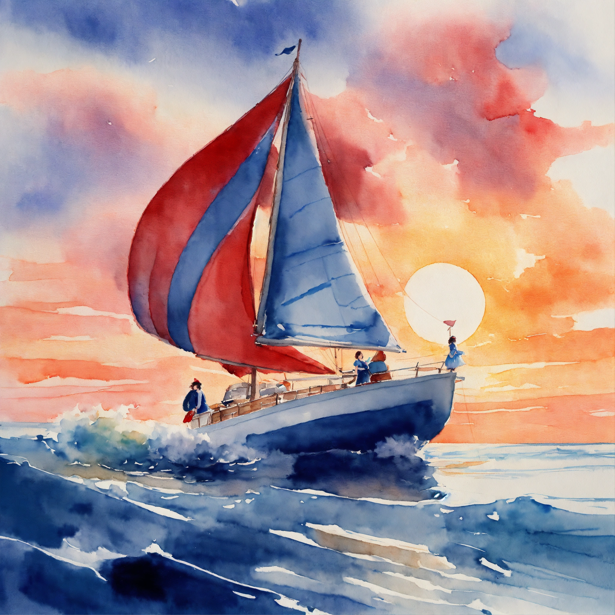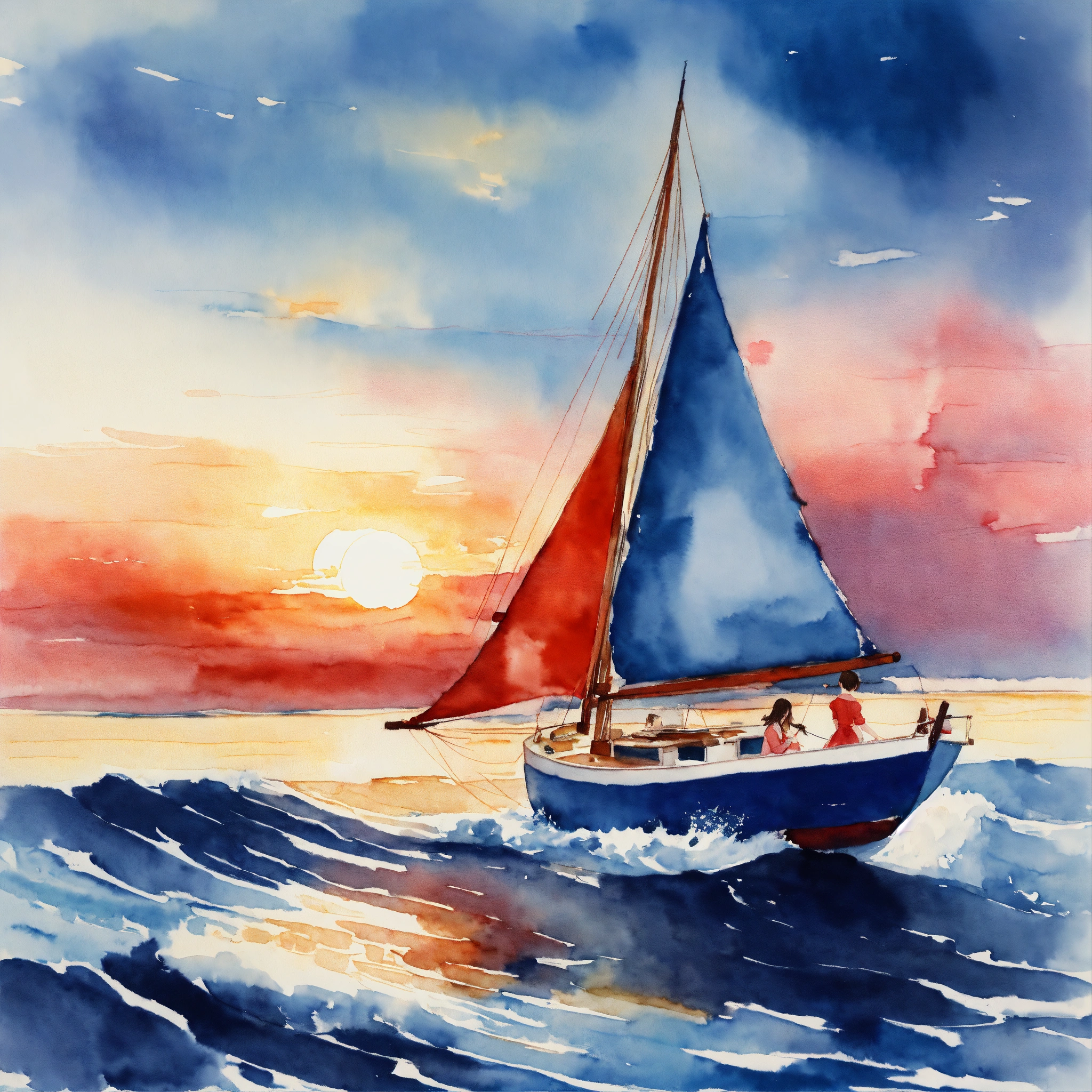 Watercolor picture of a woman in long romantic blue dress sailing on a white boat with red sails in a wavy windy ocean at sunset