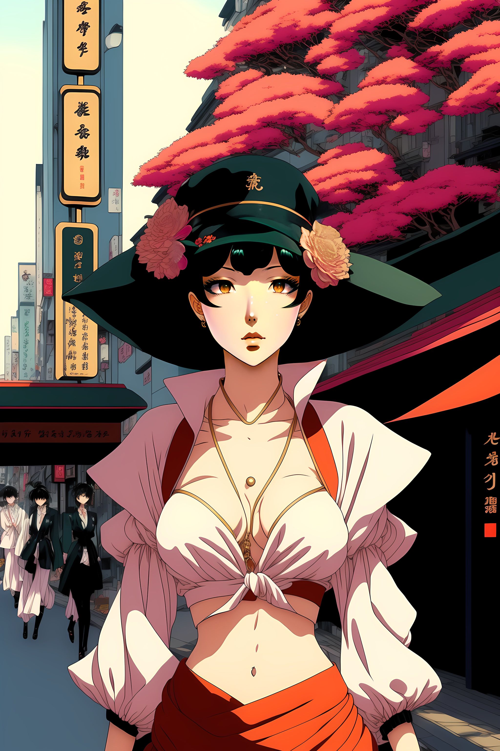 Vintage 90's anime style. fashionable floral model walking in kyoto's busy street; by kaethe butcher, hajime sorayama, greg tocchini, virgil finlay, sci-fi