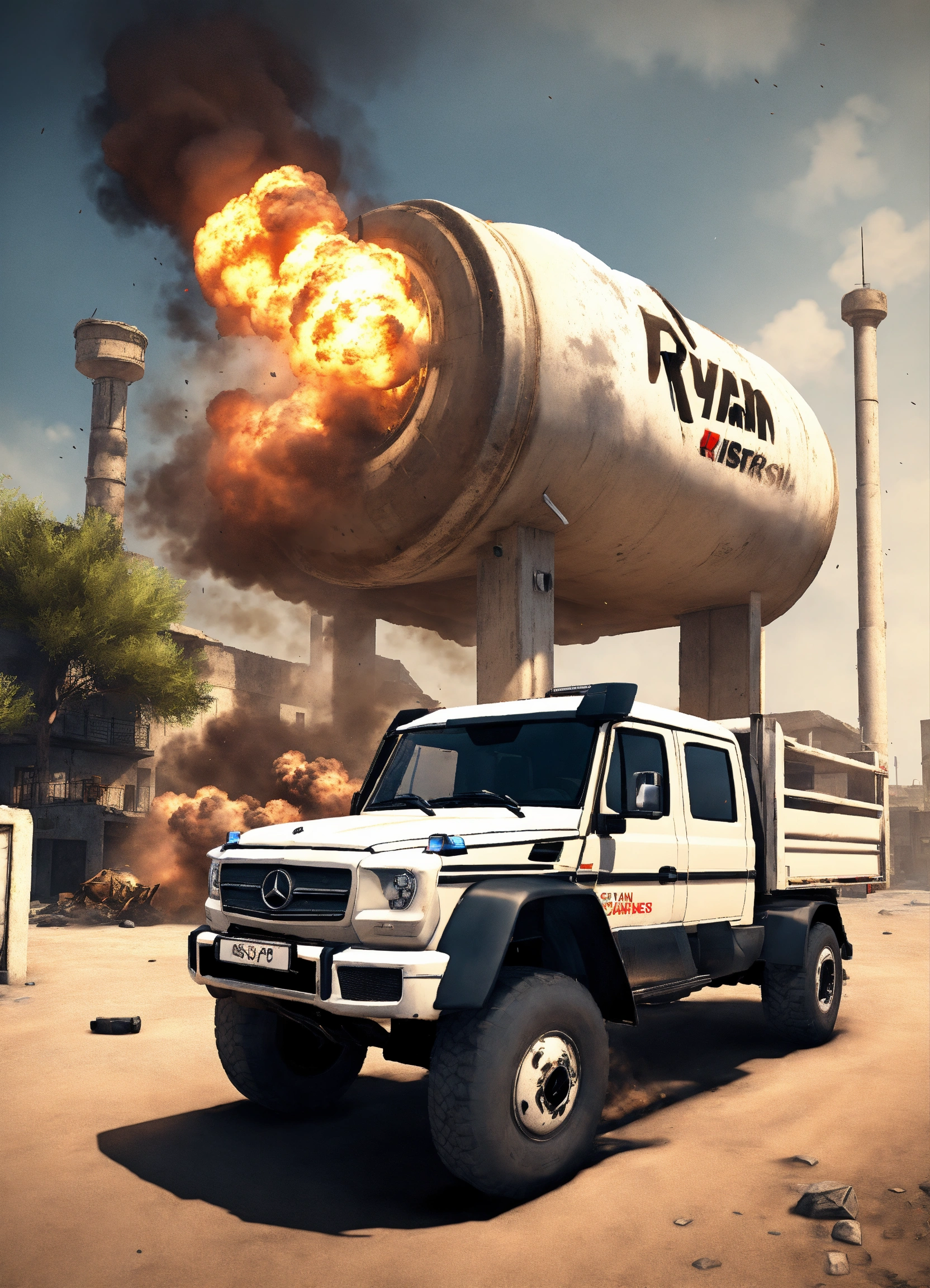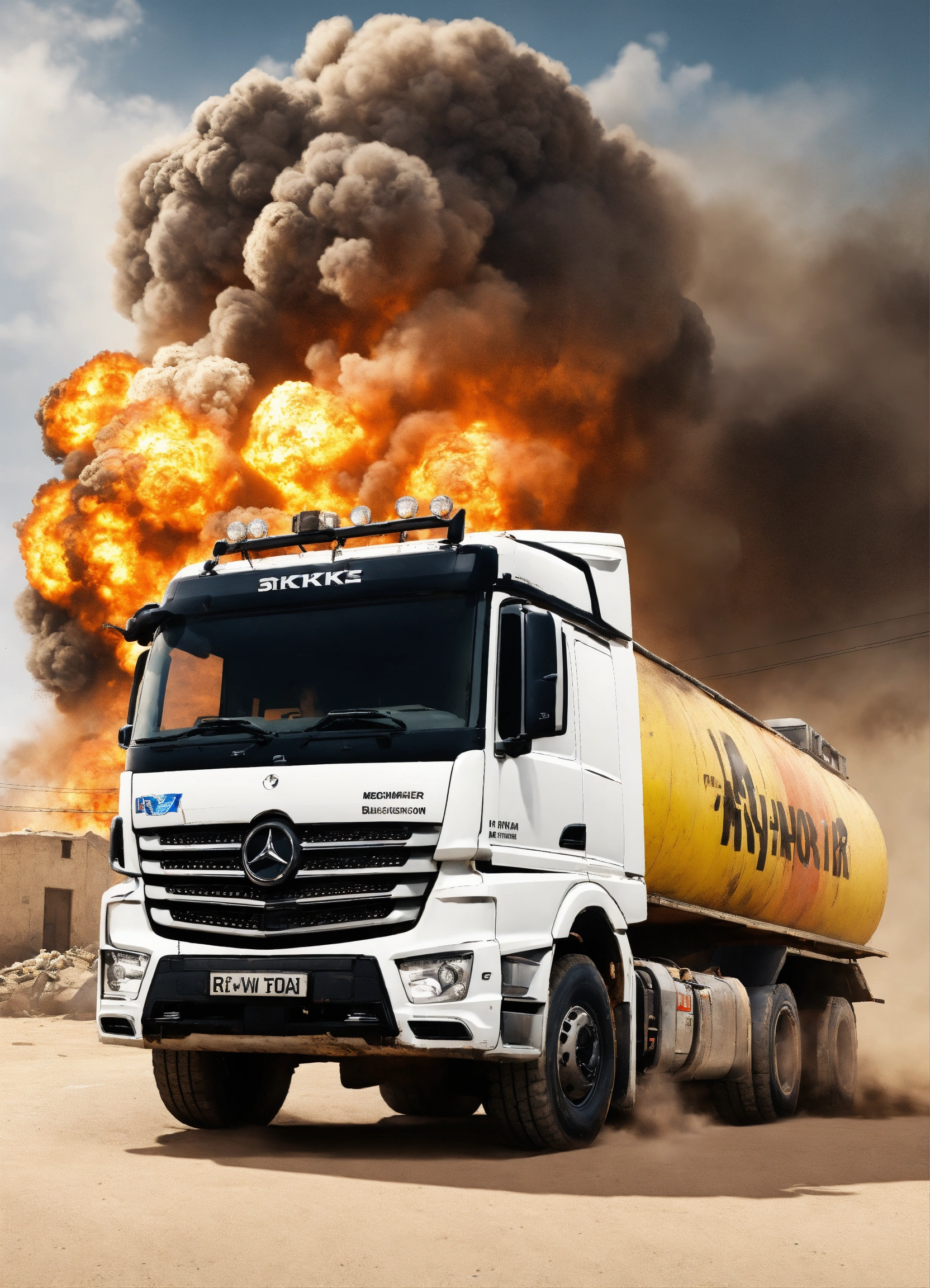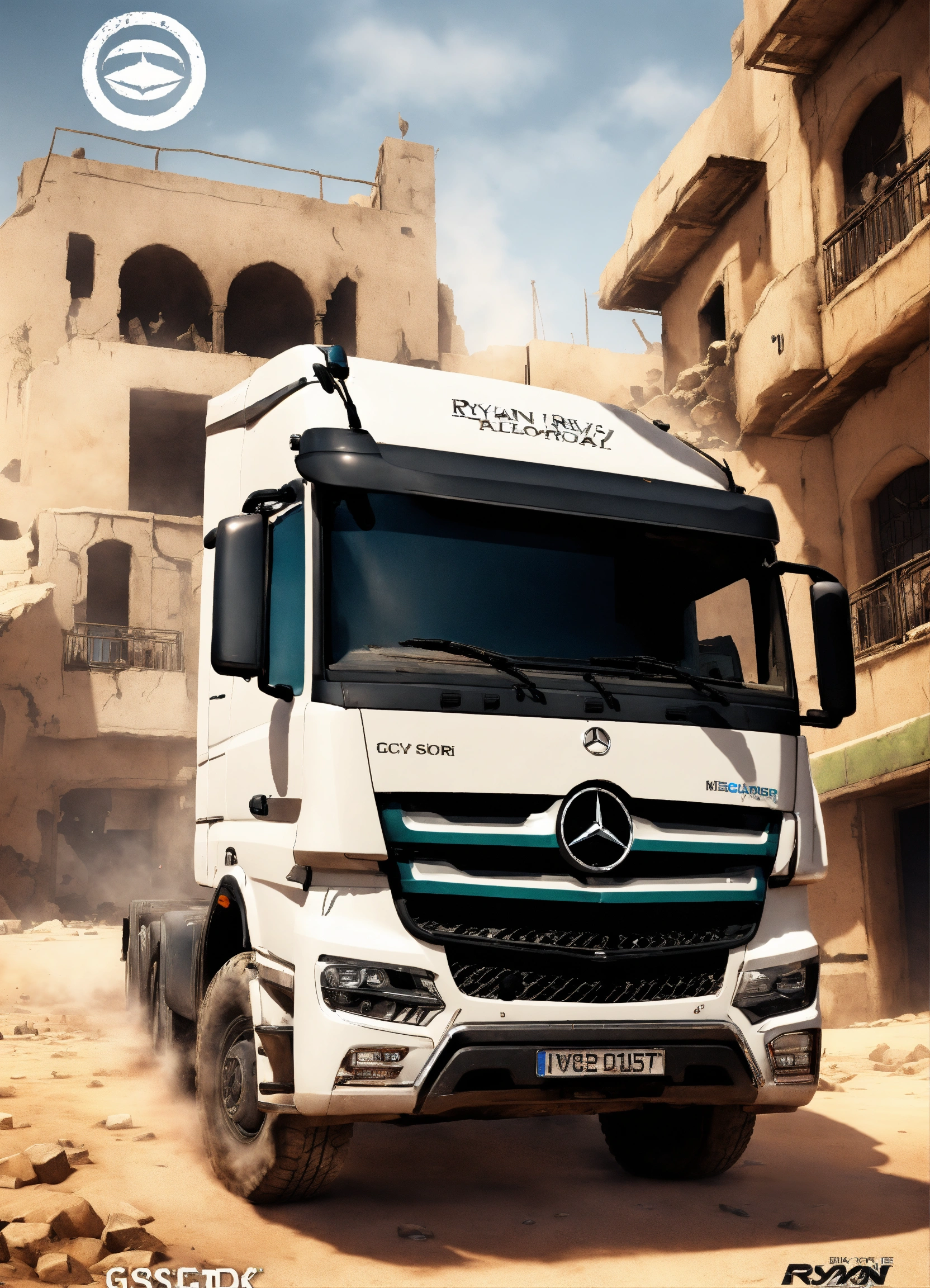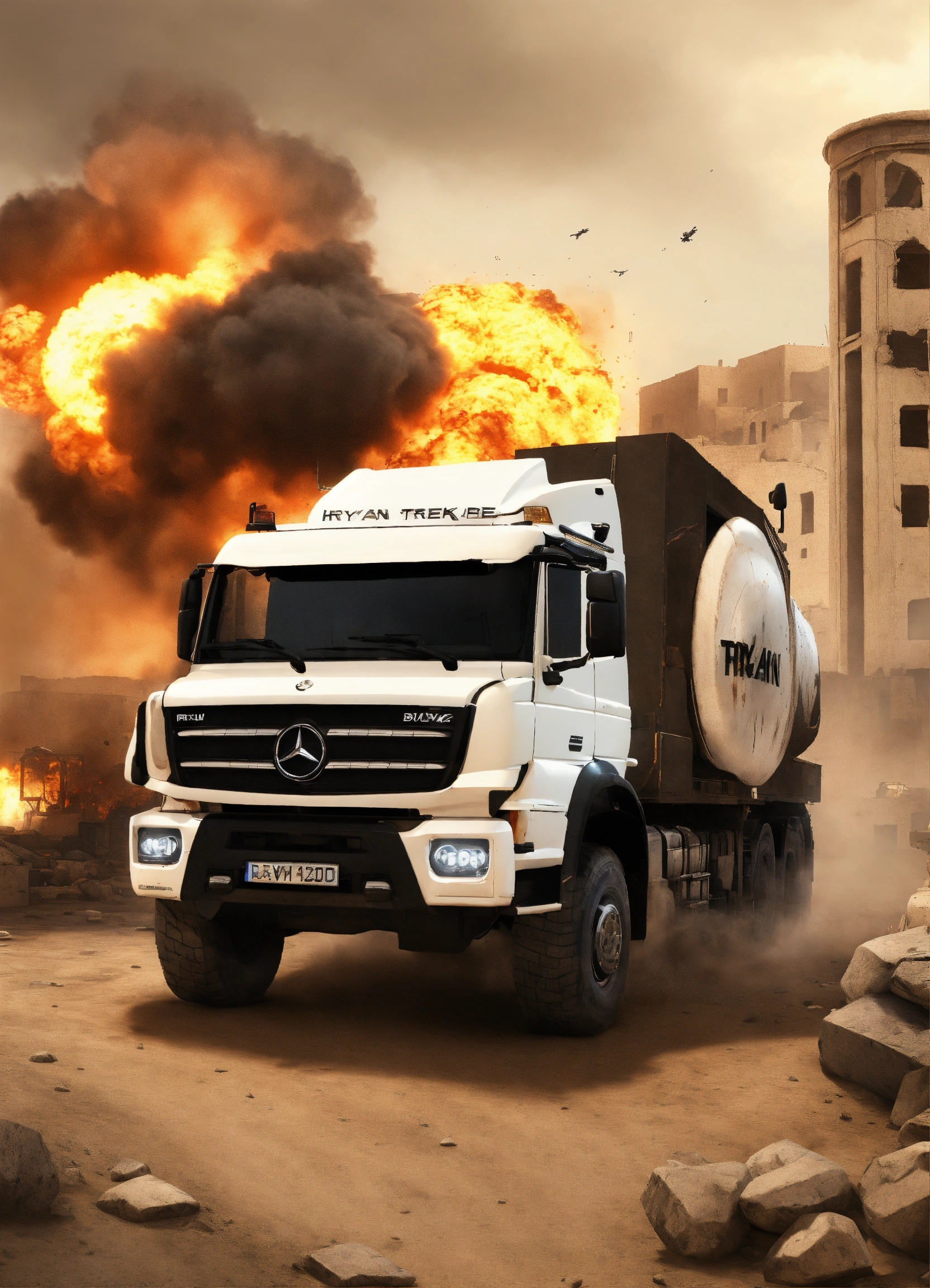 A large wheel white mercedes hgv truck with the word ryan on the truck in the counter strike csgo map de_dust 2 with a bomb site explosion in the background, no other vehicles