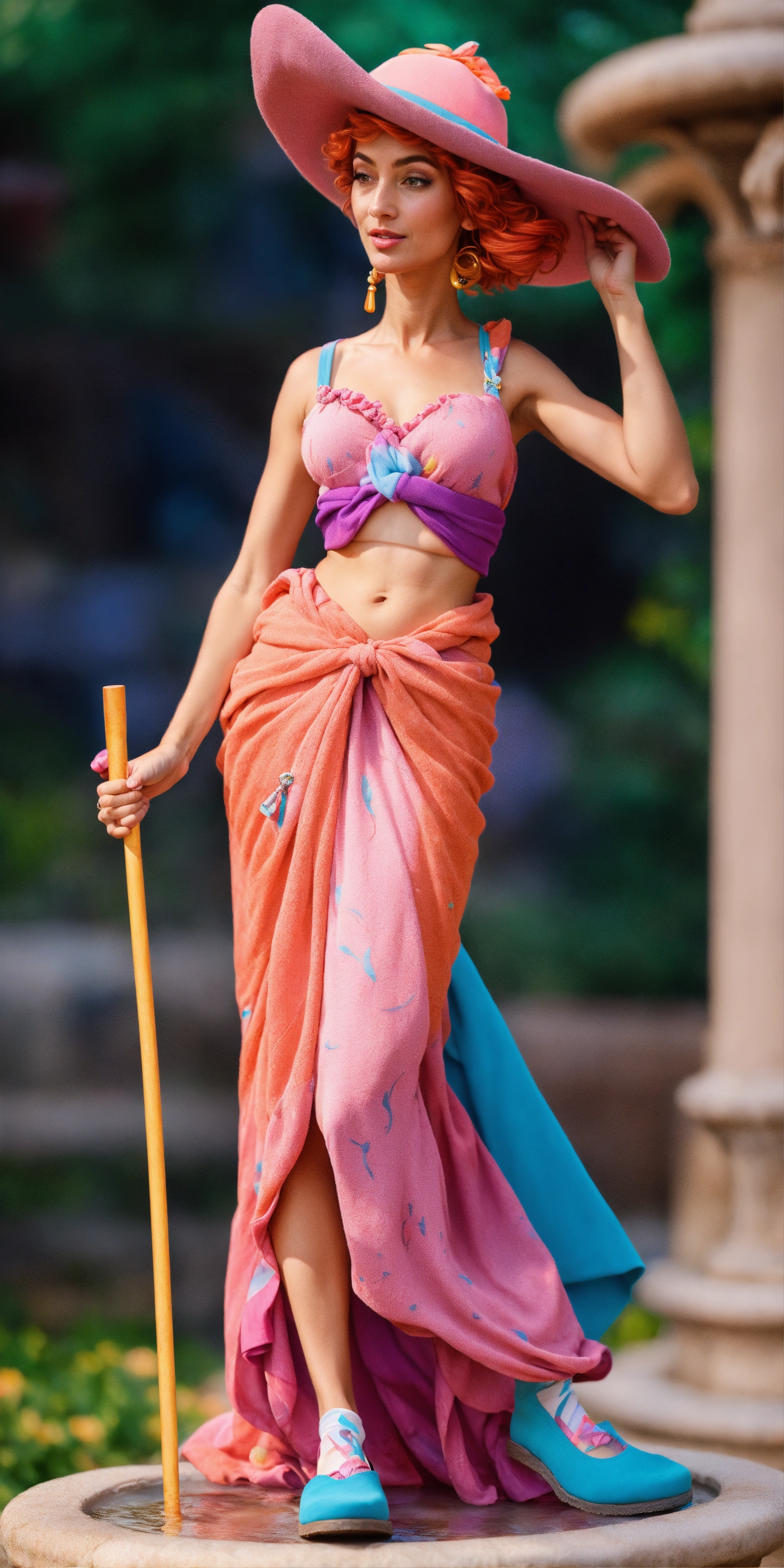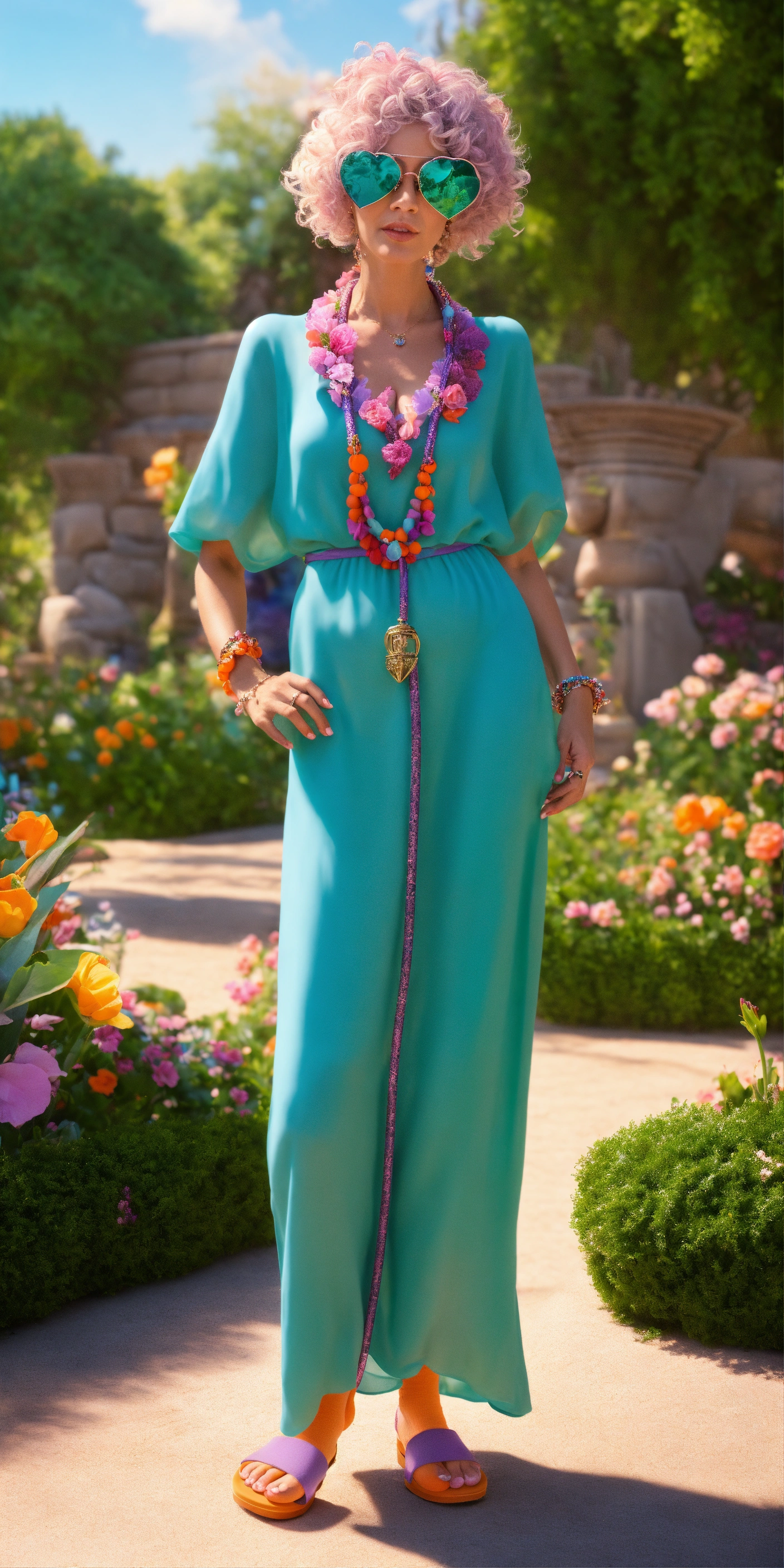 Gégé, a lively 60-year-old, has sun-kissed, freckled skin and playful turquoise eyes. his white and blue-streaked curly hair is pulled back into a ponytail. wearing a purple hat, pink shirt, orange bell-bottoms, and platform sandals with quirky duck socks, he carries a flamboyant flamingo-headed cane and dons heart-shaped sunglasses.the stone statue of aphrodite, sculpted from radiant marble, stands at 1.70 meters. her elegant face features half-closed eyes, a delicate nose, and poised lips. waves of stone hair flow down, and her body is gracefully adorned in a draped greco-roman gown, hinting at sculpted sandals below. in a vibrant garden, gégé, dressed eccentrically, flirts with the stone aphrodite by a fountain, holding her hand and leaning in. unreal engine, ultrarealistic, 8k