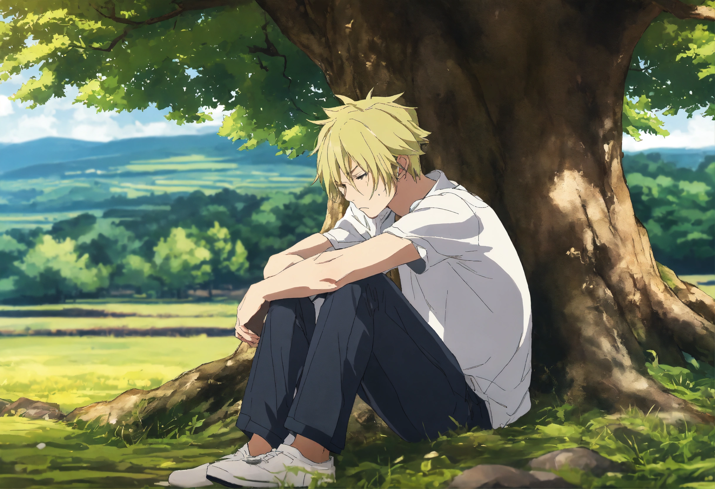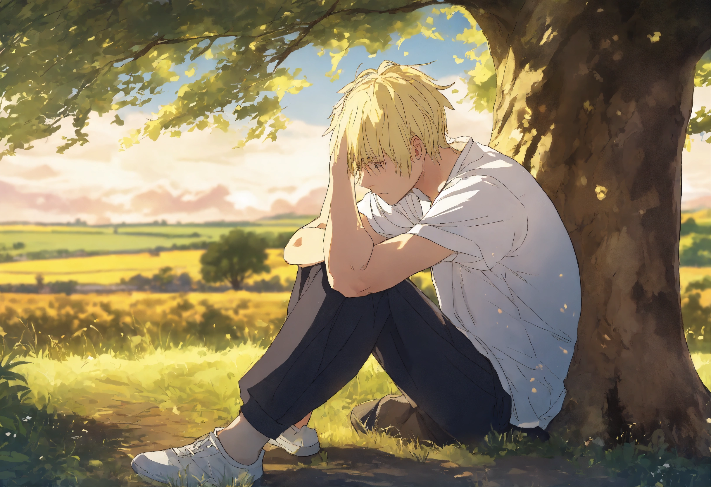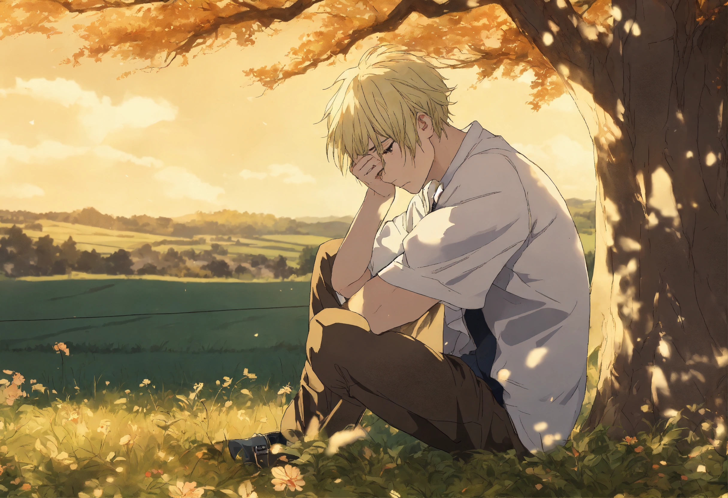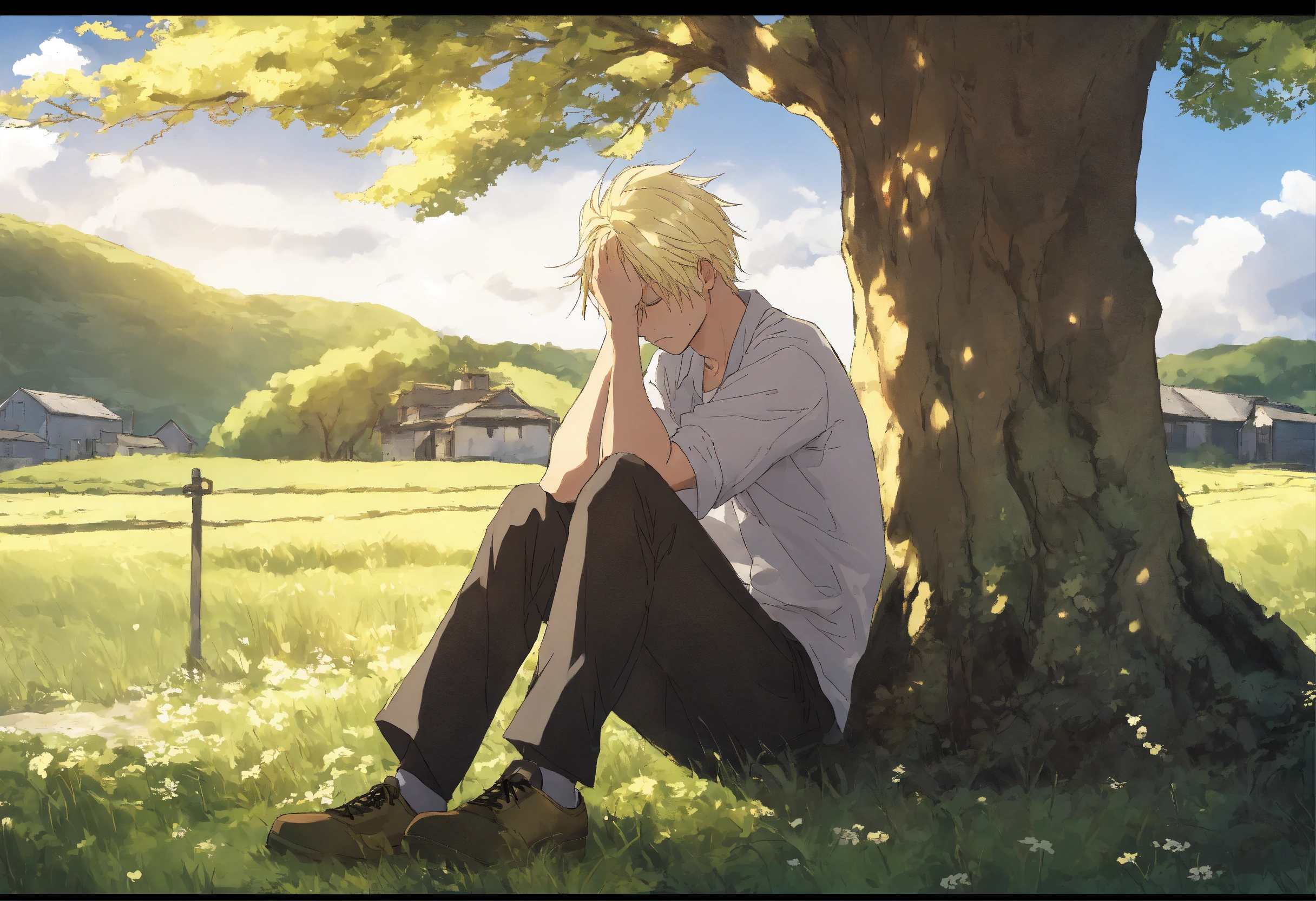 Sad and depressed man with face hidden in his hands, silver and blonde hair, under a tree in the countryside, seinen anime cartoon