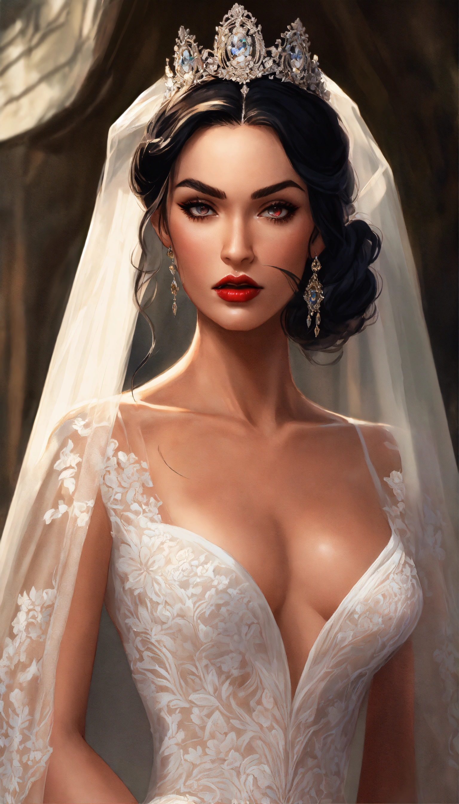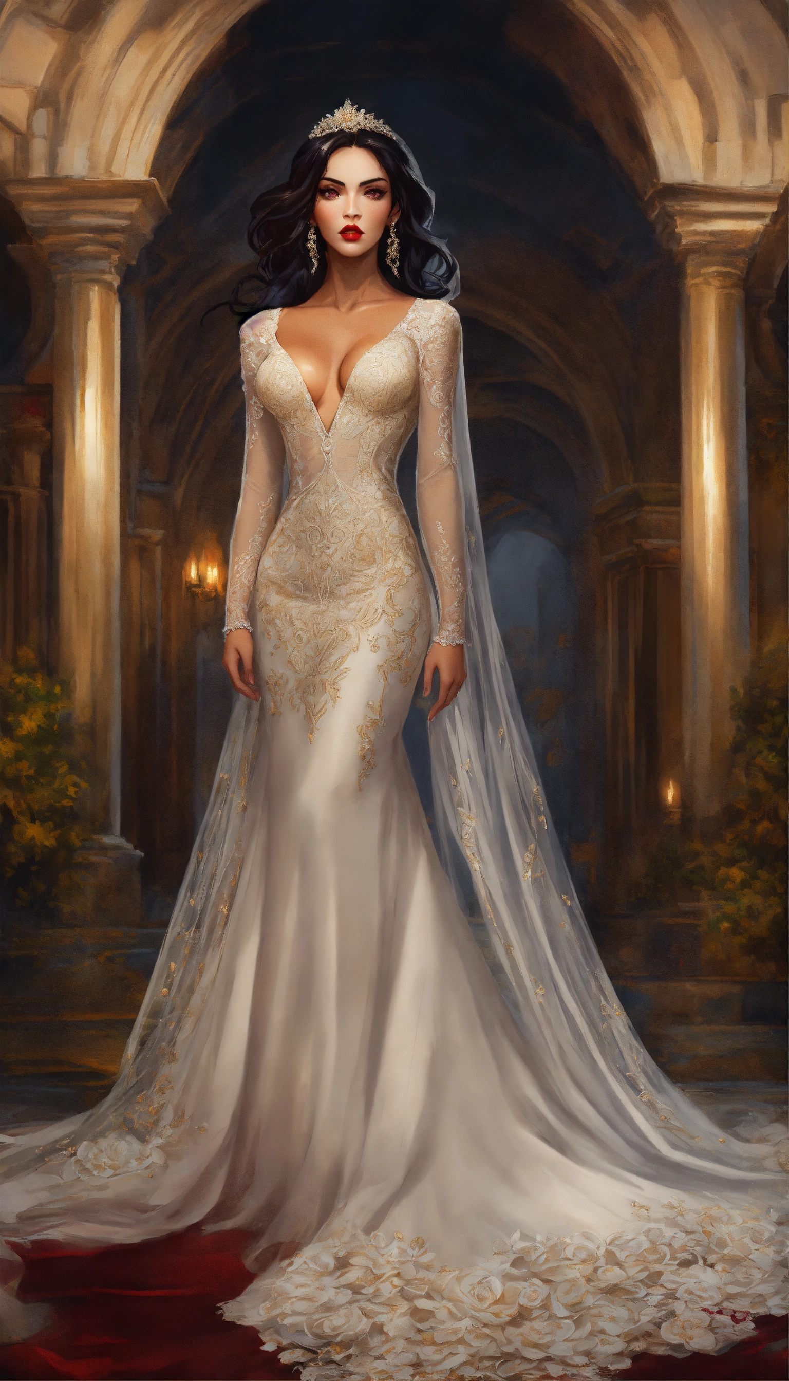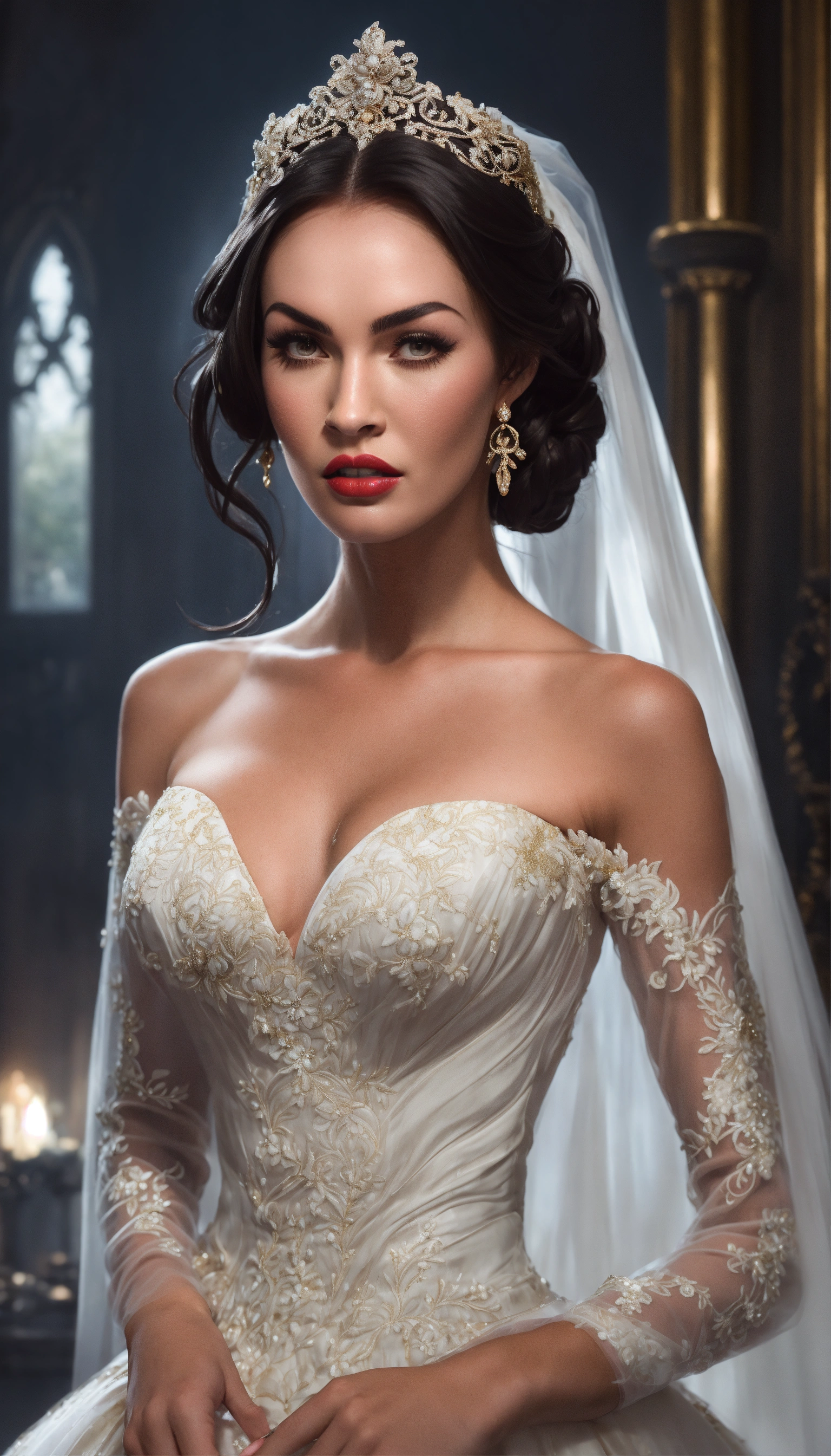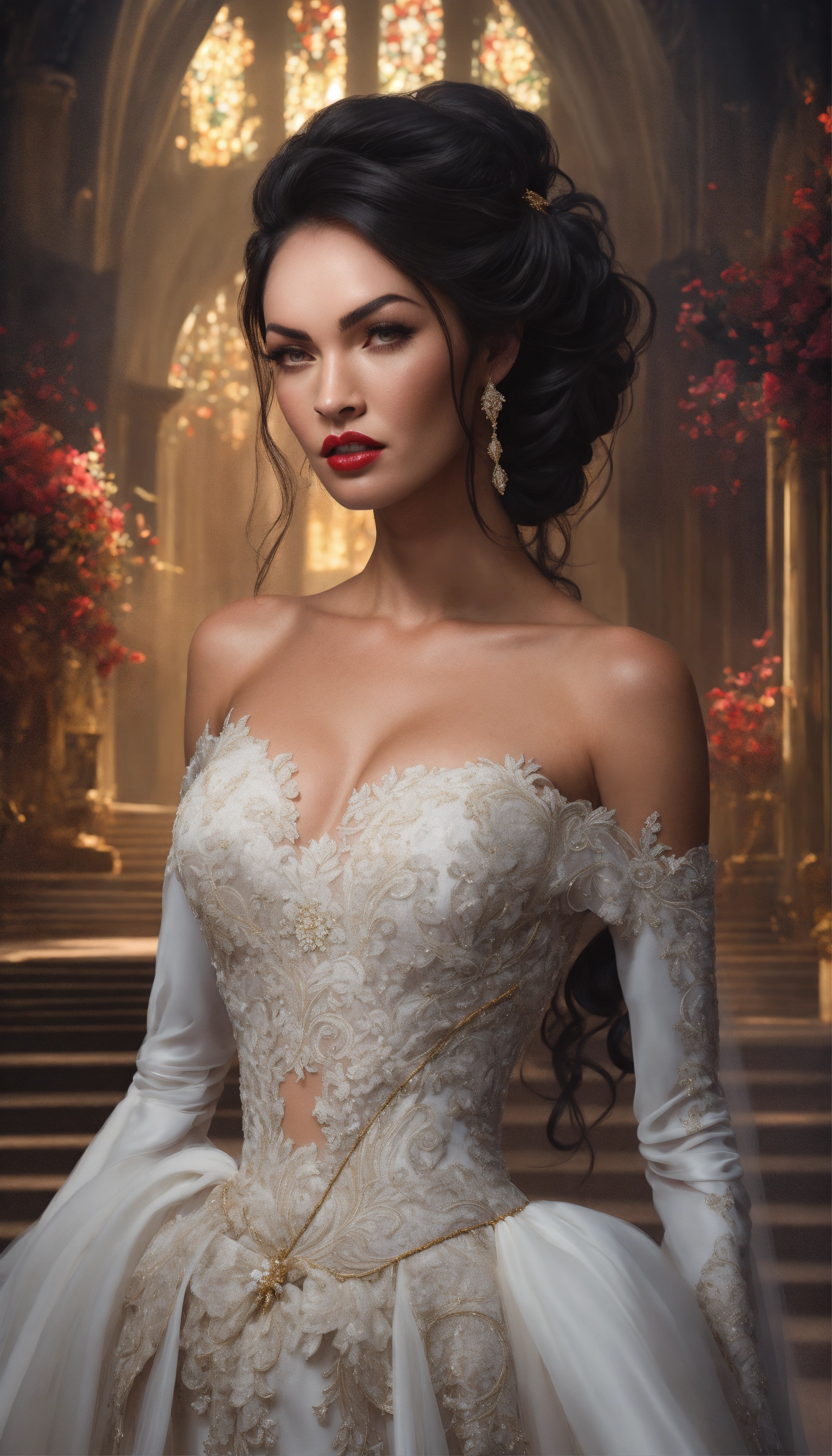 Concept art of ravenna, megan fox, glowing red eyes, curled voluminous flowing black hair in a formal wedding updo, hair in a bun, updo, bun, curled black hair tied up in a wedding bun, beautiful, tan skin, realistic, sabine rich, artgerm, j scott campbell, artgerm, perfect body, detailed, intricate, round face, slim nose, long black eyelashes, red lips, sharp jawline, perfect detailed face, realistic, floor length white veil, full body view, evil dark sorceress, gloomy grey castle background, gloomy dark flowers forest castle, white floor length fitted full skirts a-line bridal gown, low cut neckline, gold high heels, voluminous curled long hair, white train veil, white a-line bridal gown, very long ivory long veil and hair tied up, ivory fitted bridal gown, big voluminous long train full skirt gown, forest, yennefer, zuhair murad bridal, zuhair murad bridal a-line gown, ivory patterned textured silk shimmer fabric embroidered dress, train wedding dress, full body view, long sleeves