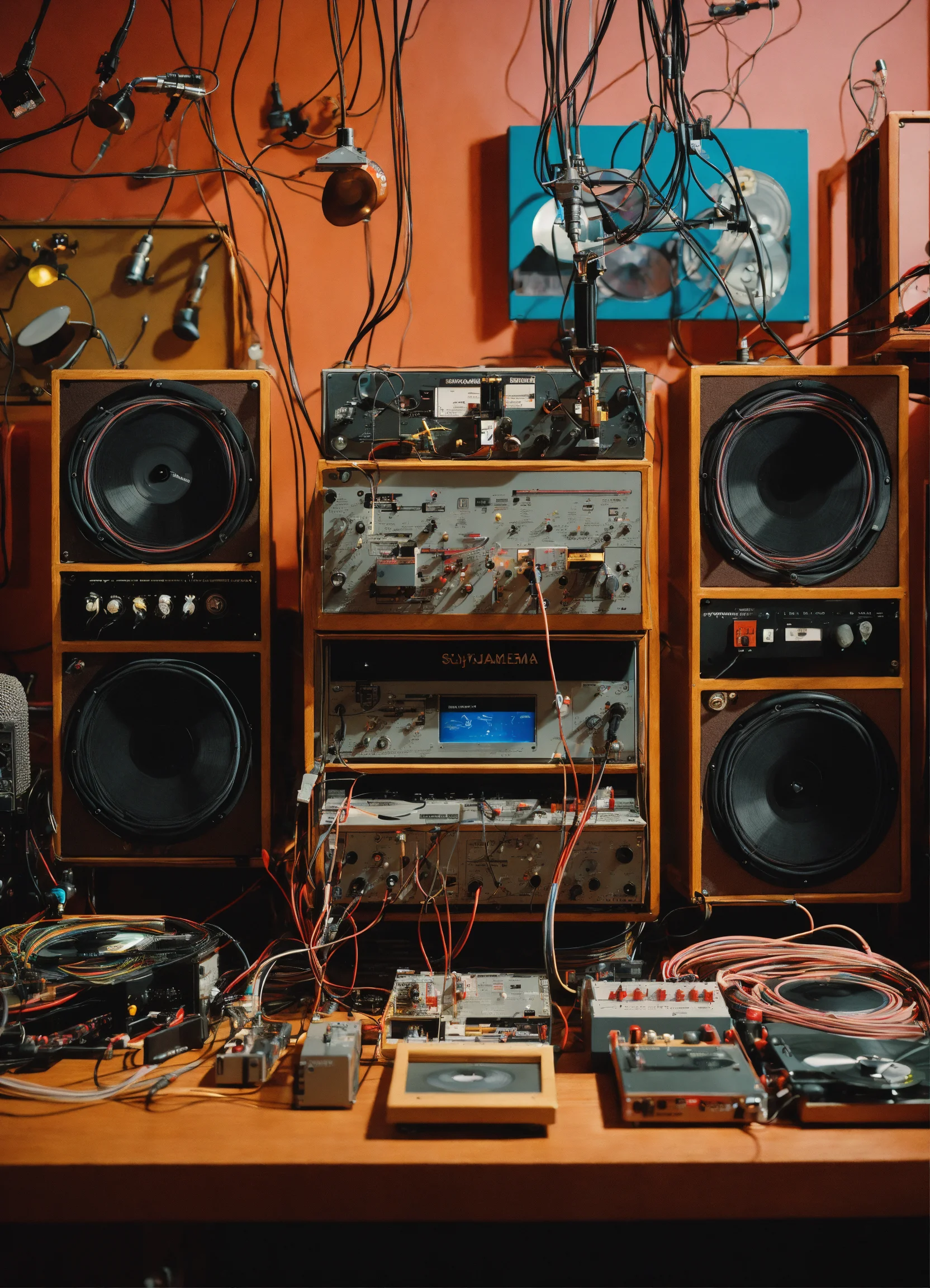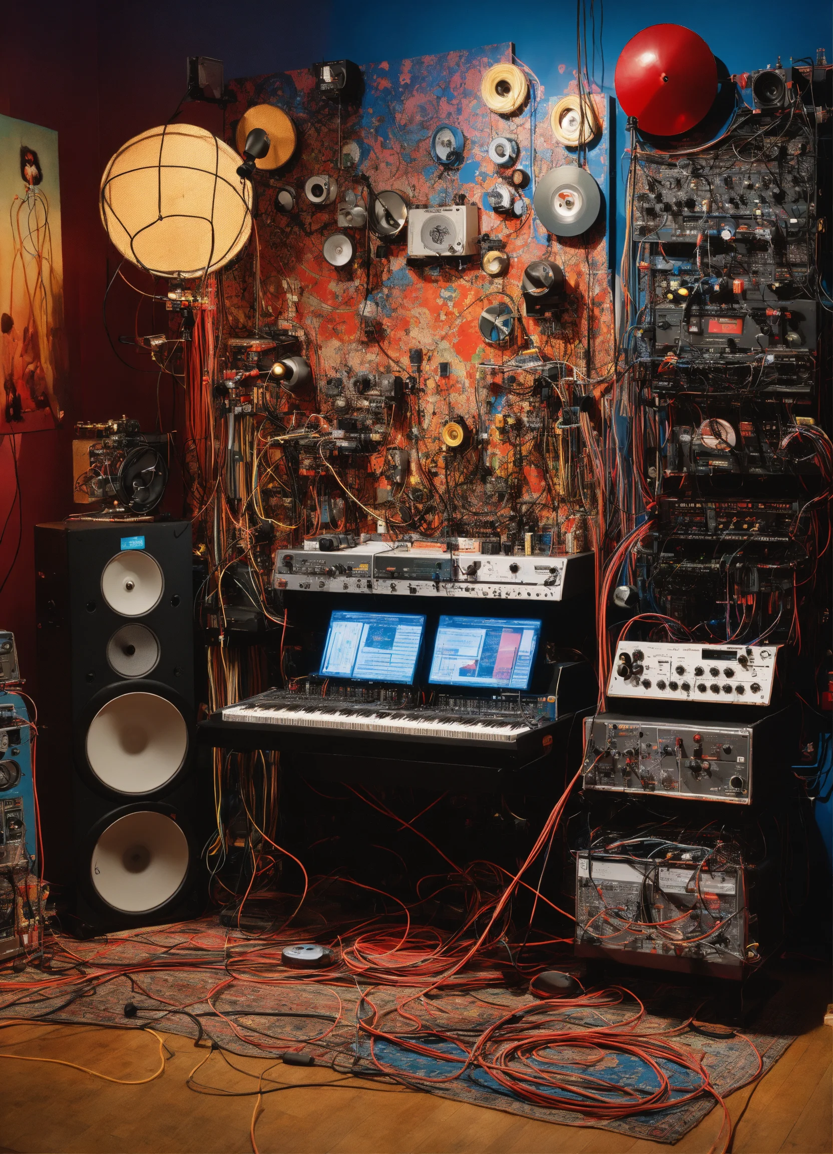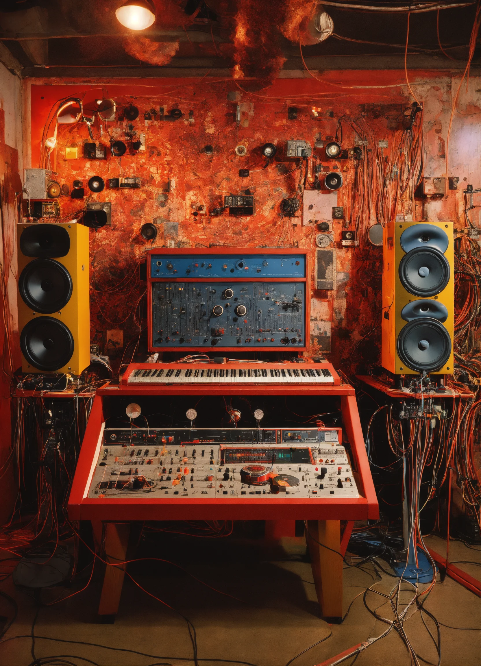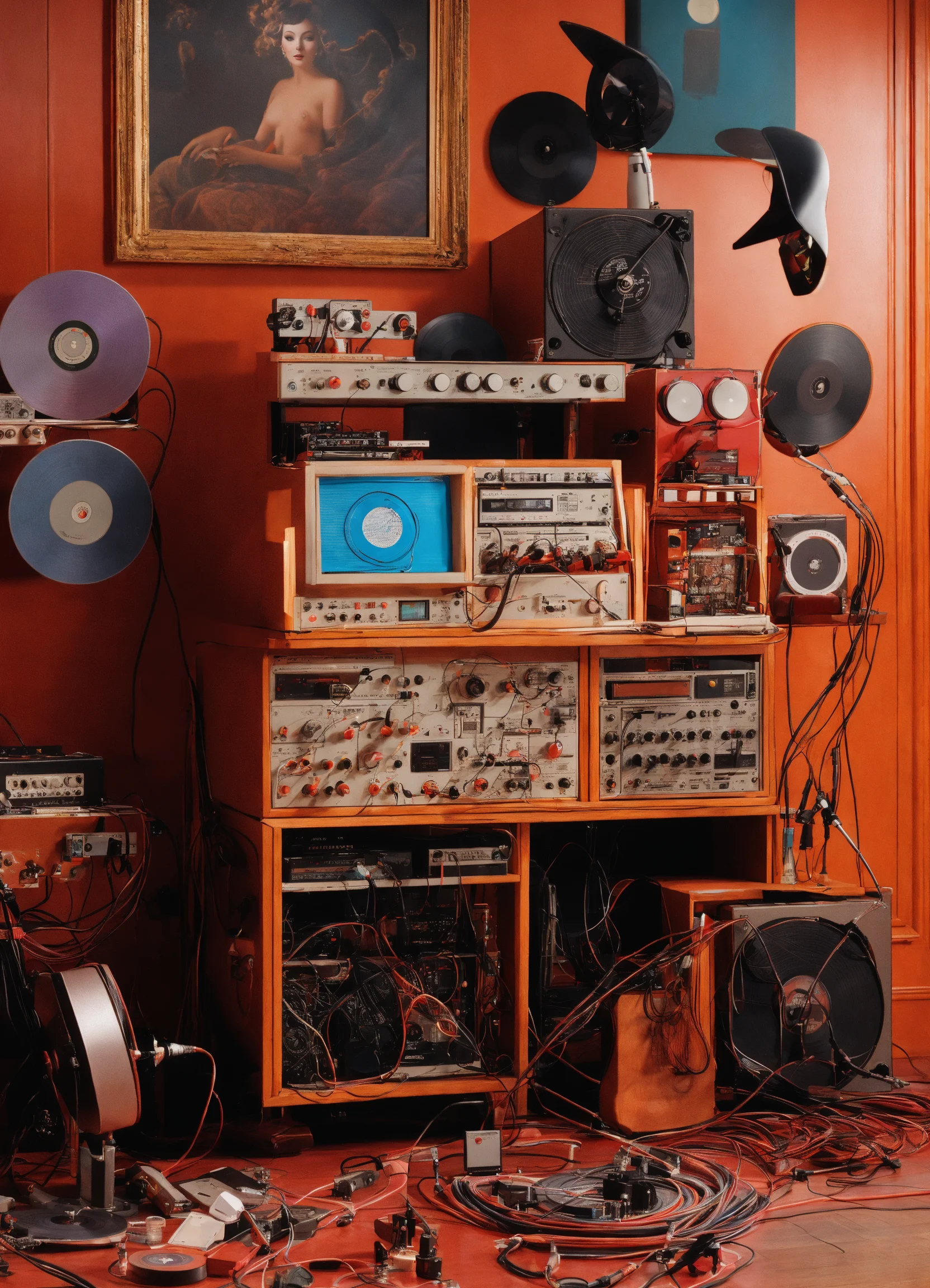 Close up photography, of machines, synthetizer, cables, wires, records, cd, microphones, tape recorder, and musical instruments magma, art by sergio lopez, natalie shau, james jean, and salvador dali. designed by teenage engineering