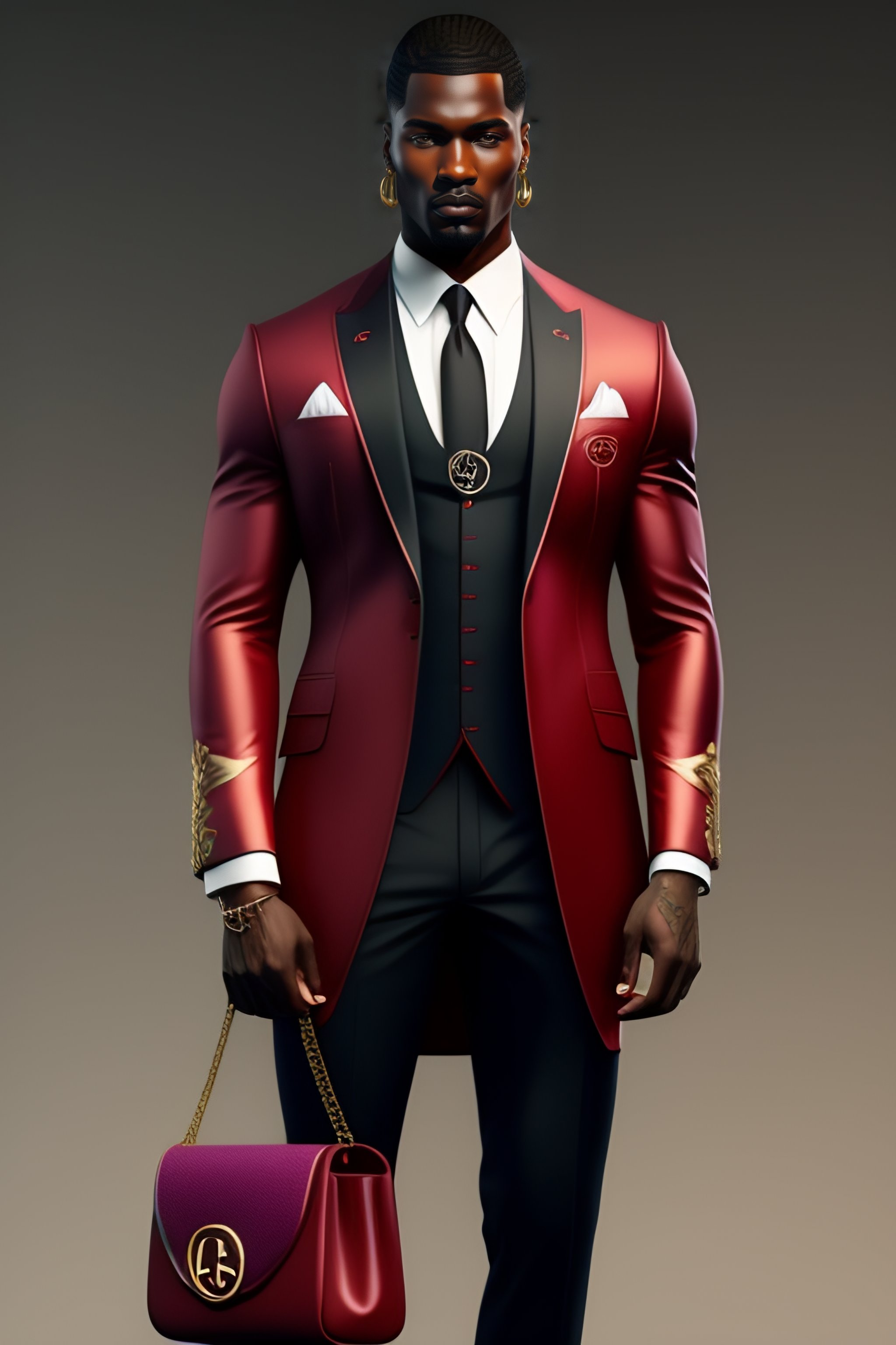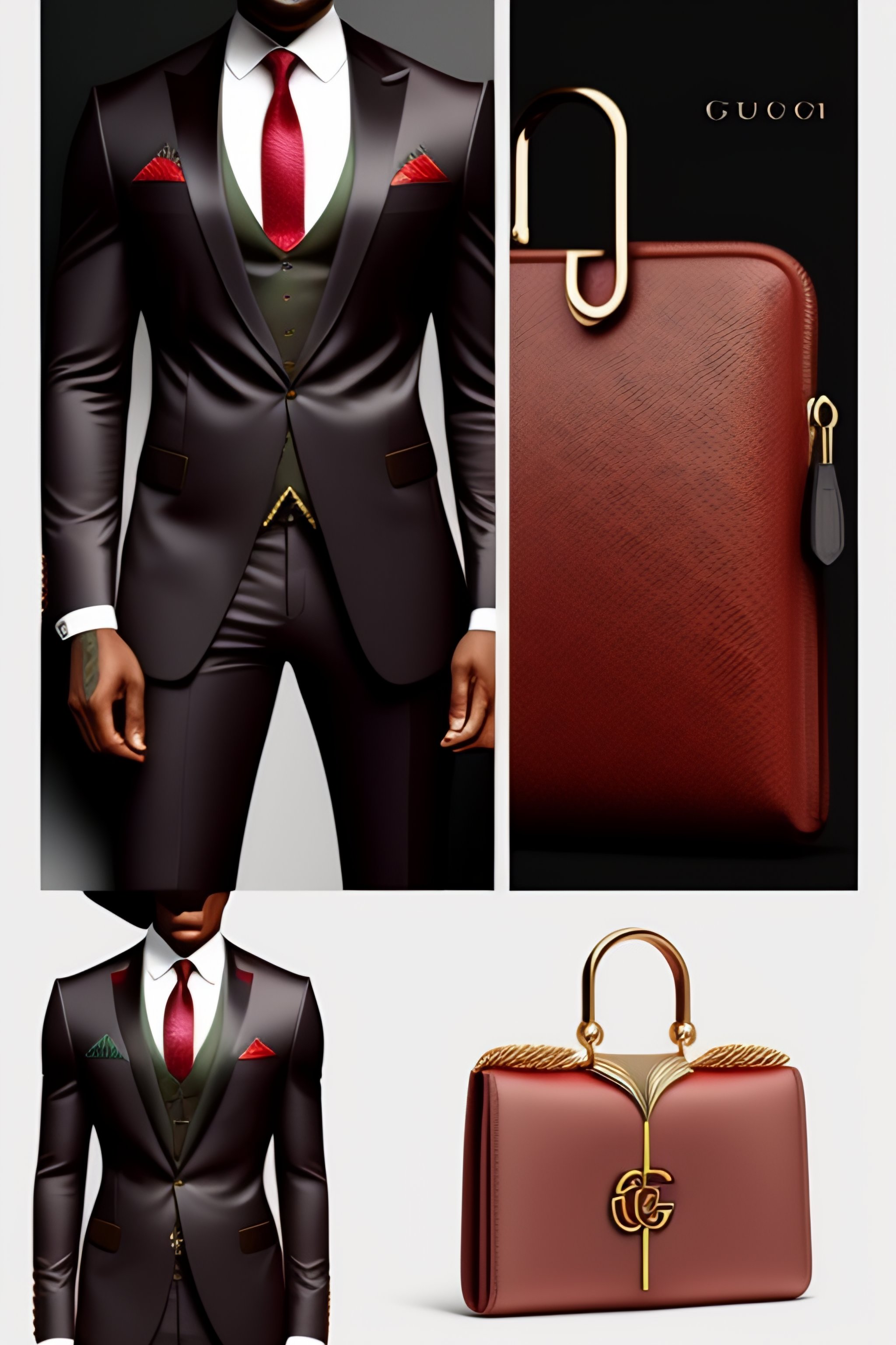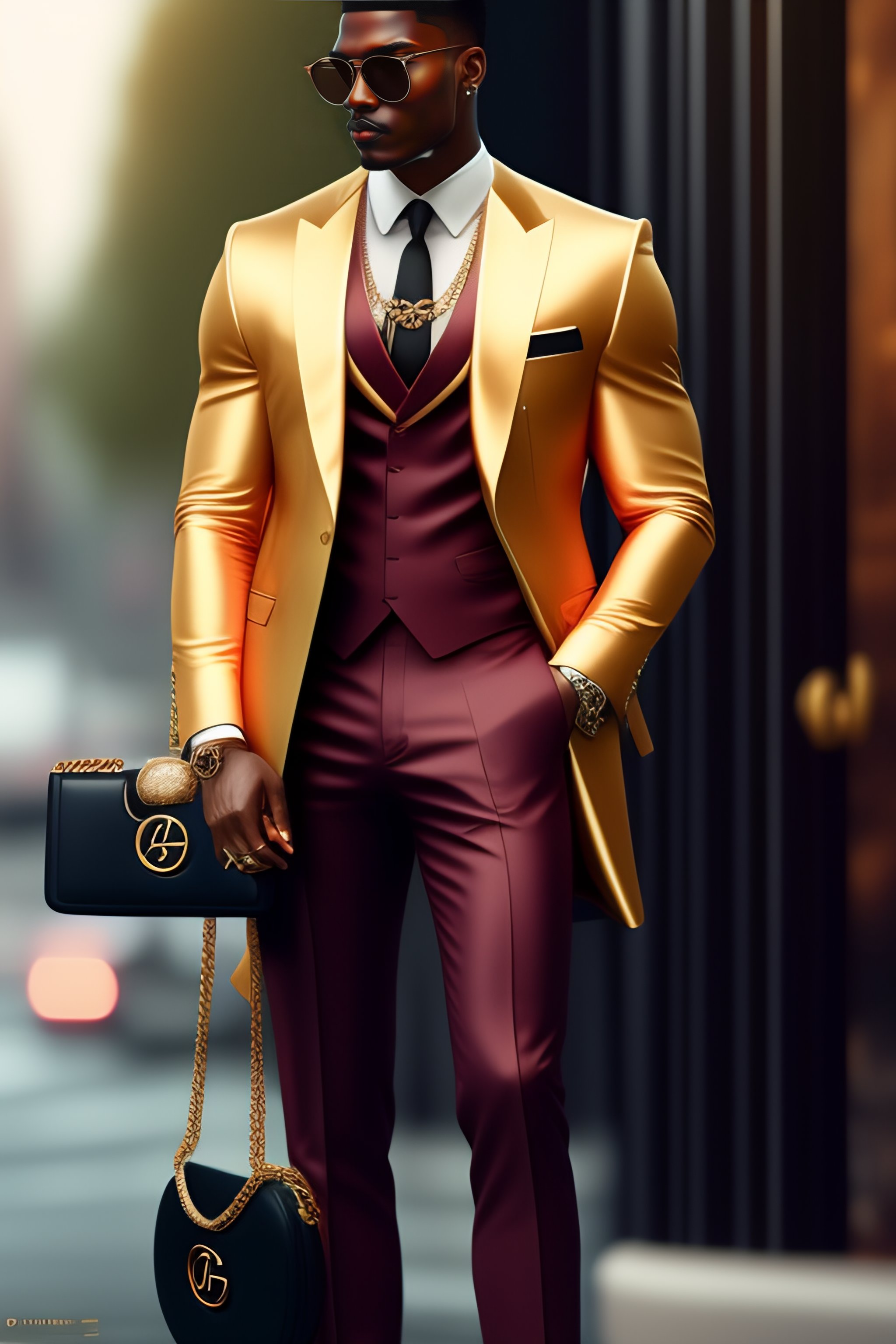 Gucci three piece suit, channel handbag, mercedes key chain laying on a bed character concept design, painting, detailed, vivid, trending on artstation