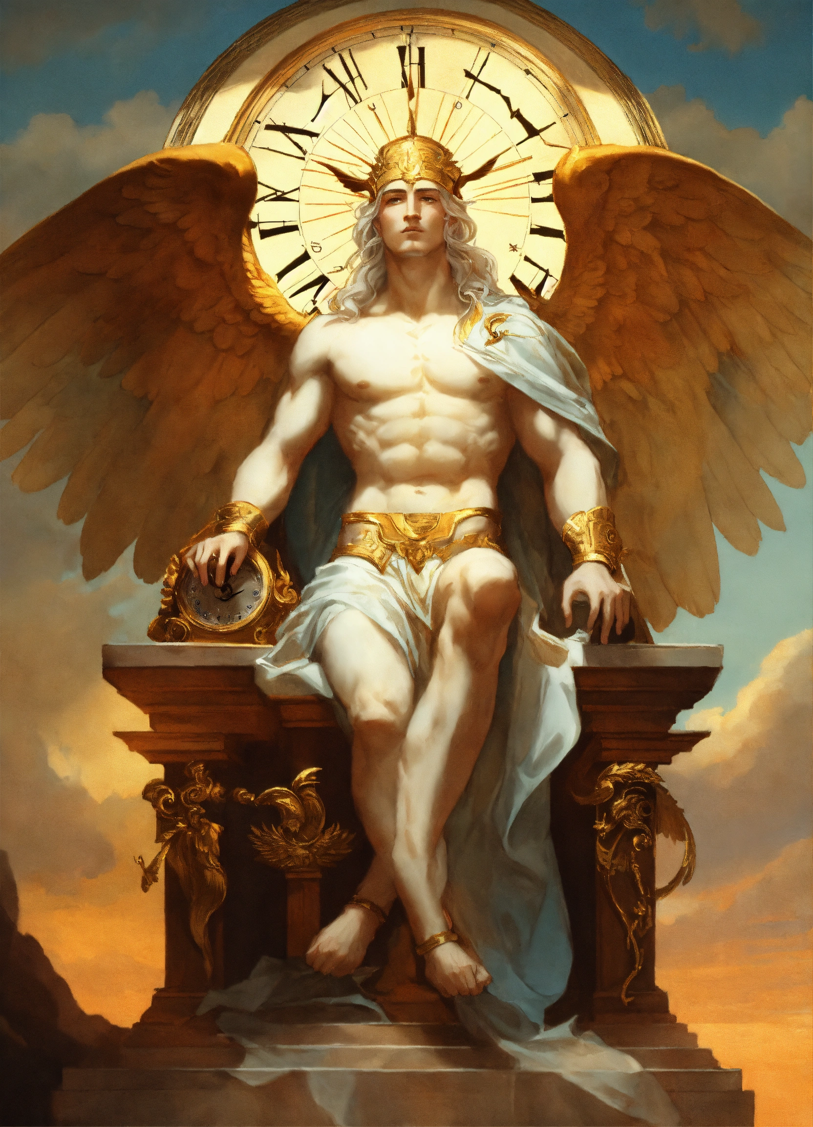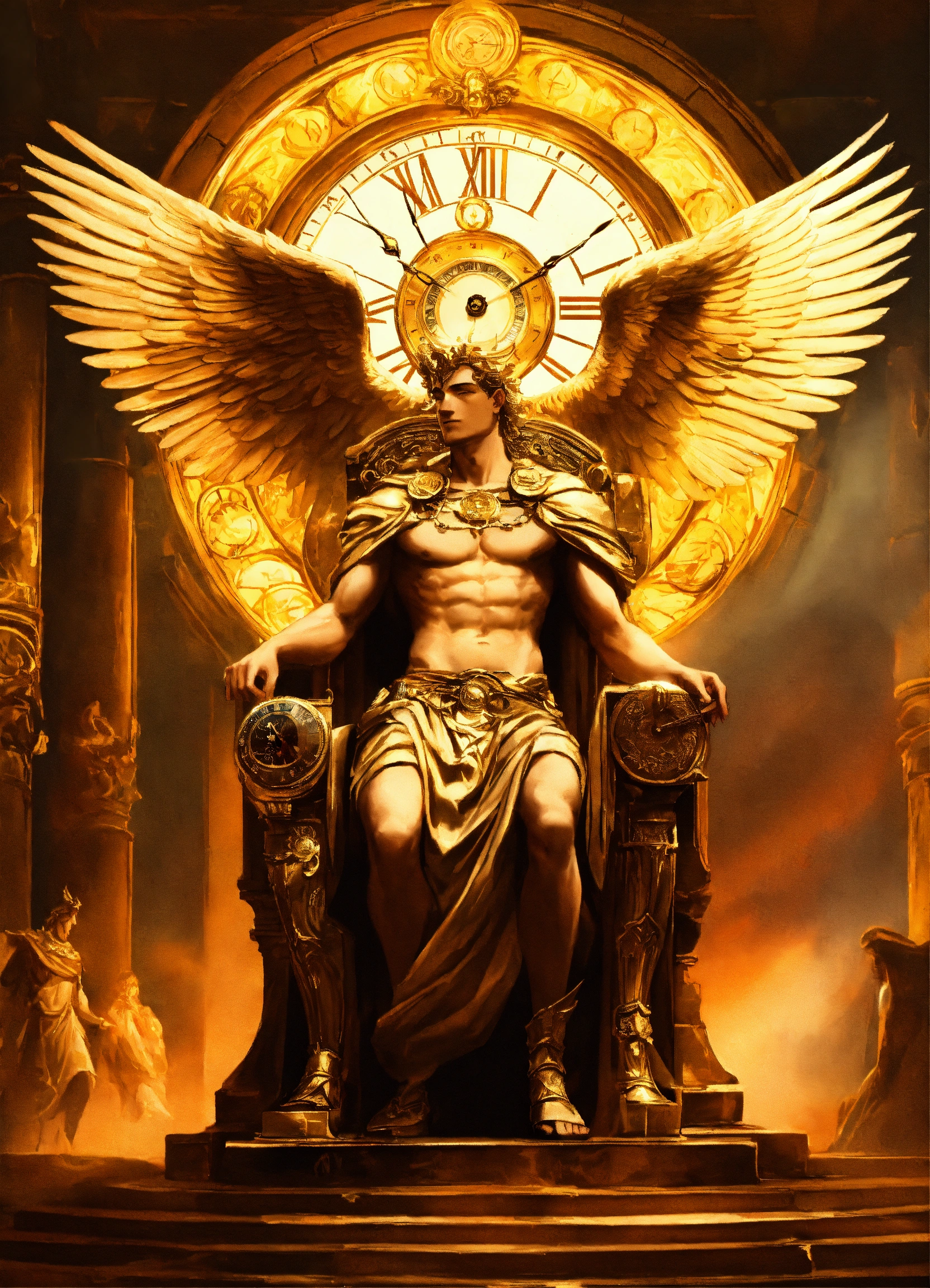 Hermes the winged god bows and honors in front cronos the very old, white hair, god of time, who sits in his clock-like throne