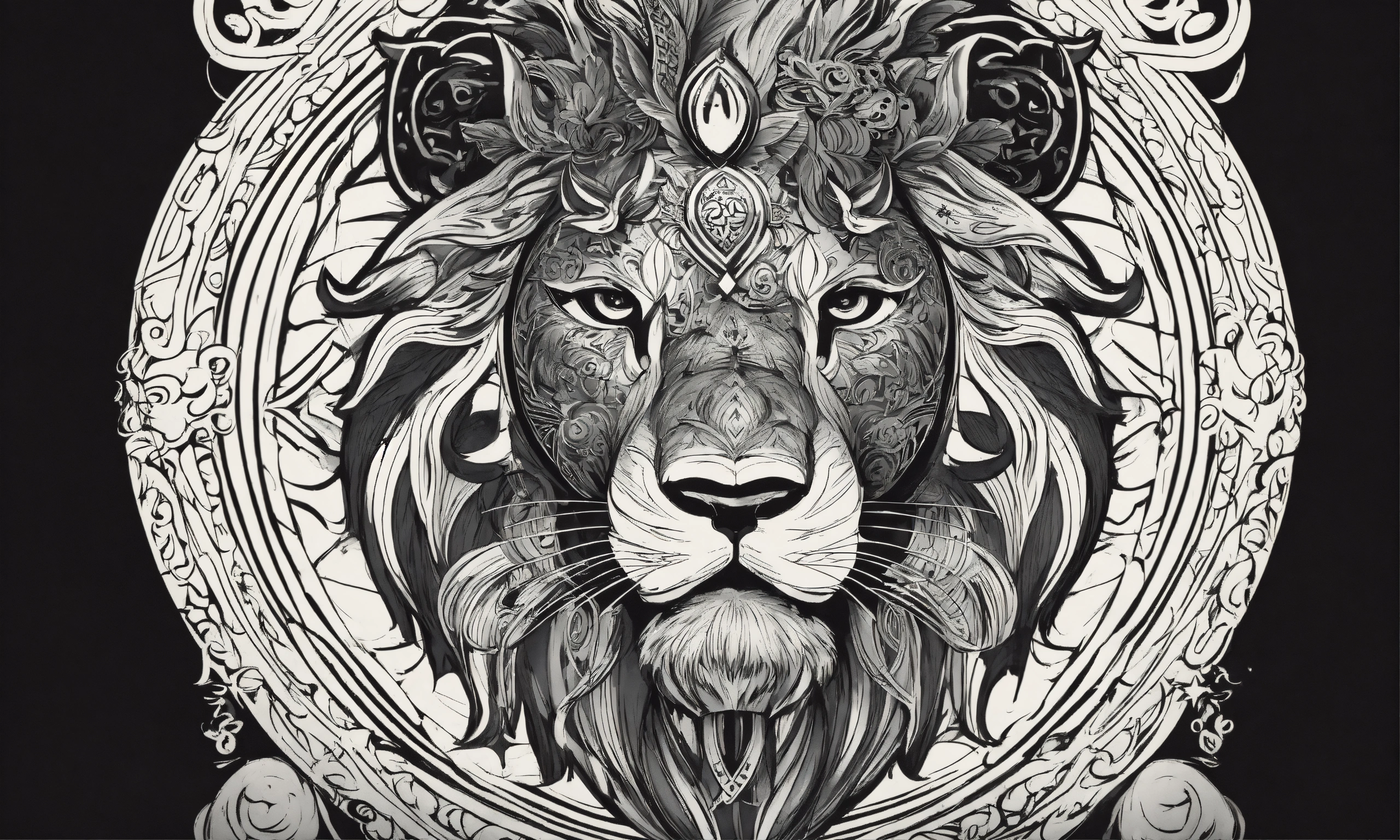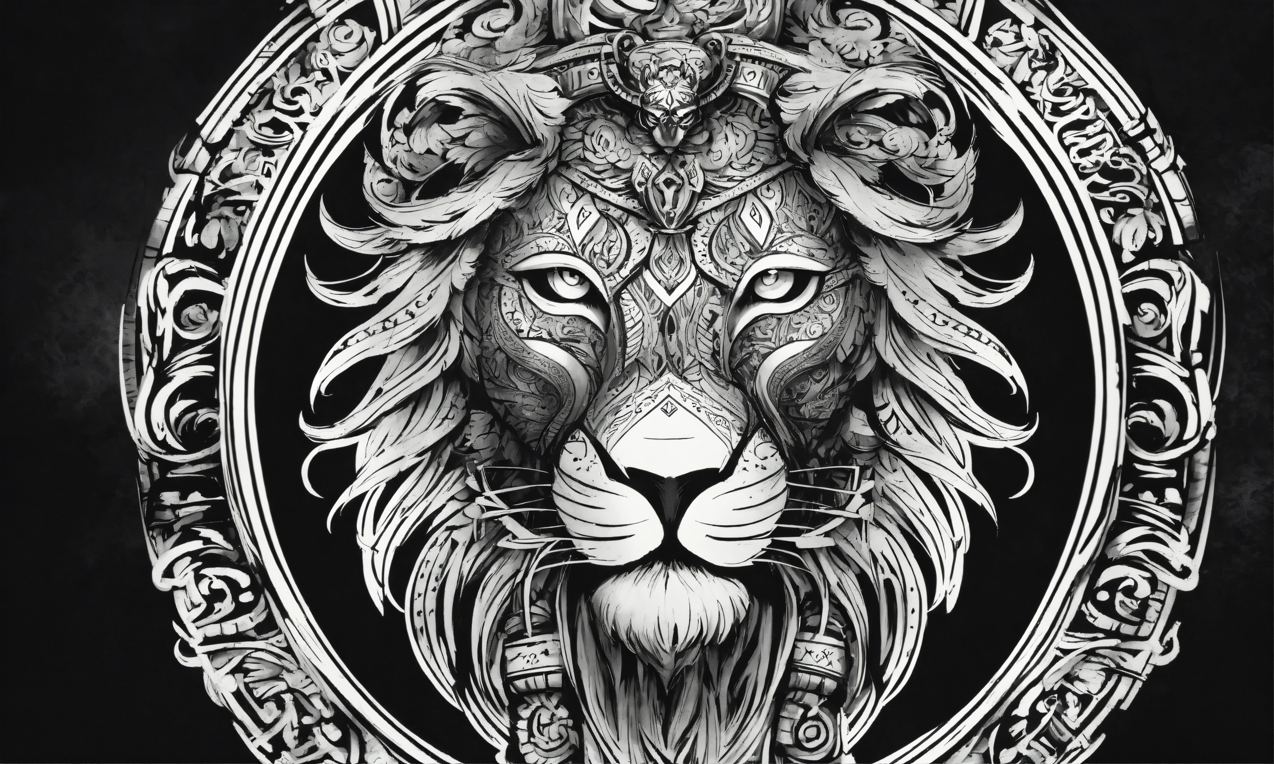 Tribal head lion, black and white, detailed, elaborate, profile, tattoo like, face towards, compas background, vikings symbols