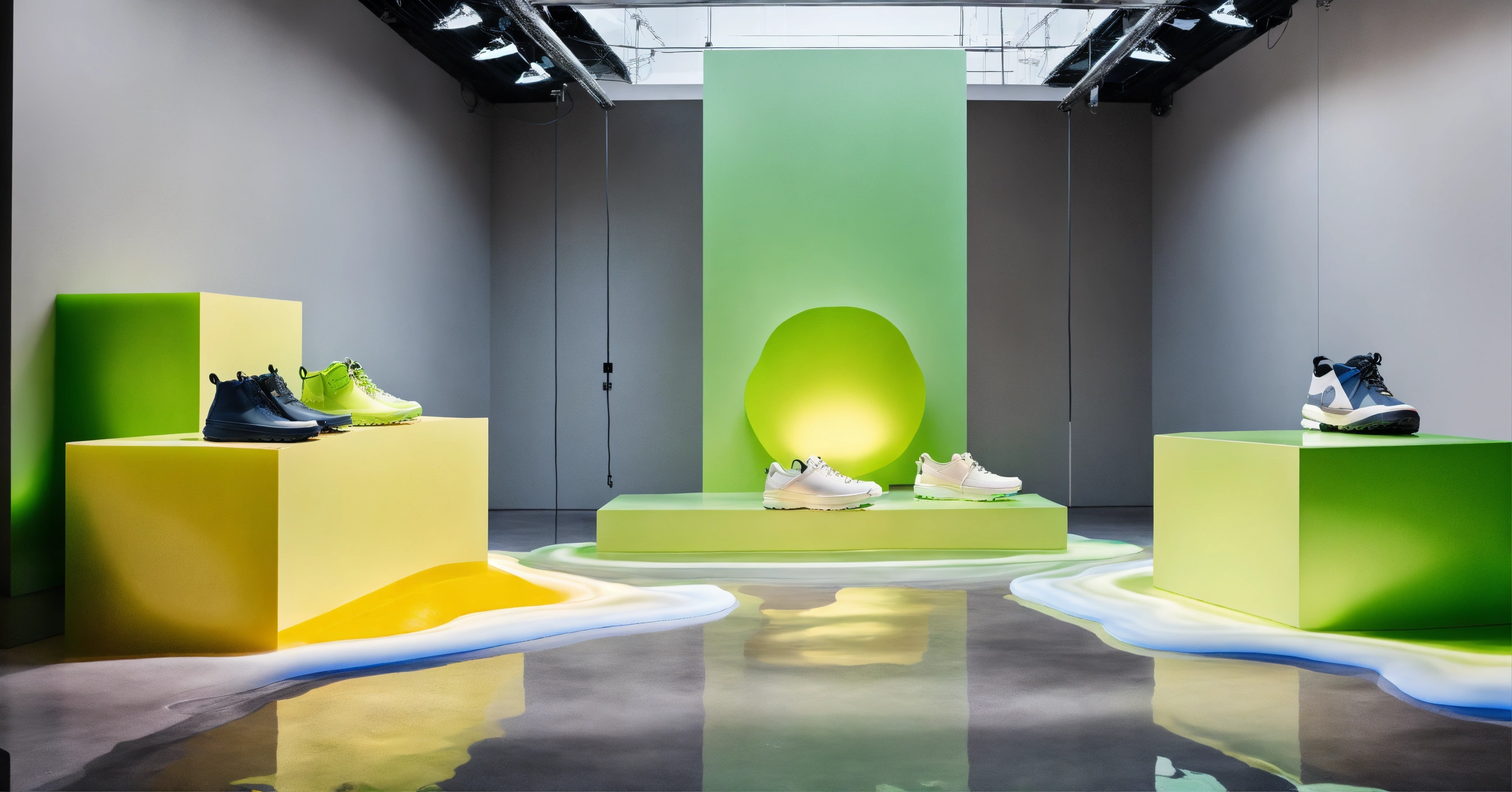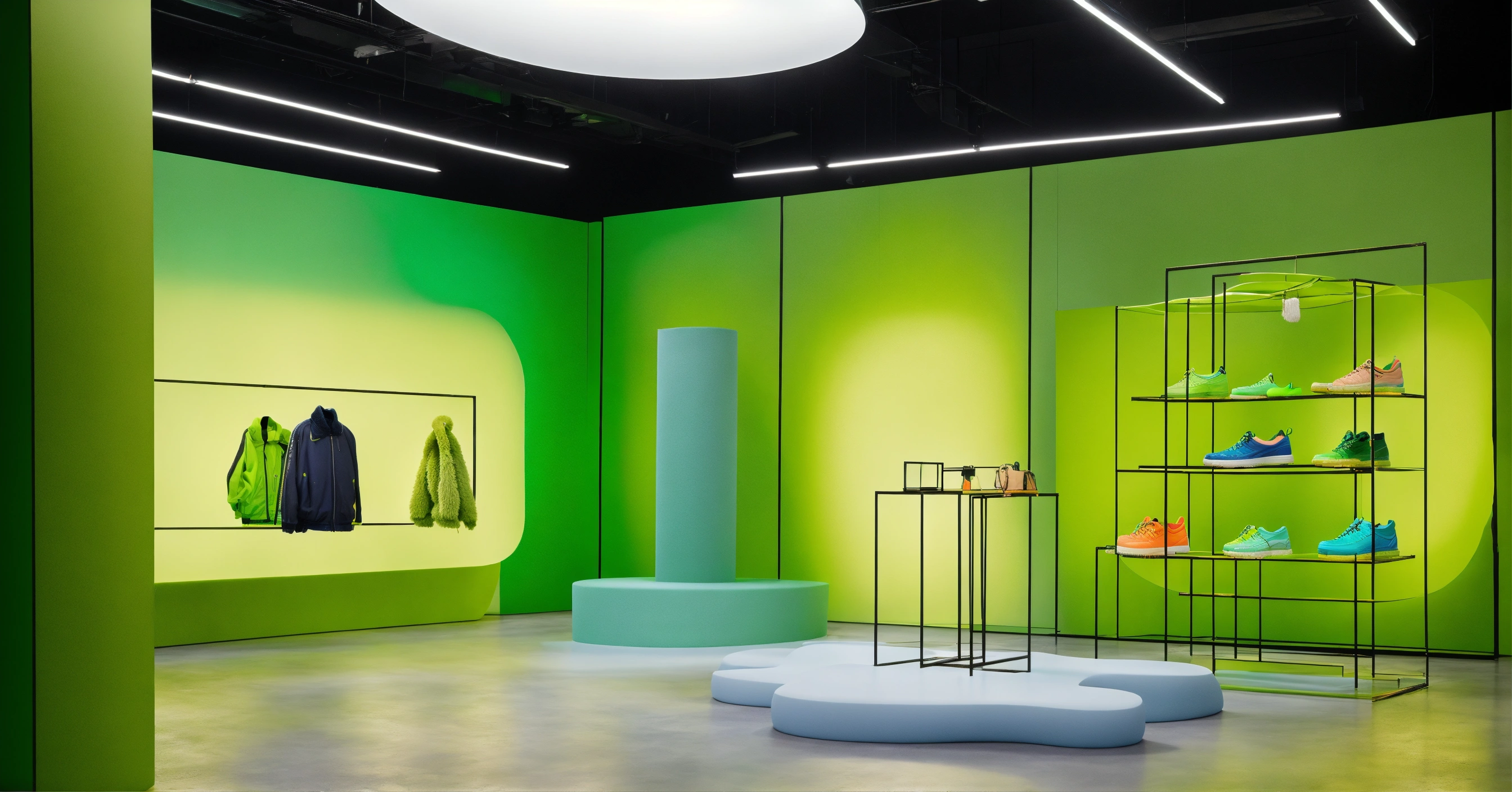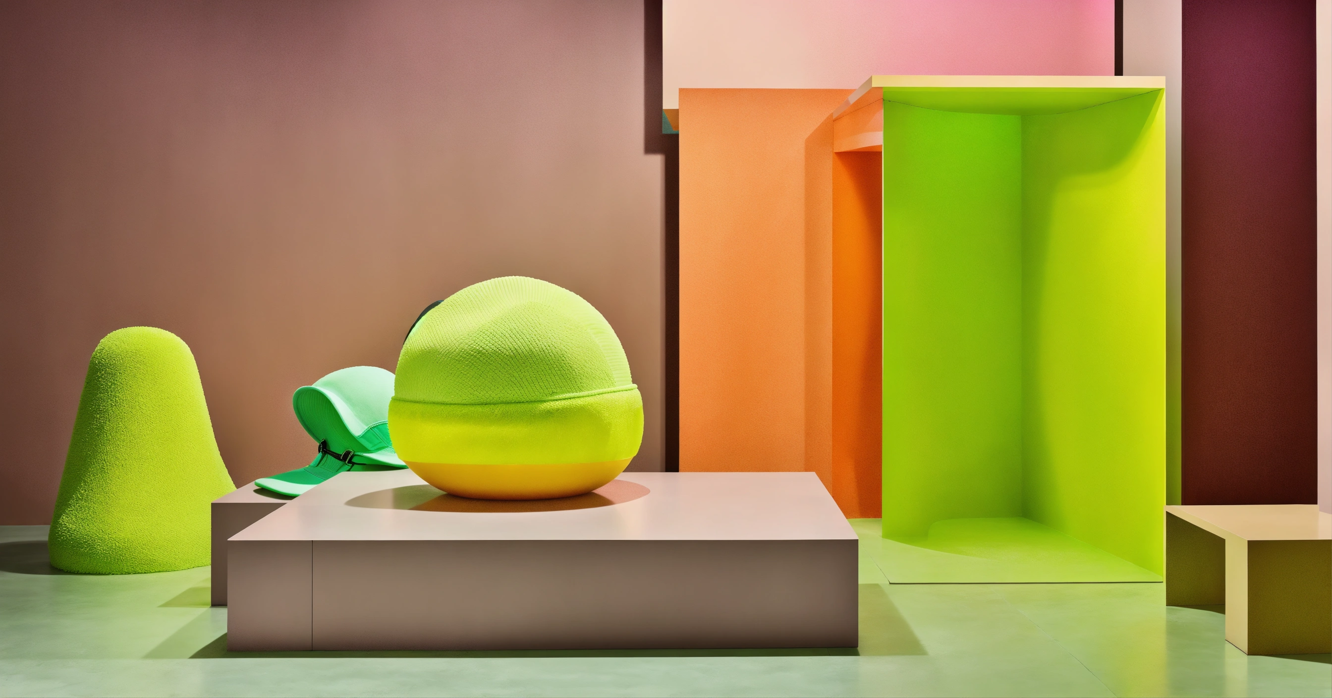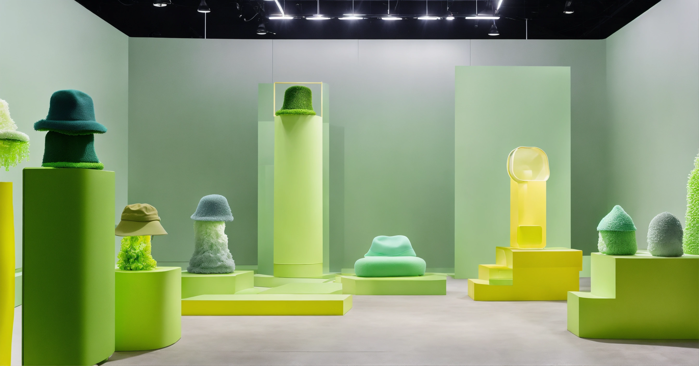 Floating in air store product display! acne studios. studio photography. crocs, bucket hat, fuzzy purse, and bomber jacket on abstract shape podiums. gradient podiums and metal shelves. resin material. neutral tones. pop of citron and neon green. roman pillars! wavy abstract sculpture! greys!