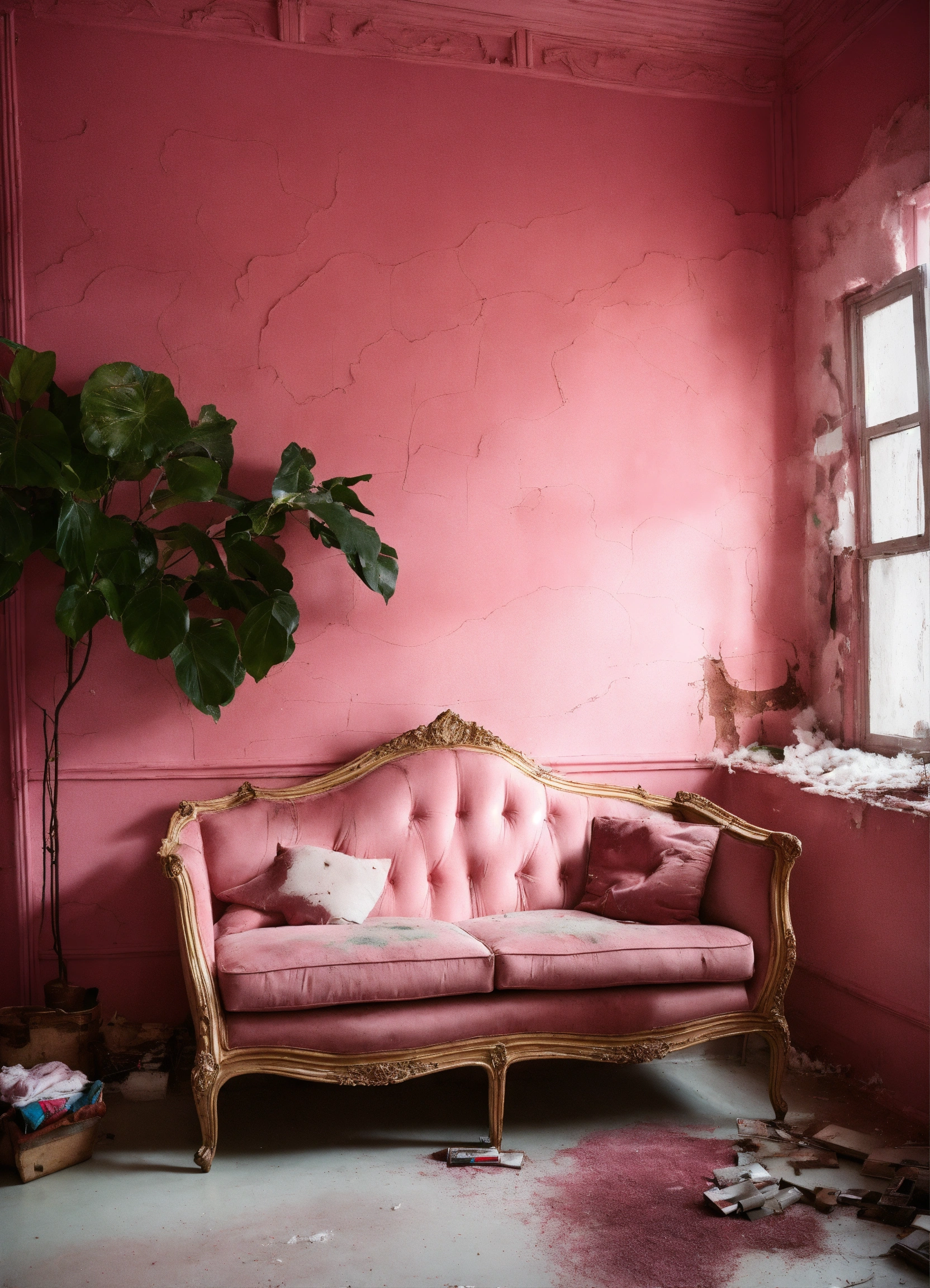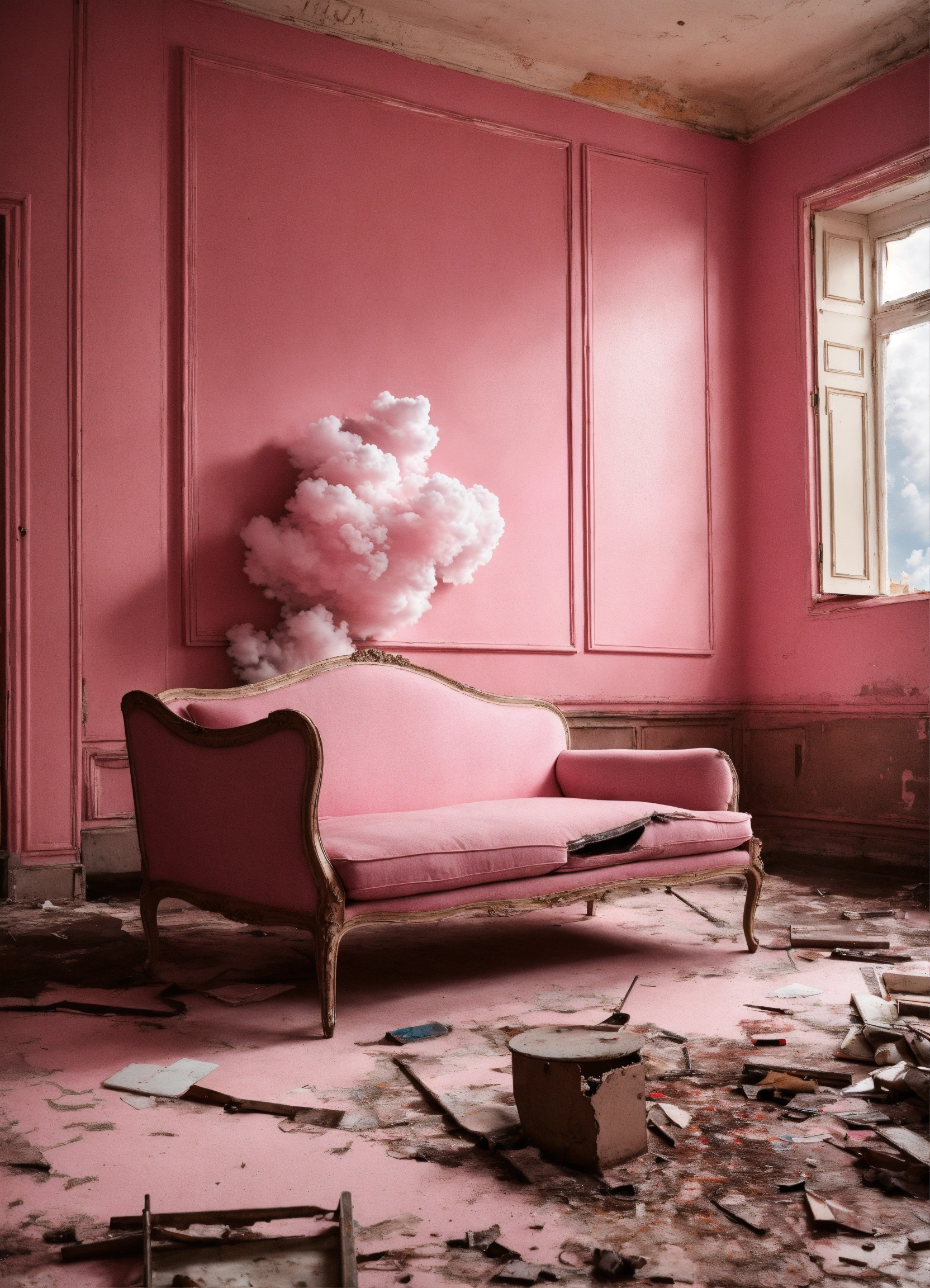 Pink dirty room with broken minimalist furniture and a cloud inside