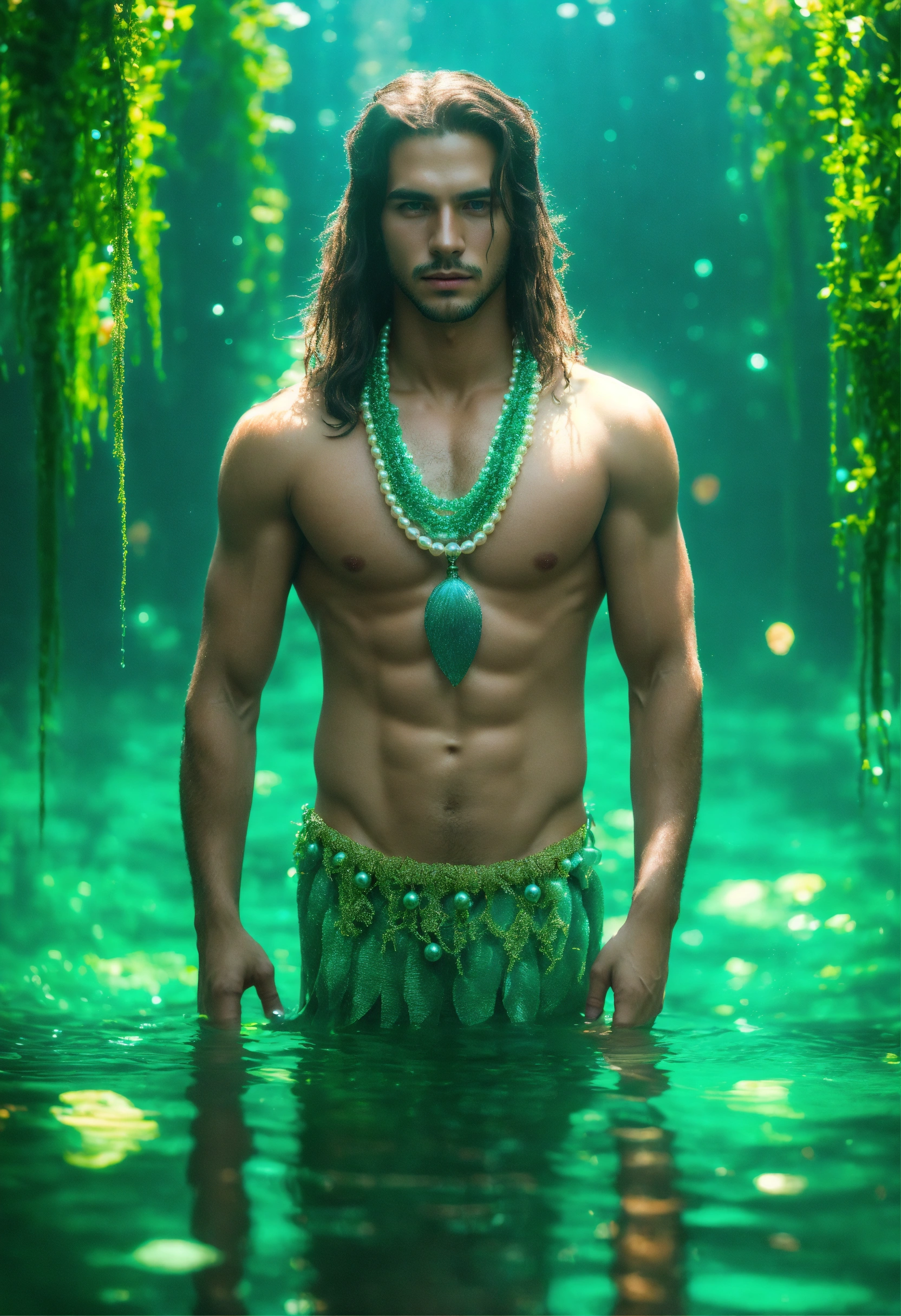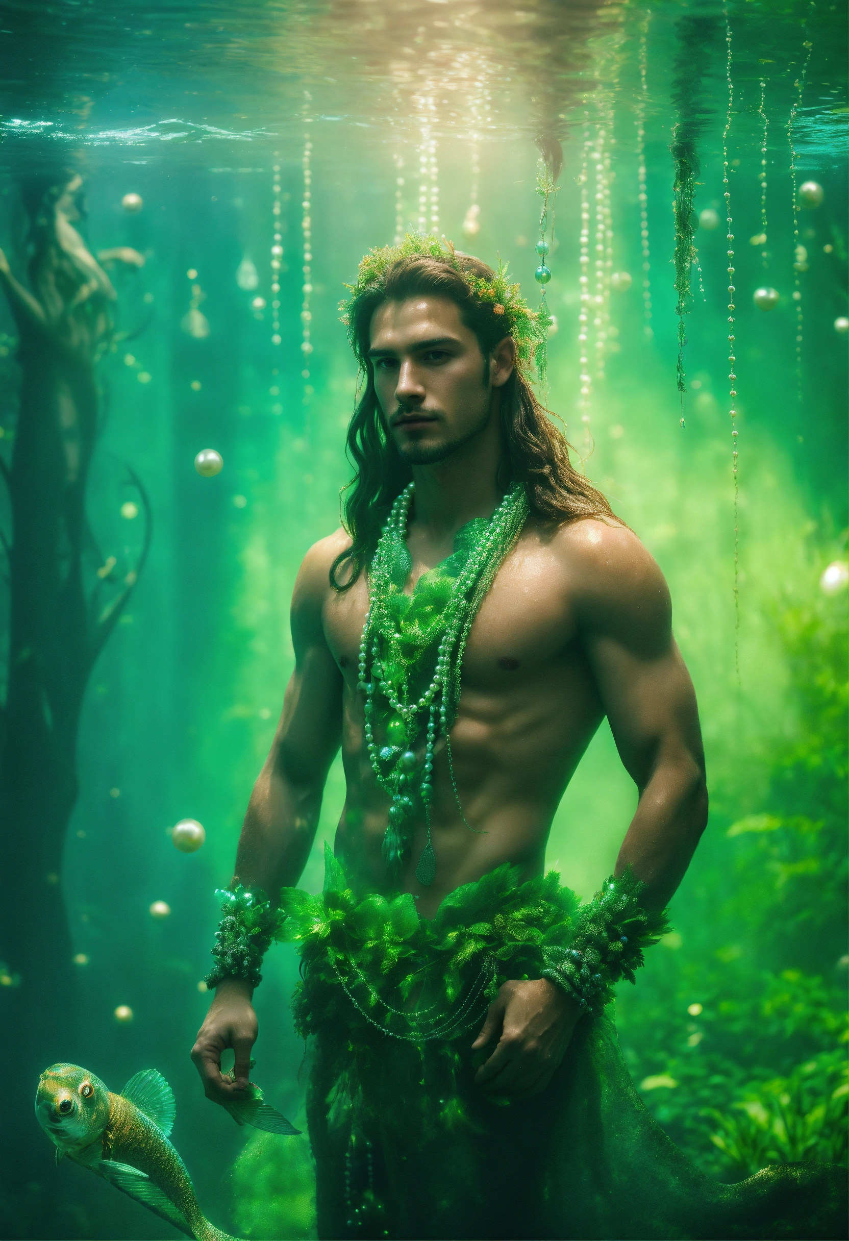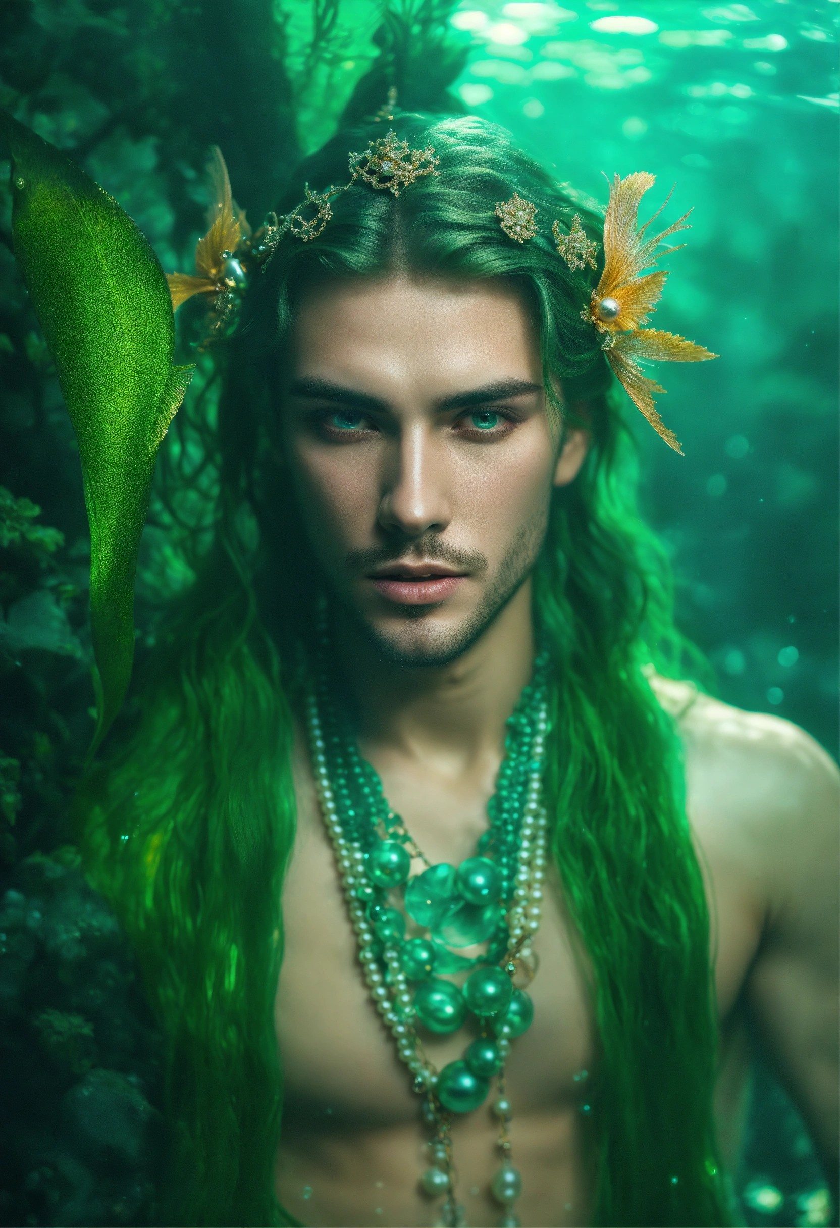 Bright, handsome and sad merman, long straight hair, torso with many pearls necklaces, showing tail . inside a lake water, magic forest, fantastic male beauty. green and big eyes, ultra-detailed dreamlike, photography 8k resolution image, translucent and ethereal.