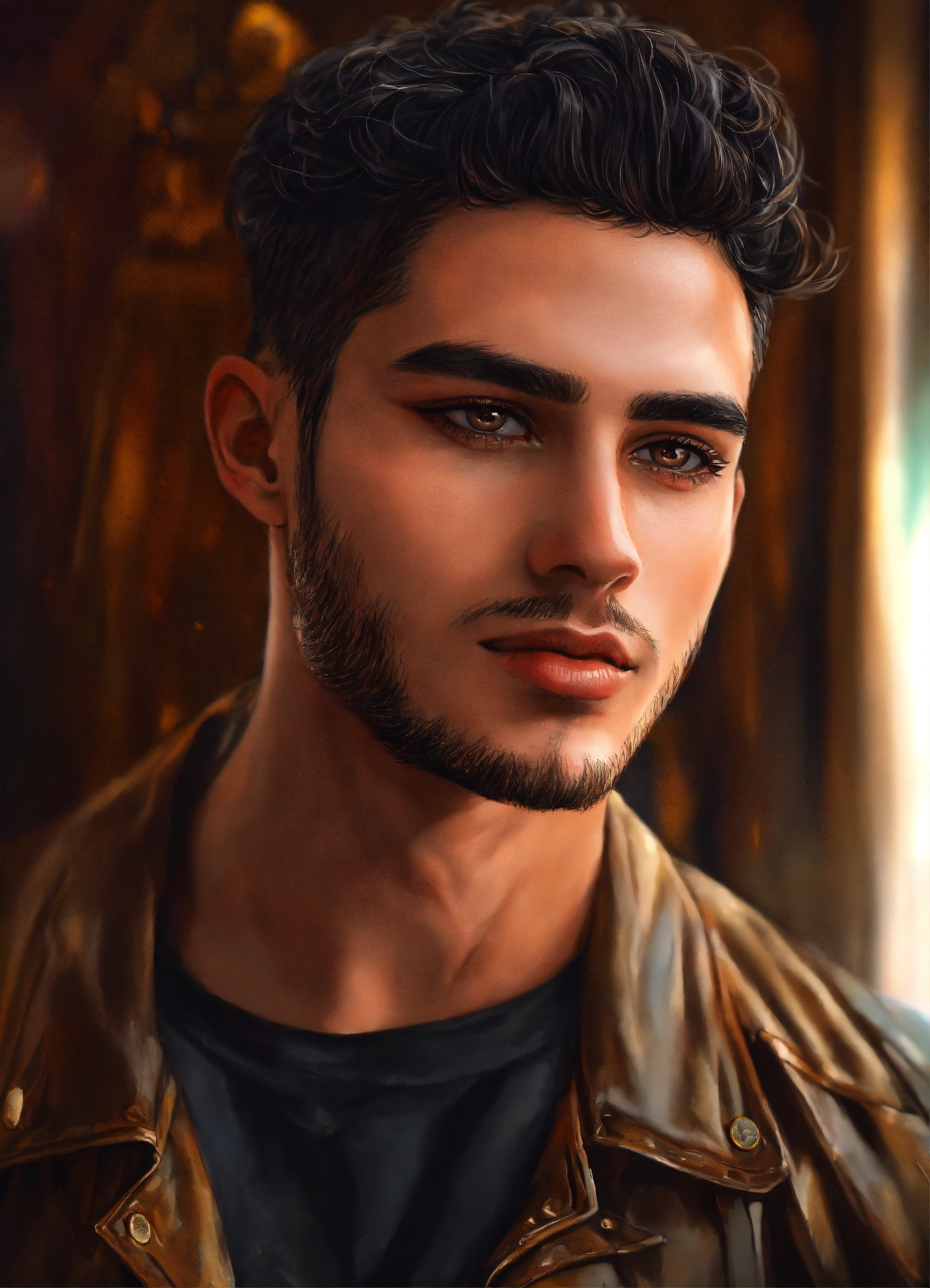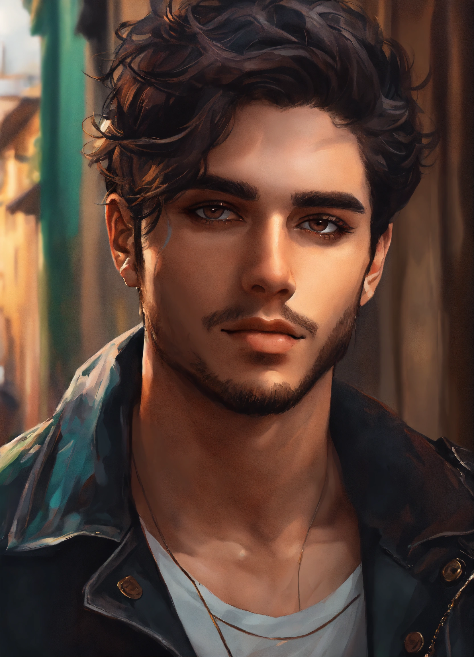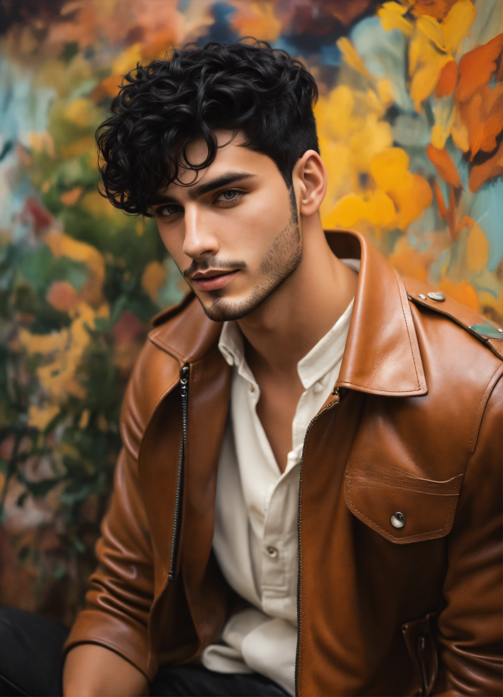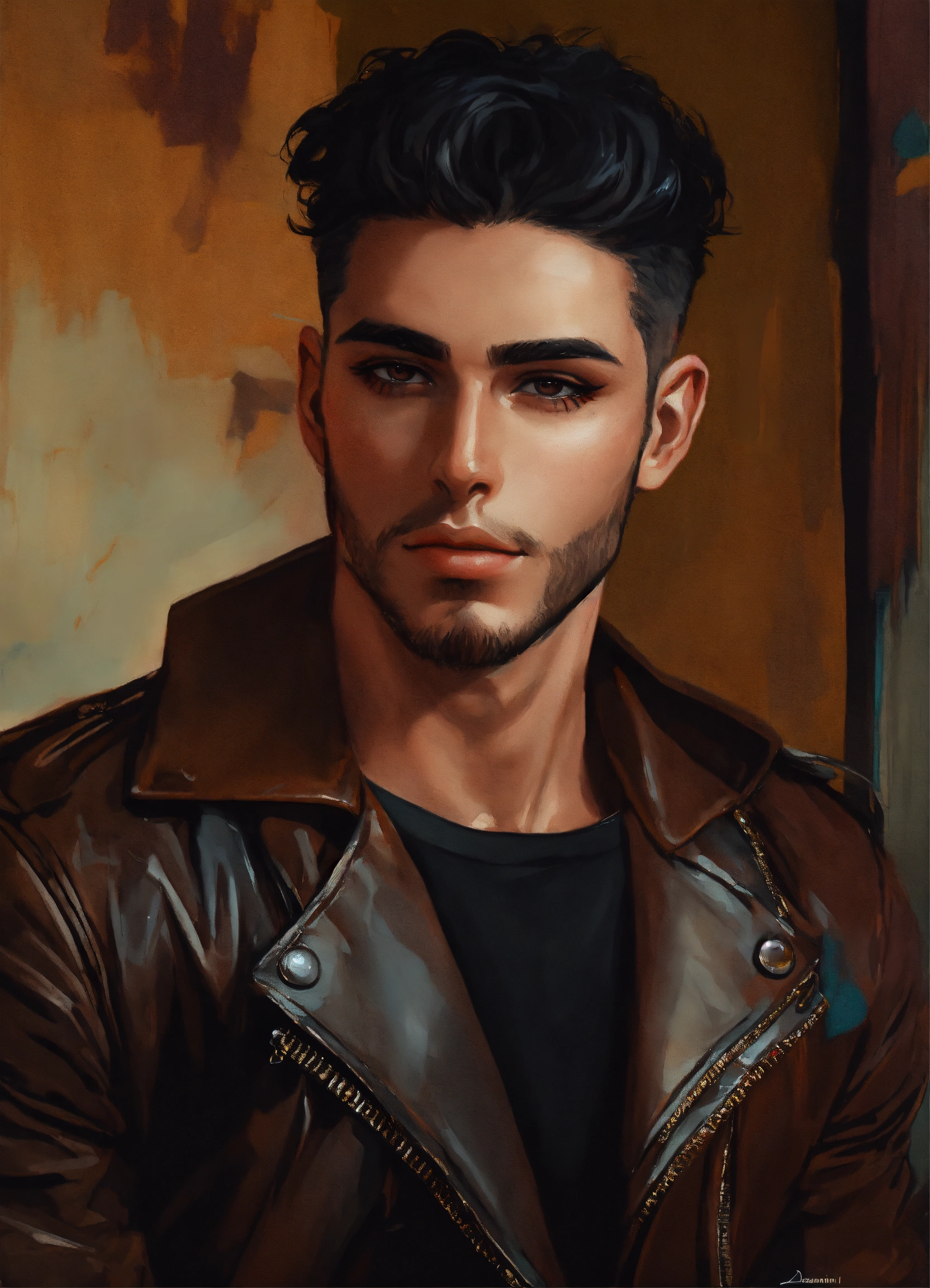 24 year old italian man, short black hair, brown eyes, black eyeliner on eyes, makeup, smirking, leather boots, painting aesthetic, digital painting, damiano david