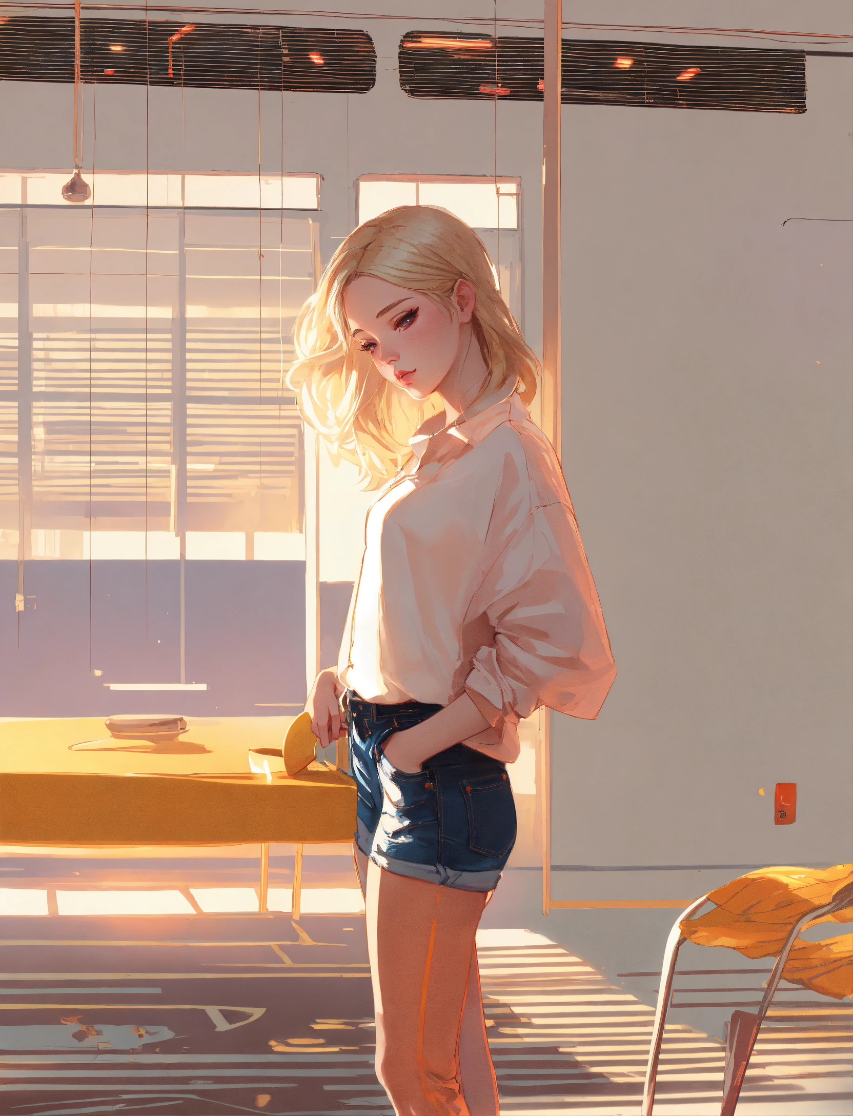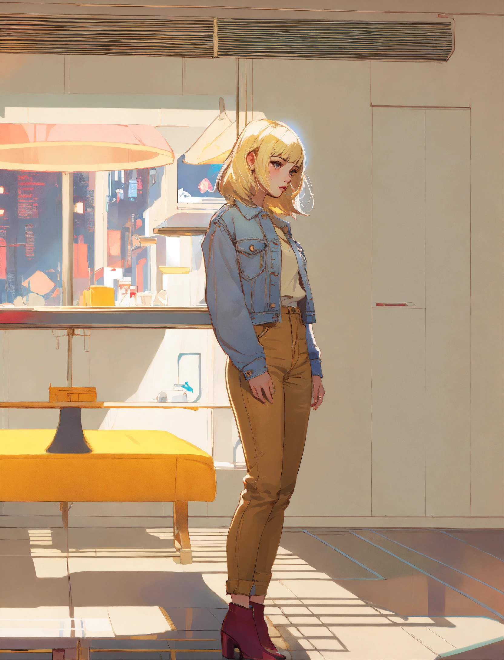 Highly detailed full-length blonde girl in jeans, steven bliss, ilya kuvshinov, rossdraws, tom bagshaw, global lighting, shining light, night city
