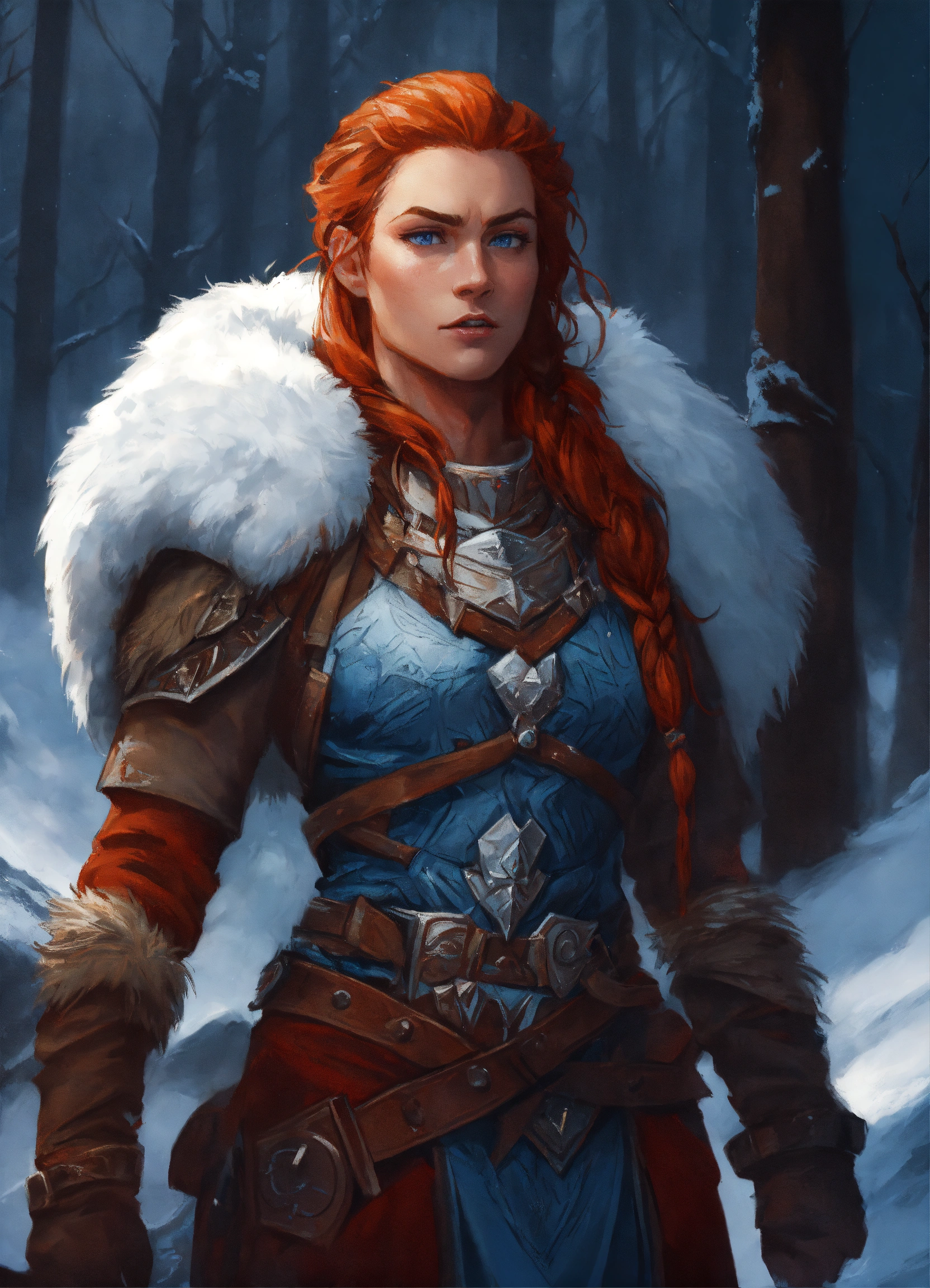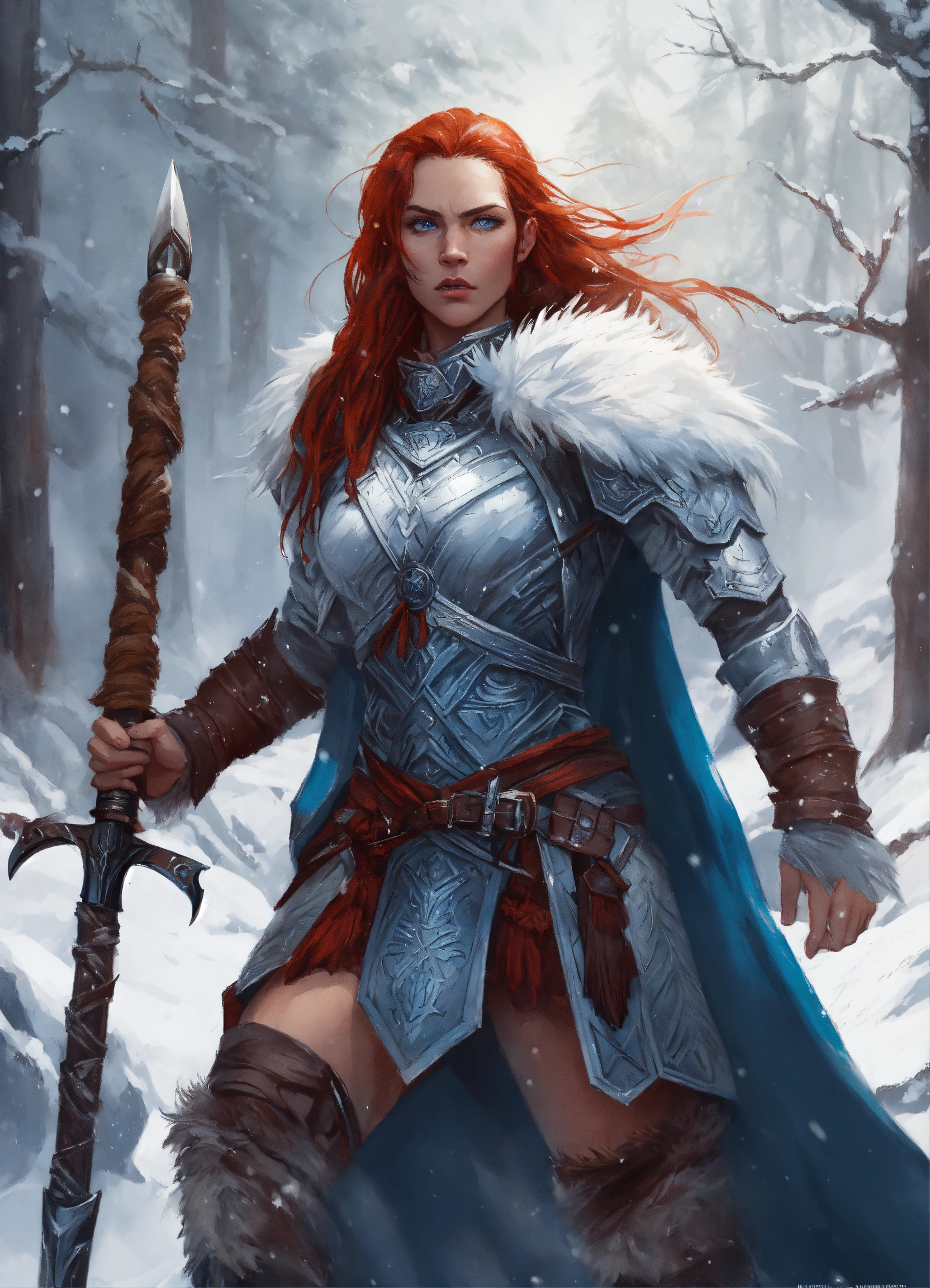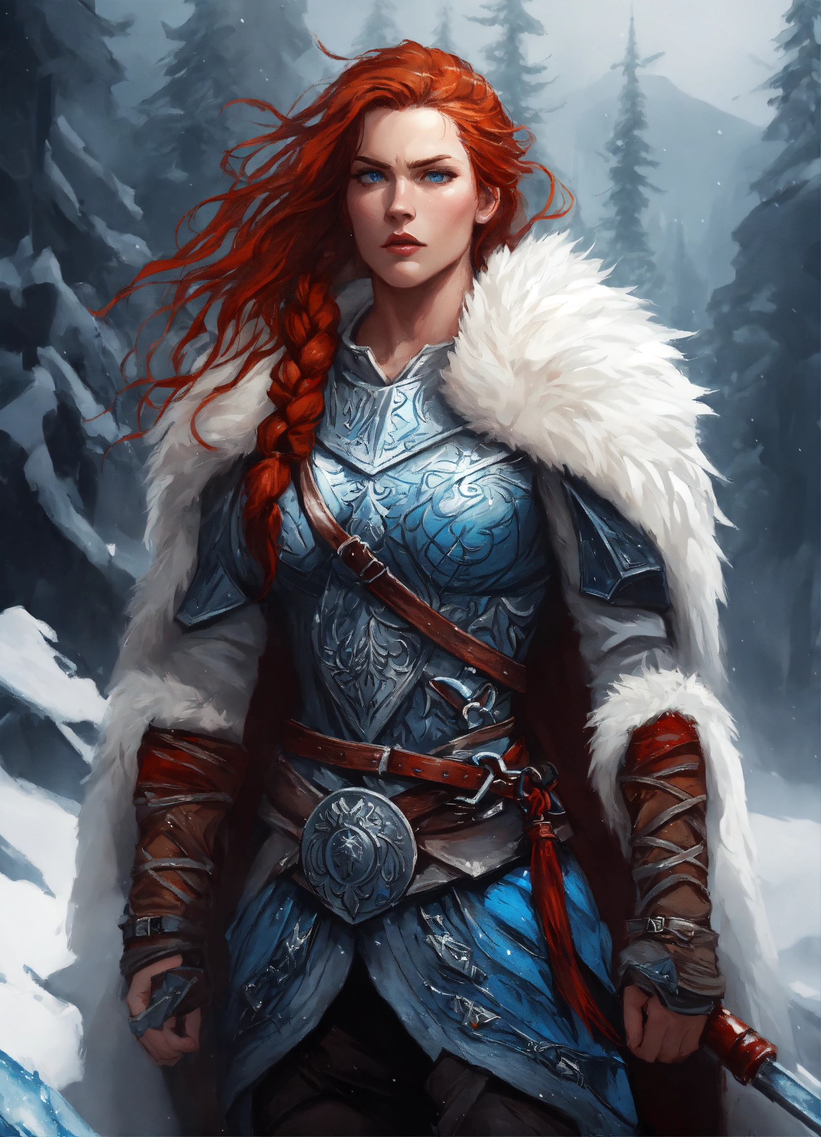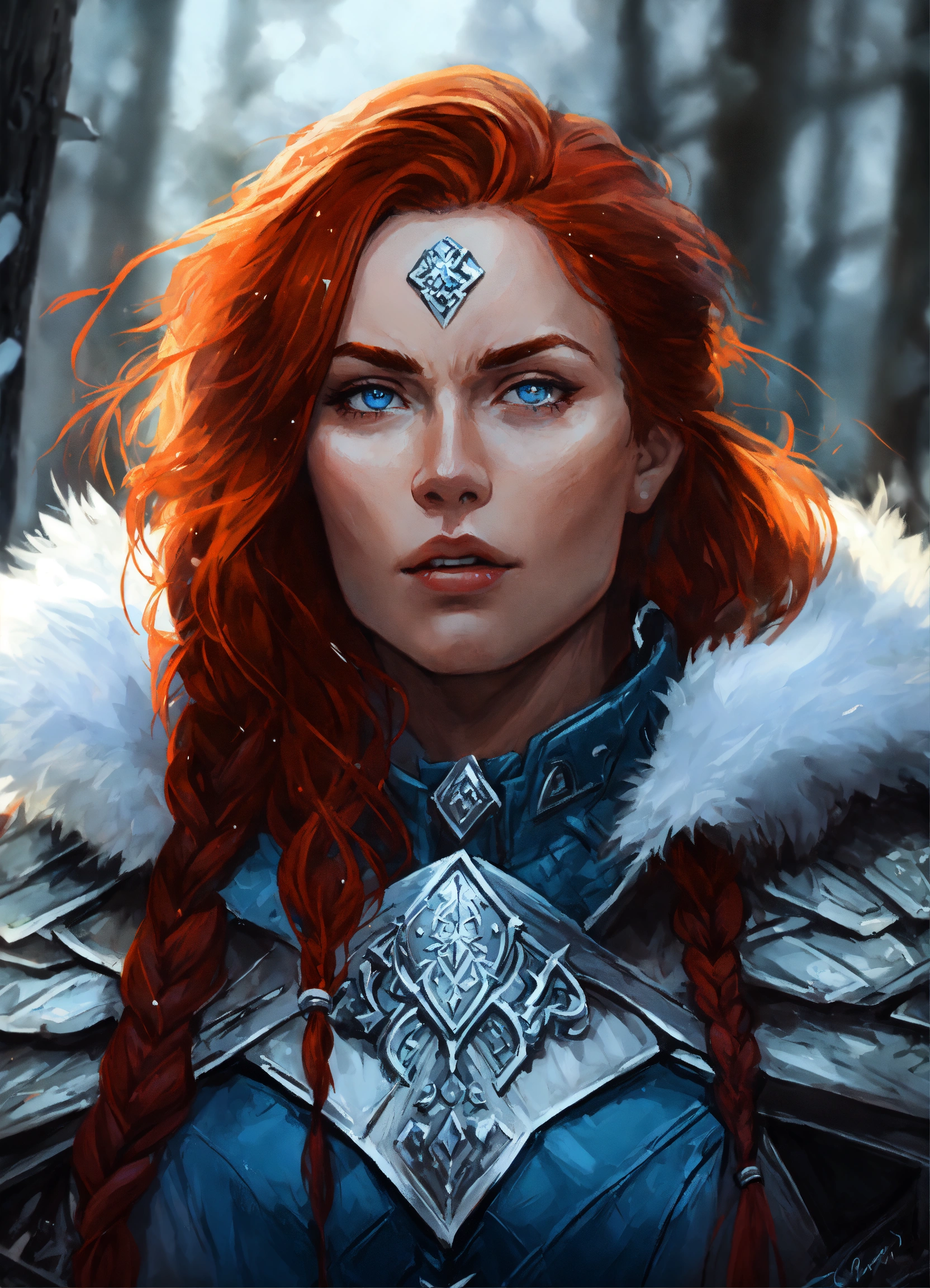 A strong rugged nordic chieftess, broad shoulders, masculine female, bright blue eyes, savage, warhammer fantasy, art style of alex gray art, dan mumford art style, white fur shoulder cape, savage, strong, winter scene, icy, mountain, forest, red hair, tall, rough, wild, aggressive, vengeful, ready for battle, close up portrait, skarsgard, nordic, huscarl, muscular, buff female, braided hair, strong
