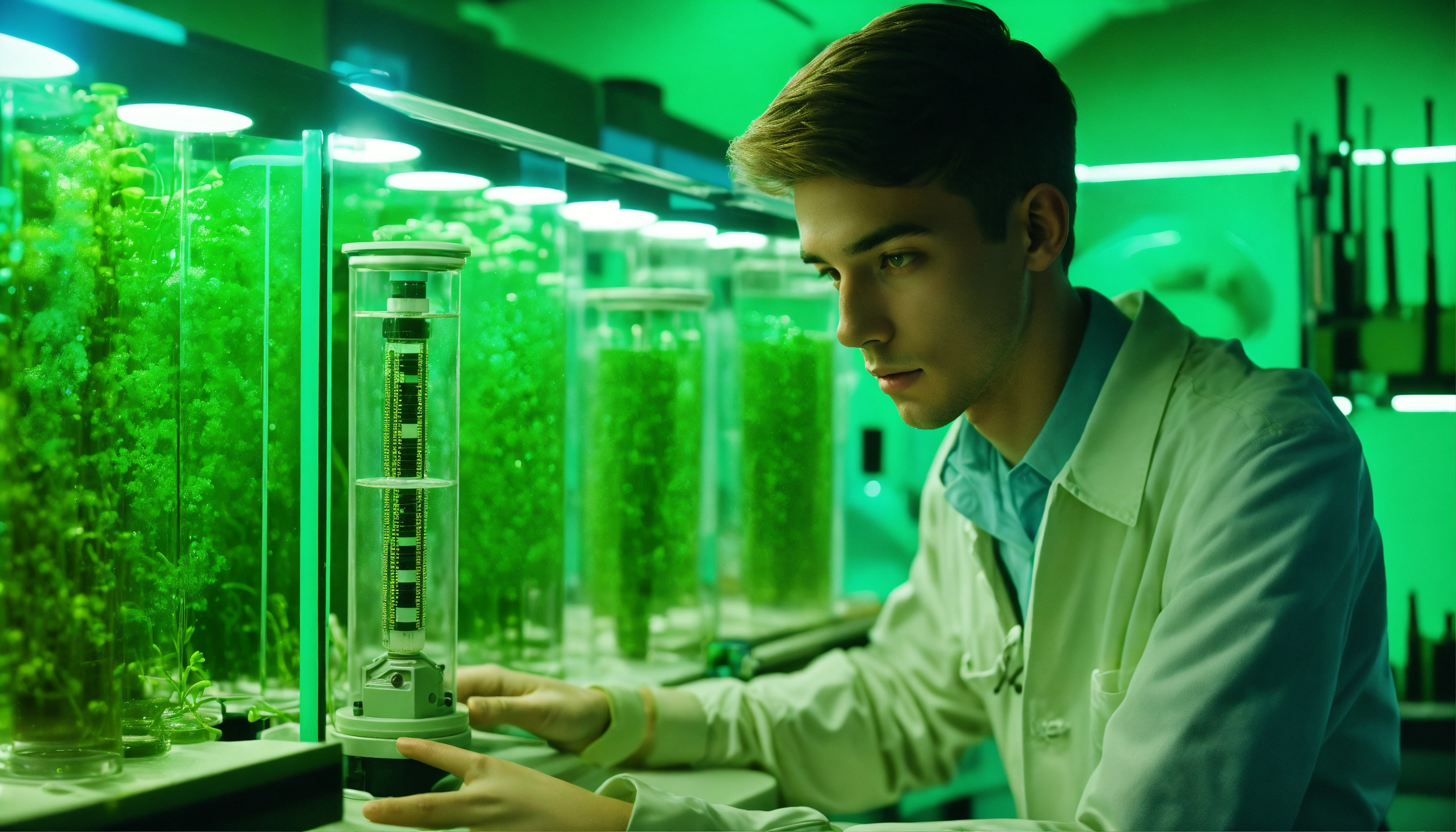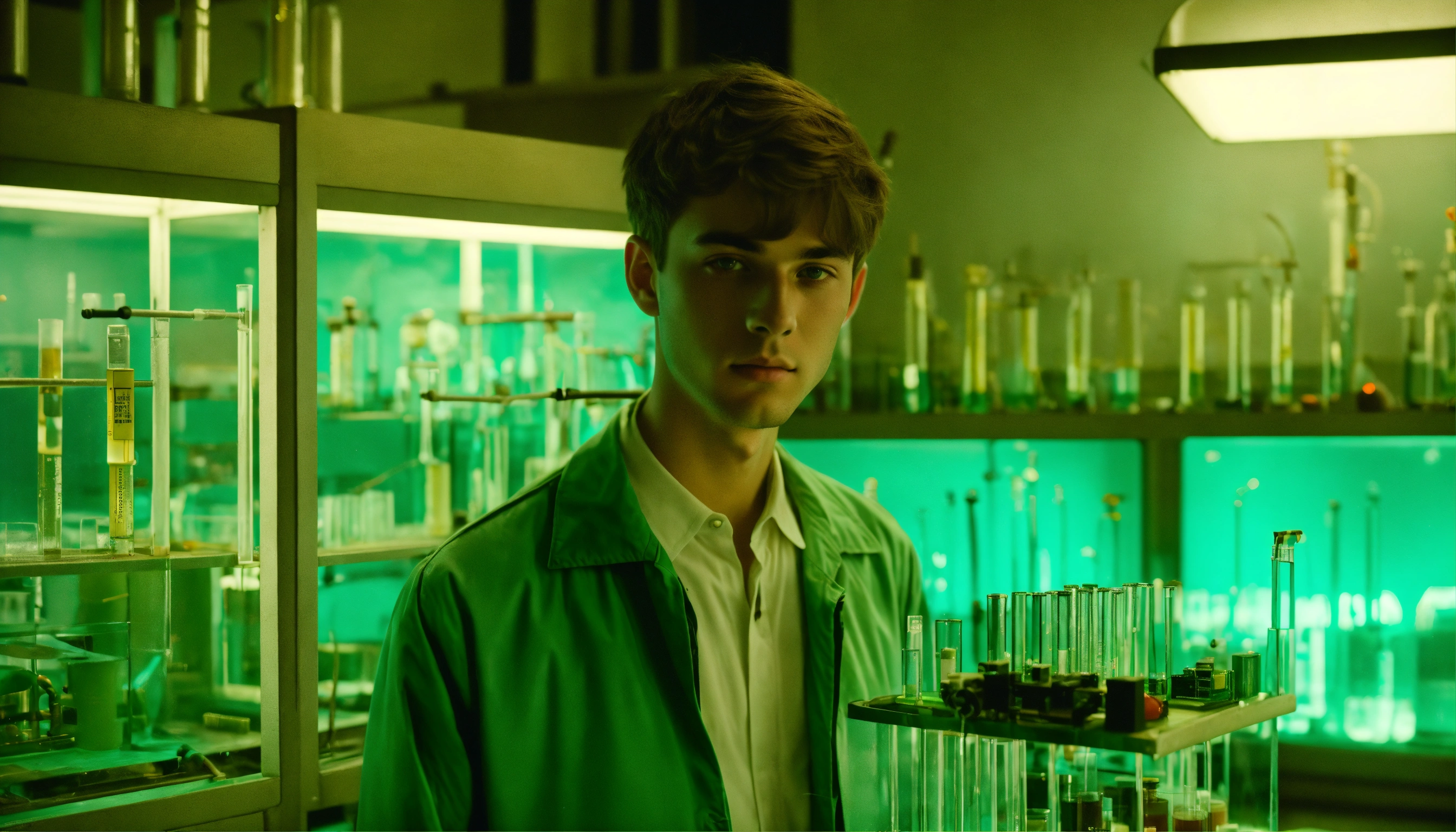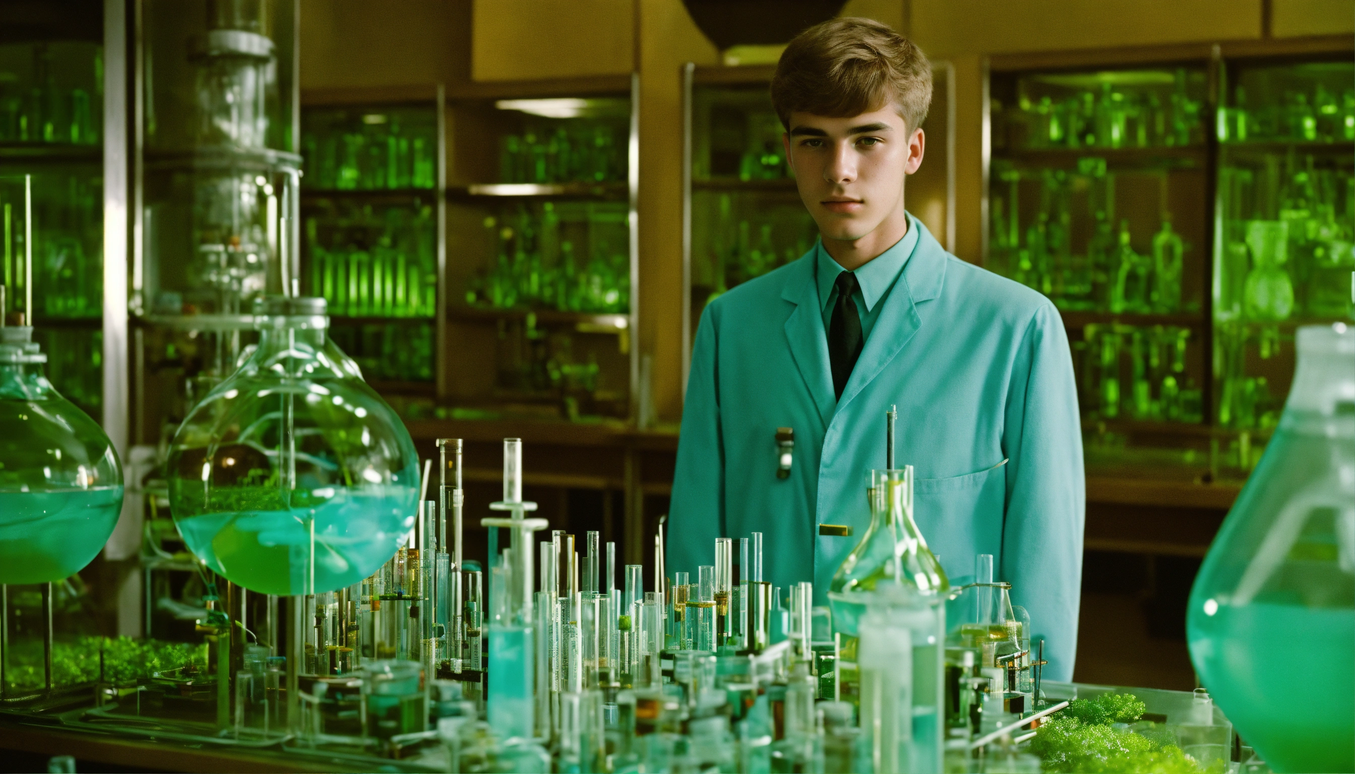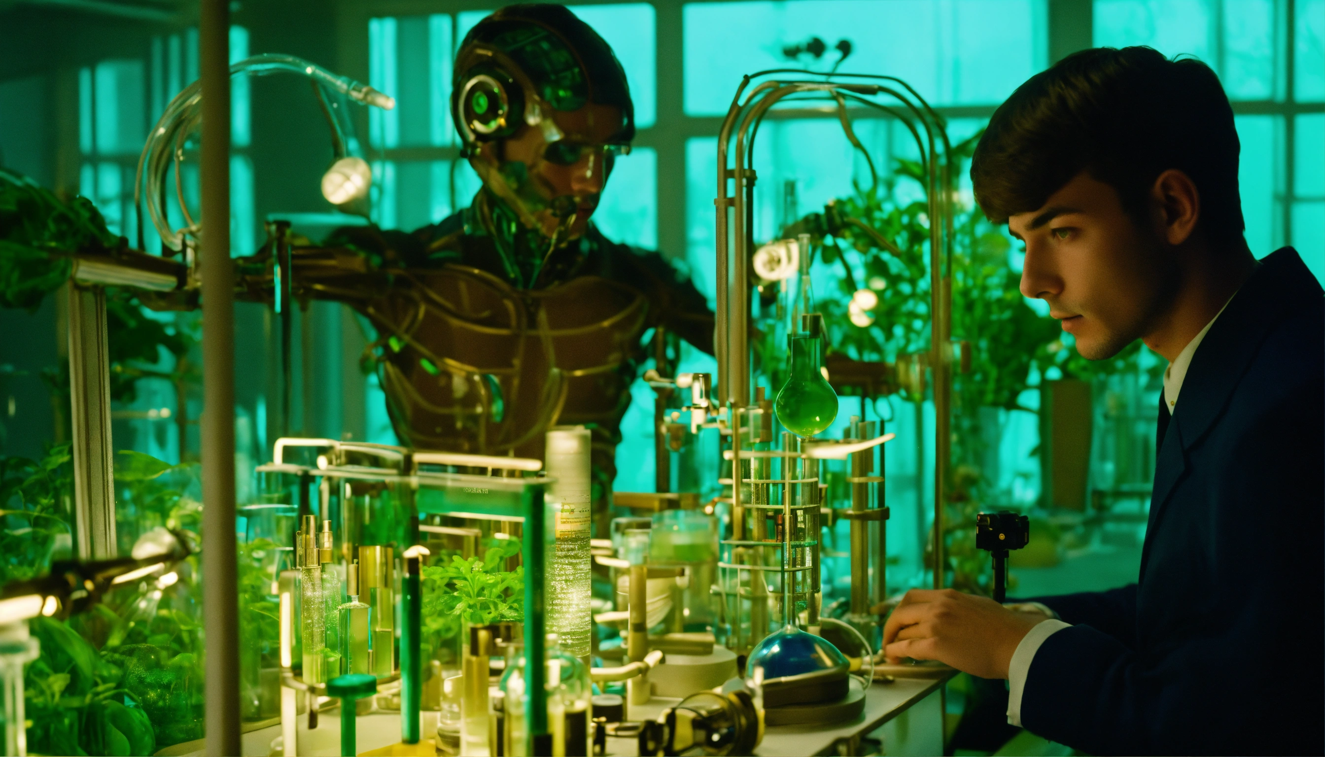 1964, old photography, kodak film colour, surreal sci fi, old film, unknown handsome 18 years old researcher boy with a big unknown monster, futuristic glass lab with myriad of research instruments, a myriad of futuristic test tubes, pale blue emerald green, regenerative plants and ai