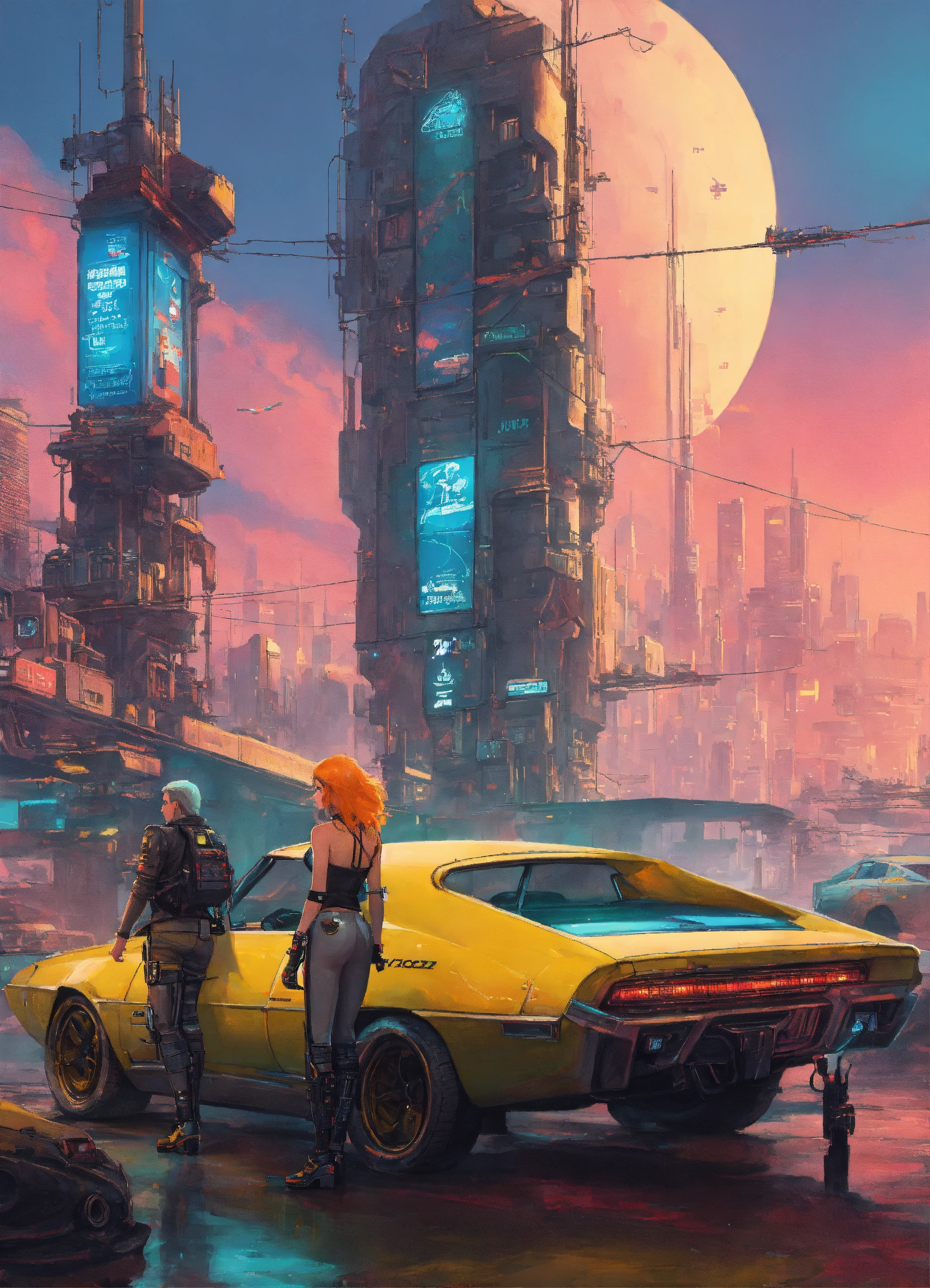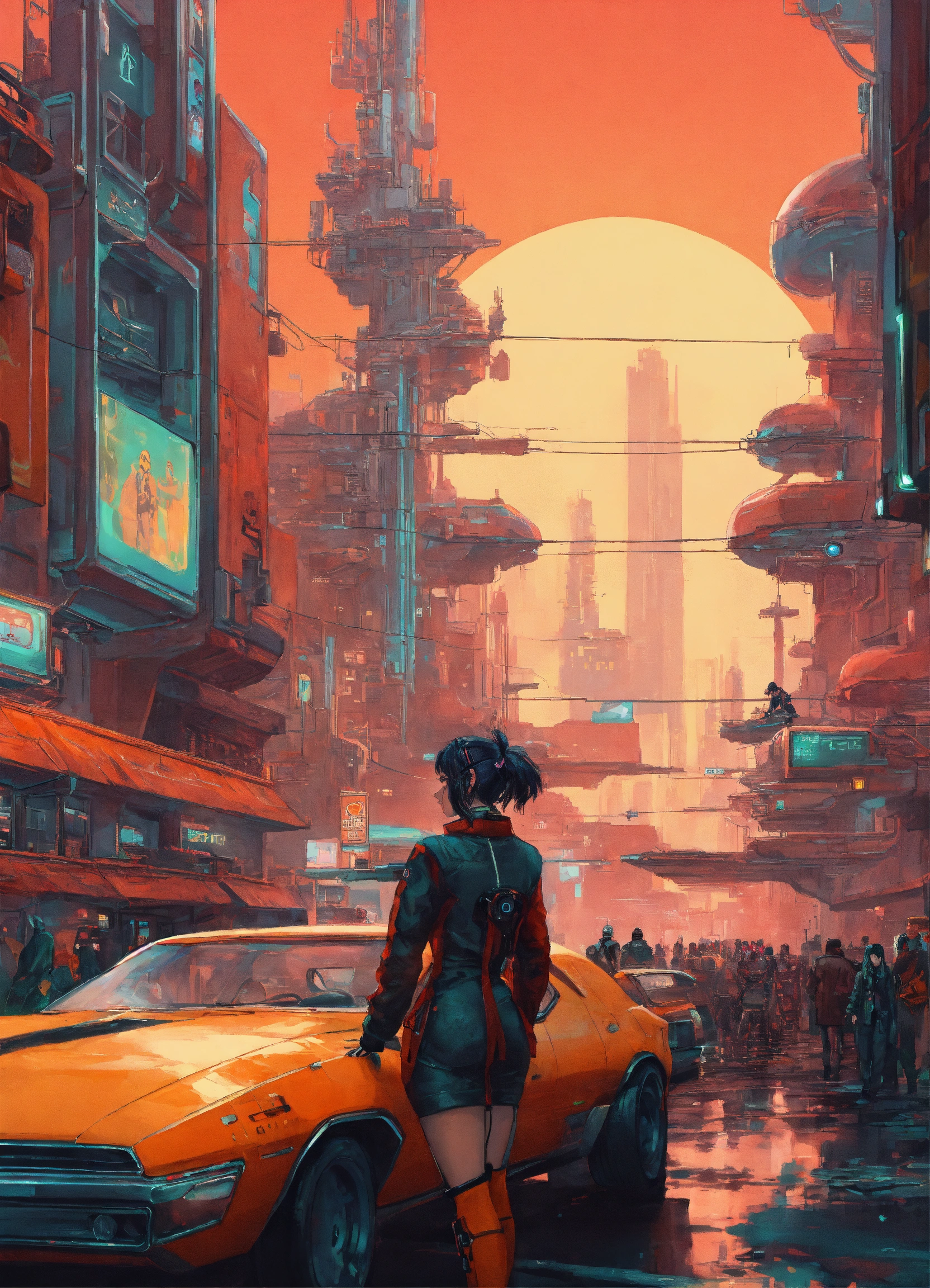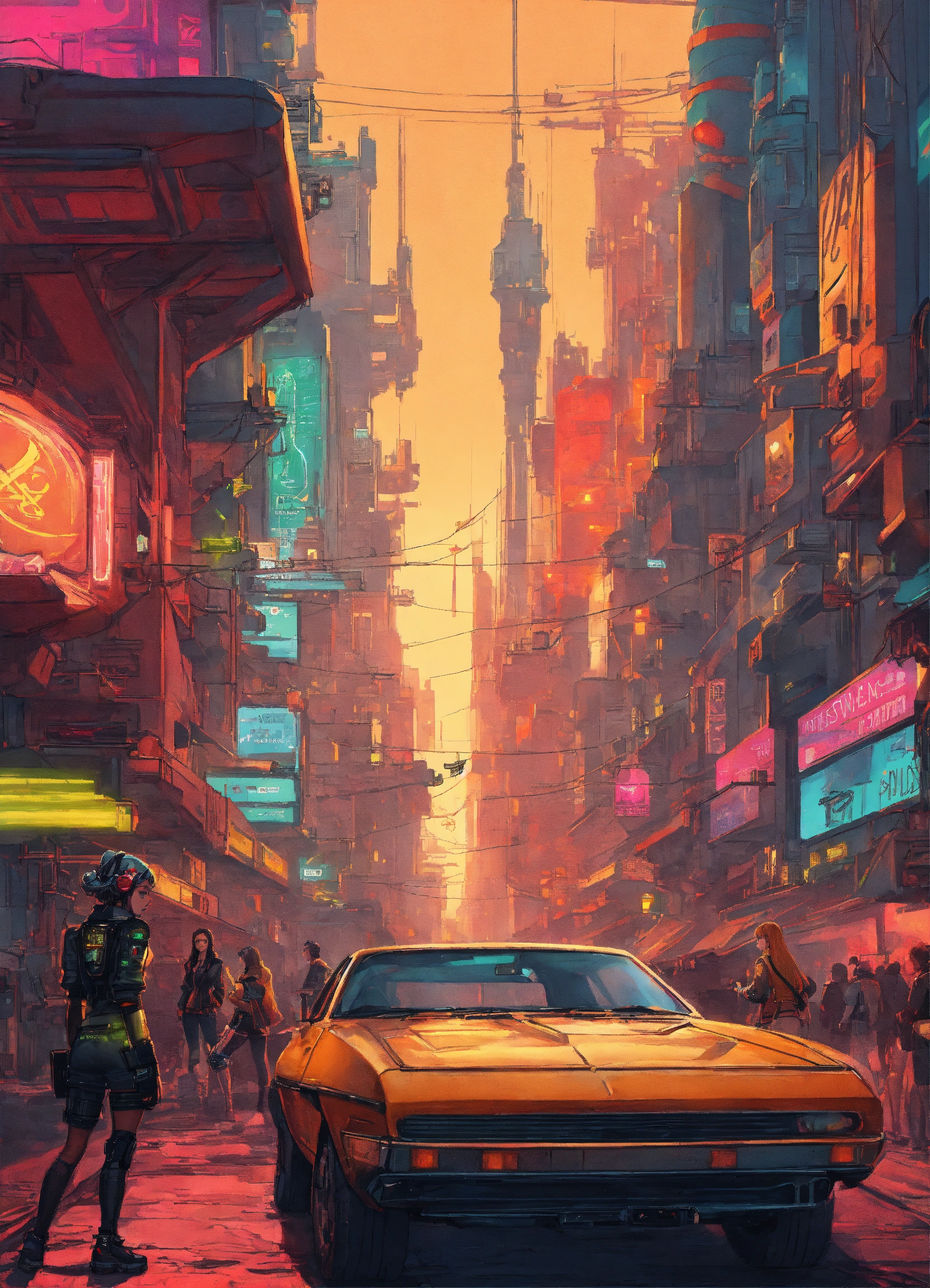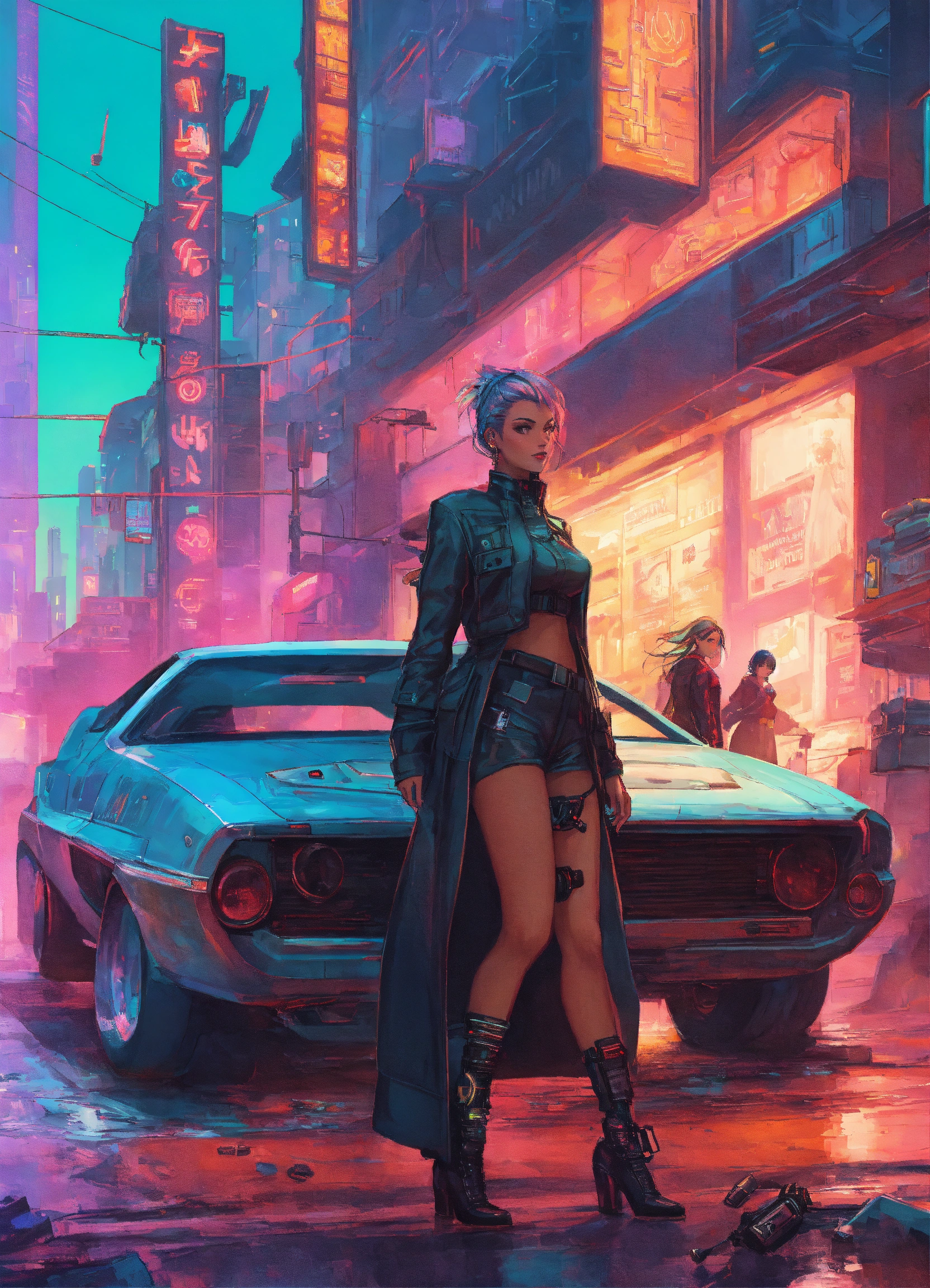 Detailed illustration of cyberpunk and retro-futuristic city, with modern retro cars and beautiful women with tech prosthetic limbs, 2077, nuclear, punk