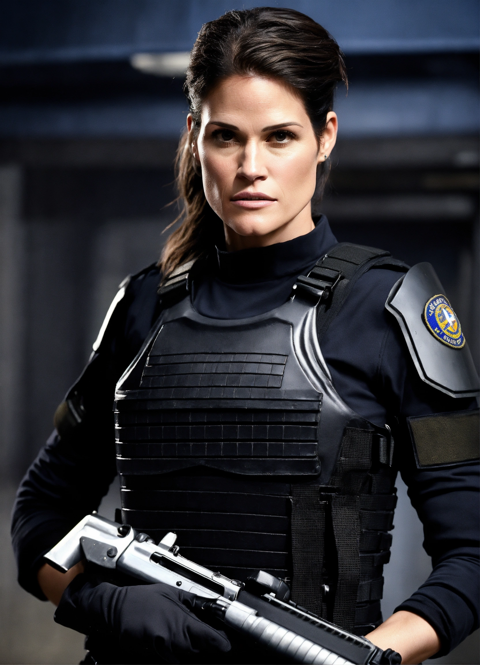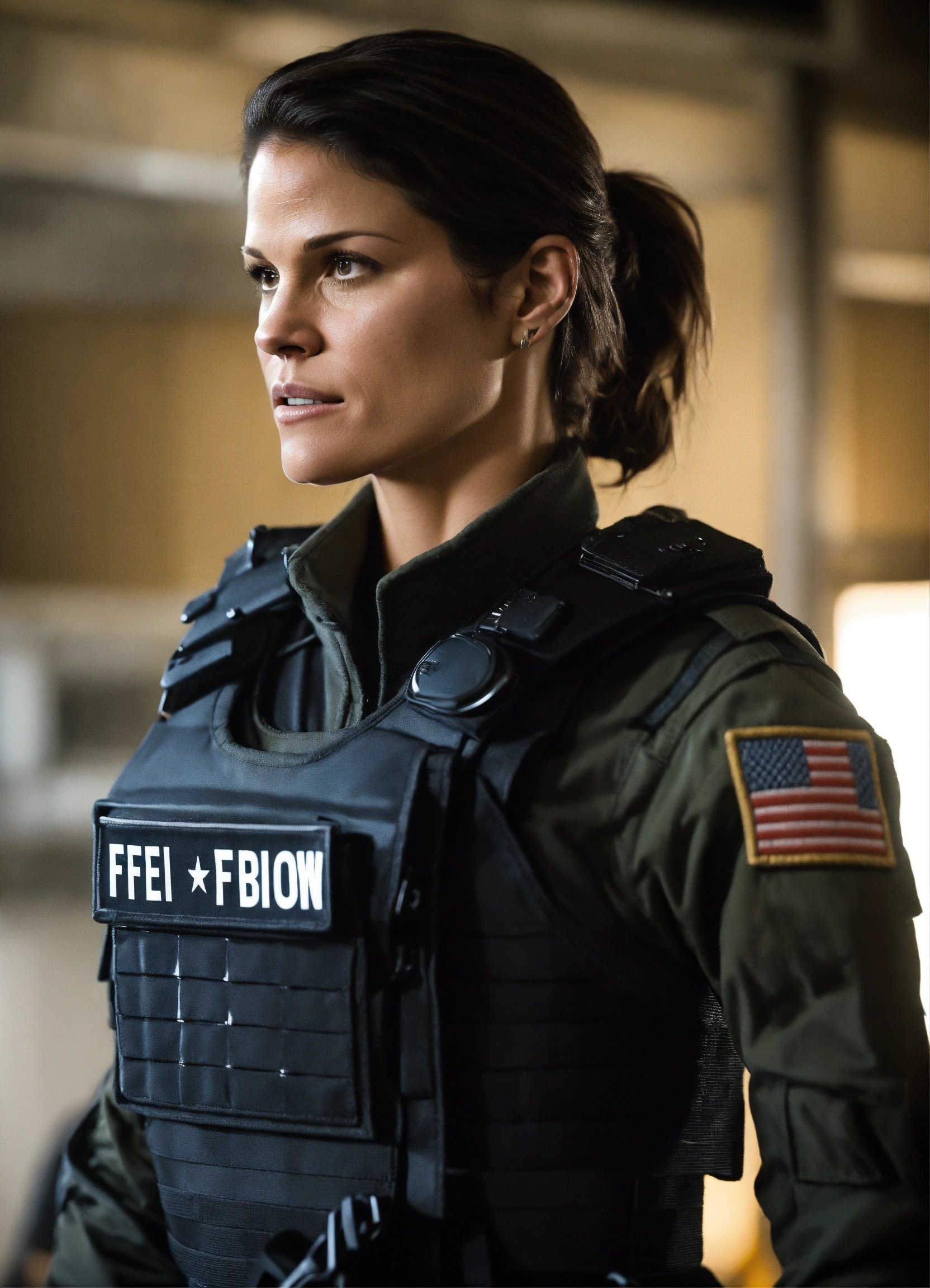 Strong female missy peregrym as a fbi agent wearing black military style armor