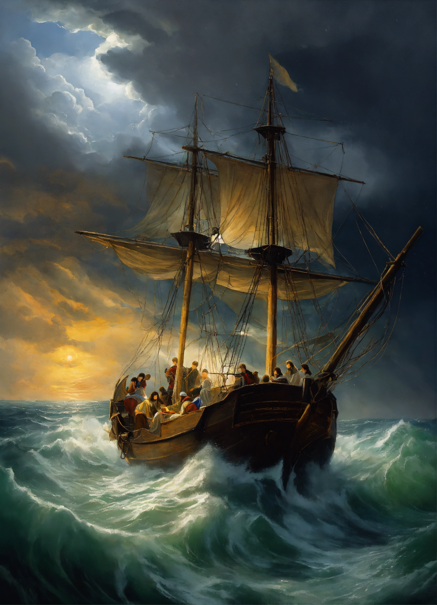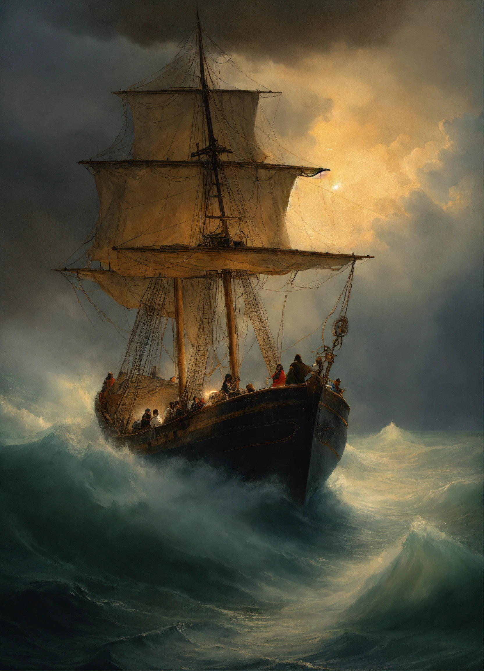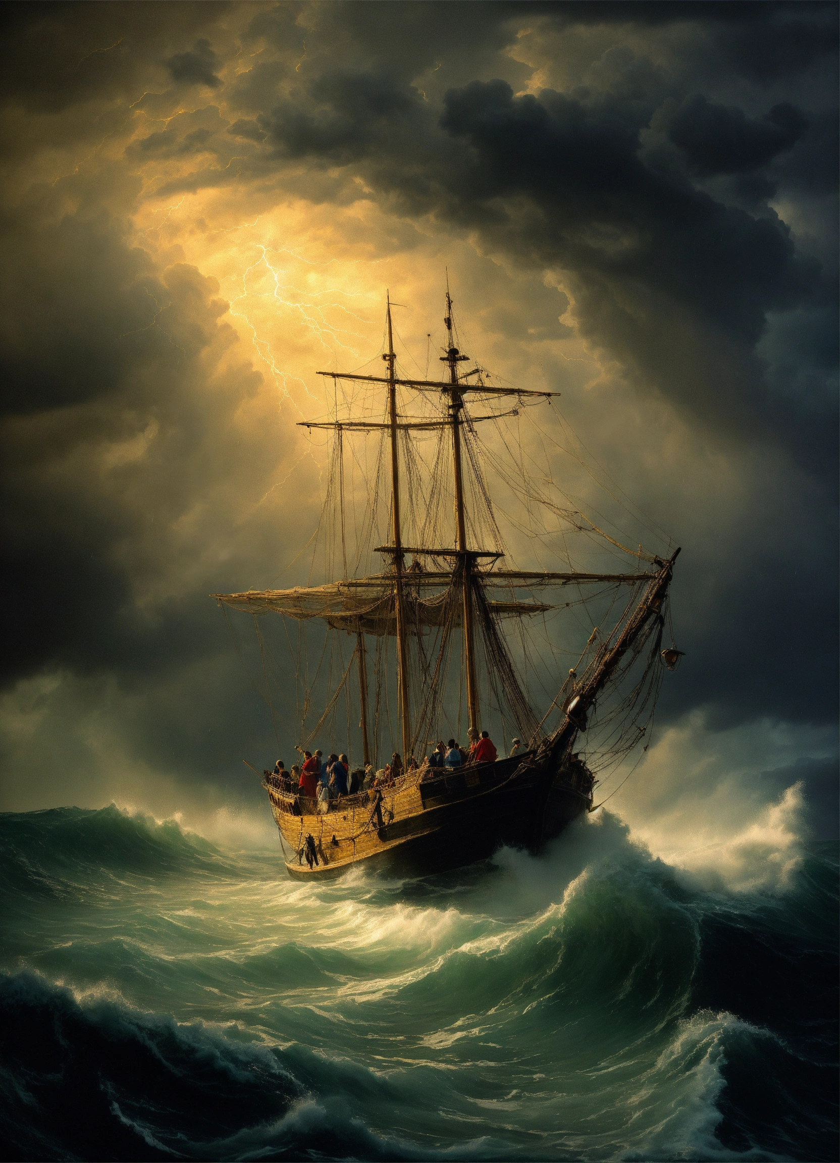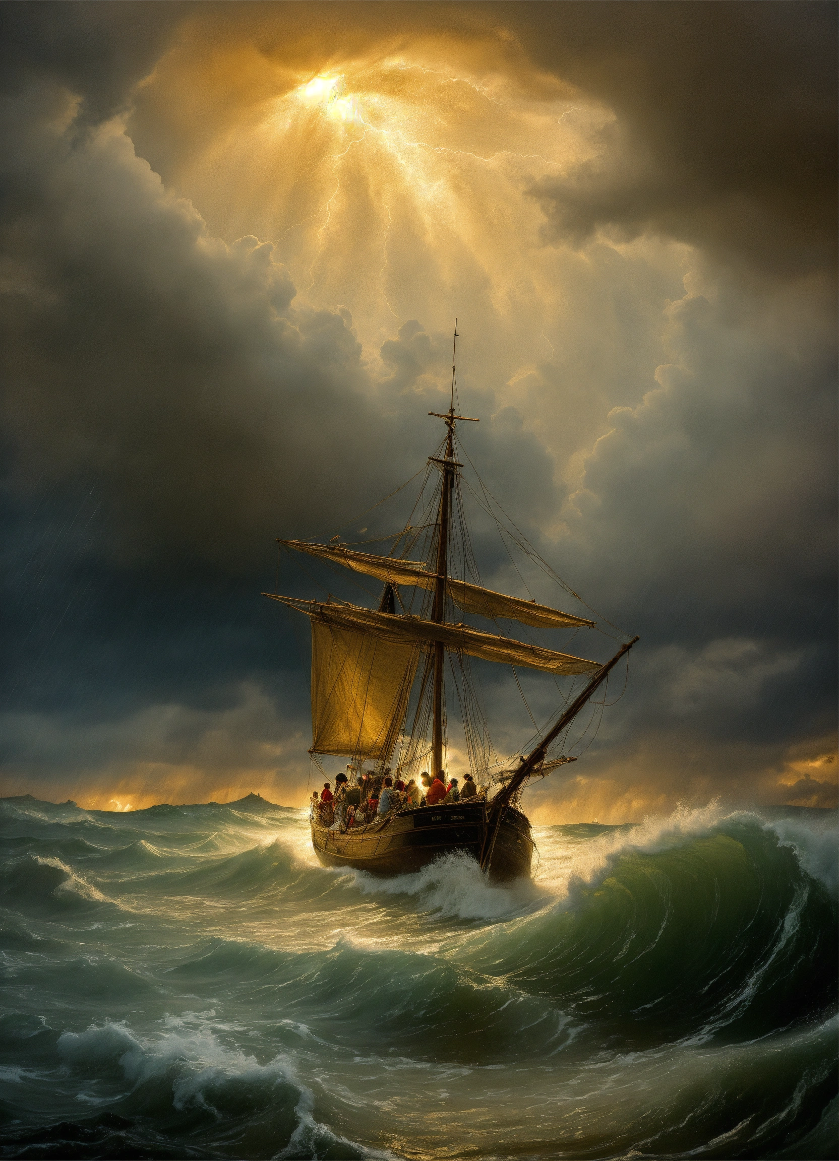 Image of a stormy night at sea during a fierce tempest. in the center of the scene, jesus is depicted holding peter by the hands. both figures are illuminated with a soft, divine light, providing a stark contrast to the dark, turbulent waters surrounding them. peter's face reflects a mix of fear and relief, while jesus' expression is one of compassion and assurance. rain pours down, but their connection remains steady, emphasizing the powerful moment of rescue and faith amidst the storm.