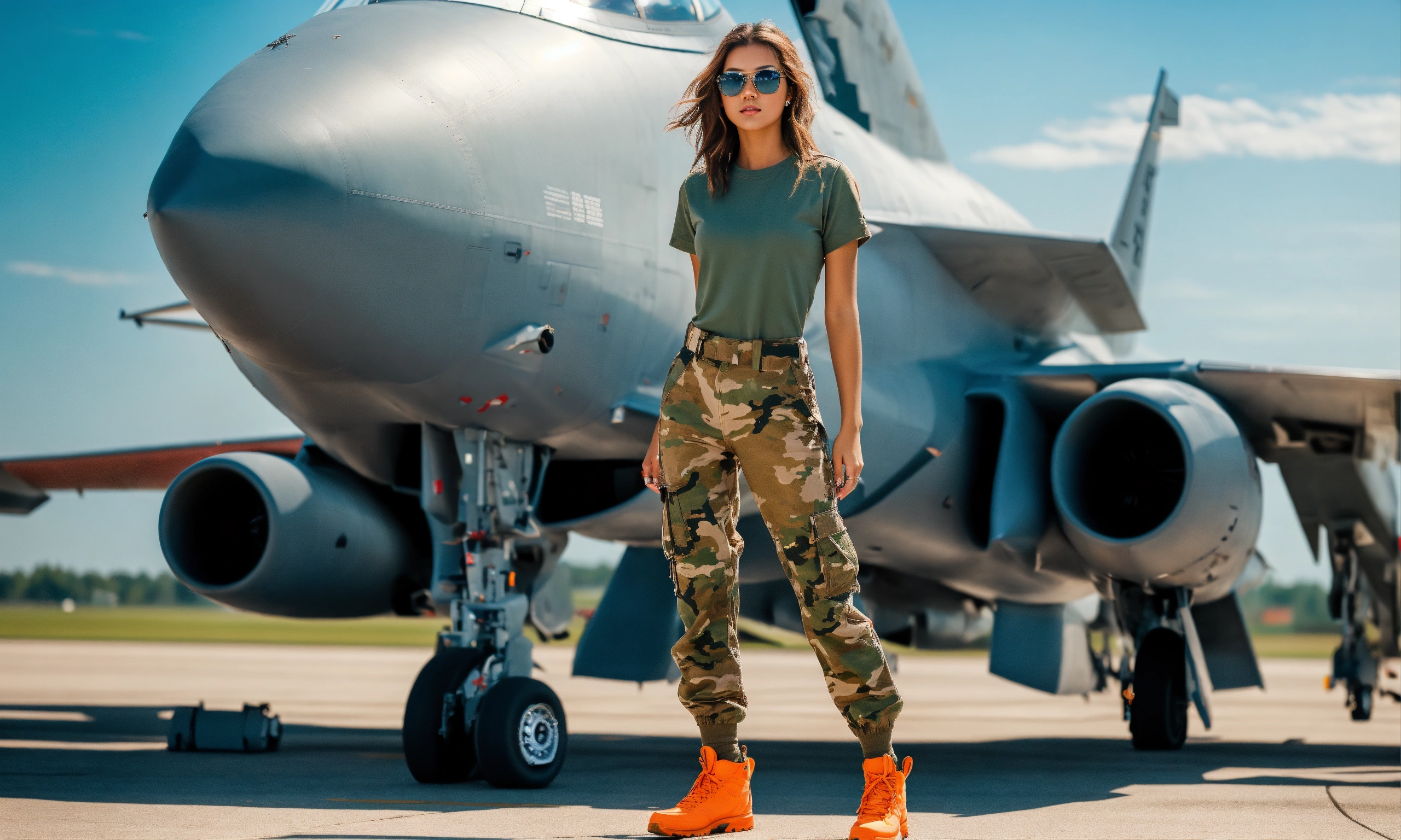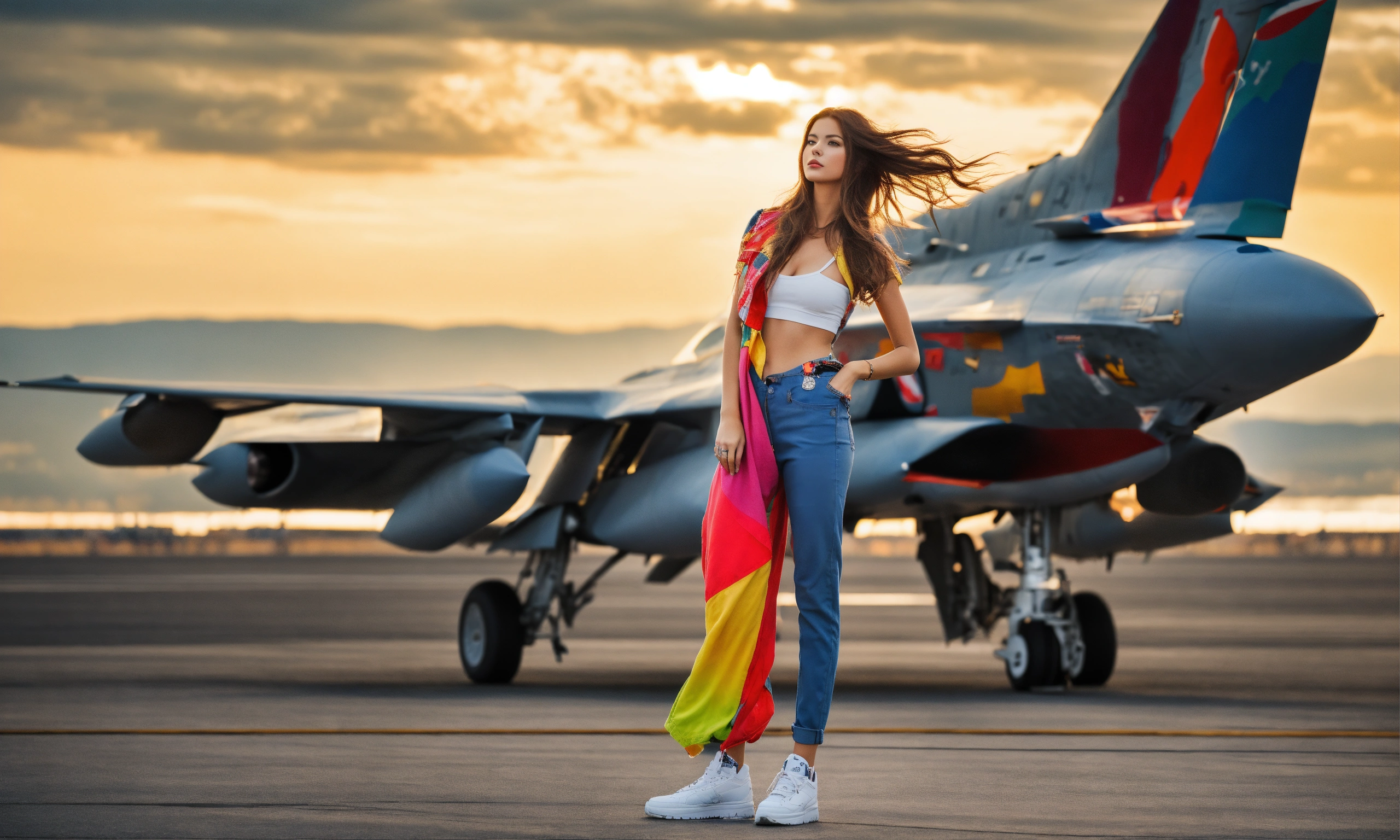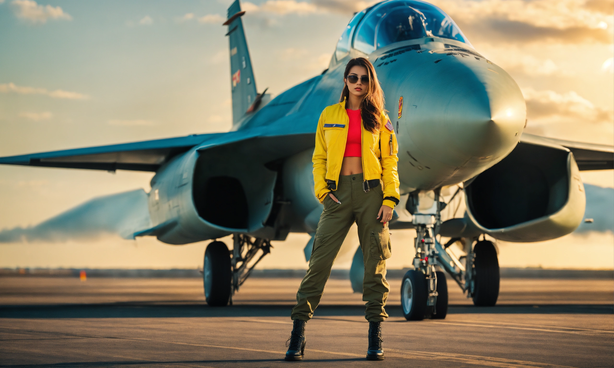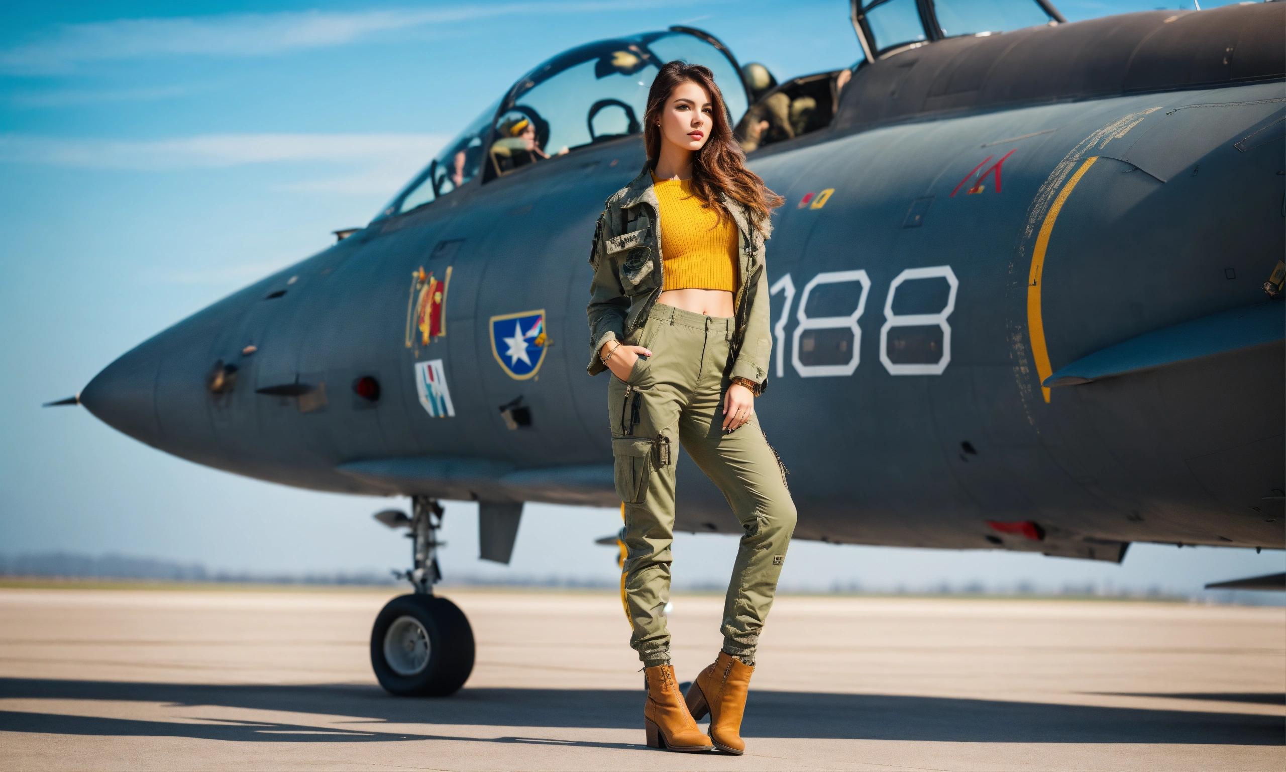 Cool models girl standing a little be on the side of a military jet, hands in the pants, colorful image, 8k, high quality, perfect view
