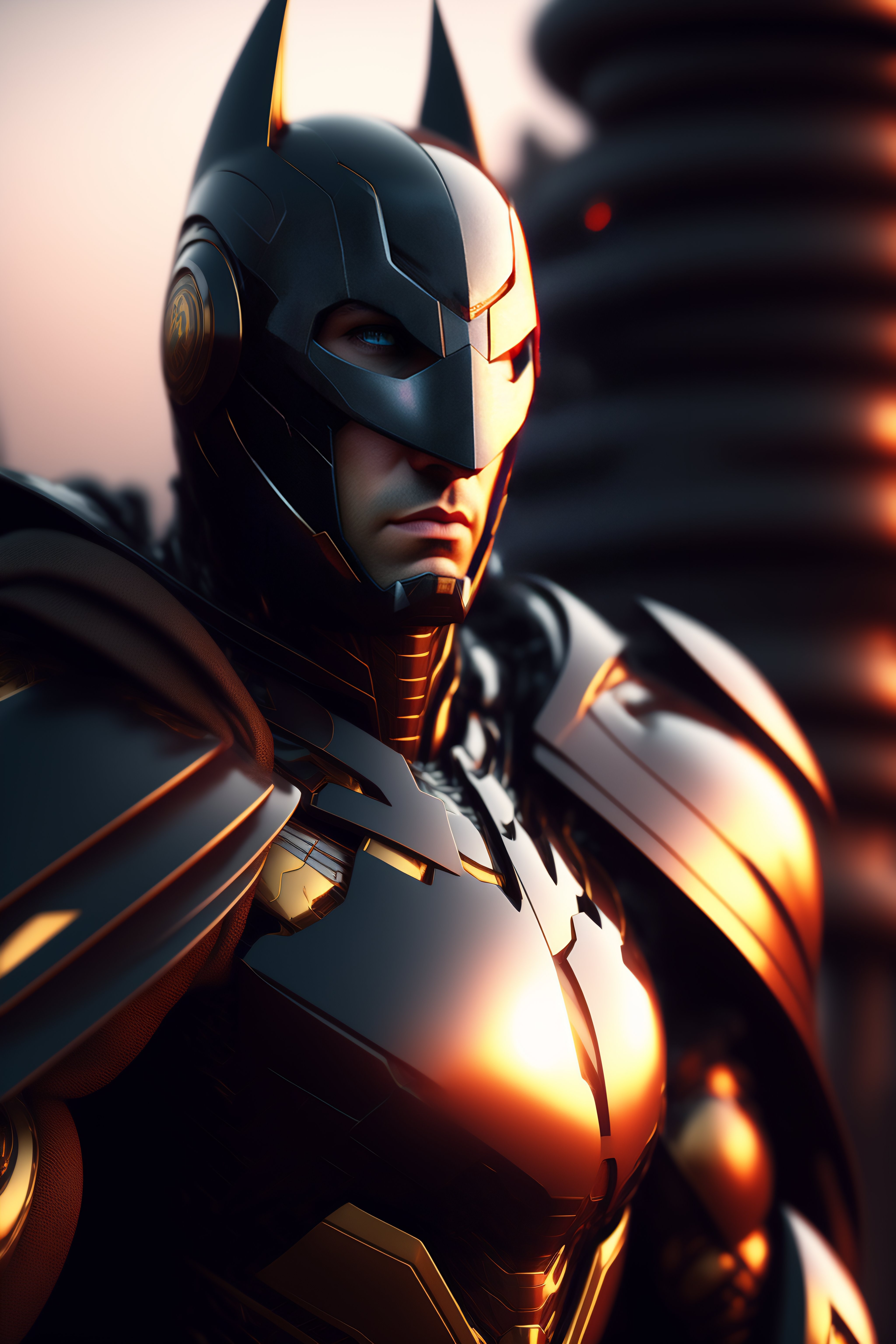 Full body shot of ben affleck's batman poses on top of the building, hi-tech knight soldier, wearing robotic dark black metal helmet and armour in iron man's mark 85 style, hi-tech dark costume, white eyes detailed digital artwork, ultra high realistic, ultra high detailed, technological city background lighting, highly accurate, deep aesthetic, 8k, highly ornate intricate details, cinematic lighting, rich colors, ray tracing, hyperrealistic, photorealistic, cinematic landscape, artstation, realistic face