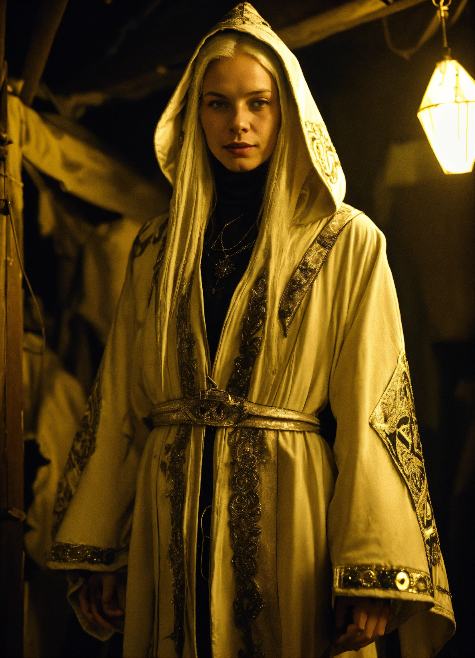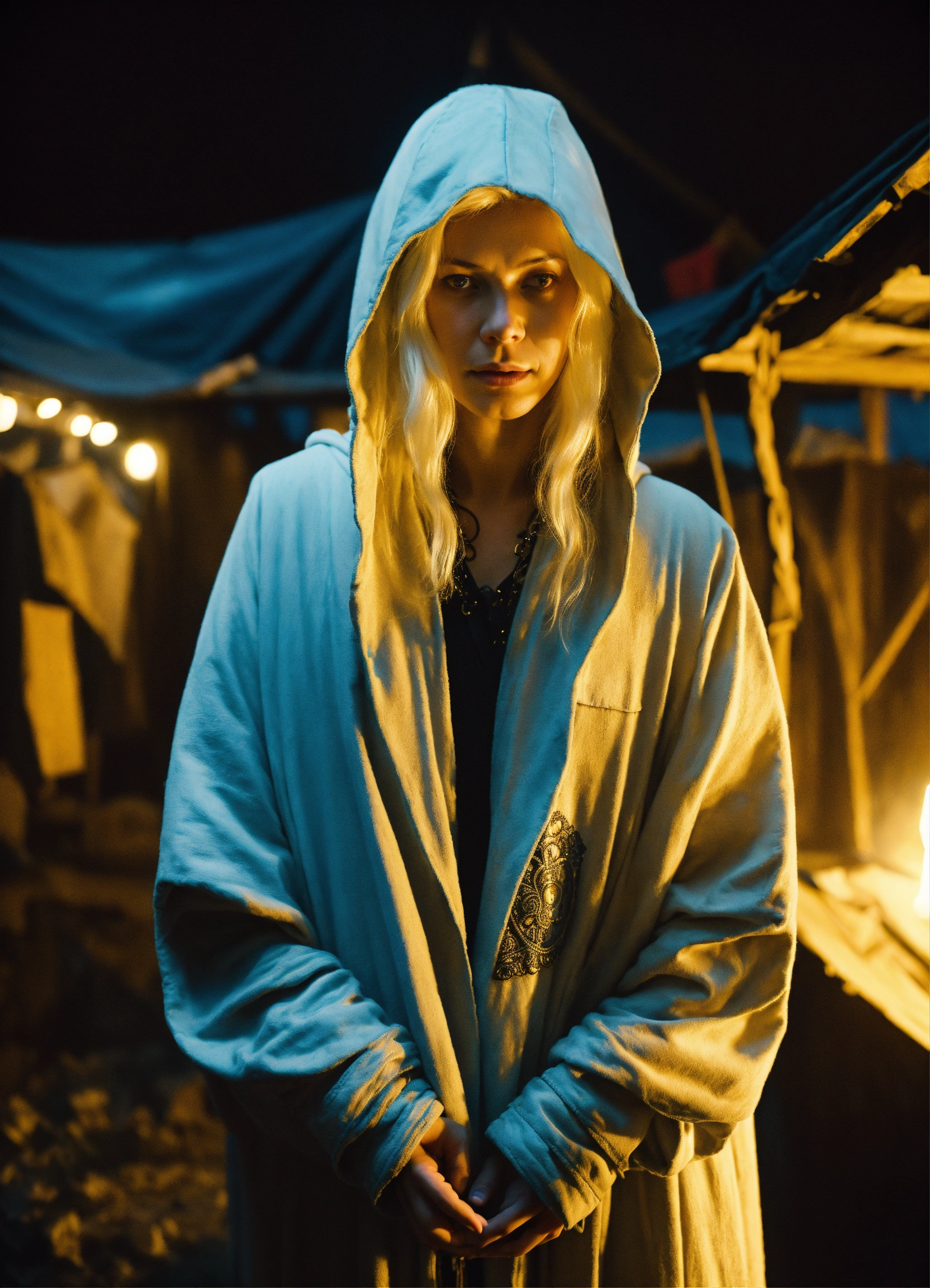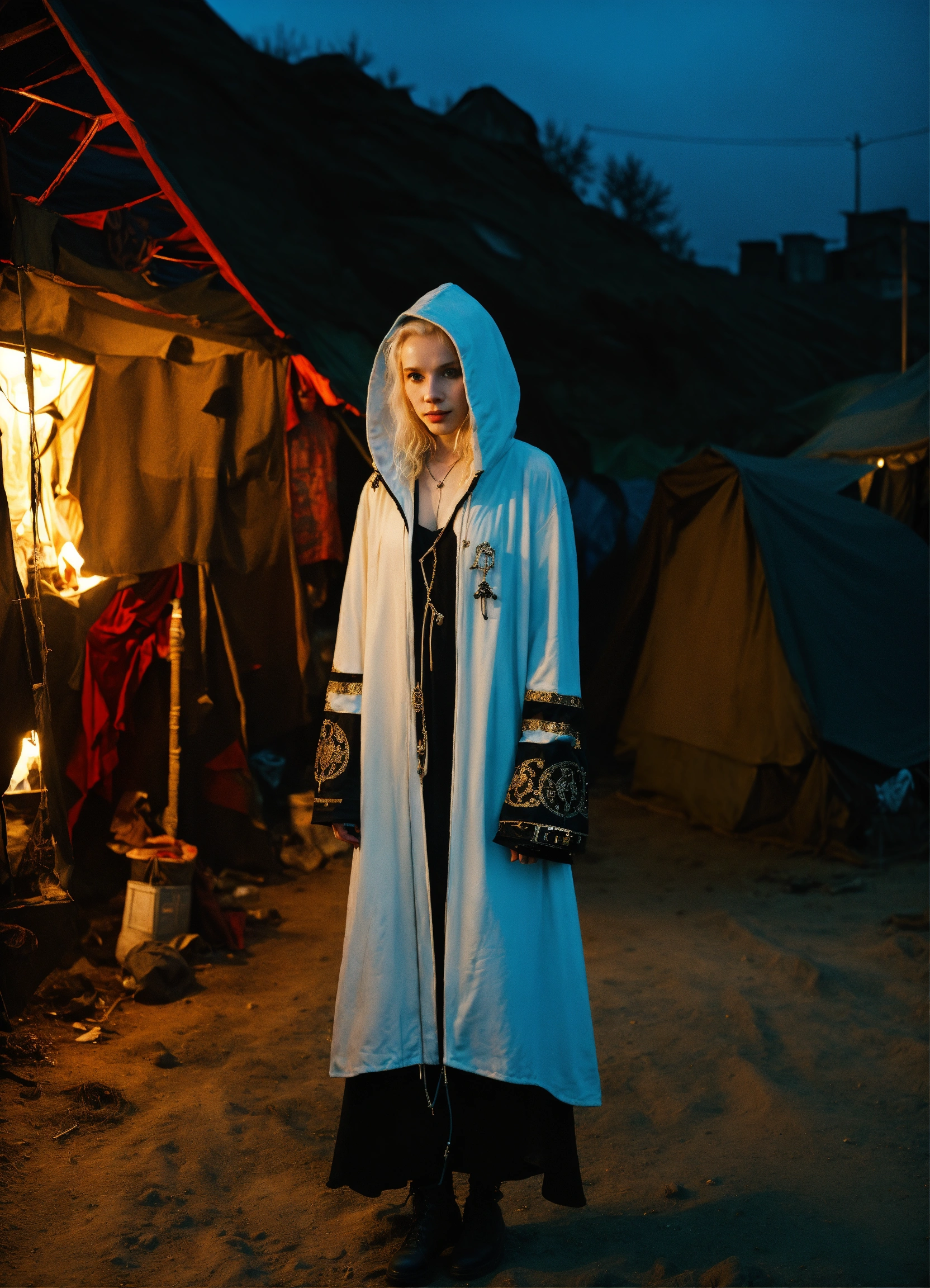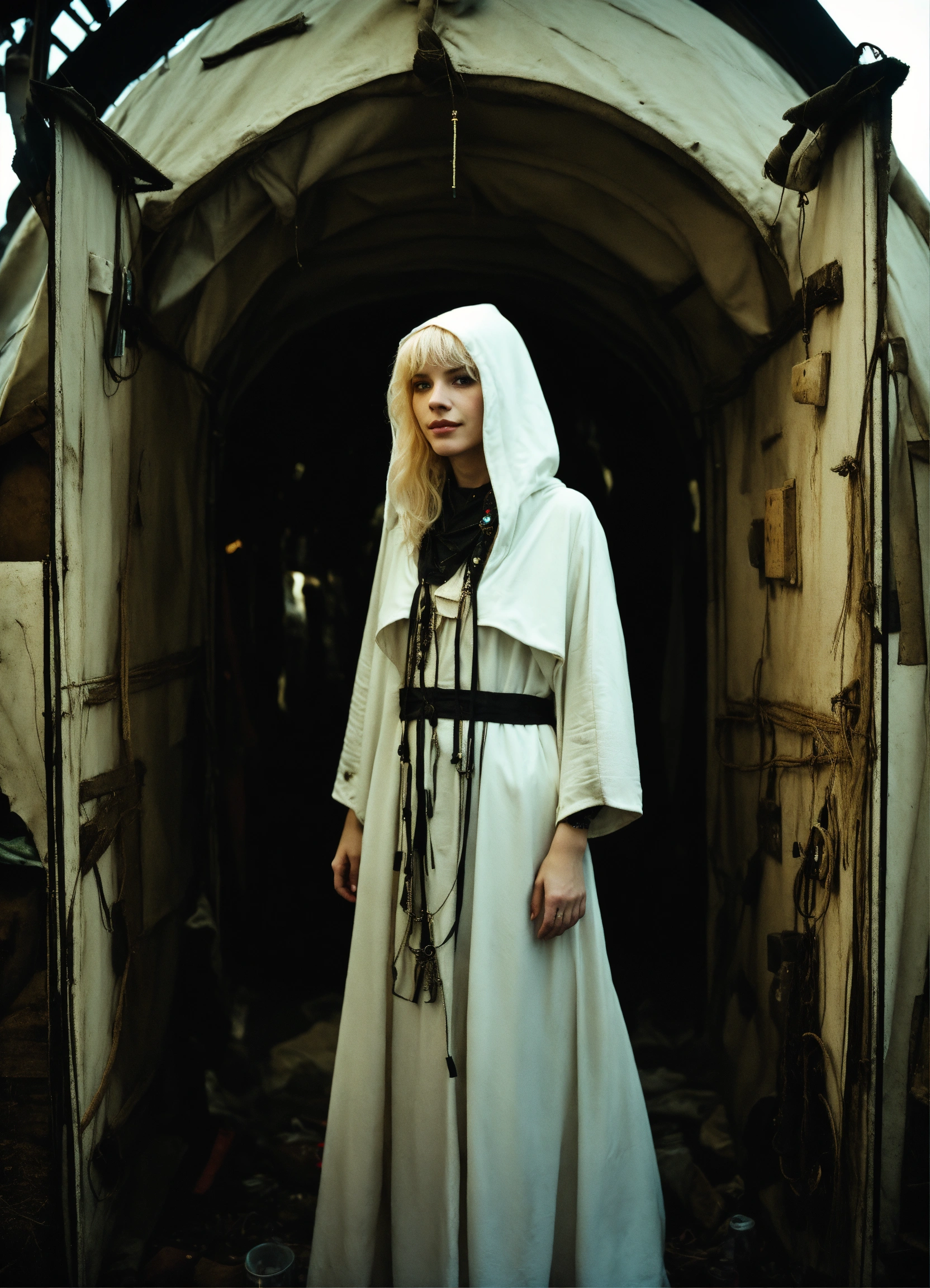 Pretty pale albino 19 year old cool mysterious hooded cyberpunk cult girl wearing a black ornate occultic cyber tech adorned robe in underground cyber shanty society town, dystopian, dark, low light, smirk, makeshift tents, underground village, her robe is black, movie still, wide angle shot directed by alejandro jodorowsky and tim burton and steven spielberg