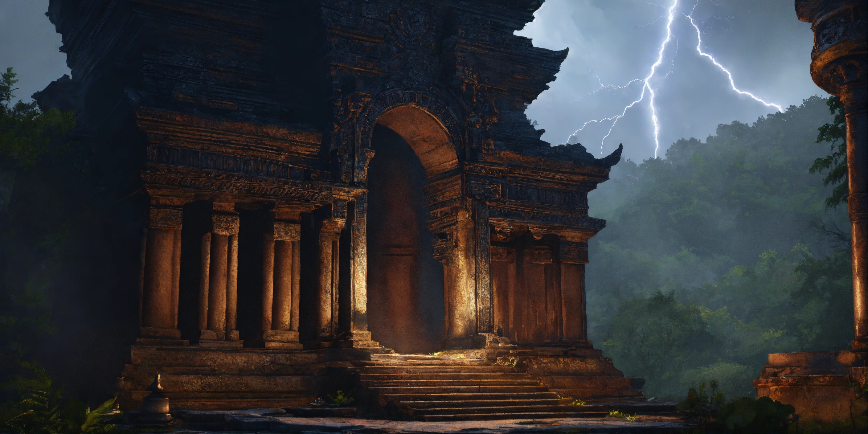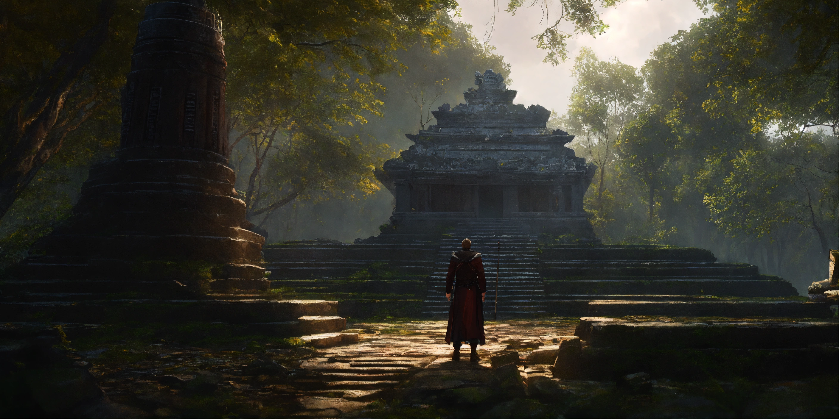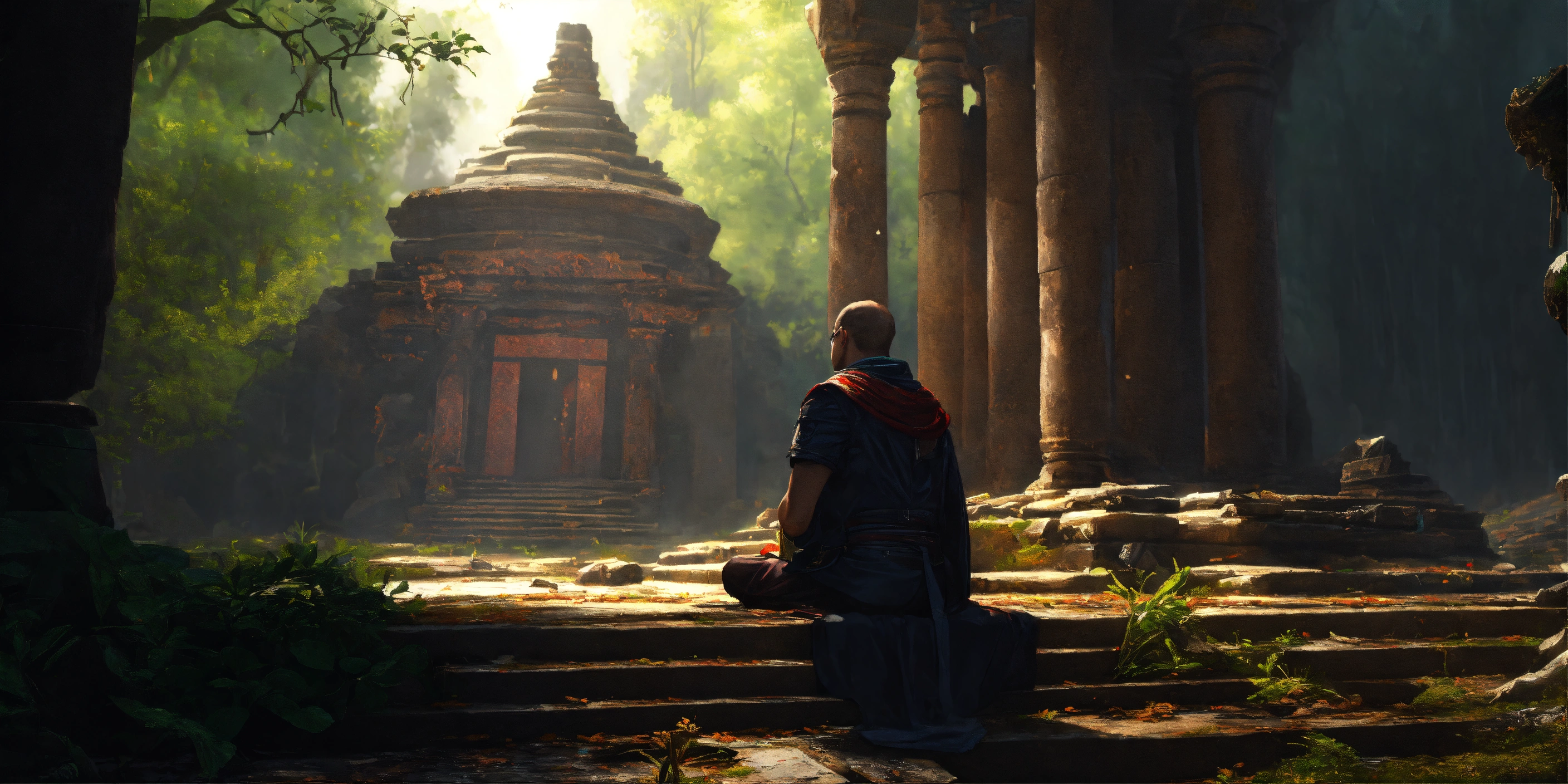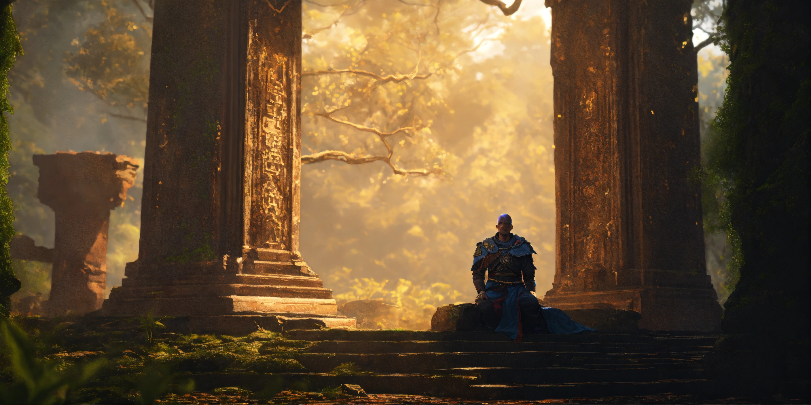Dark malgus, in a temple, ruins, forest, detailed, realistic paint, natural lightning, meditating, 8k, high details, hyperrealism