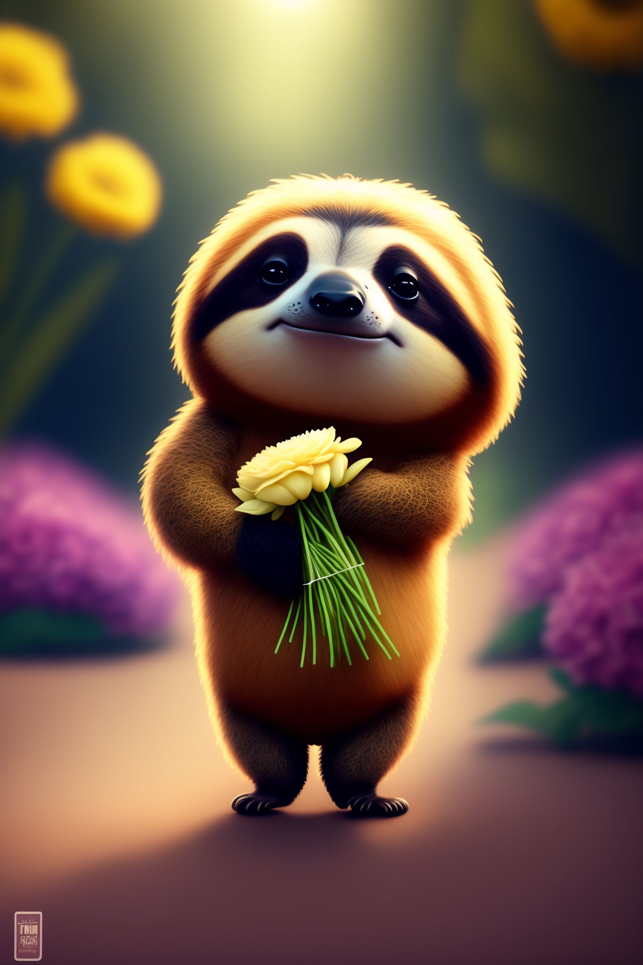 The cutest chibi sloth you'll ever see dancing wearing a 3 piece suit holding a bunch of flowers pixar style