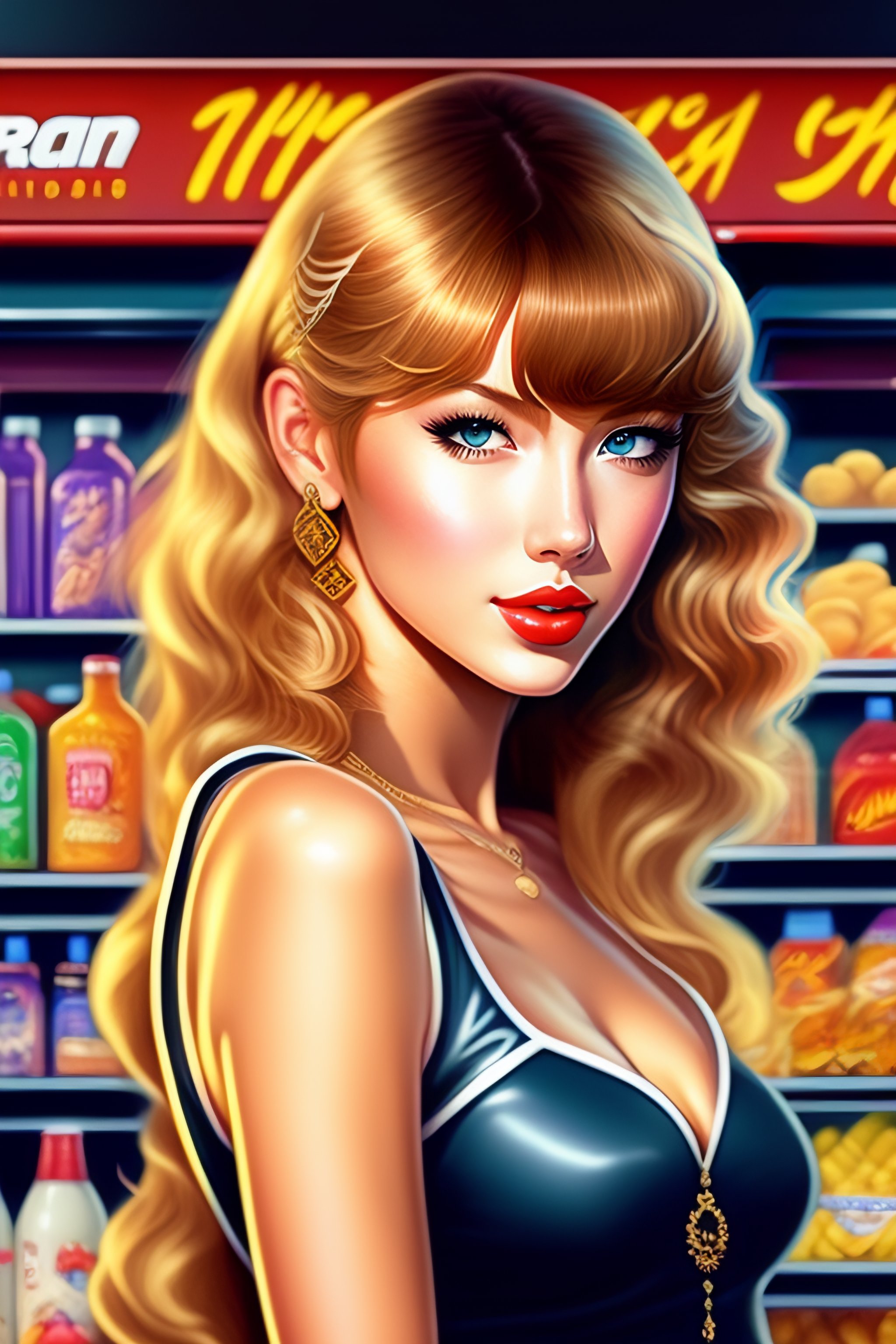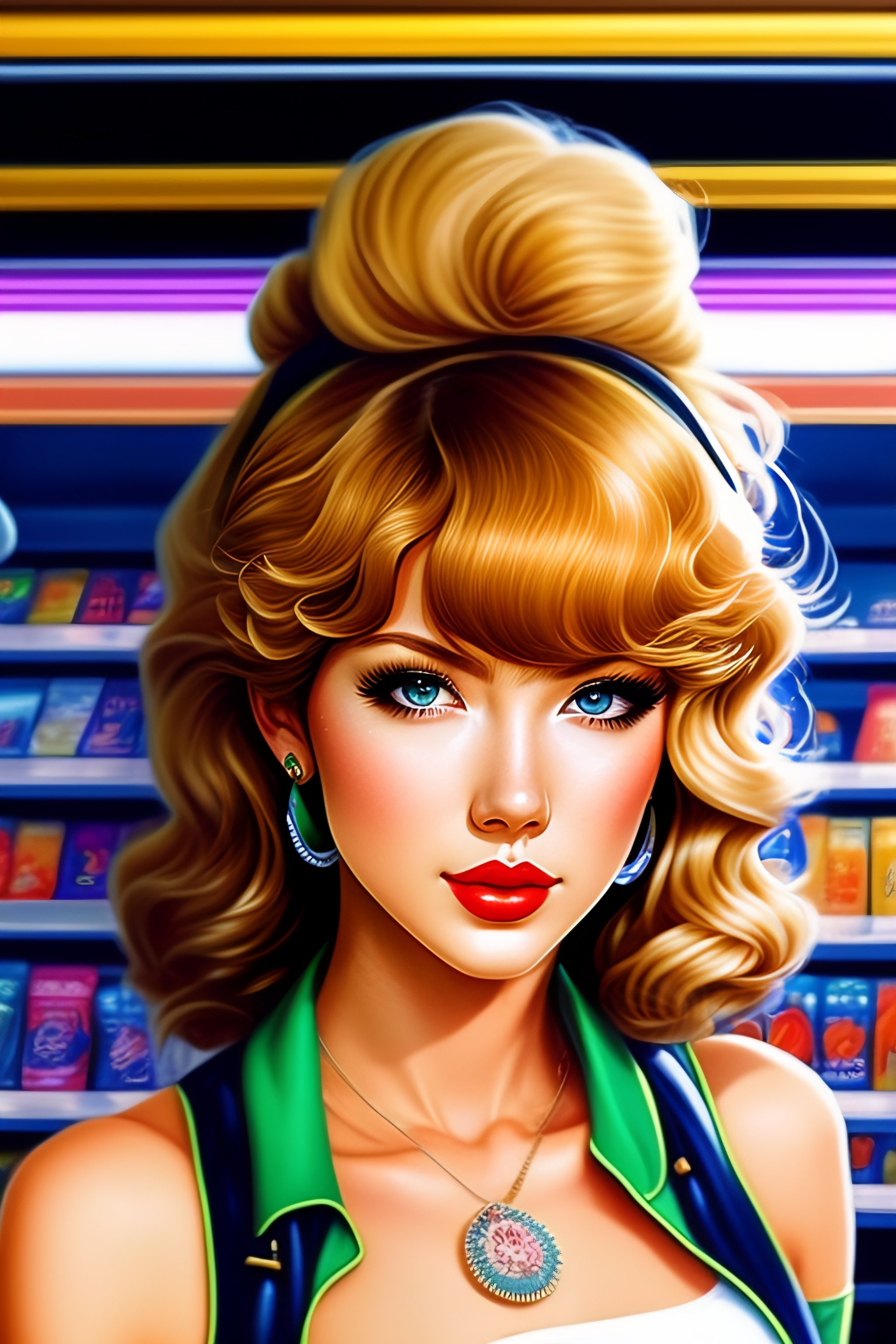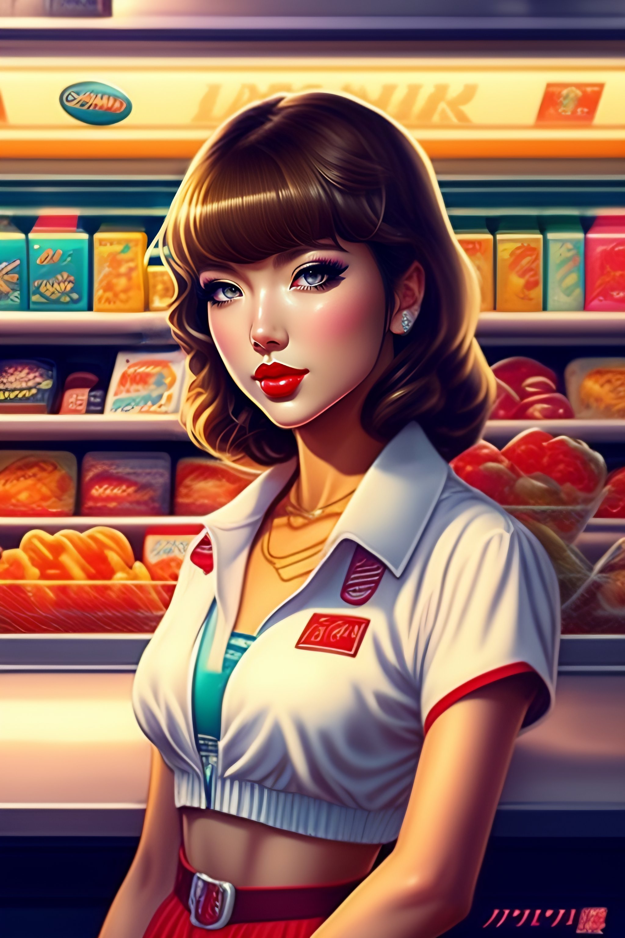 In the style of 90's vintage, anime art of taylor swift inside a convenience store, detailed art, fine illustration
