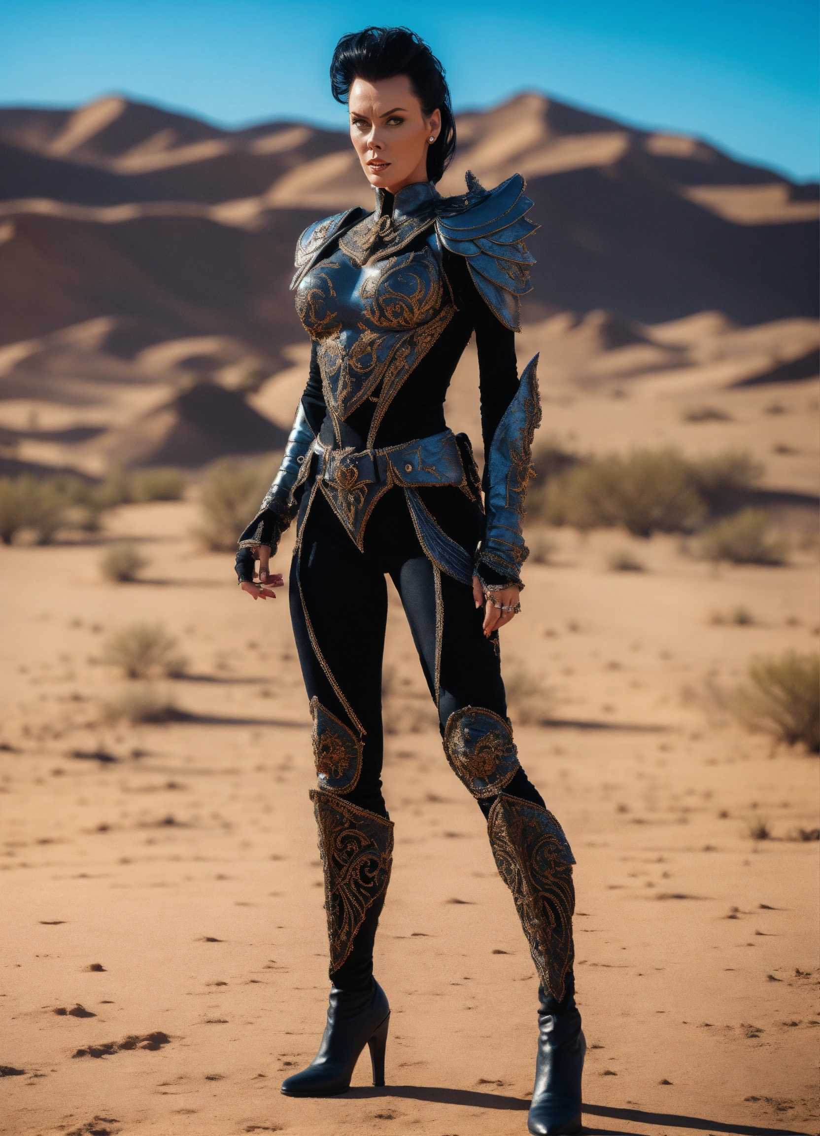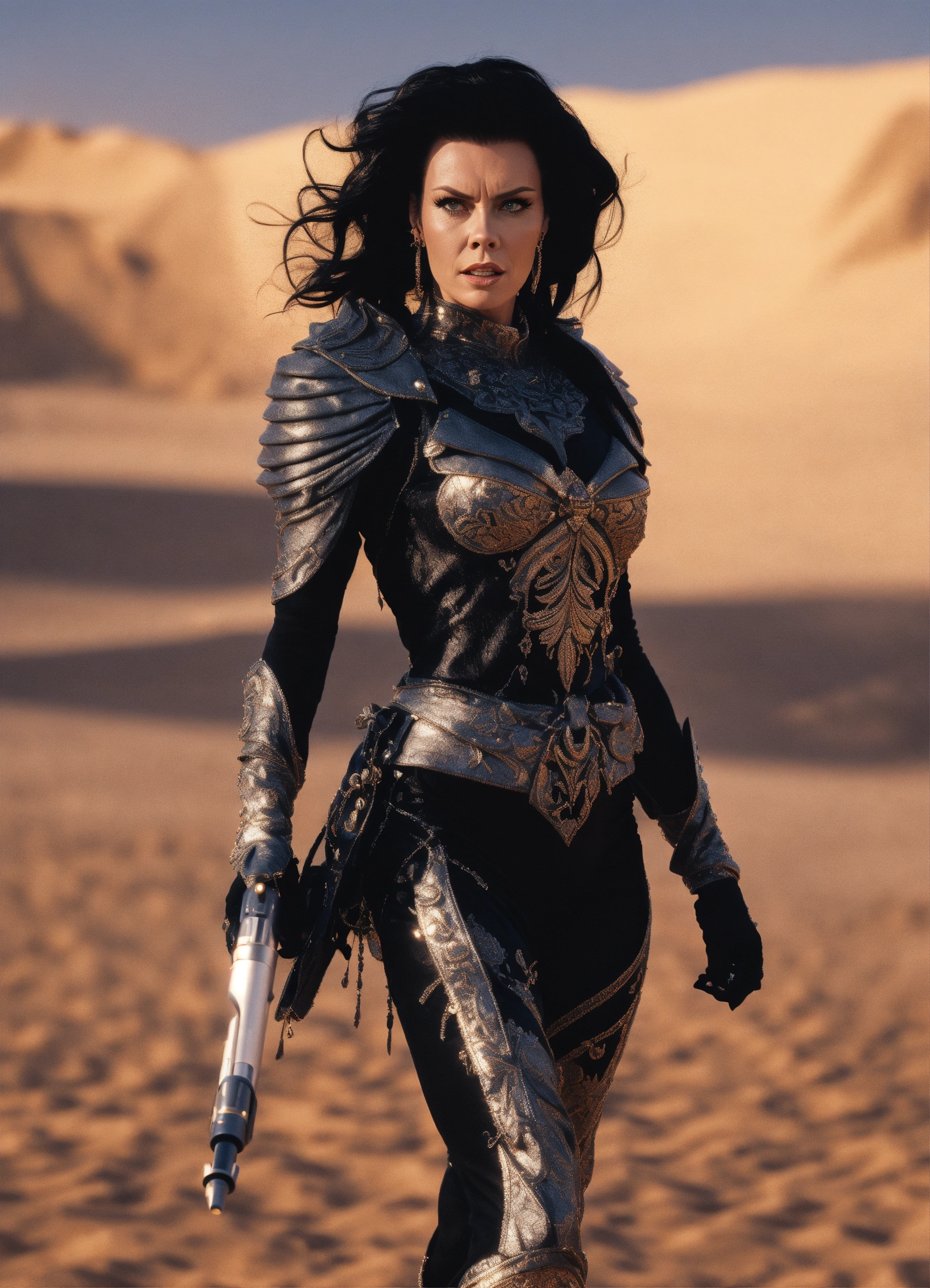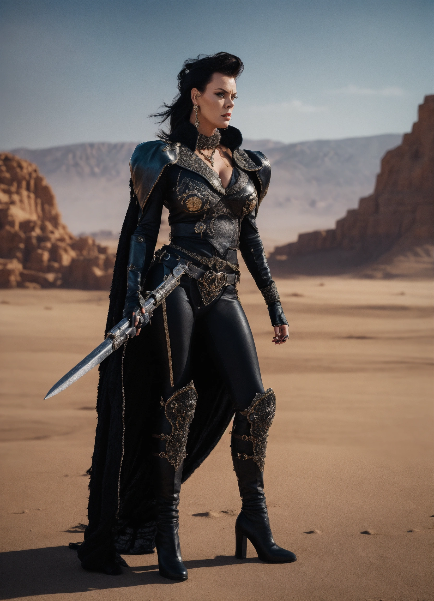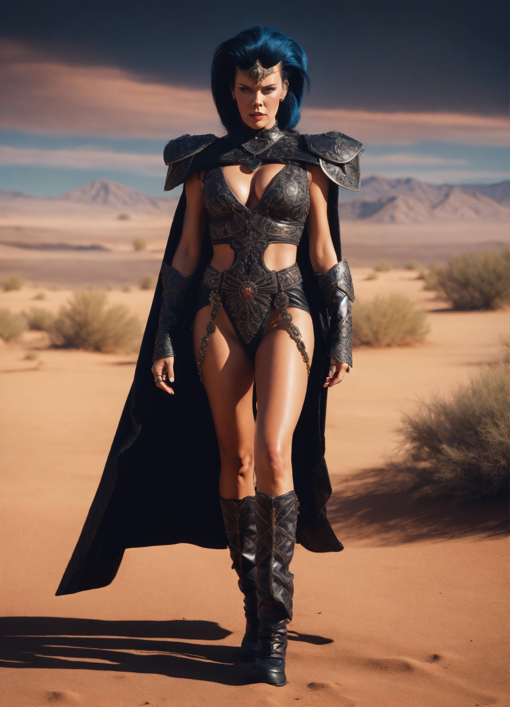 Young evil brigitte nielsen, black hair dressed like evil-lyn of masters of the universe, full body, dark suite, camera look, walking in a desert, 8k resolution, photorealistic, hard light photo, hyper detailed, intricately detailed