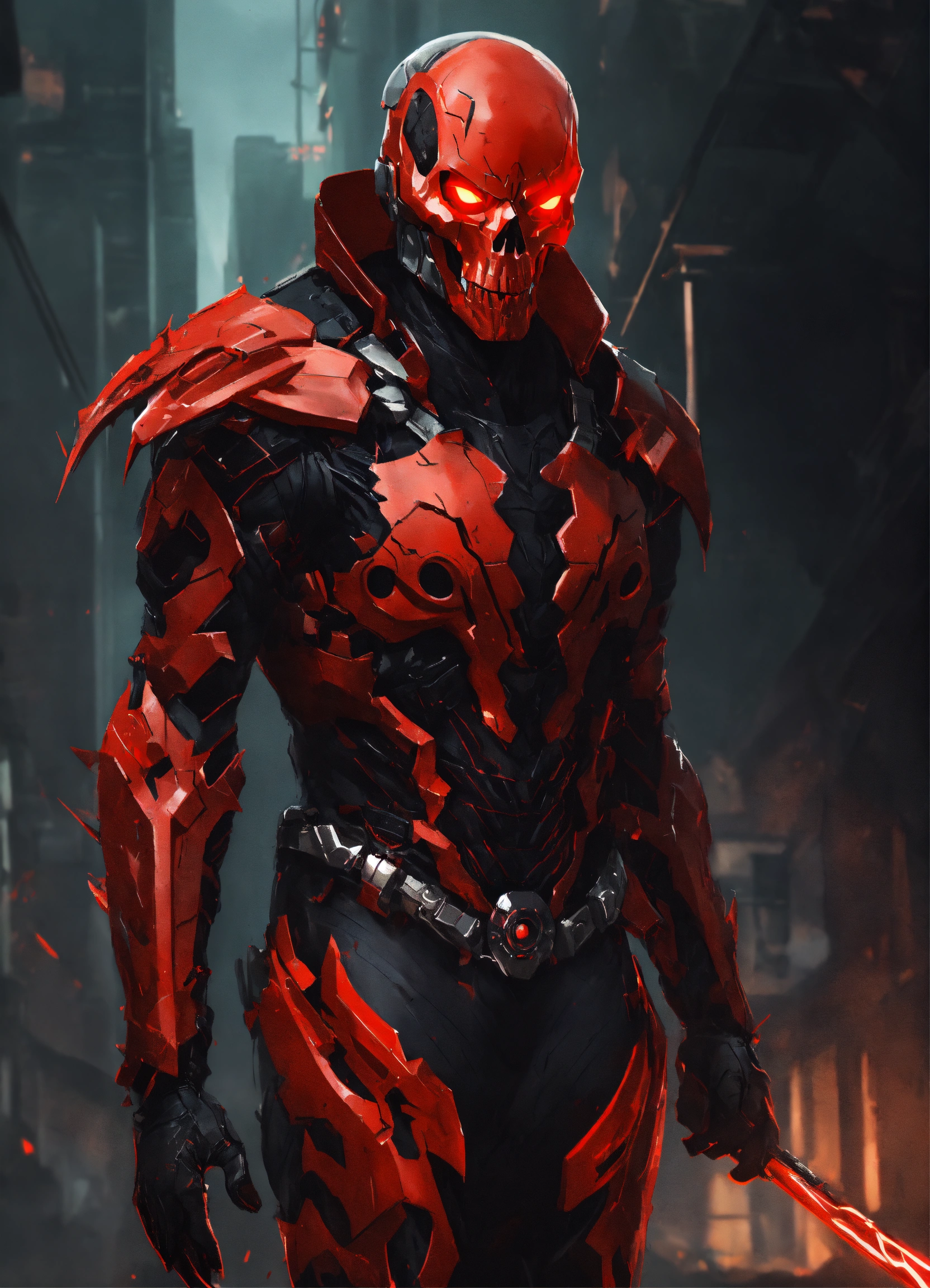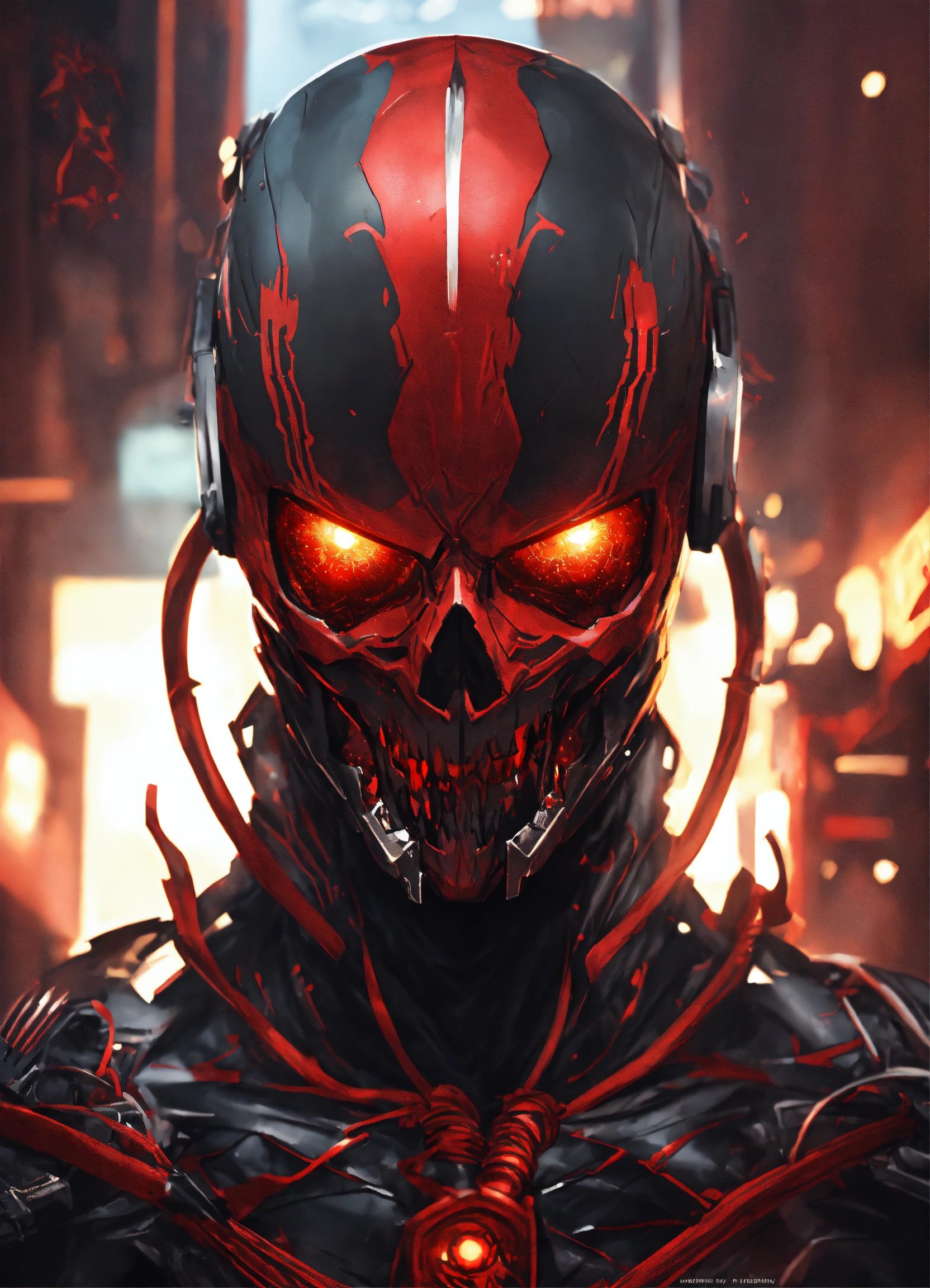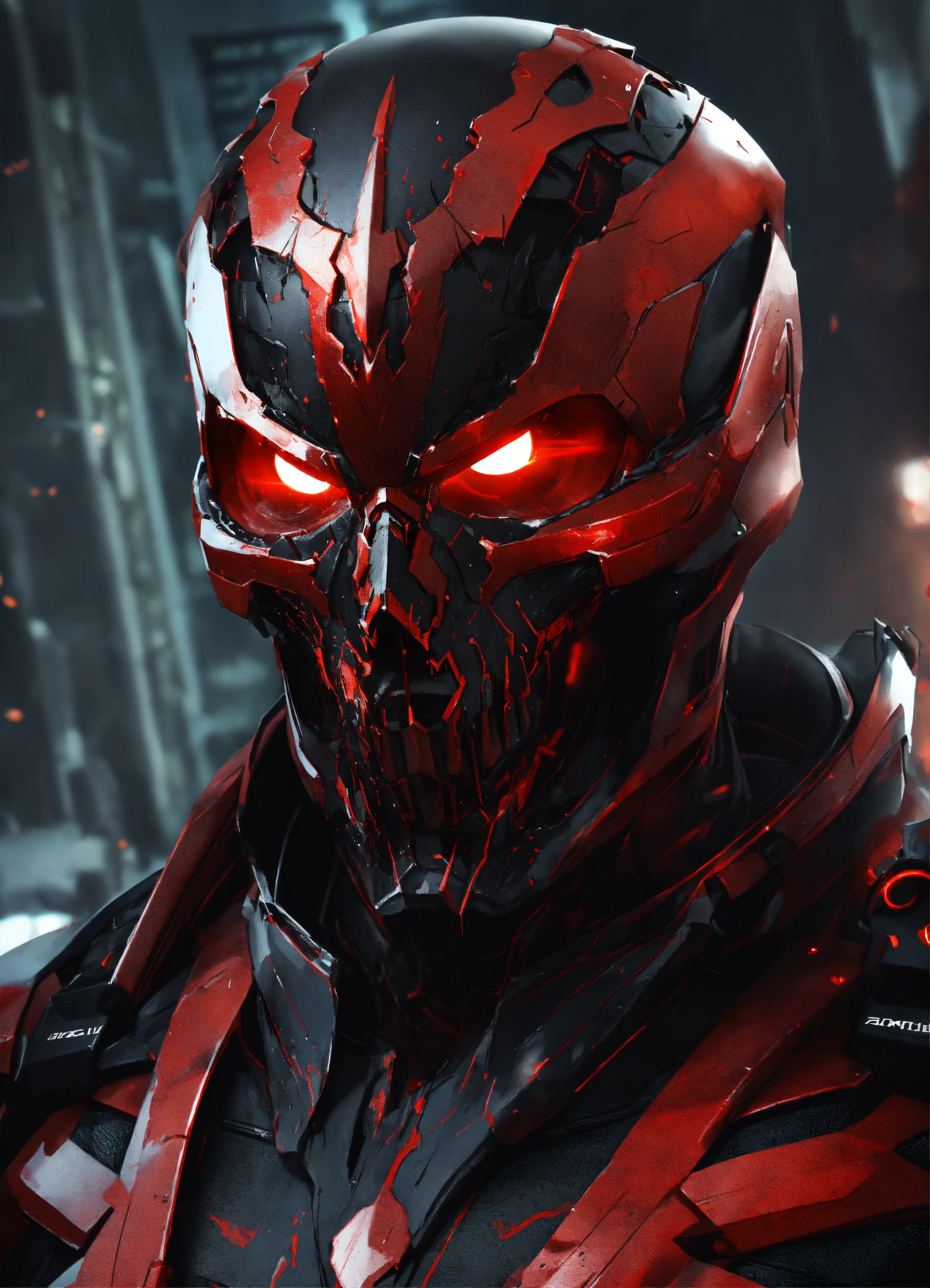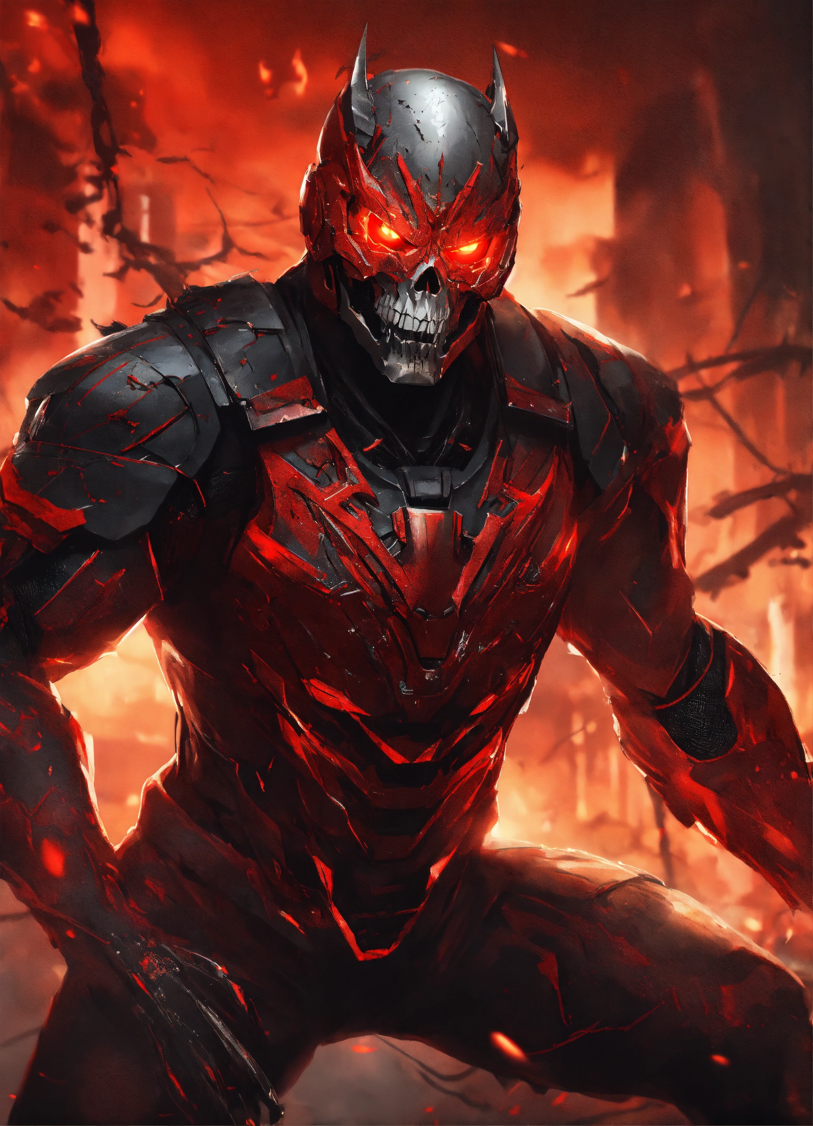Realistic style illustration, digital, cataclysmic carnage's costume is a blend of menacing aesthetics and engineering influence. he wears a black and red, reinforced exoskeleton that enhances his strength and durability. the suit is adorned with sharp, jagged edges and industrial design elements, reflecting his destructive nature. his face is obscured by a metallic, skull-like mask with glowing red eyes, instilling fear in anyone who gazes upon him. --ar 73 --v5.2