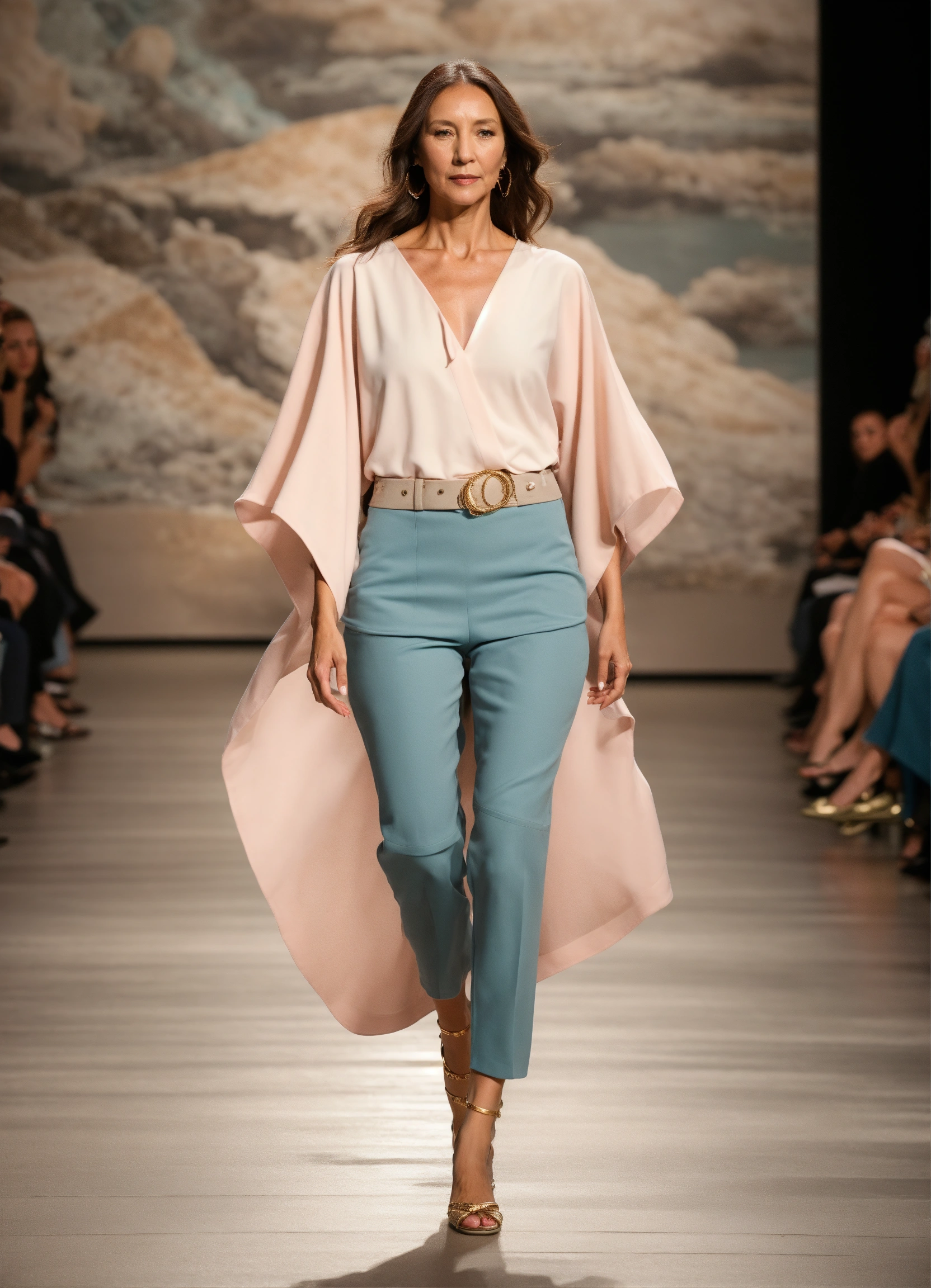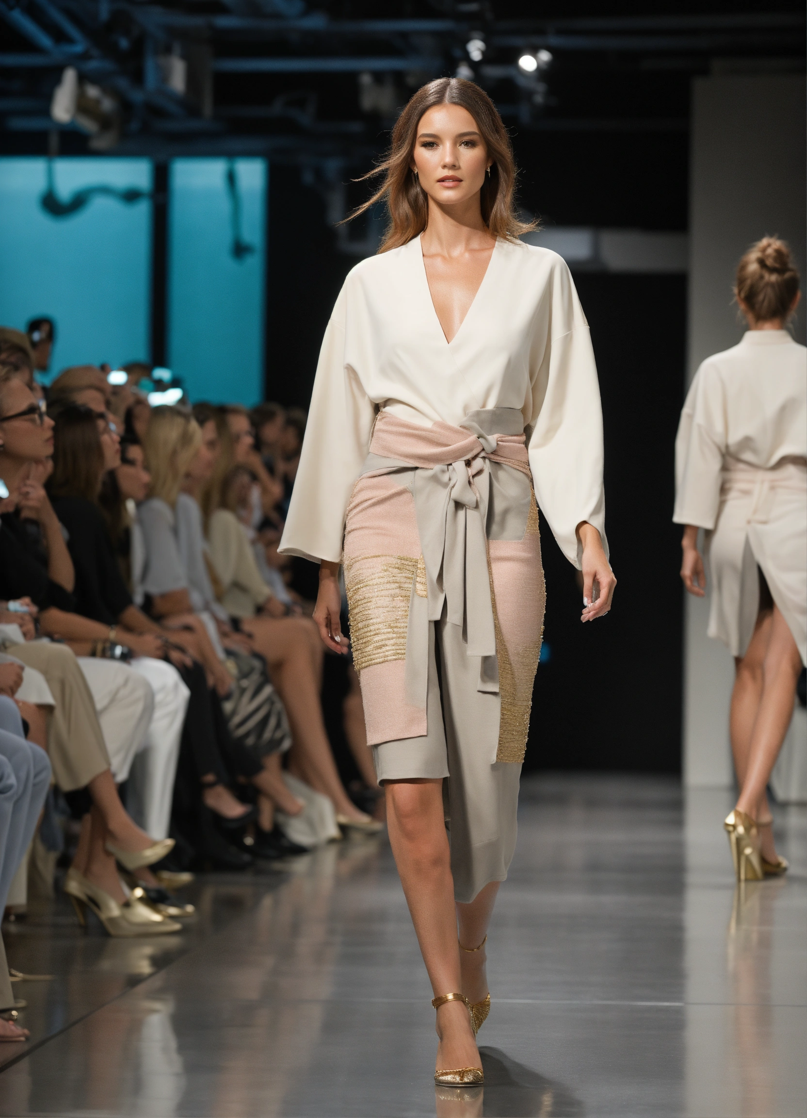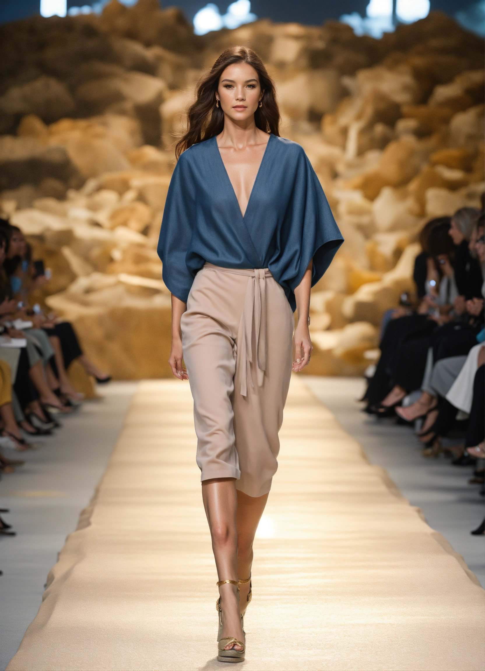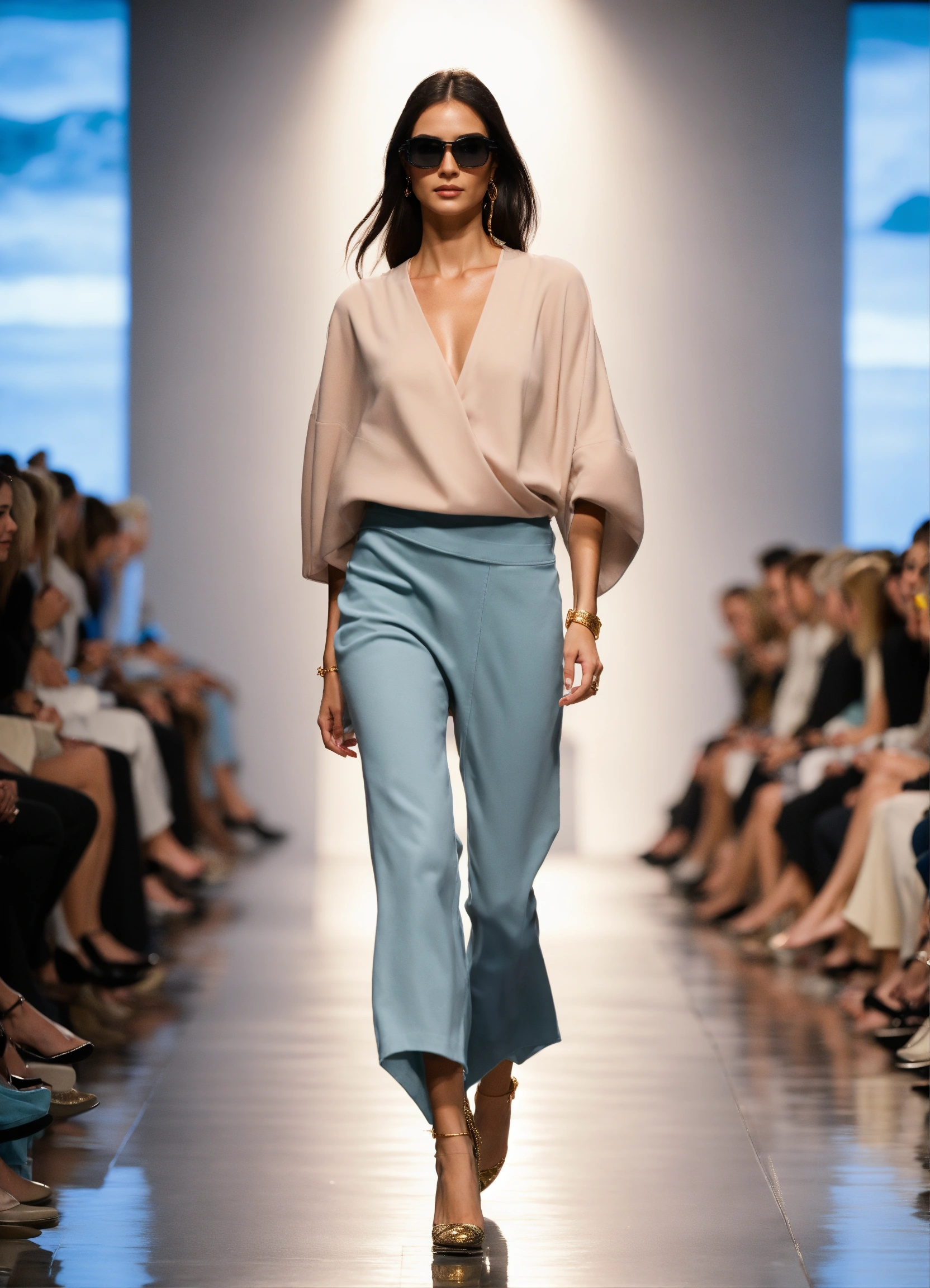 3d realistic photo of female oceanographer walking runway during marine fashion week wearing dolman sleeve donna karan oceanographers fashion in black, white, blush, grey, beige, stone, gold, denim, blue, teal walking a runway in a marine lab