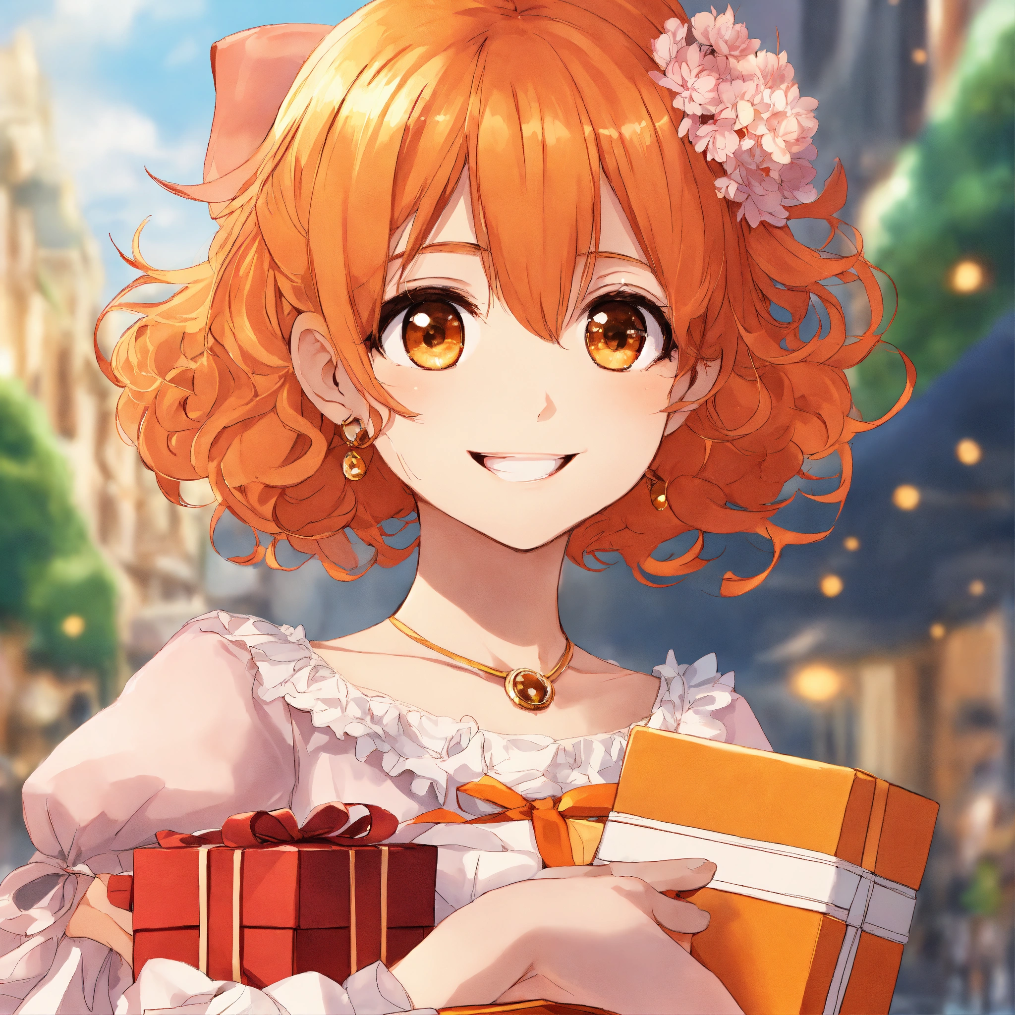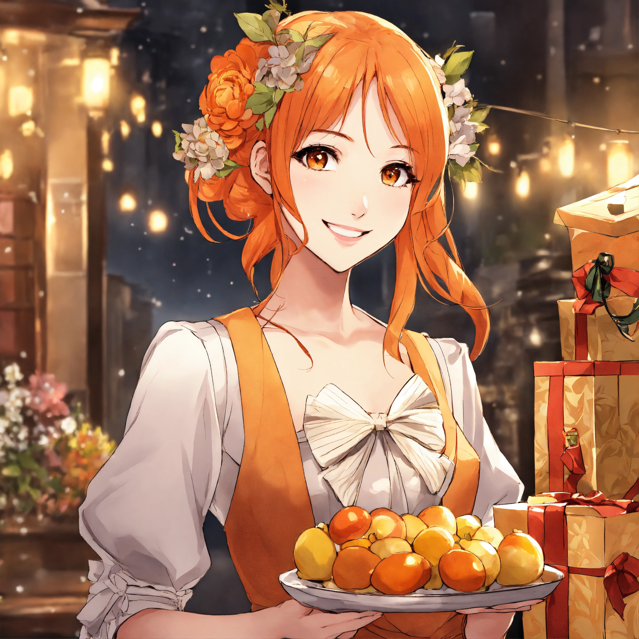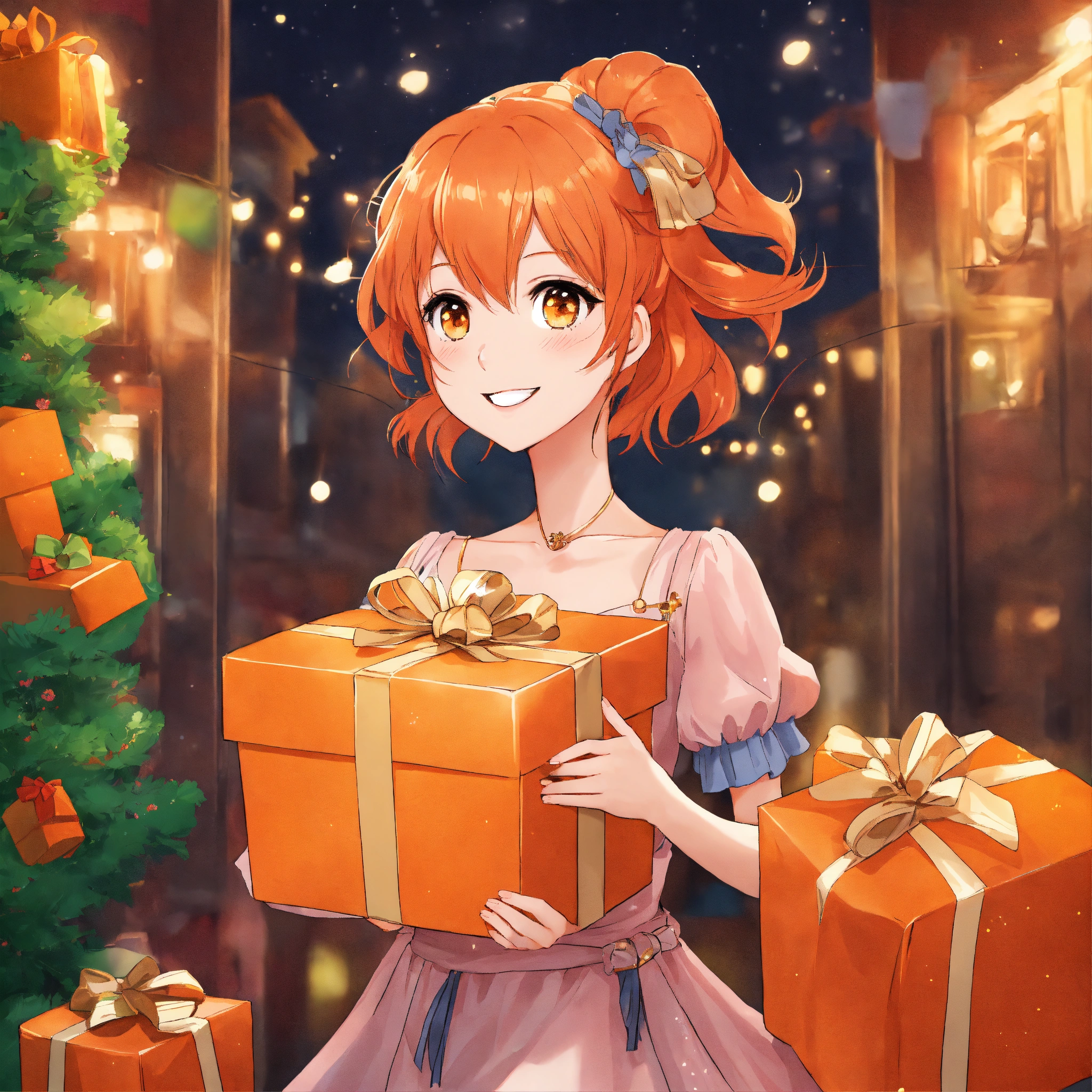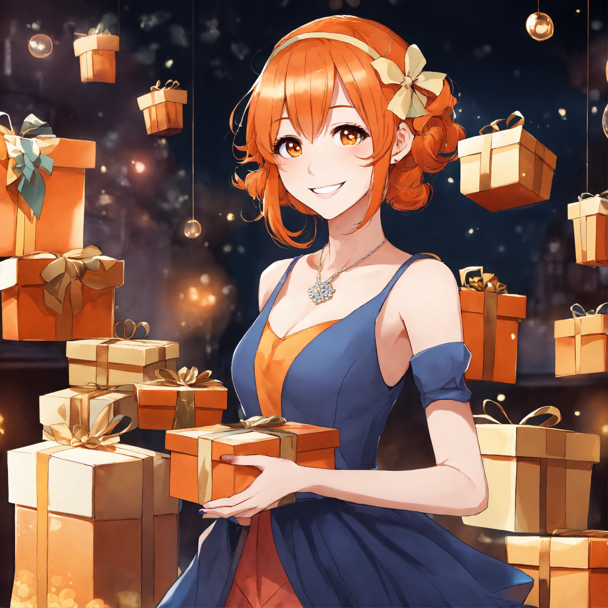 Create a manga version of a girl, very smiling, in an elegant dress and with orange hair, who appears carrying many gifts