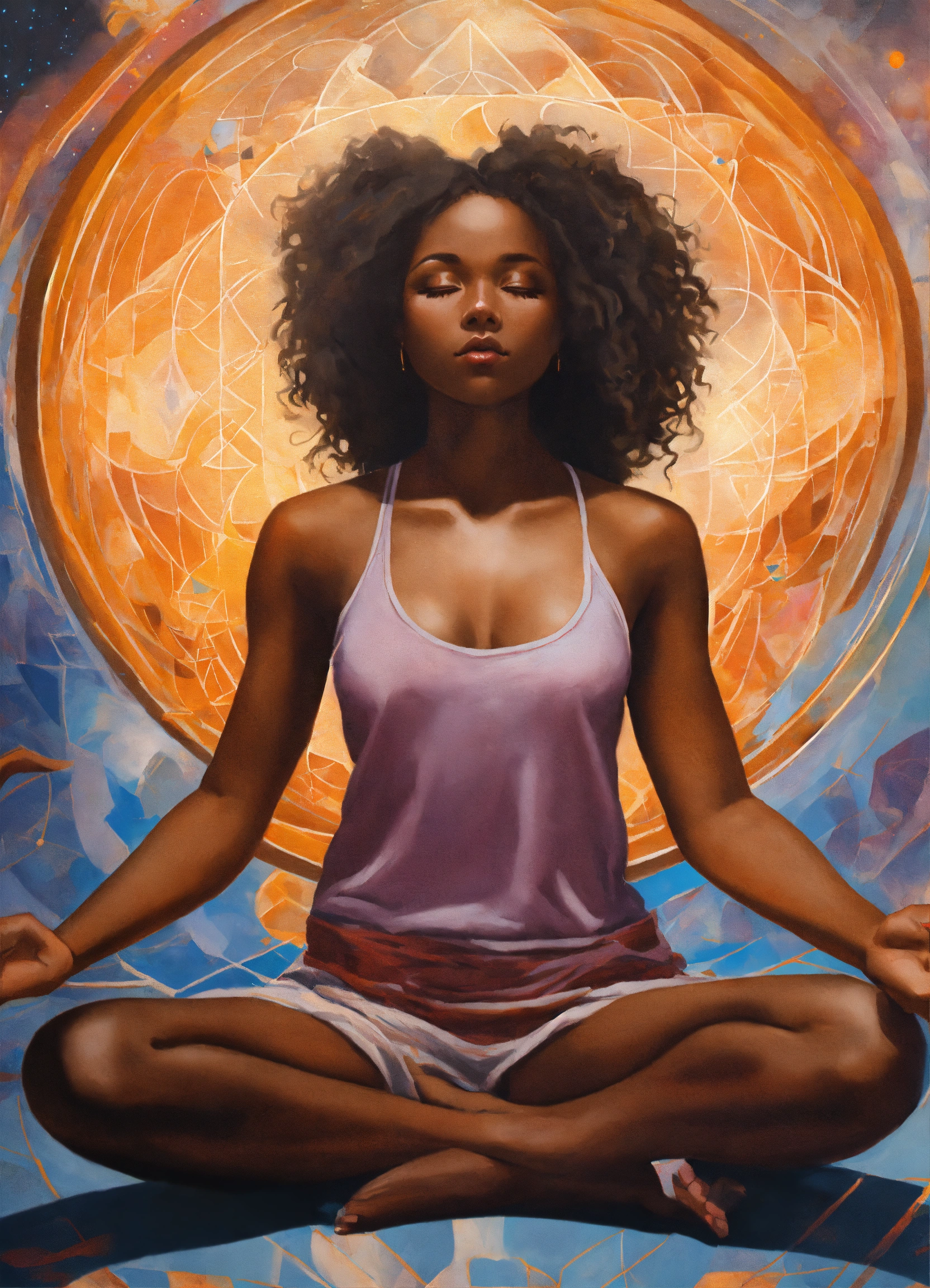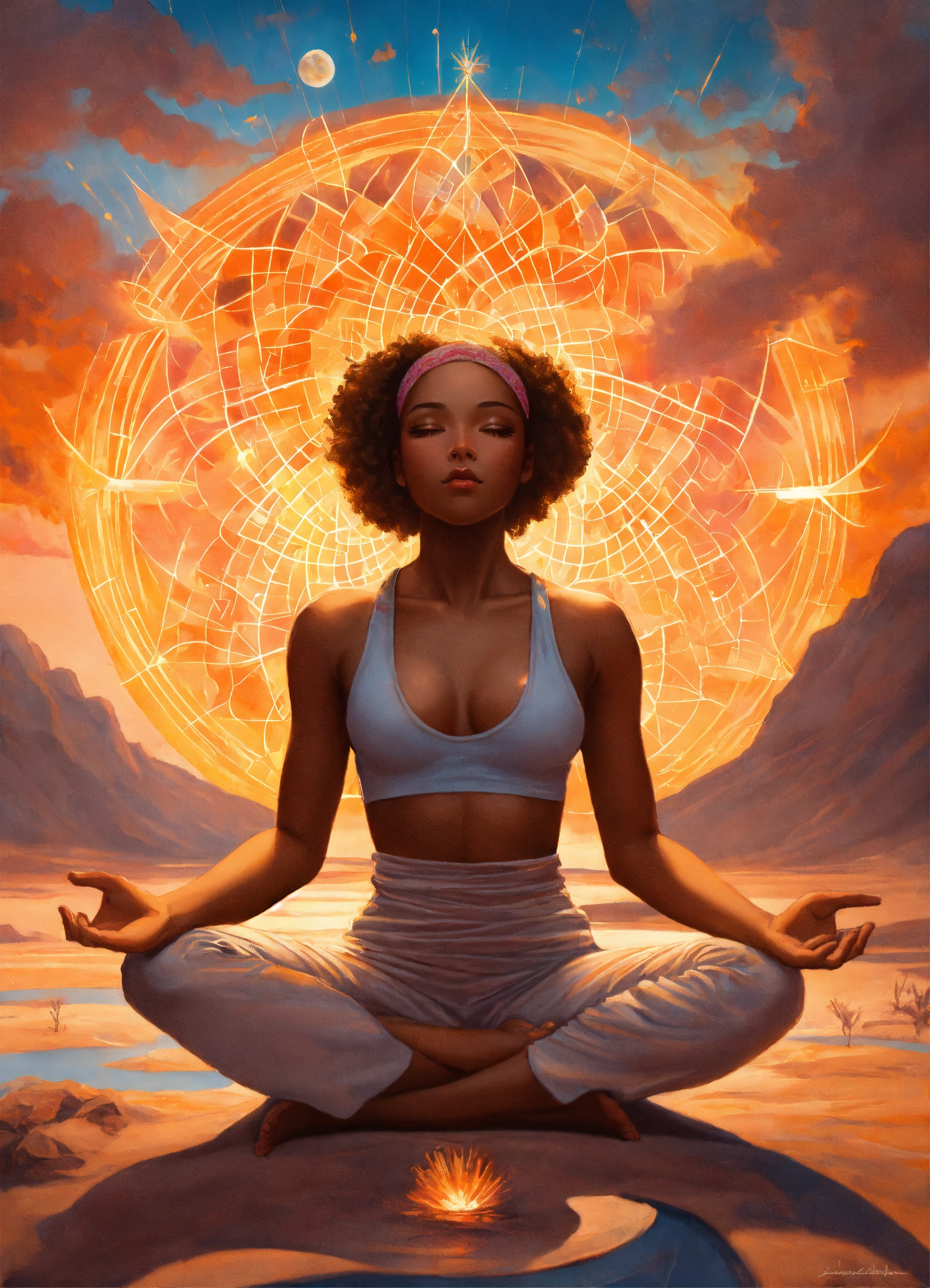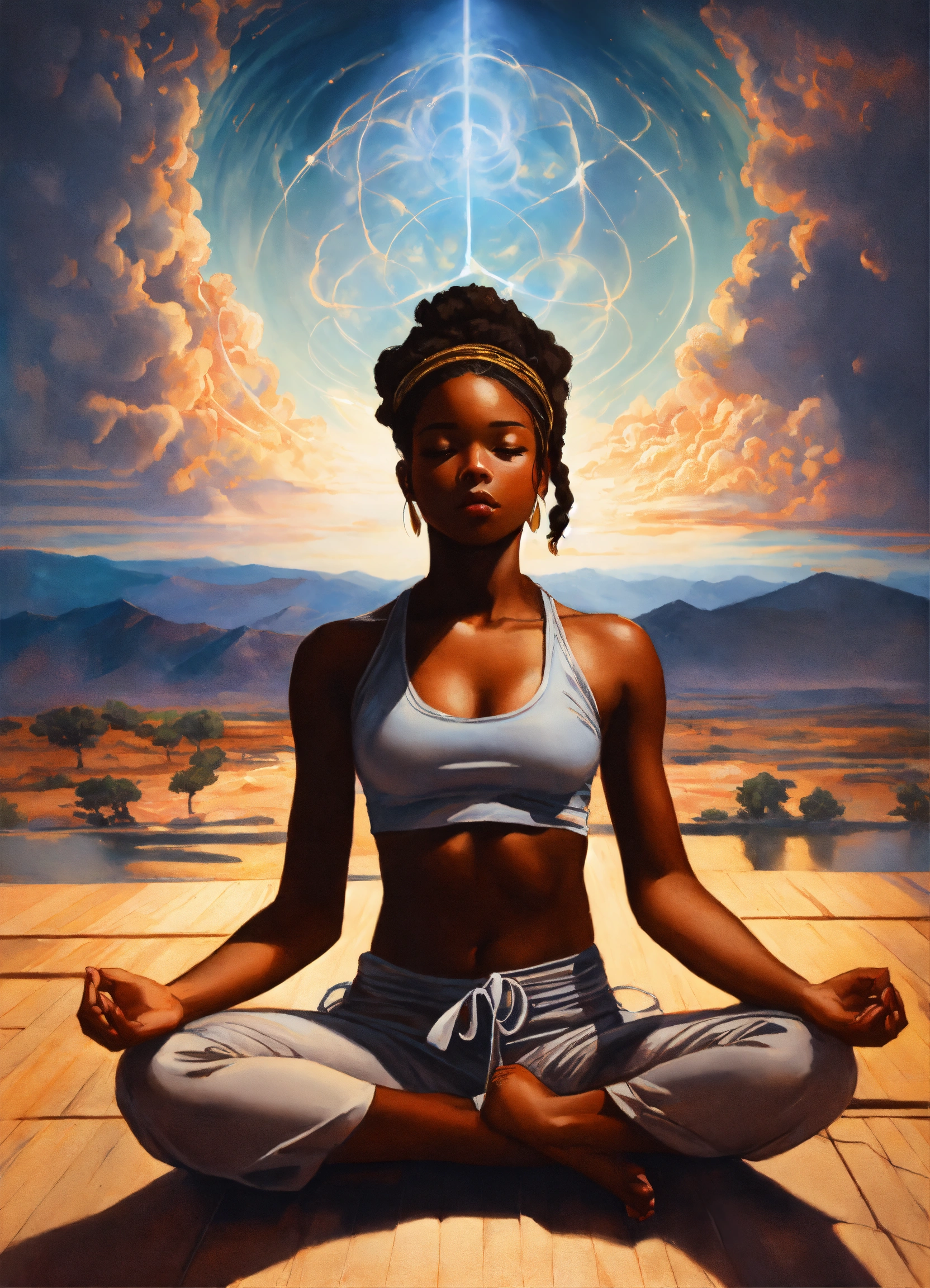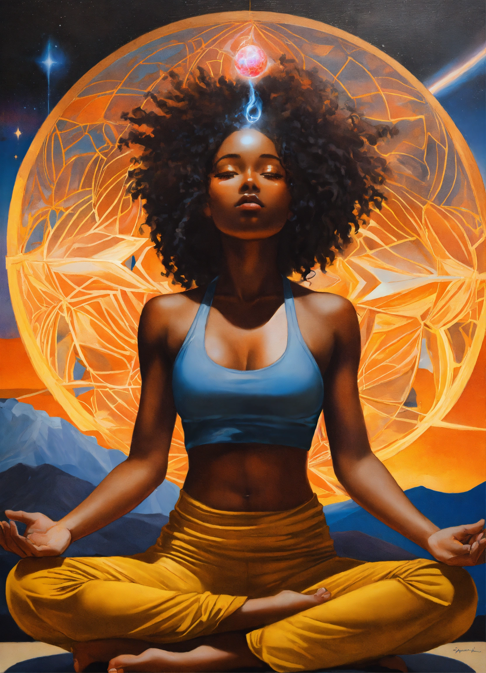 A young melanated yoga practitioner sits alone in nature, practicing kundalini yoga, seeking to invoke an altered state of consciousness, with each inhale of her breath, she transforms her reality into a supernova of creative energy, with each exhale she releases all her fears and doubts, in the painting styles of james bullough, wlop, jon foster, zack snyder, high detail.
