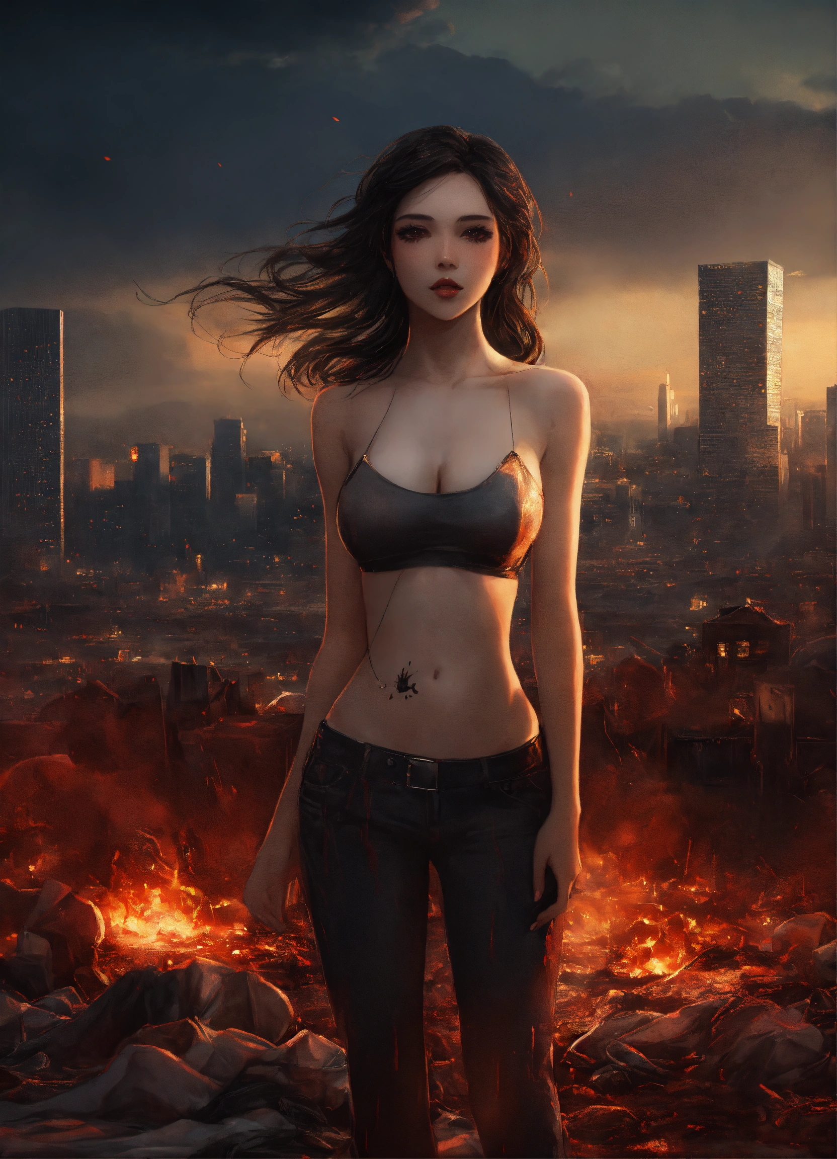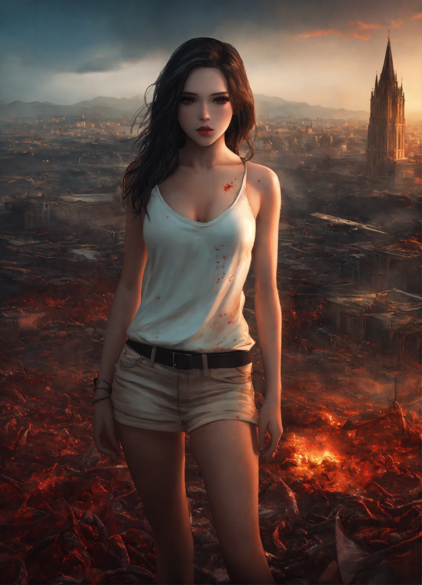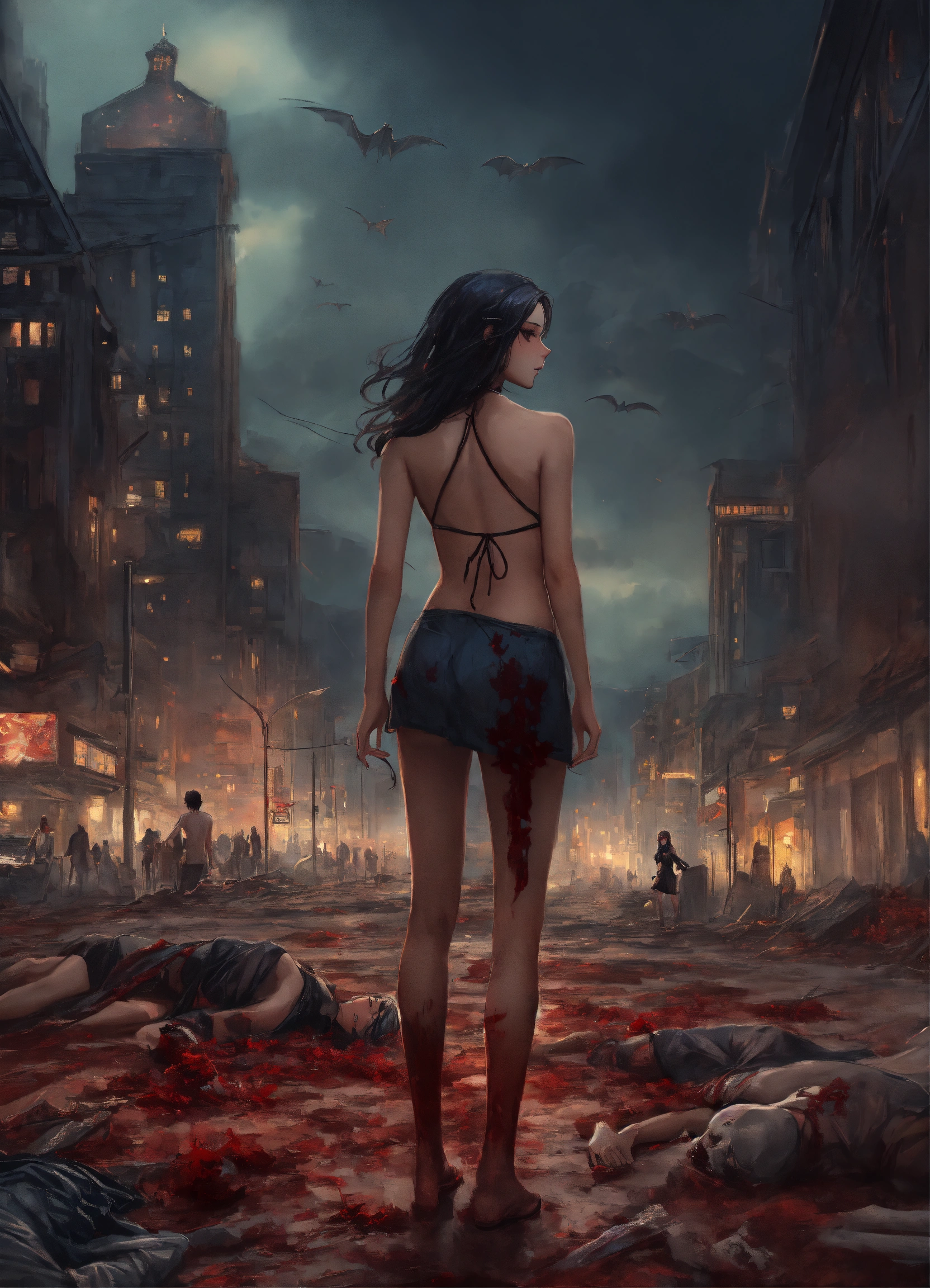 A beautiful young woman who is also a demon, barely wearing any clothes, a city behind her, dead bodies all over the ground.