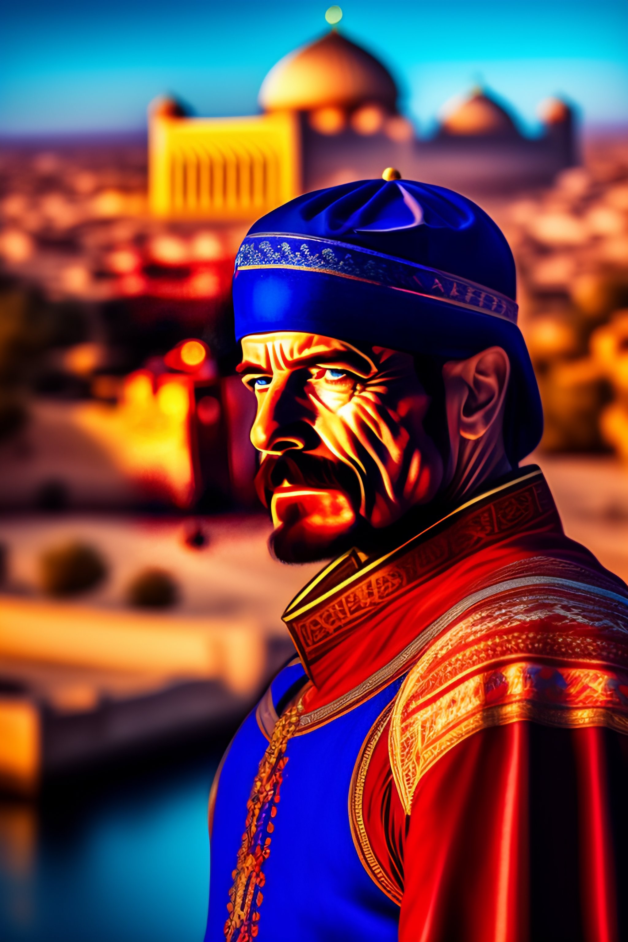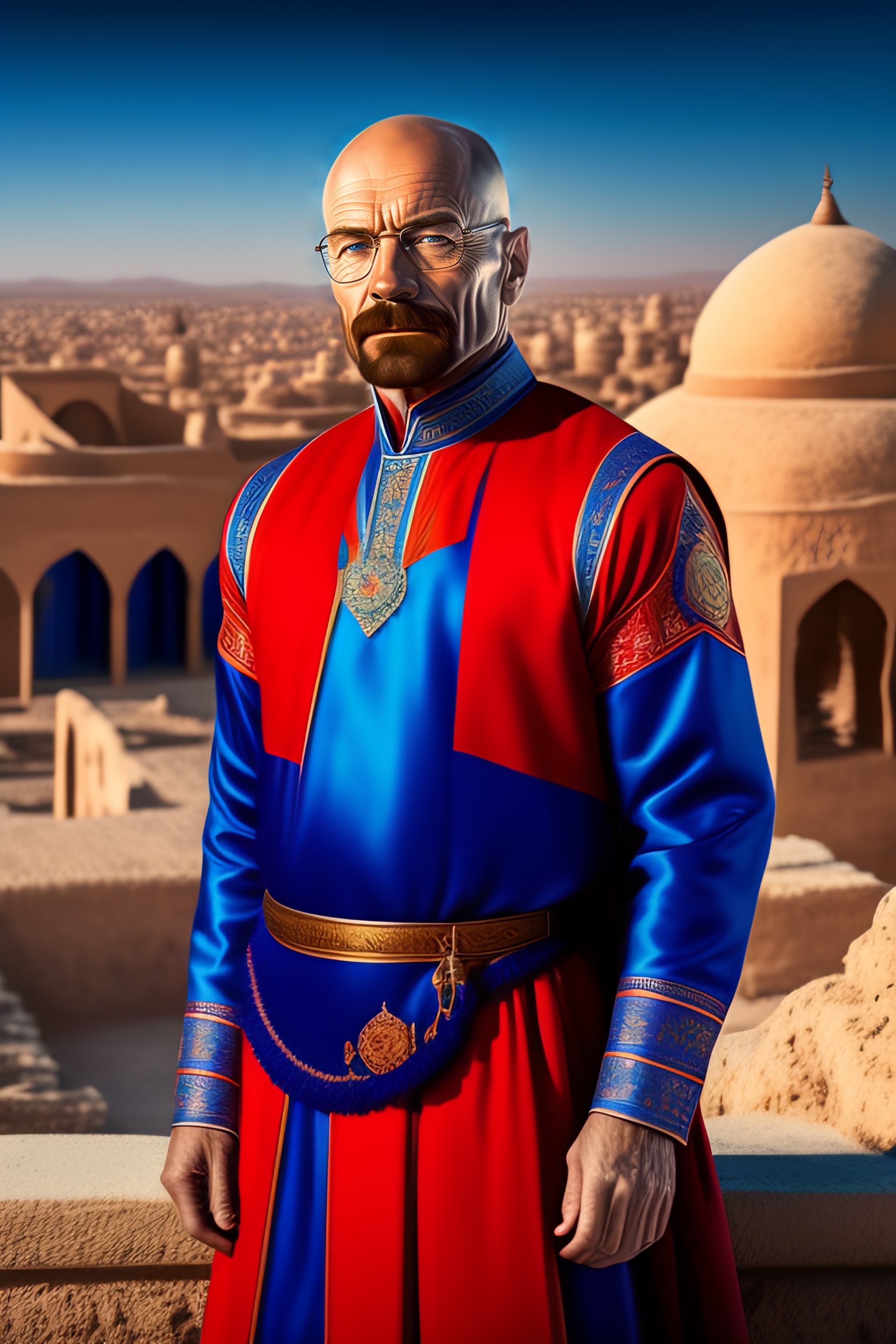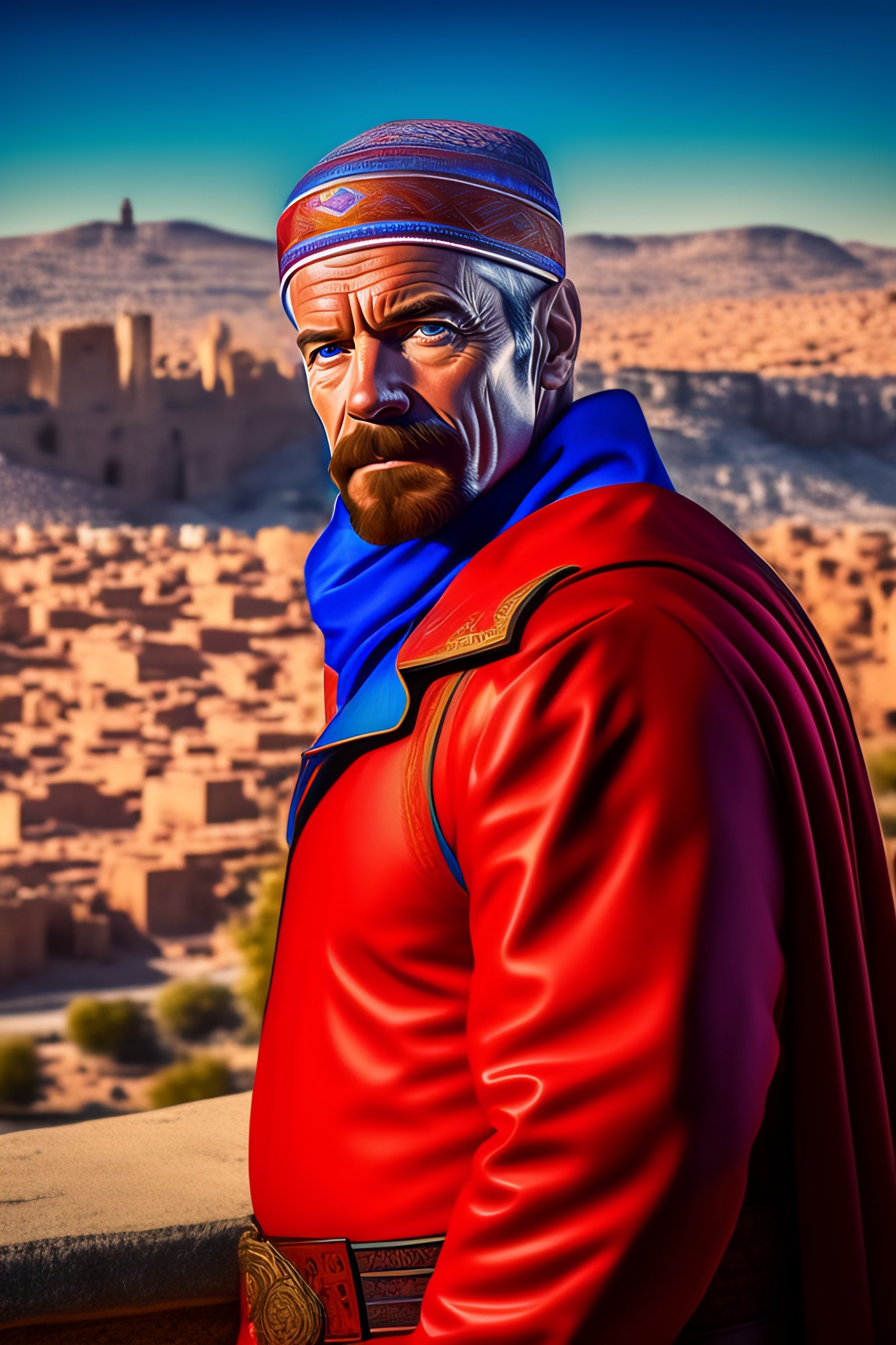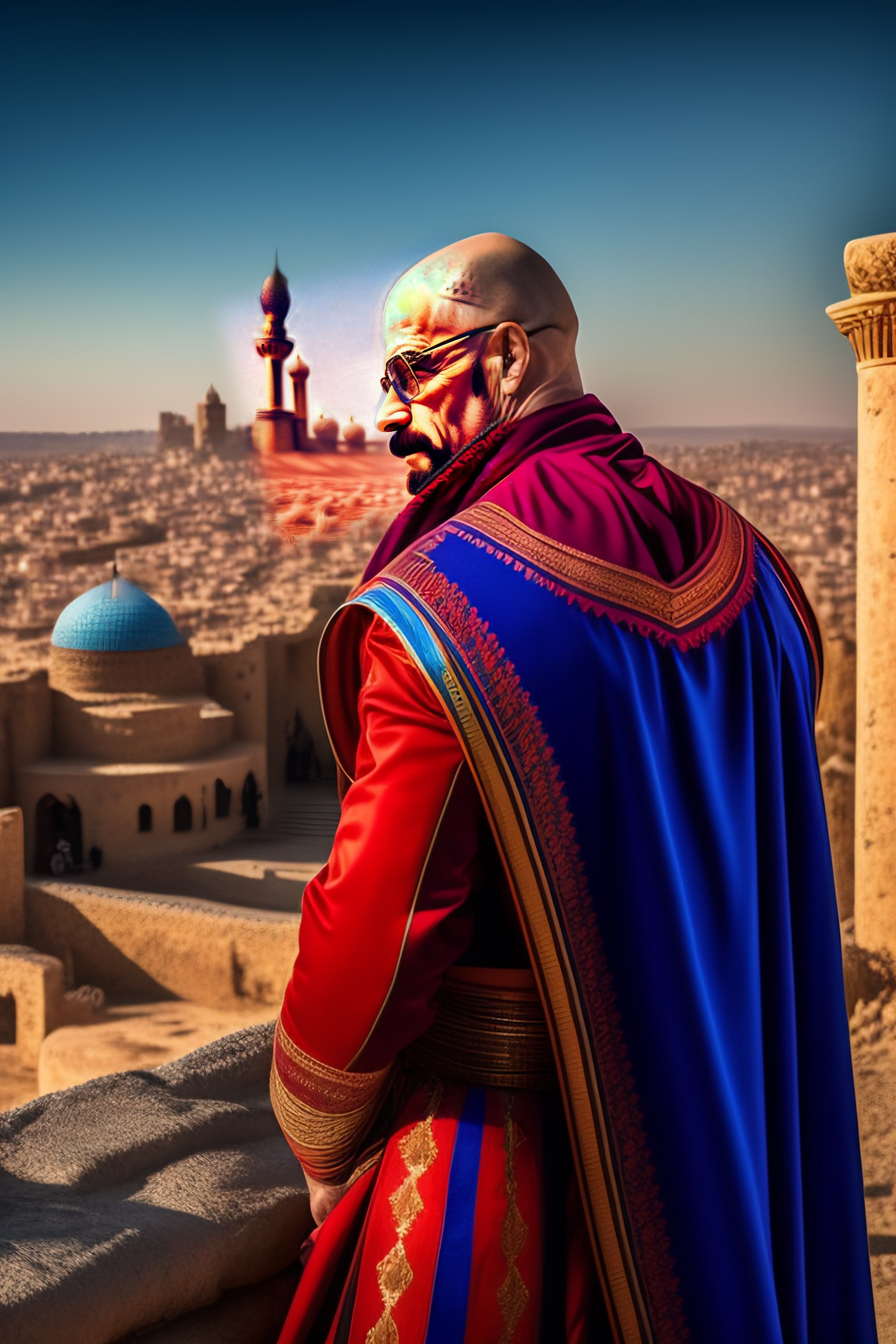 Walter white, the incrdilles style, high detail, high resolution, red and blue color mode, tradiyional arabic costume, old damascuse city in the background
