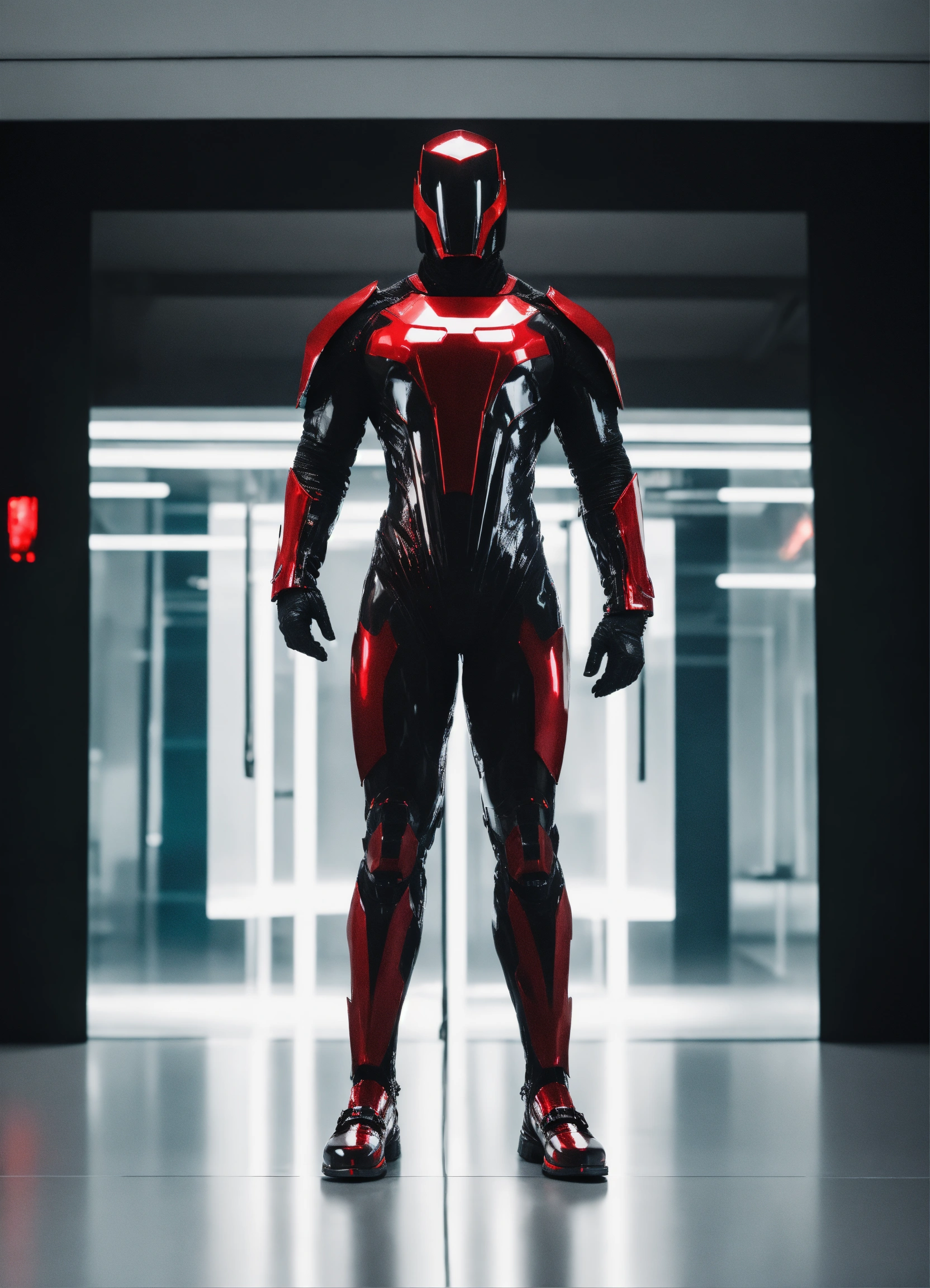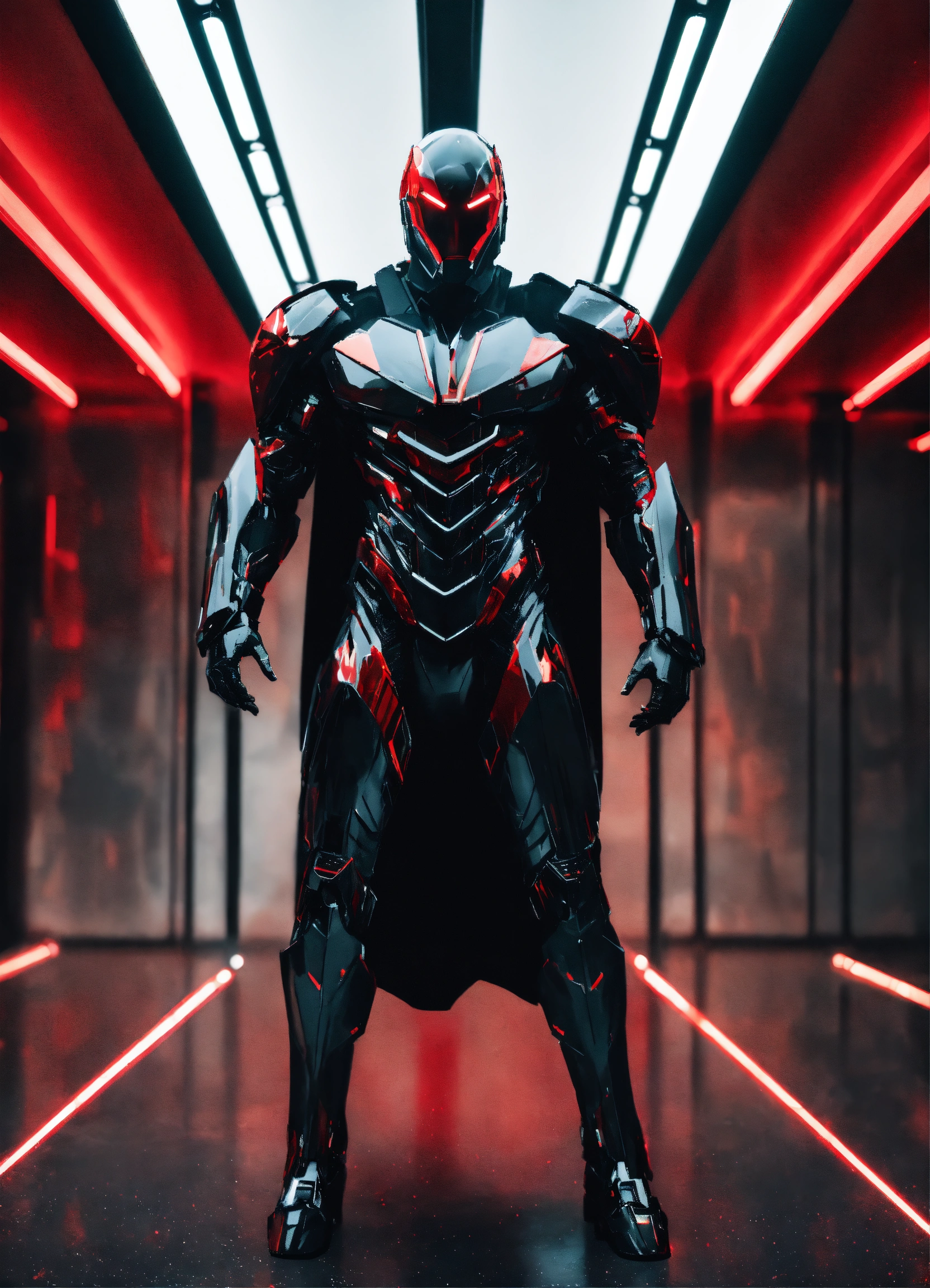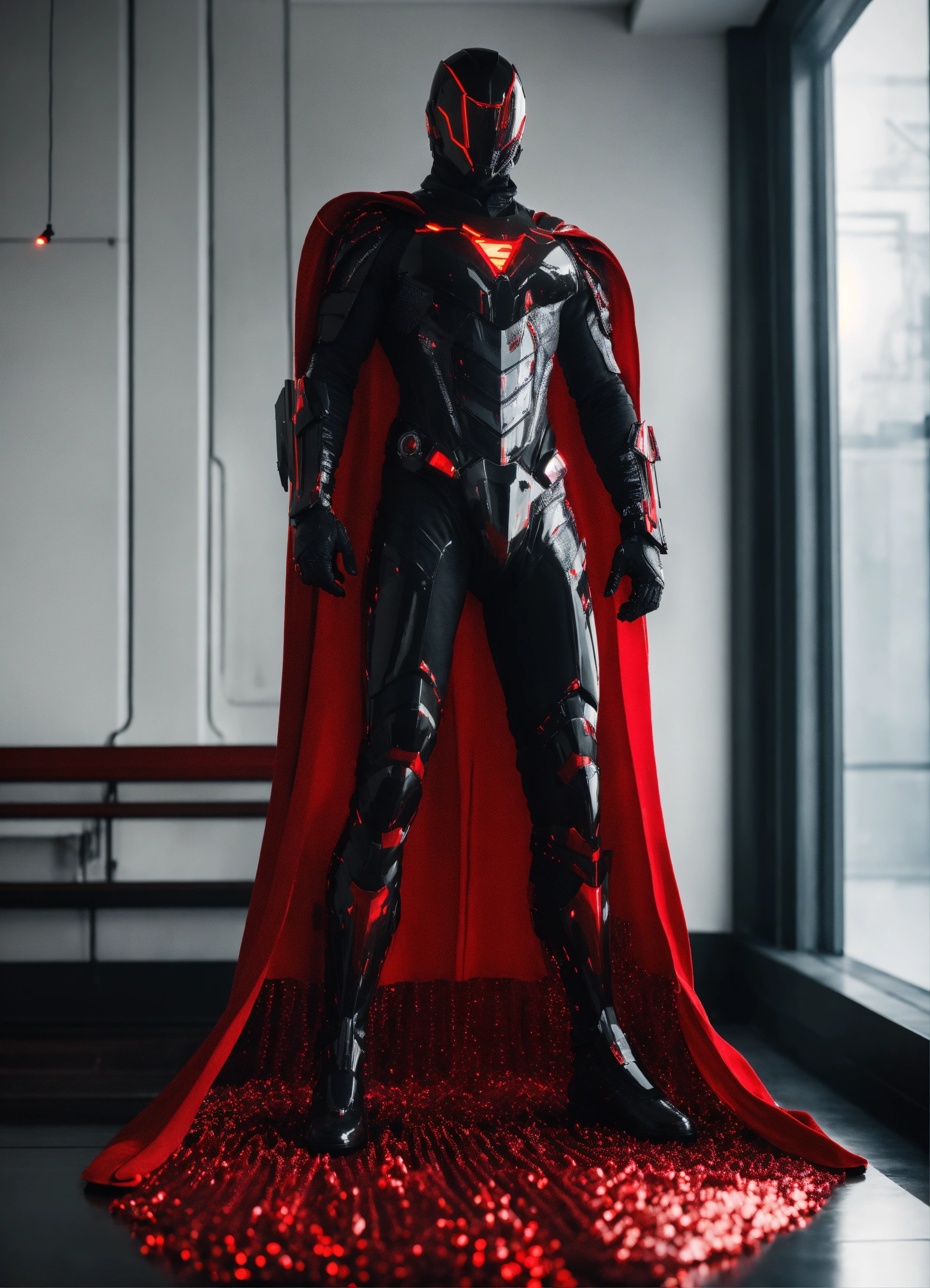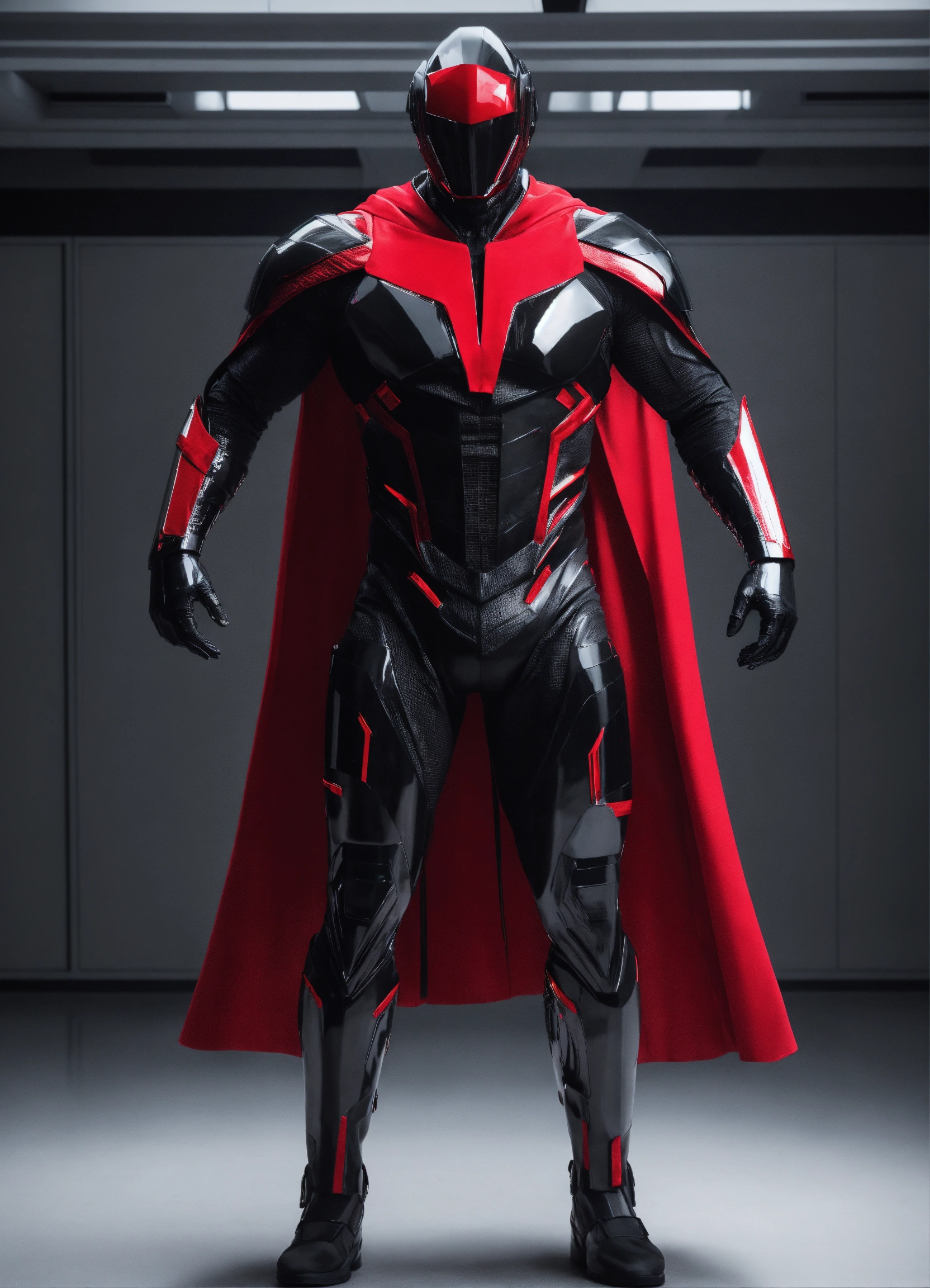 An ultrarealistic photograph of an enormous minimalist black sci-fi full body power suit, without lights, made of red and black metal and polymer, full crystal hull, for a muscular man, a long red cape, imposing, modern minimalism, elegant, dystopia, mysterious, godlike, scary, in a white room, 8k