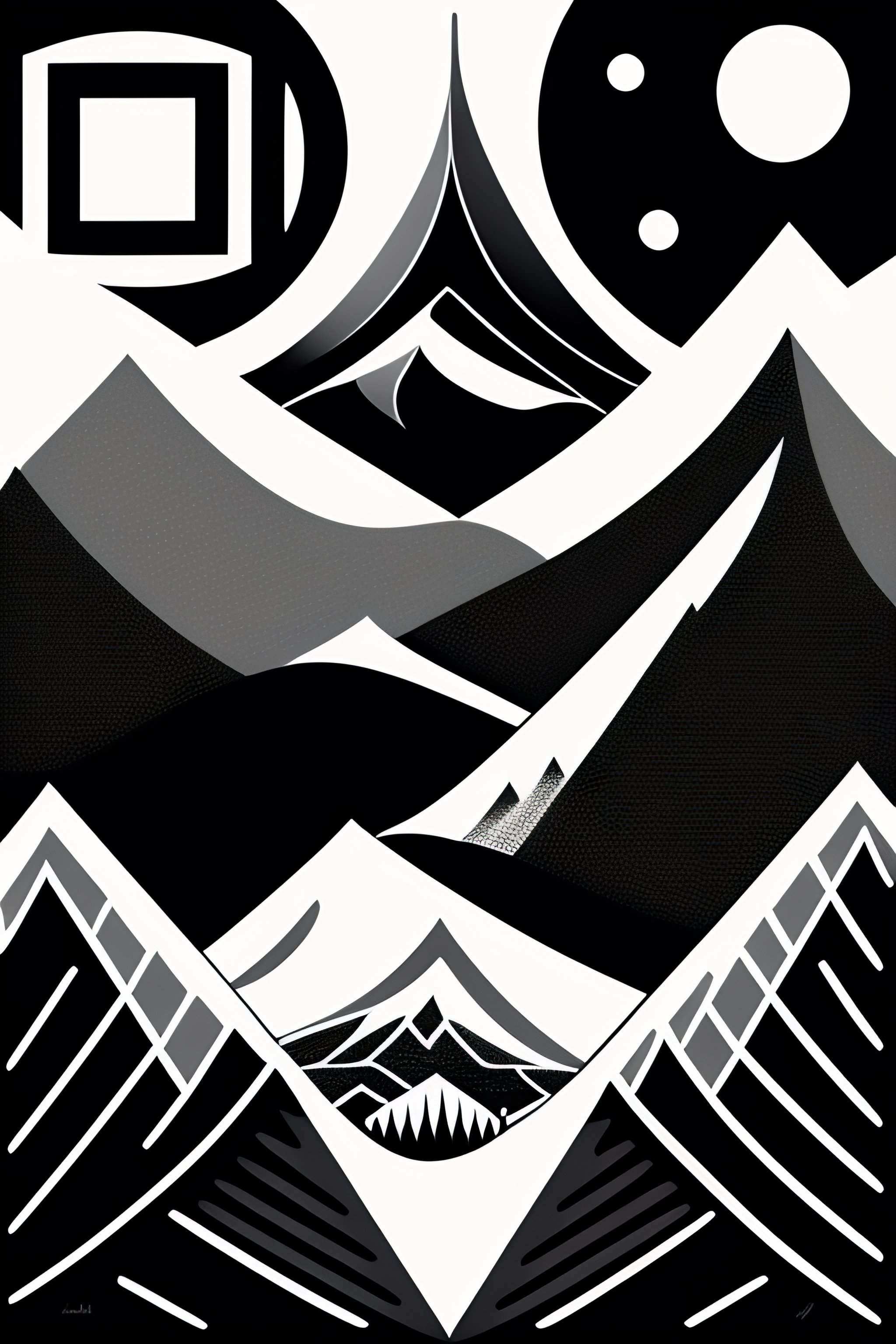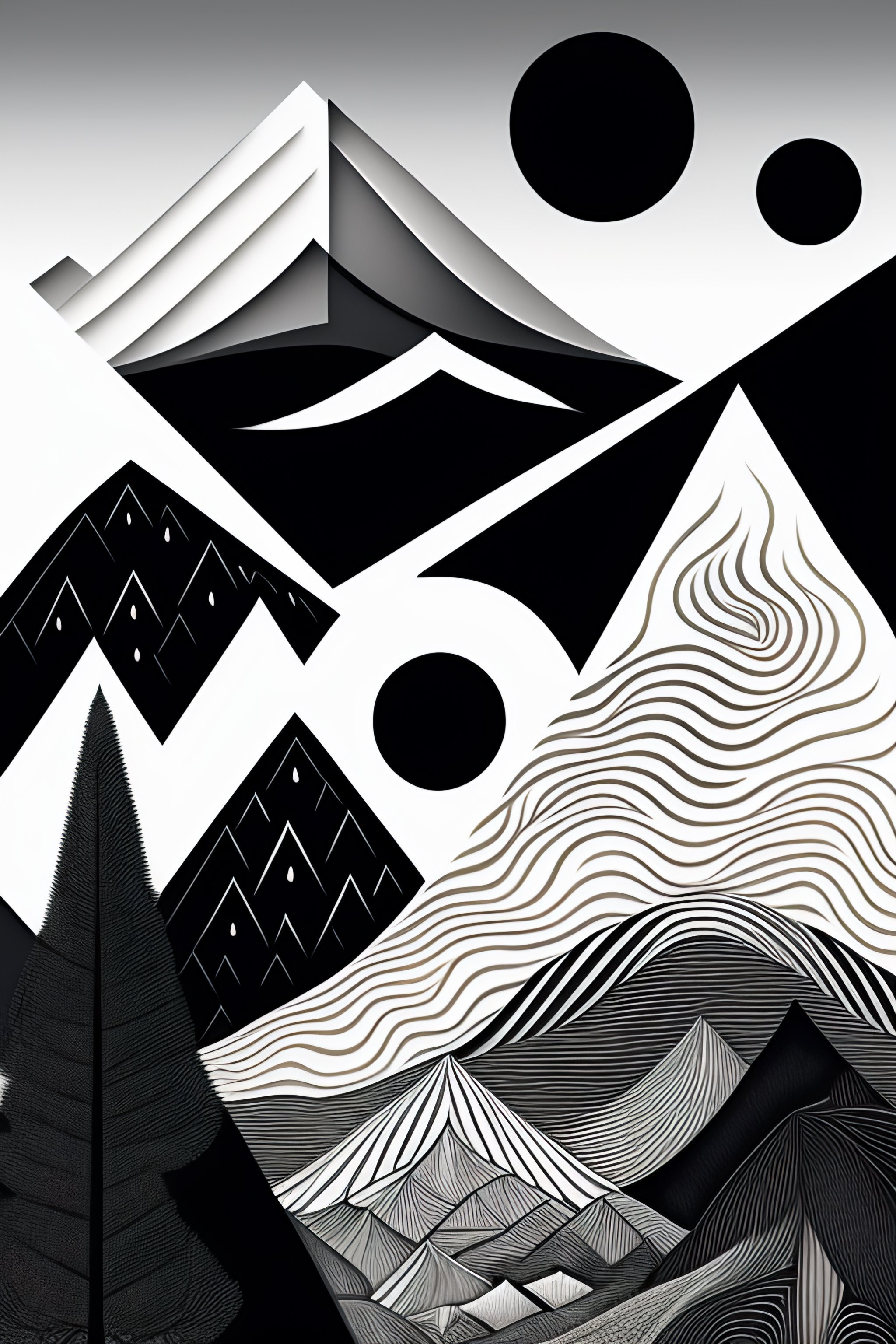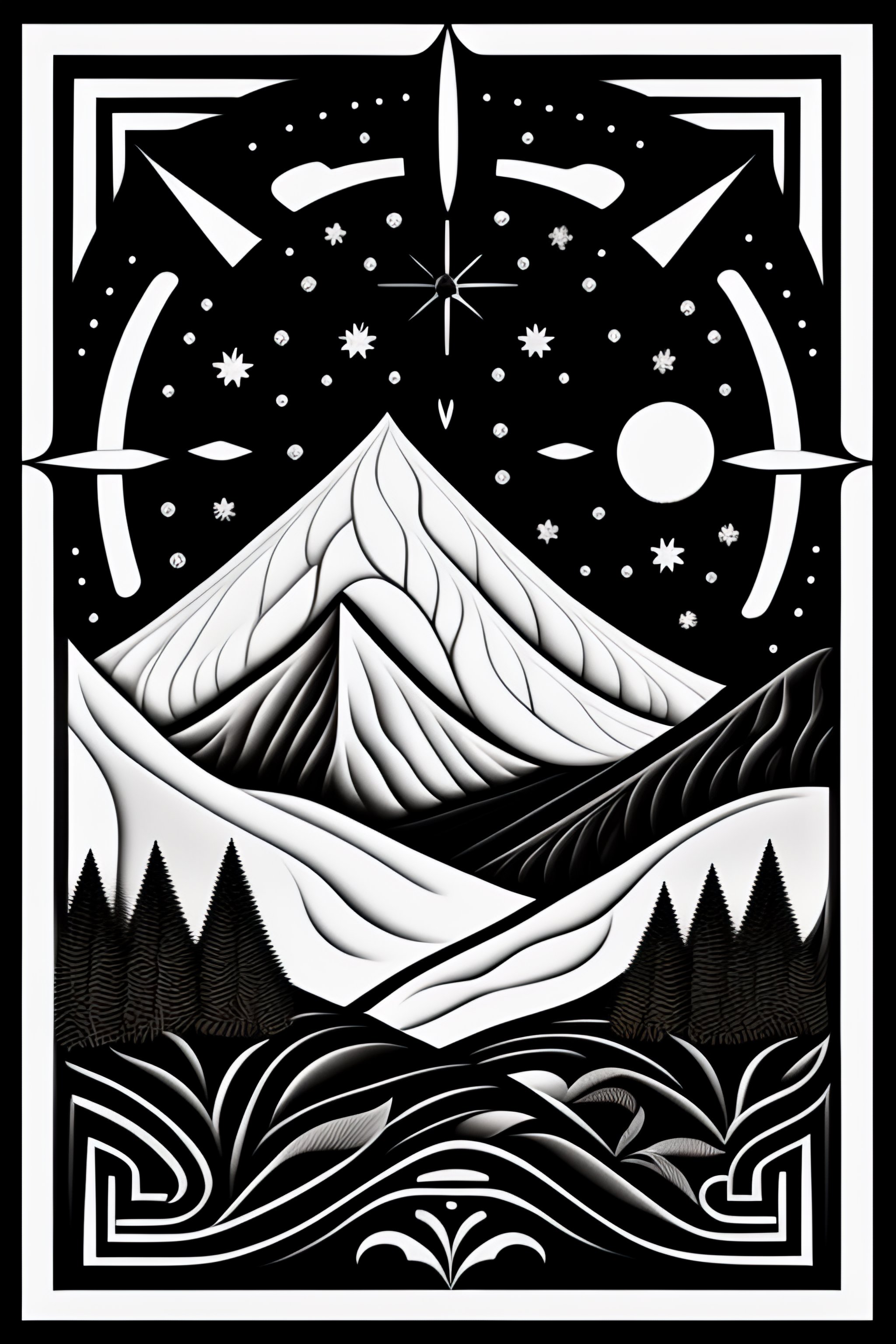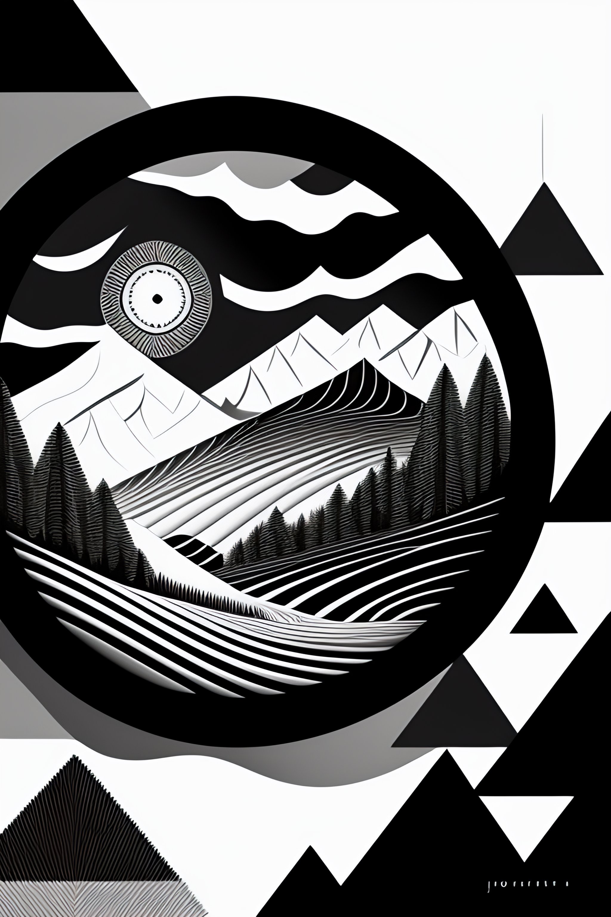 A black and white drawing of a compass, mountains, and trees, lineart by josef navrátil, reddit contest winner, geometric abstract art, digital illustration, outlined art, geometric, by pmtsketch