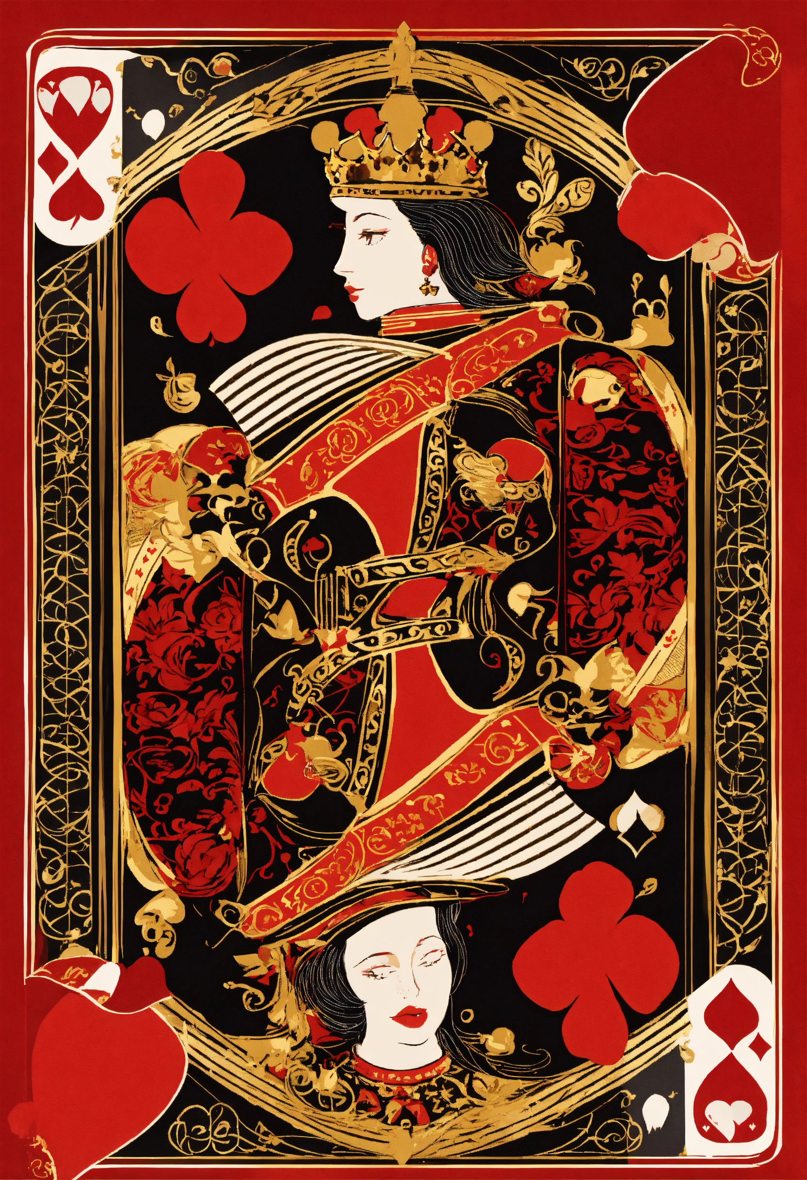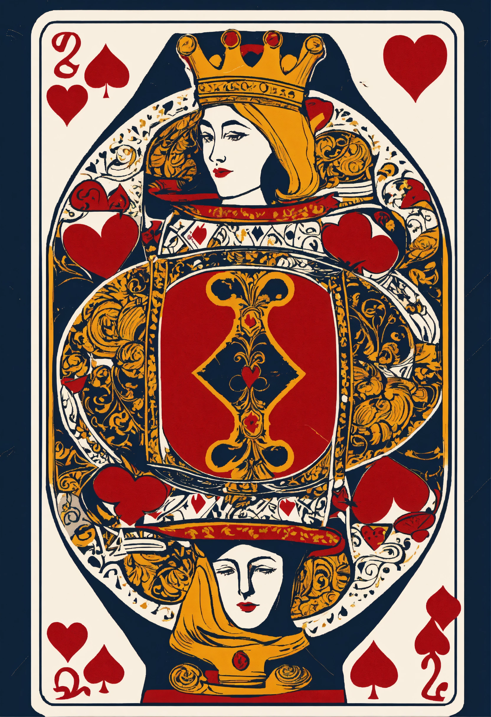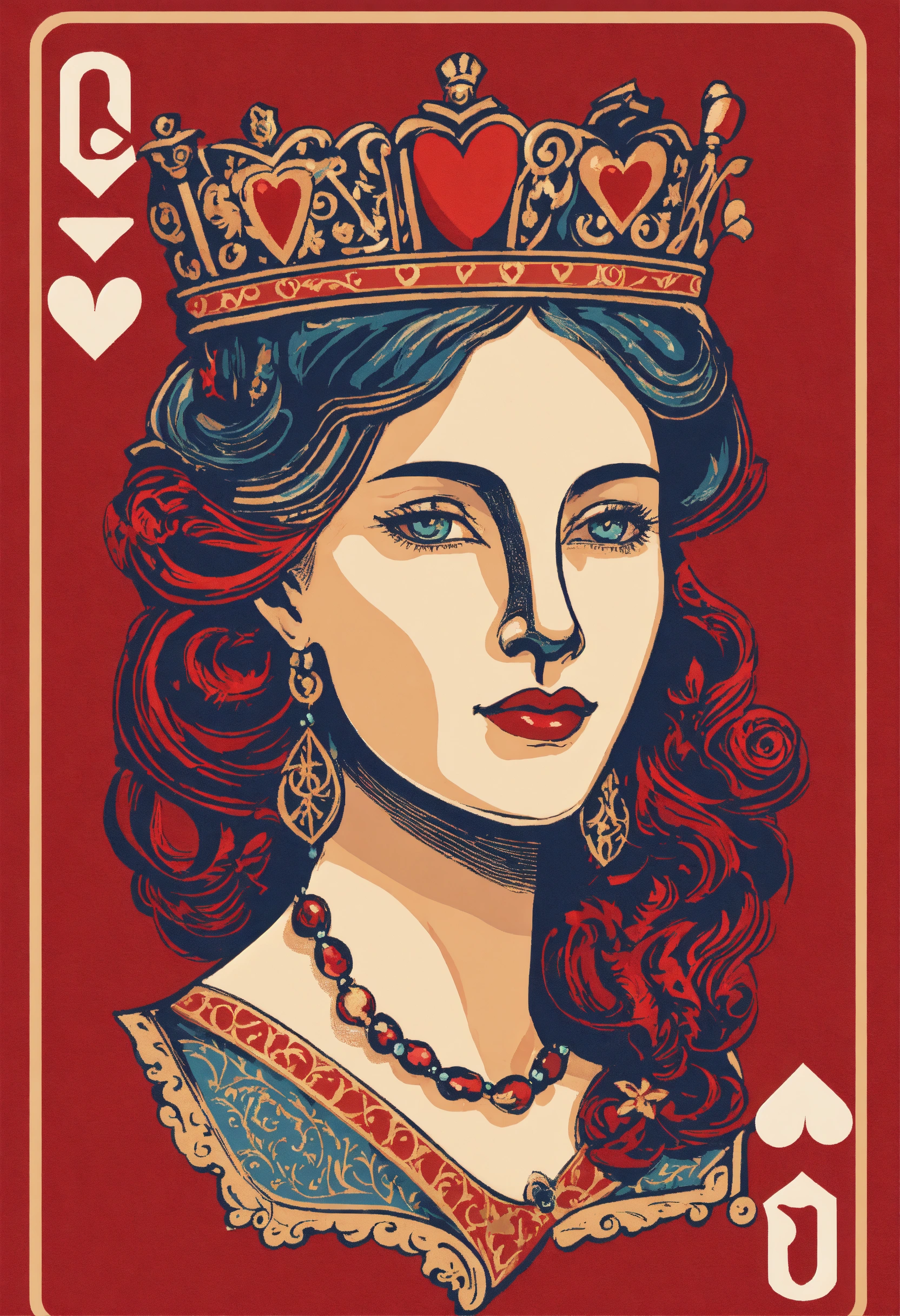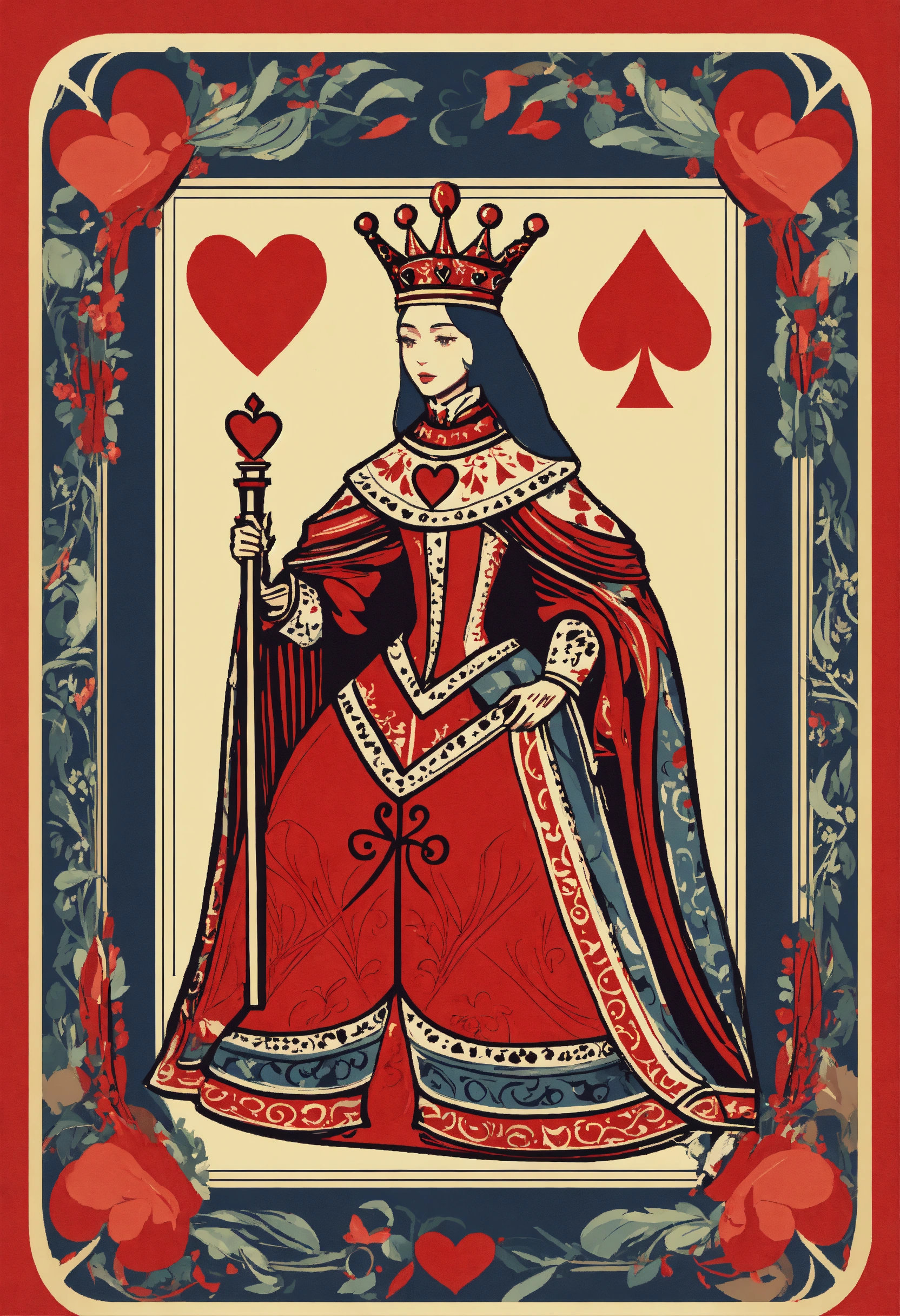 A flat illustration of a queen of hearts playing card