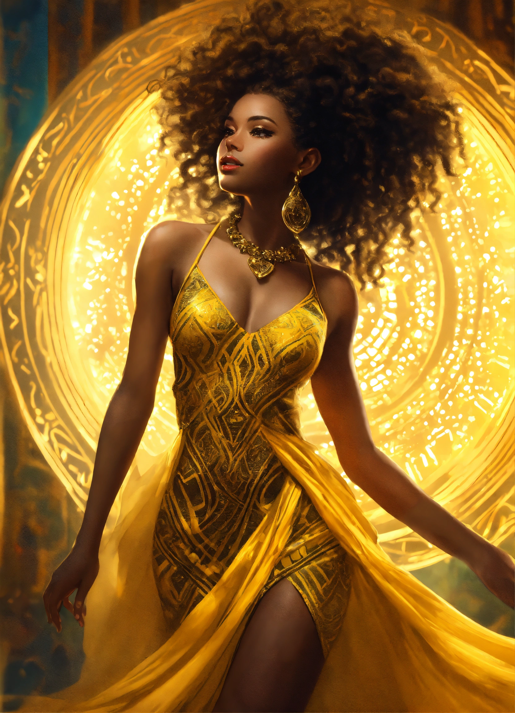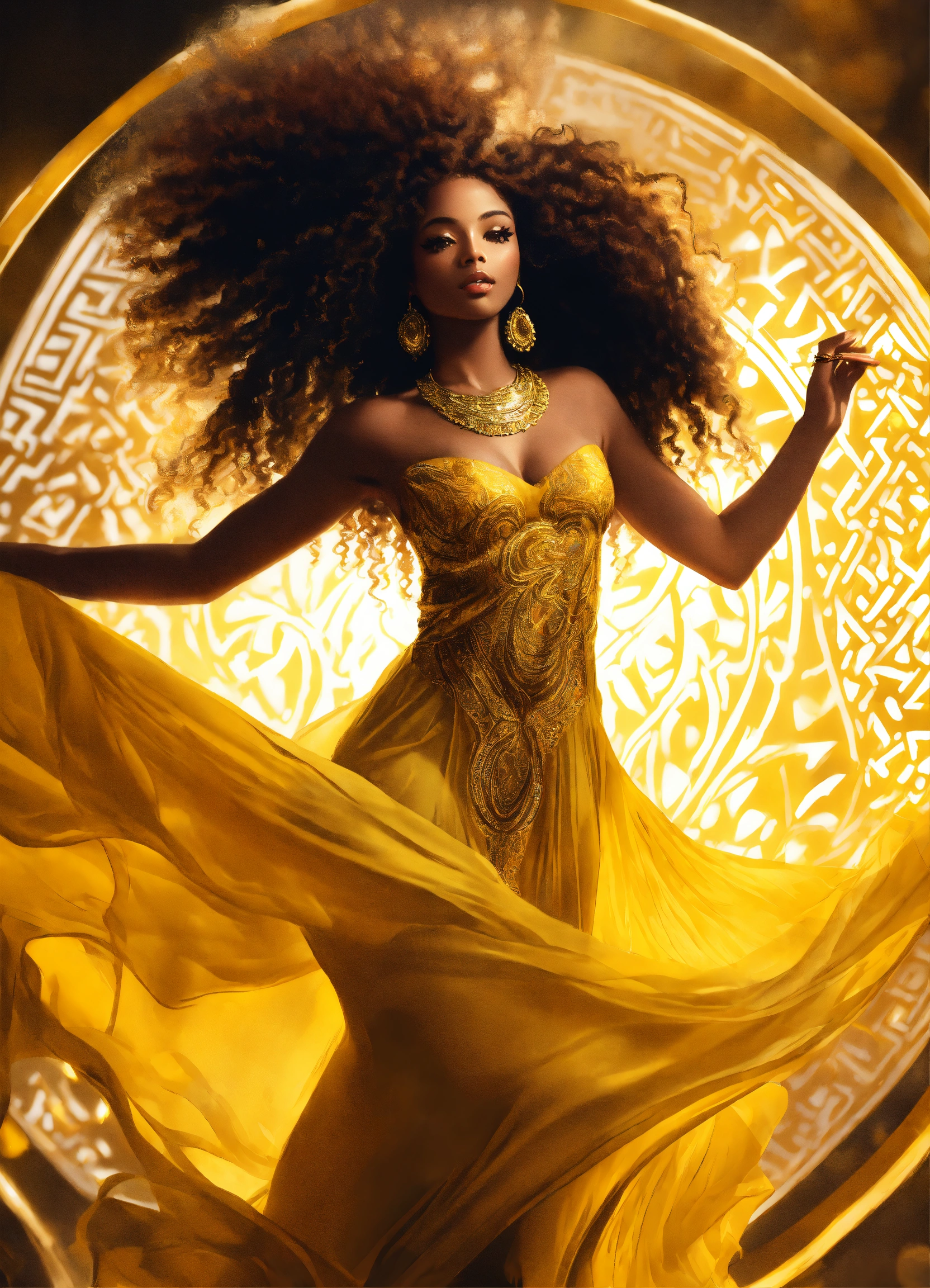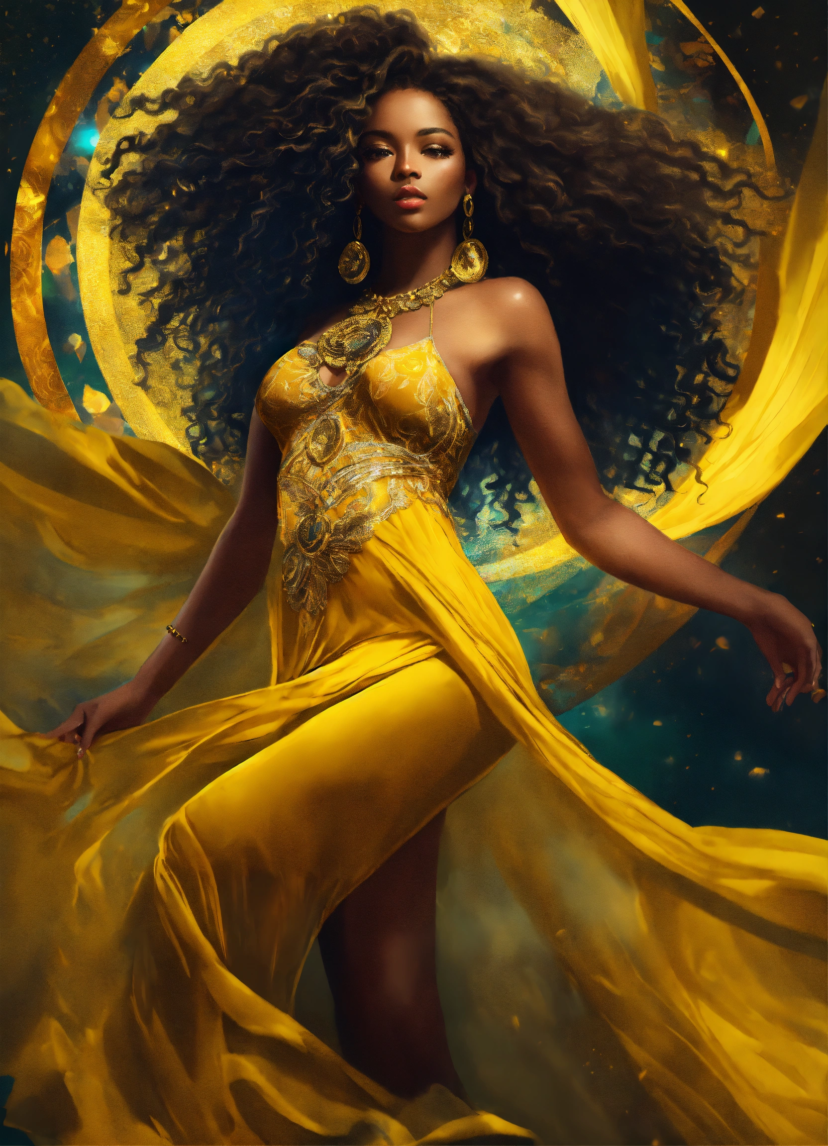 African american, goddess, wearing flowing sheer yellow dress with detailed pattern on it, gold jewelry, digital art, curly hair, realistic, sharp focus, high contrast lighting, full body, high quality, 8k, full body, dancing, digital painting
