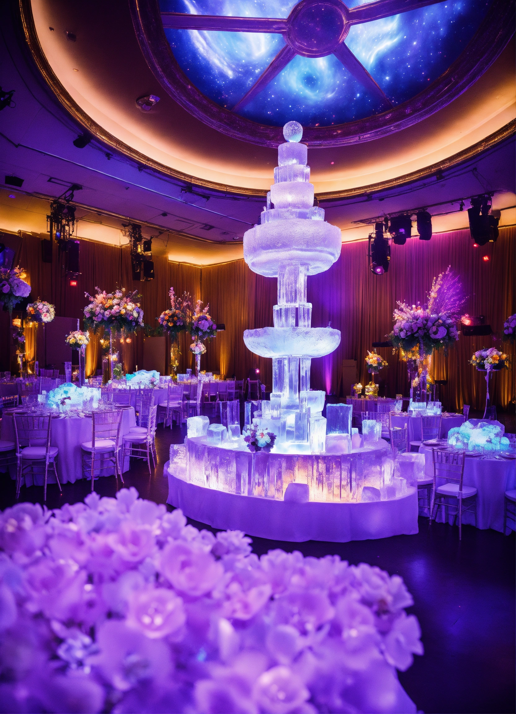 Grand residence wedding reception, large stage with alien orchestra performing a cosmic symphony, large dance floor, upscale banquet, ice sculpture, flower arrangements, 8k, unreal engine